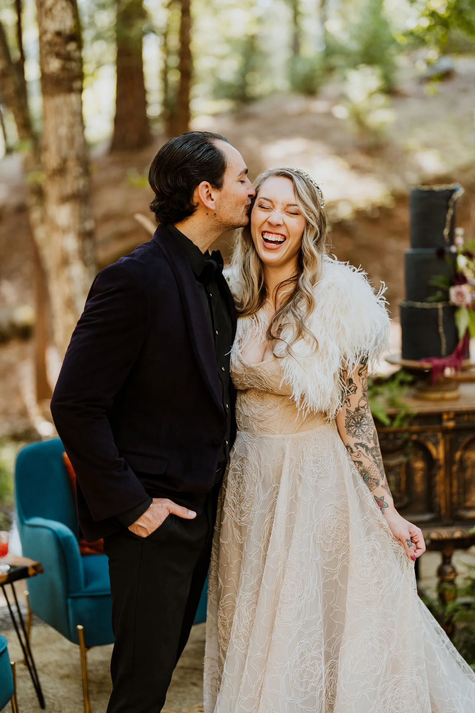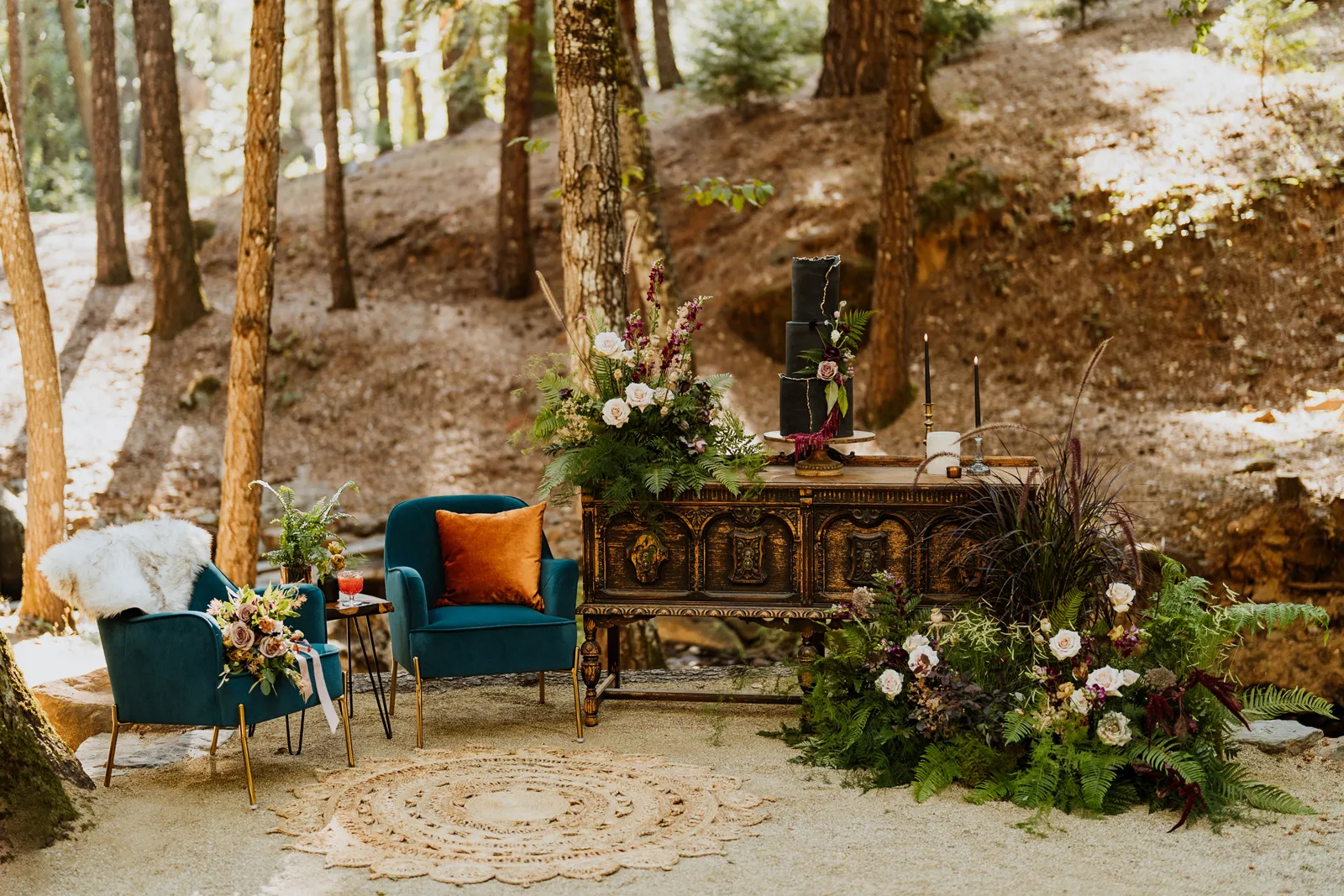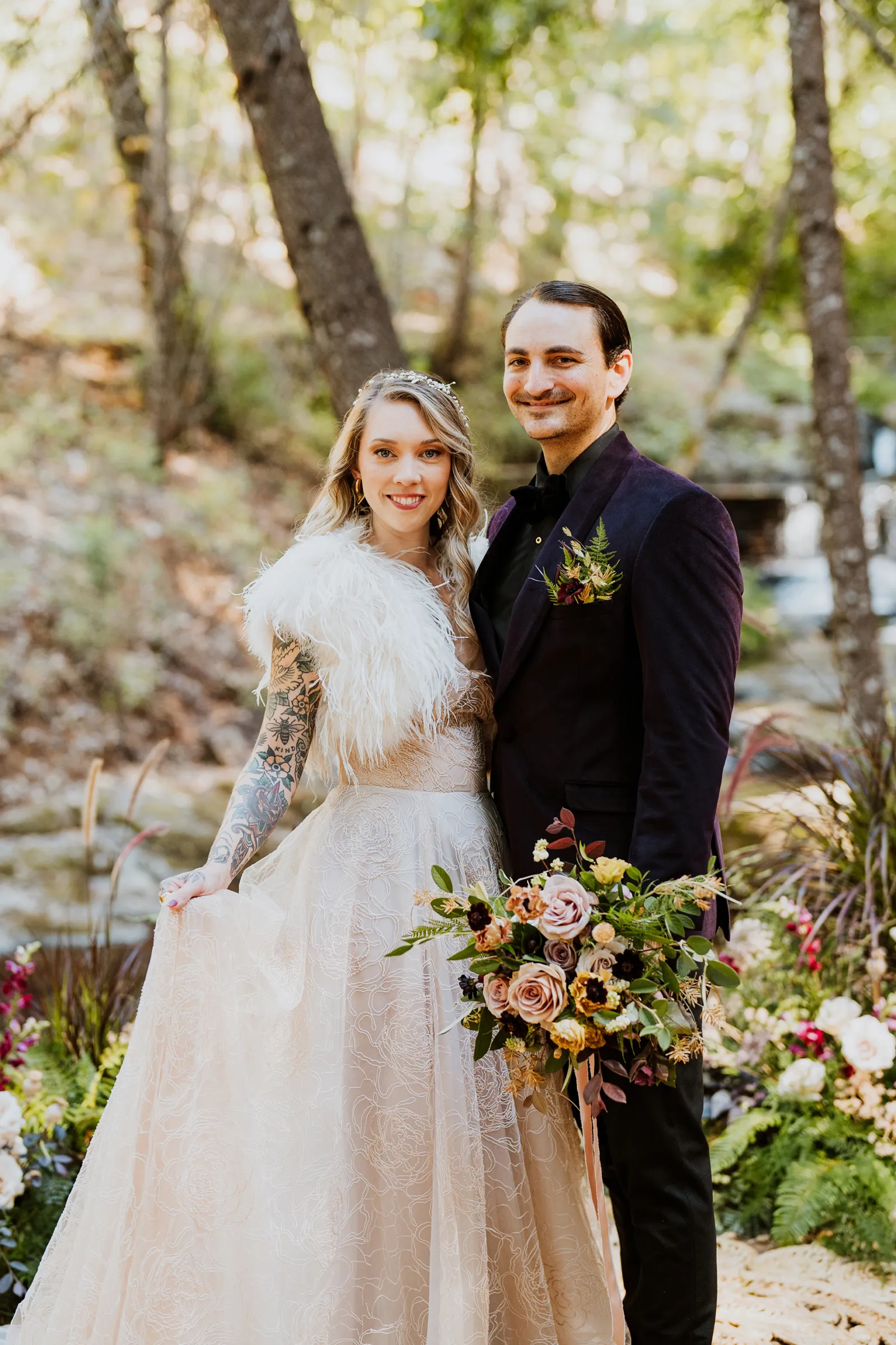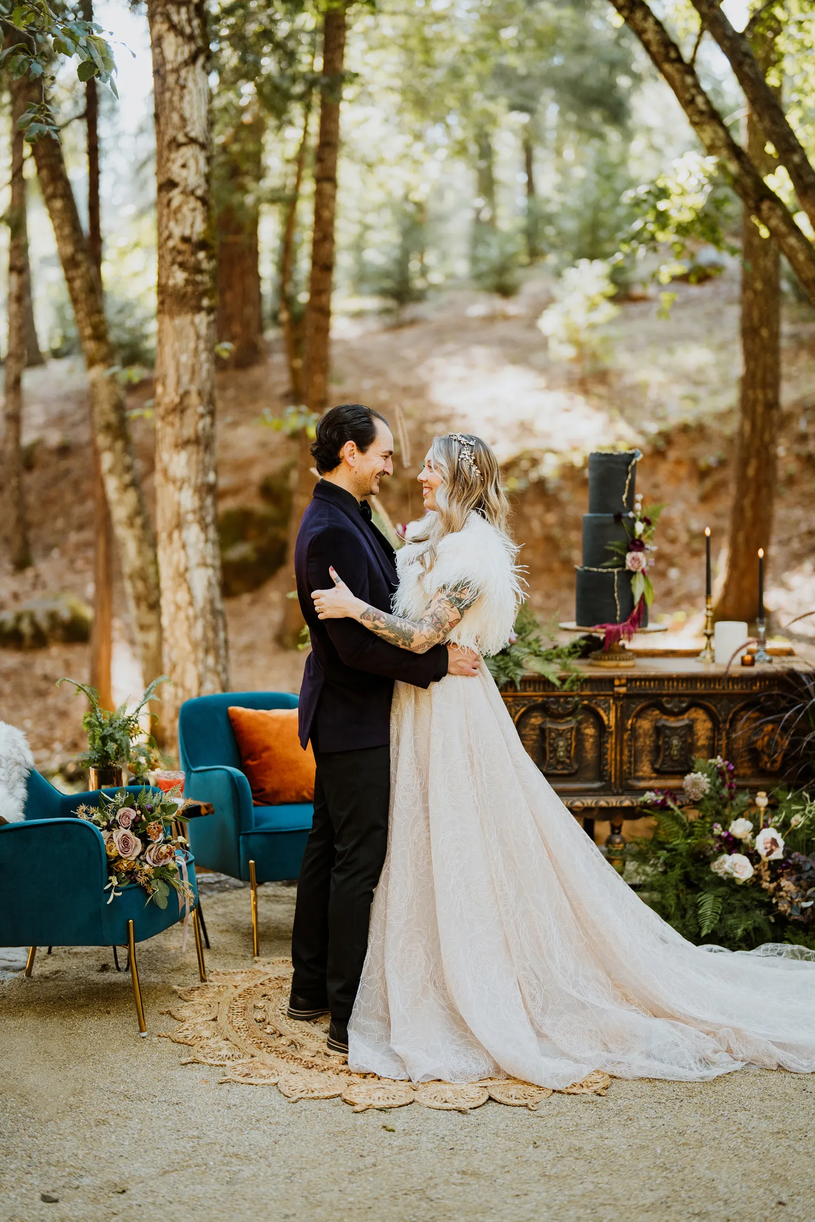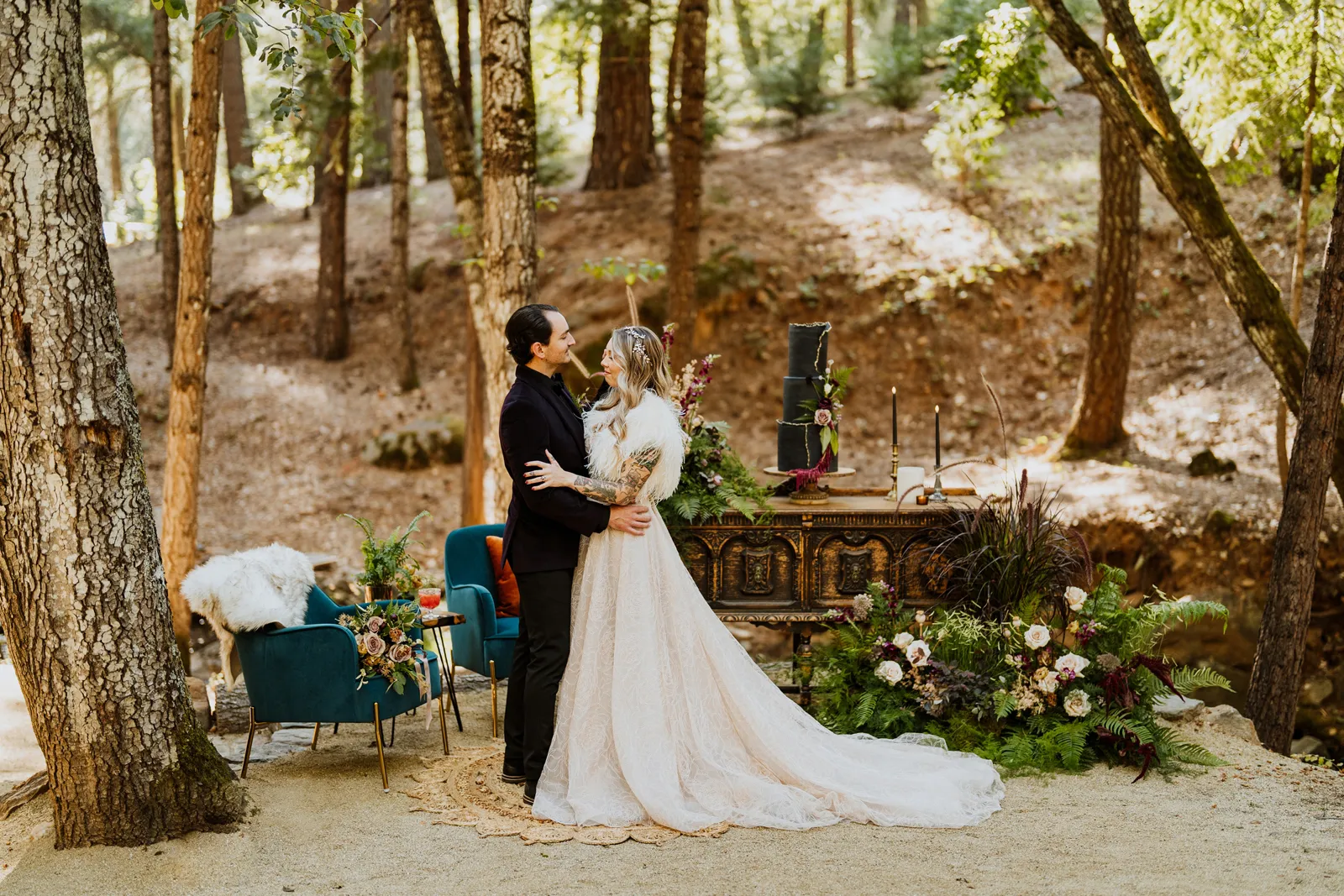 Welcome back to our next installment of Real Weddings Submitted Styled Shoots. Today’s shoot is absolutely brimming with tons of inspiration. With rich purples and black finishes set in the forest (think of a black, multi-tiered cake from Spilled Milk Co., colorful cocktails courtesy of The Parched Poppies, a feathered bolero from Perfect Dress Party and a navy suit from Tuxedo Den) you’re going to get all the romantic, moody vibes from this shoot. Keep scrolling so you can get in on all the amazing details!