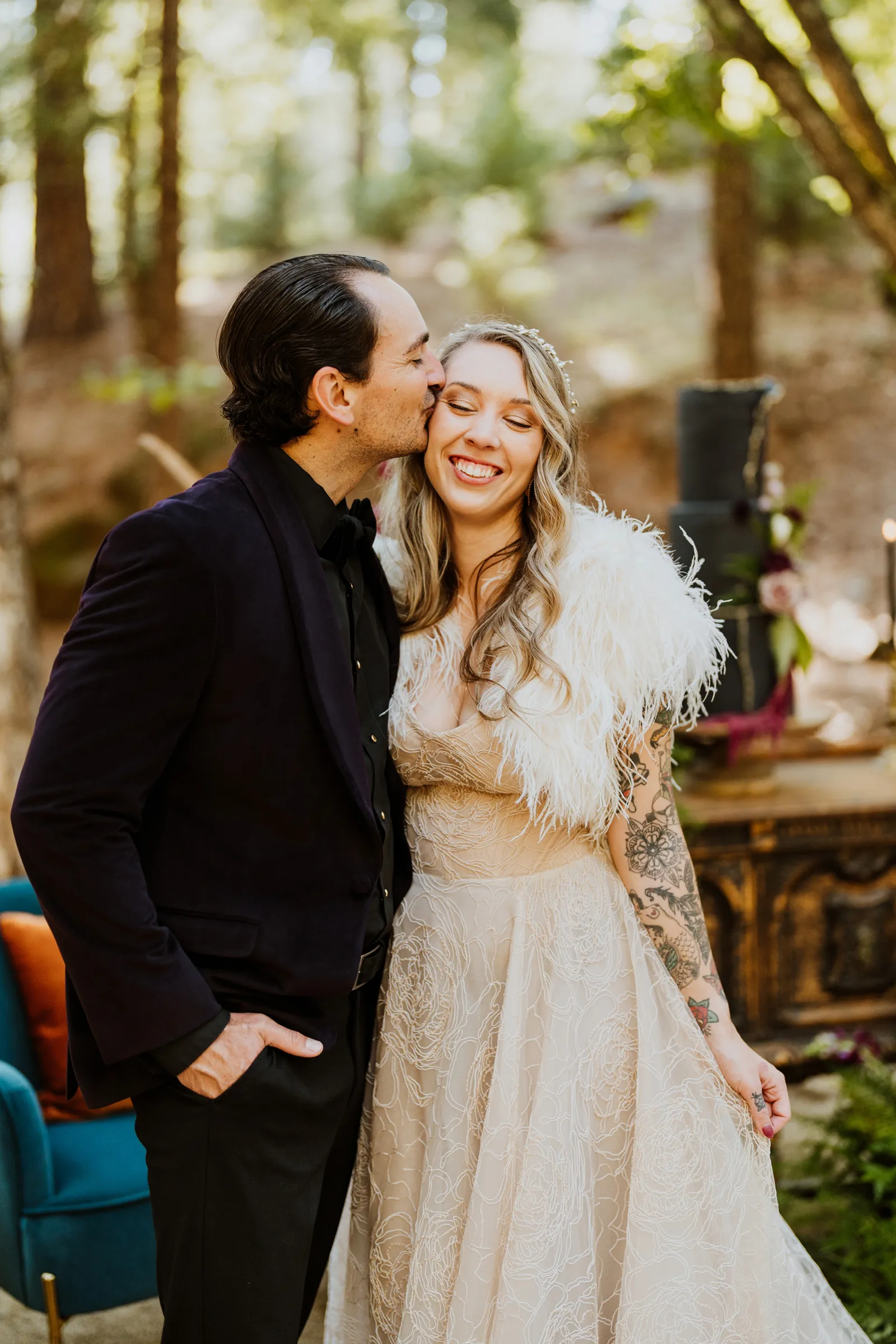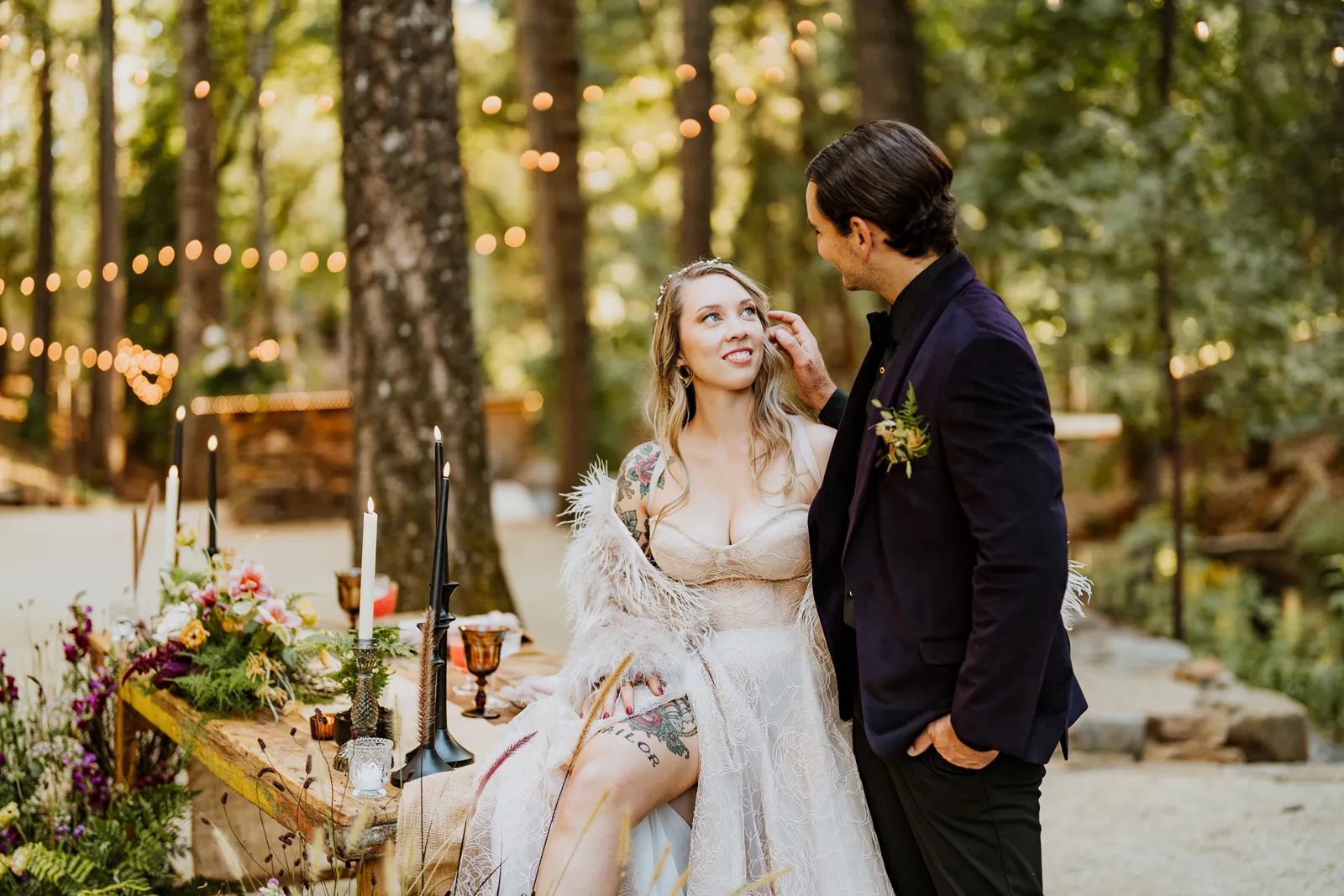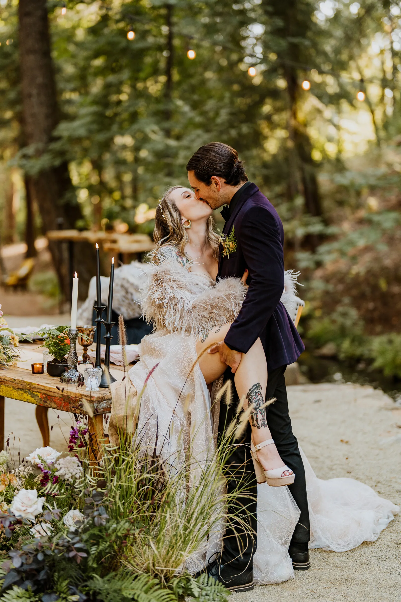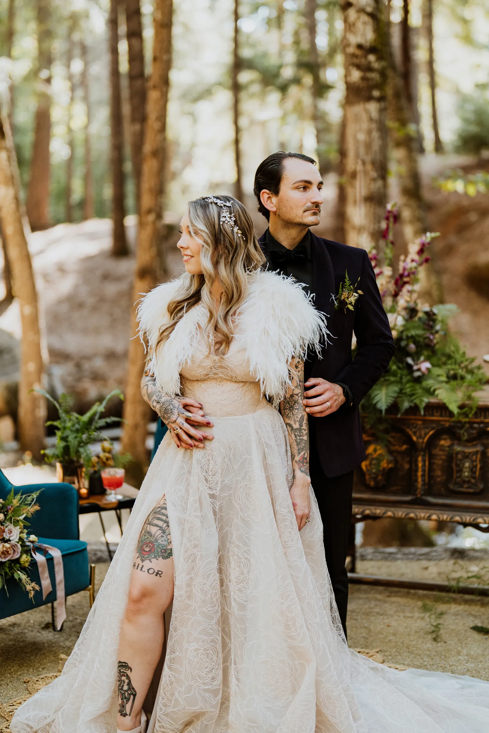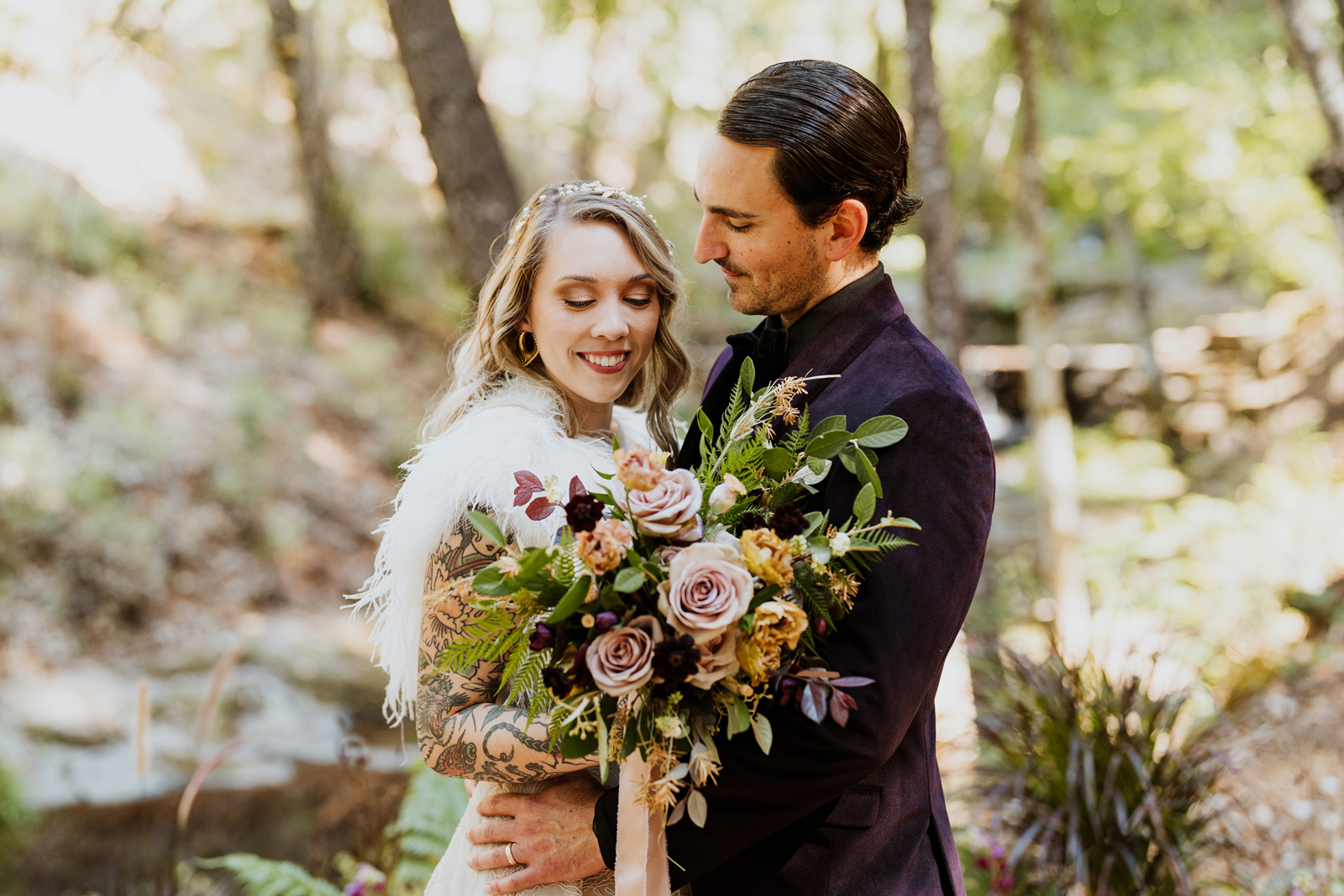 Welcome back to our next installment of Real Weddings Submitted Styled Shoots. Today’s shoot is absolutely brimming with tons of inspiration. With rich purples and black finishes set in the forest (think of a black, multi-tiered cake from Spilled Milk Co., colorful cocktails courtesy of The Parched Poppies, a feathered bolero from Perfect Dress Party and a navy suit from Tuxedo Den) you’re going to get all the romantic, moody vibes from this shoot. Keep scrolling so you can get in on all the amazing details!