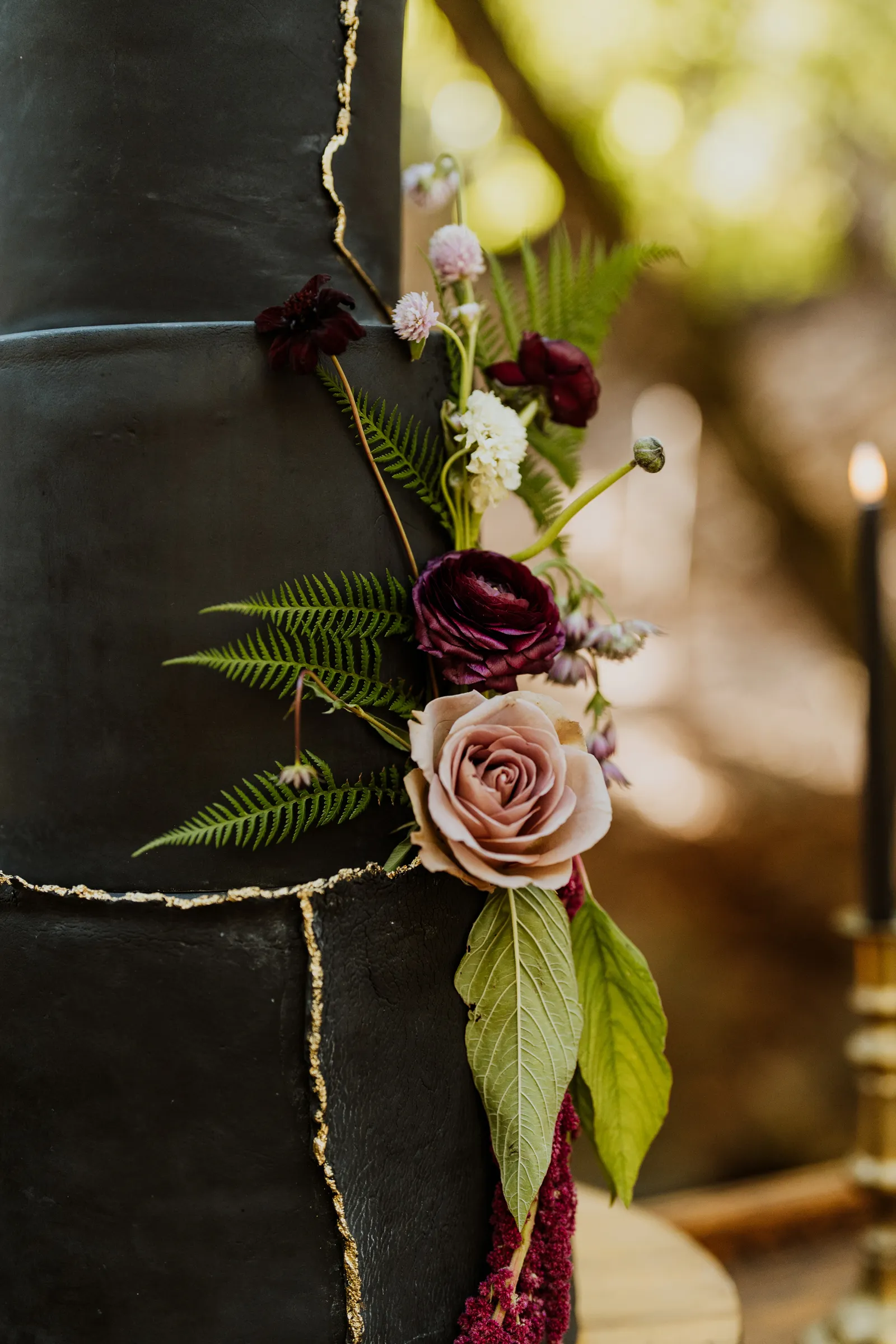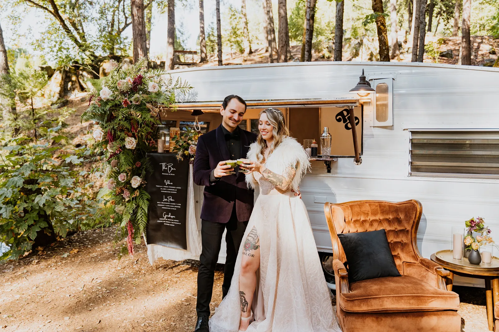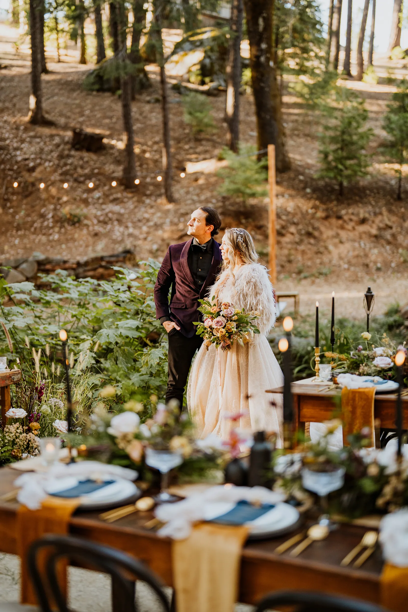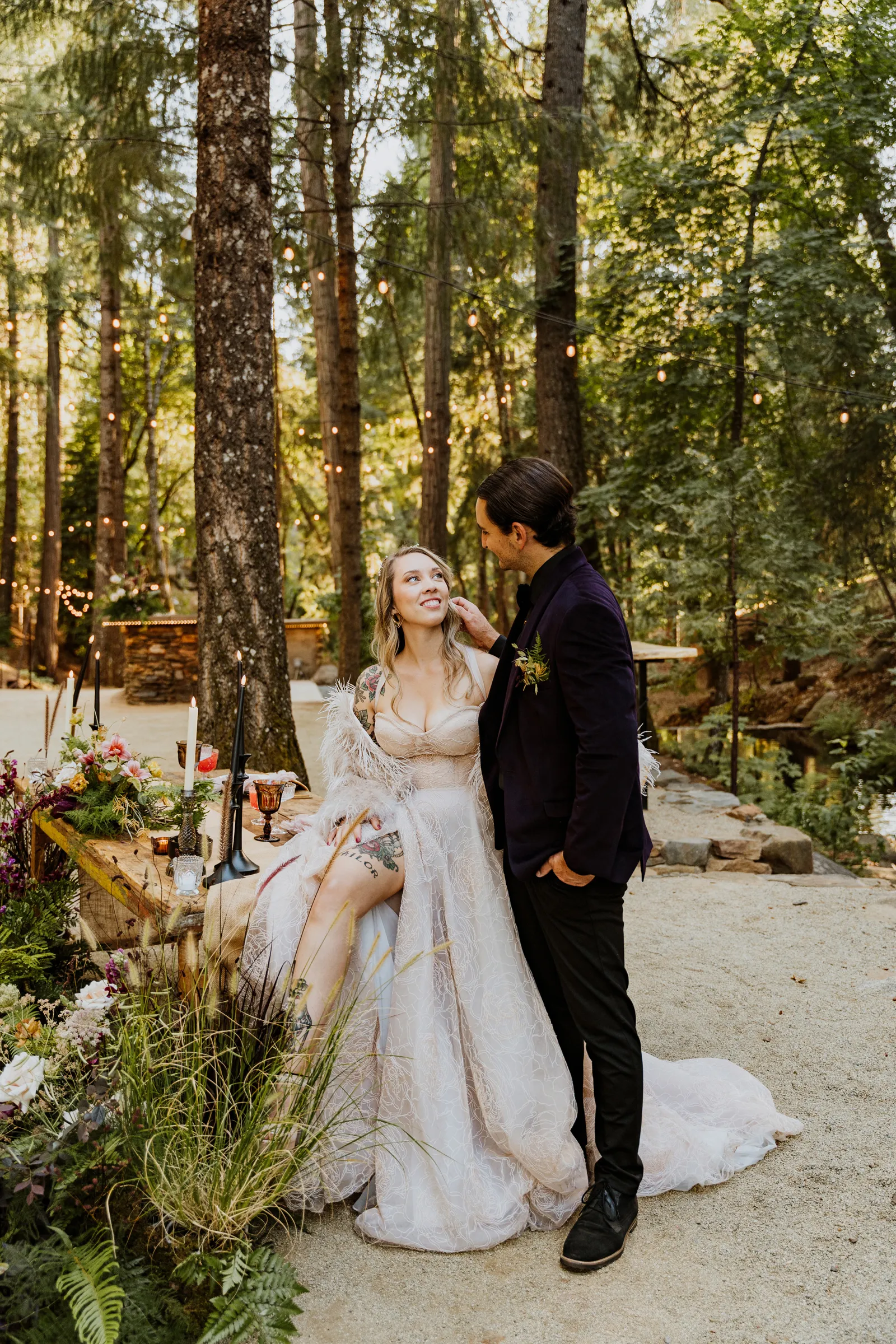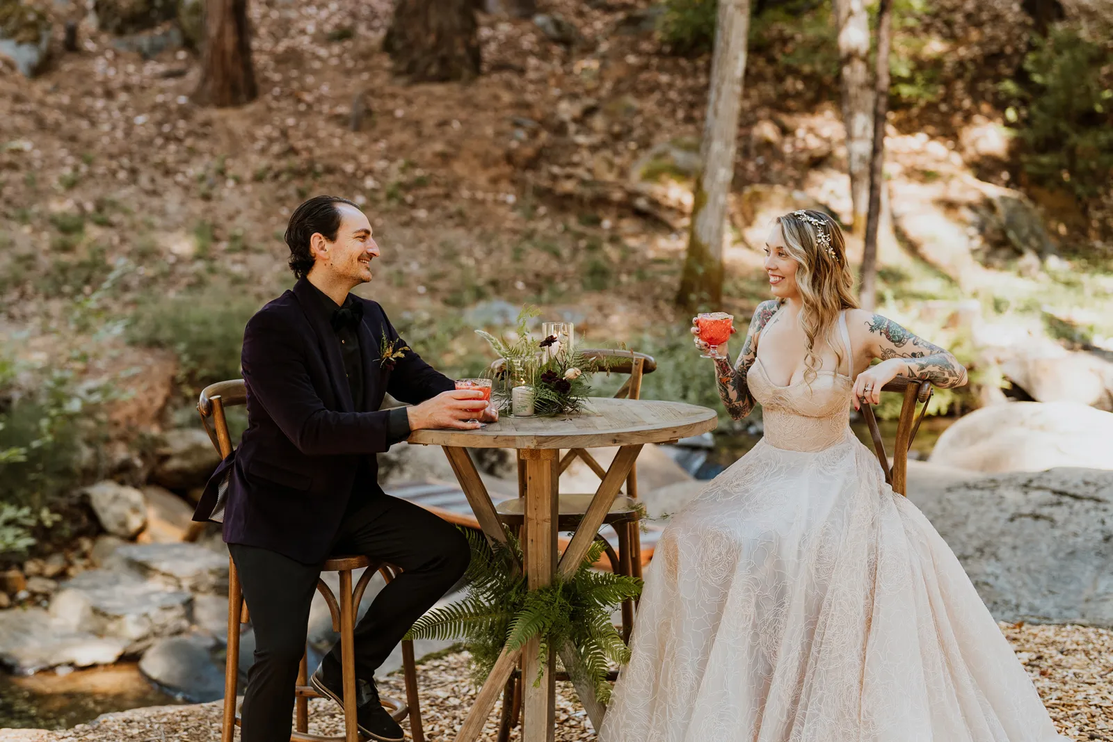 Welcome back to our next installment of Real Weddings Submitted Styled Shoots. Today’s shoot is absolutely brimming with tons of inspiration. With rich purples and black finishes set in the forest (think of a black, multi-tiered cake from Spilled Milk Co., colorful cocktails courtesy of The Parched Poppies, a feathered bolero from Perfect Dress Party and a navy suit from Tuxedo Den) you’re going to get all the romantic, moody vibes from this shoot. Keep scrolling so you can get in on all the amazing details!
