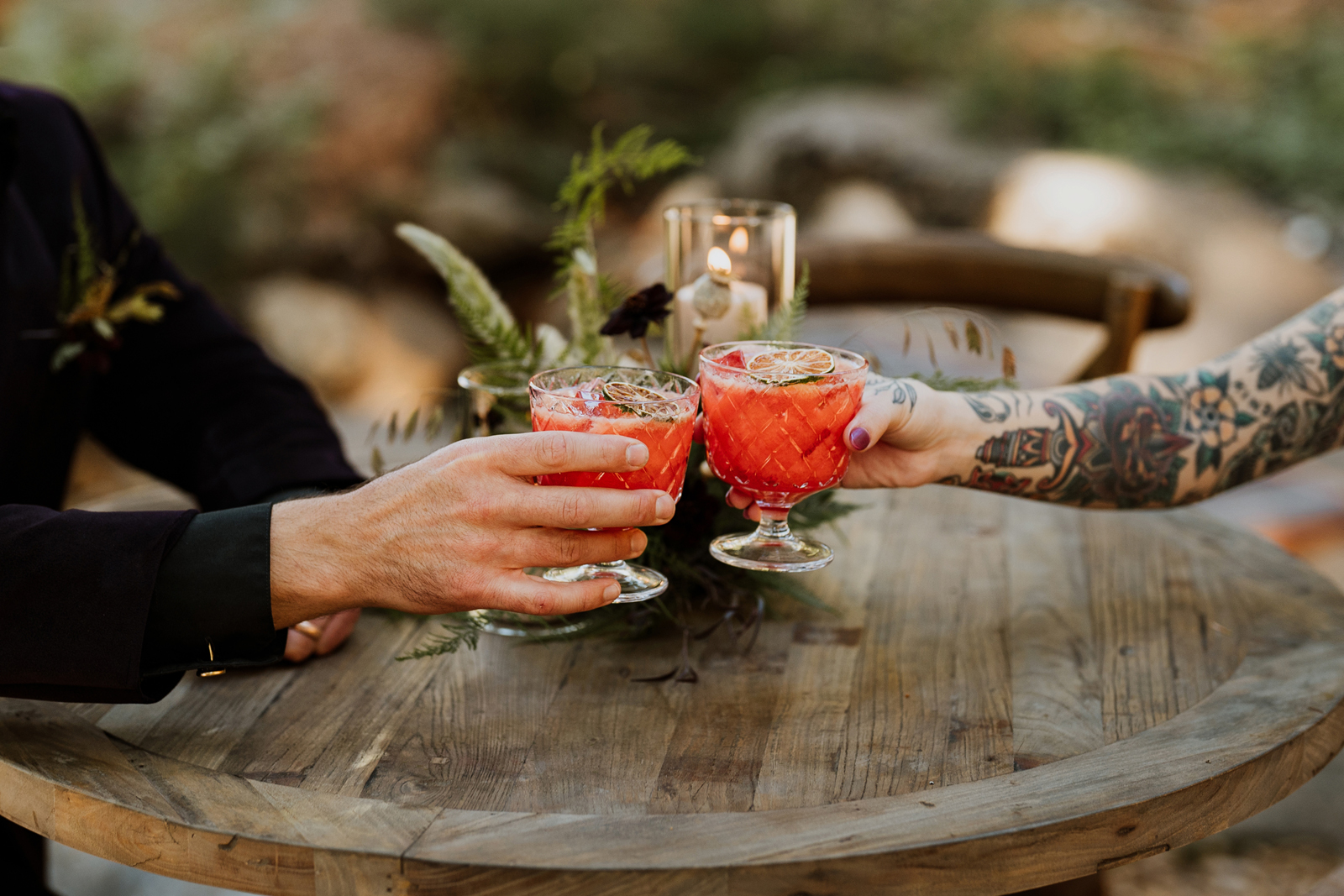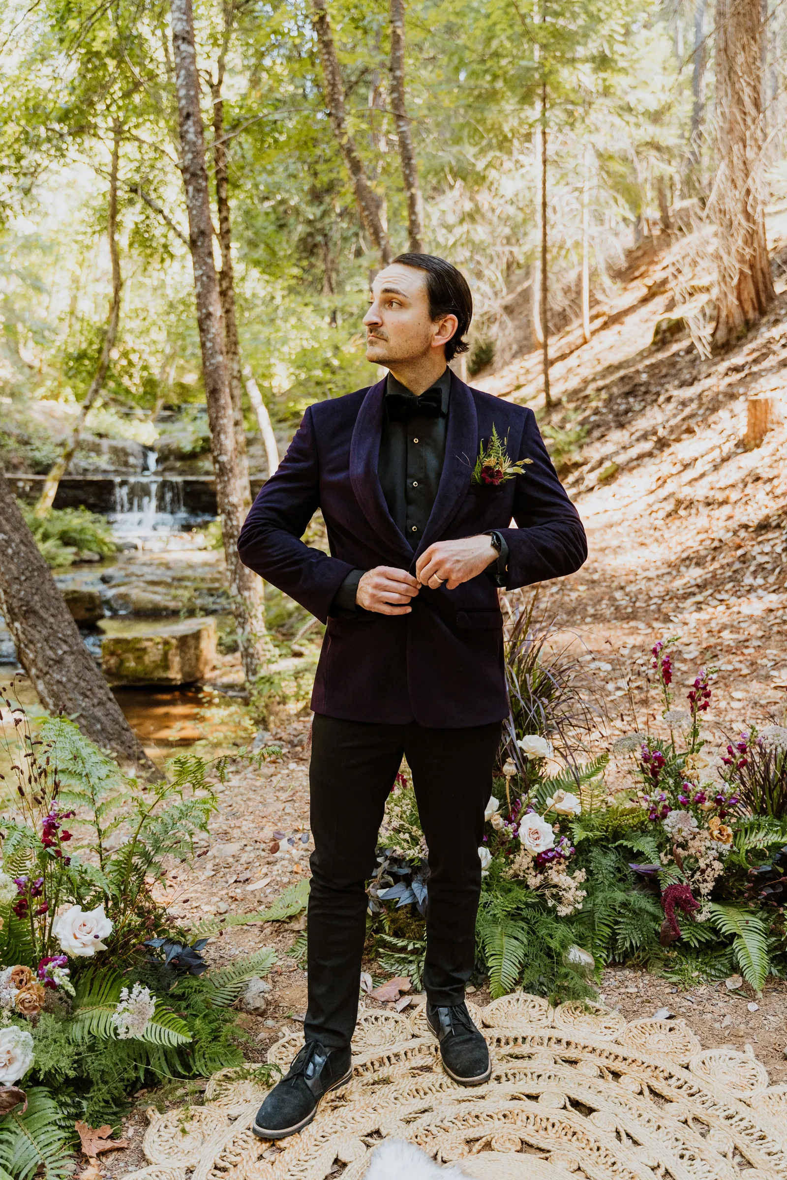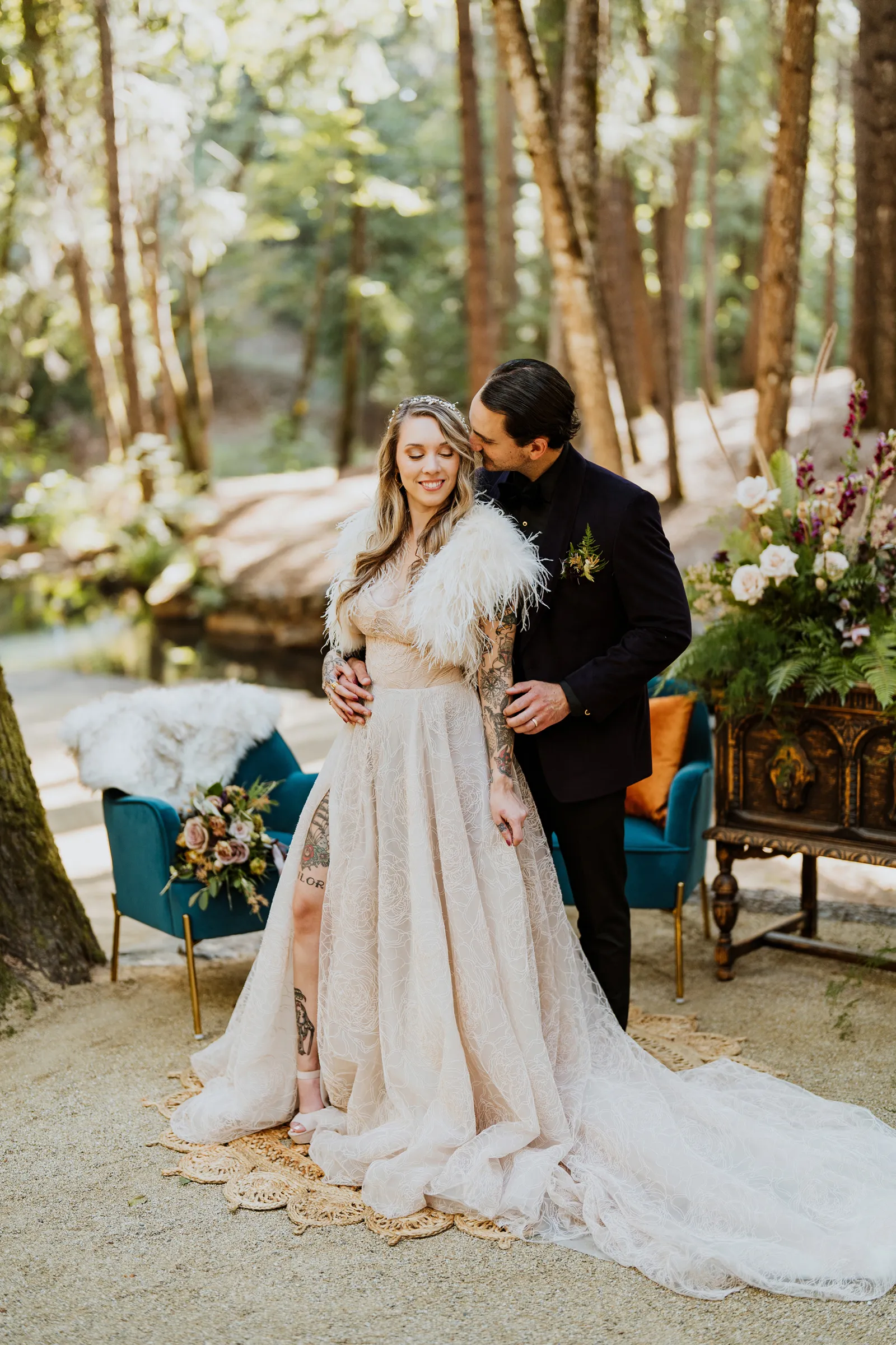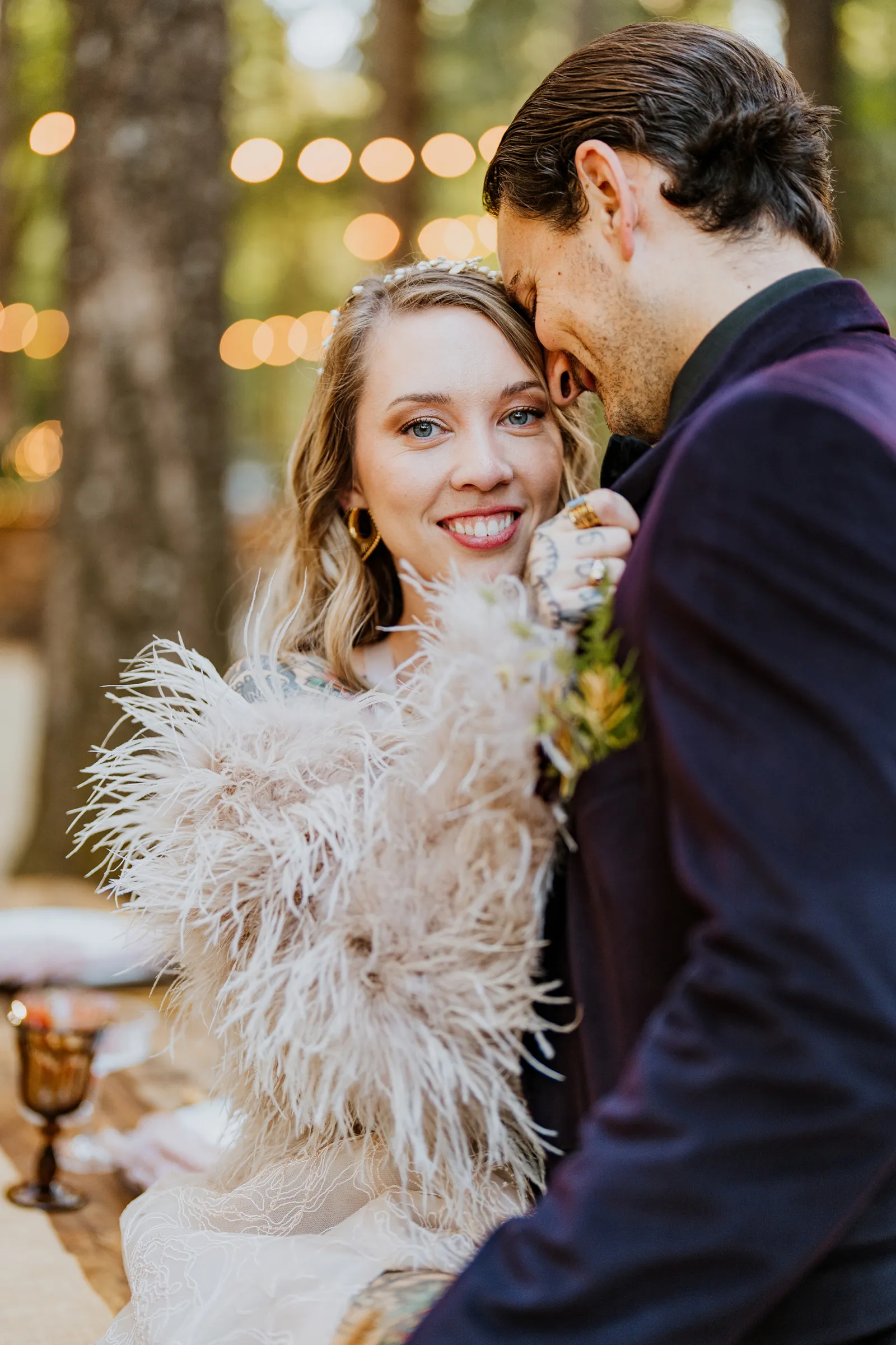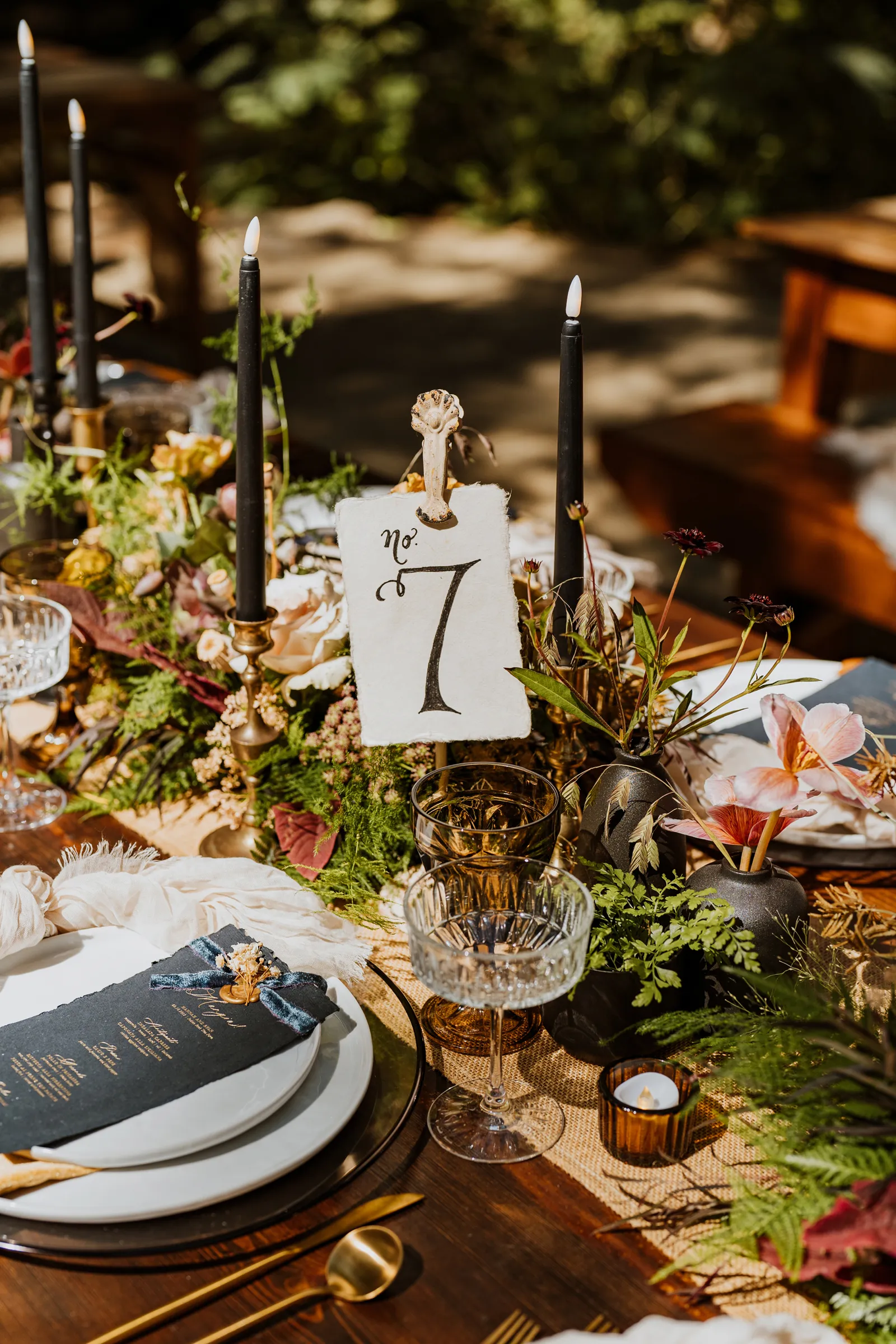 Welcome back to our next installment of Real Weddings Submitted Styled Shoots. Today’s shoot is absolutely brimming with tons of inspiration. With rich purples and black finishes set in the forest (think of a black, multi-tiered cake from Spilled Milk Co., colorful cocktails courtesy of The Parched Poppies, a feathered bolero from Perfect Dress Party and a navy suit from Tuxedo Den) you’re going to get all the romantic, moody vibes from this shoot. Keep scrolling so you can get in on all the amazing details!