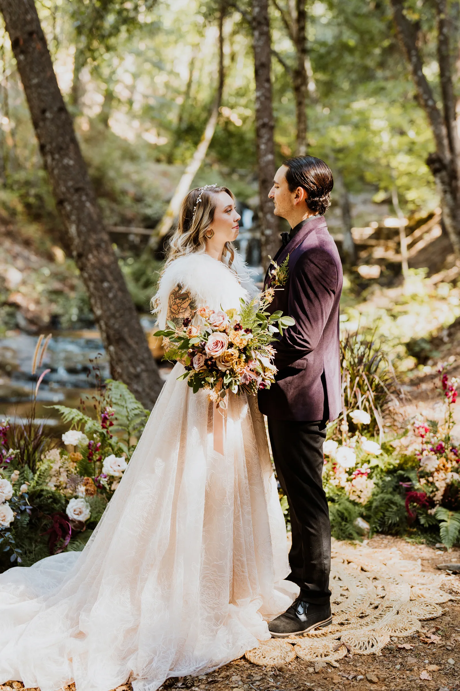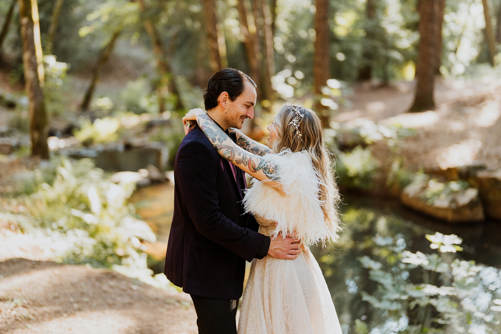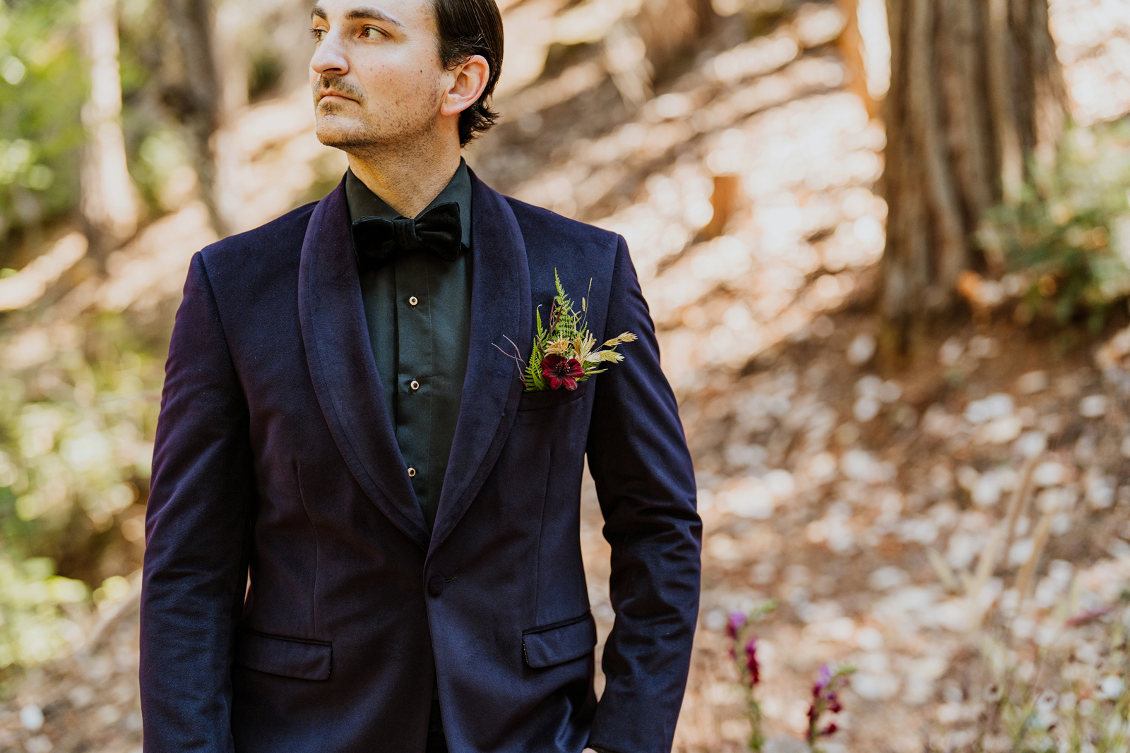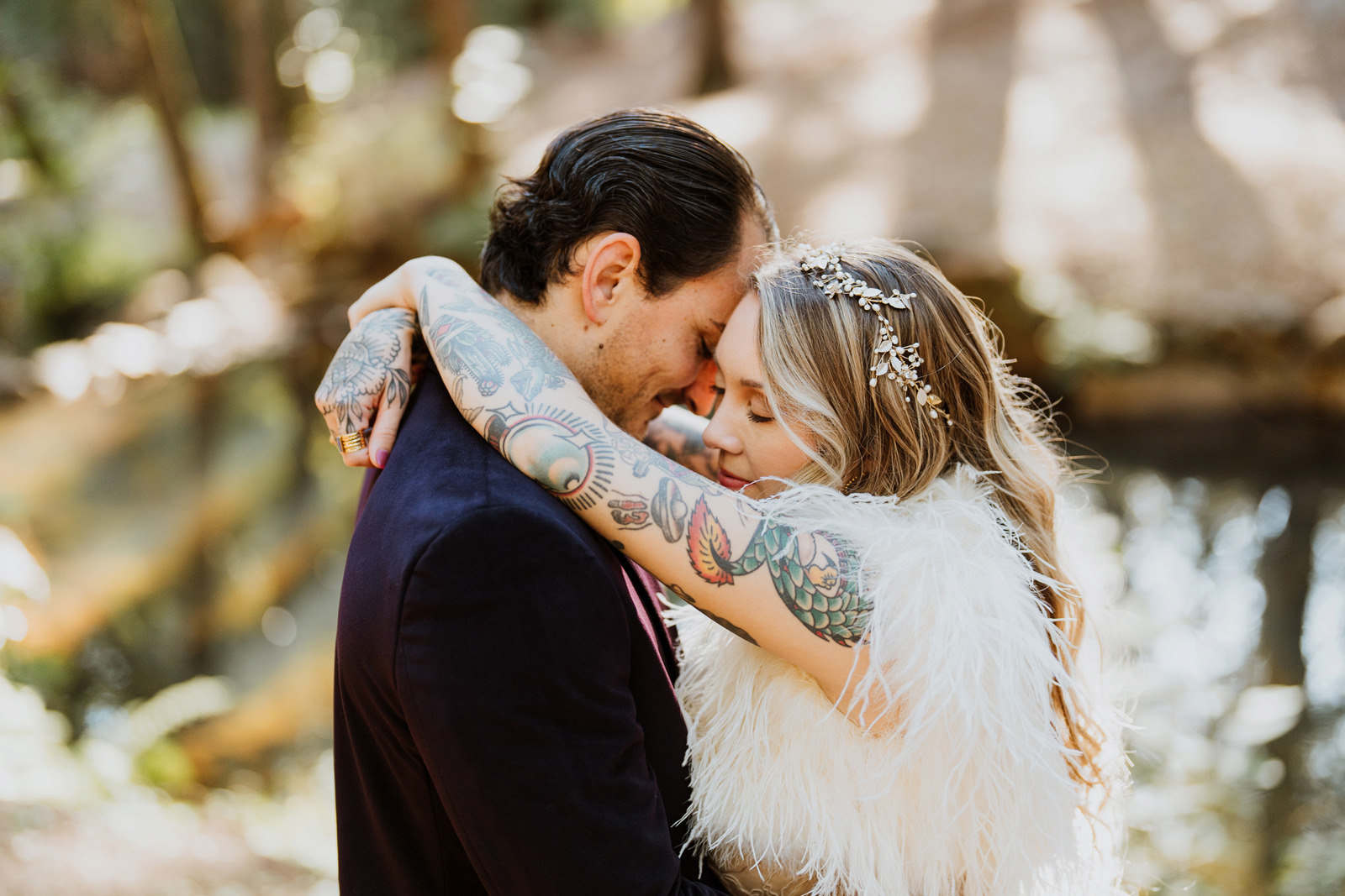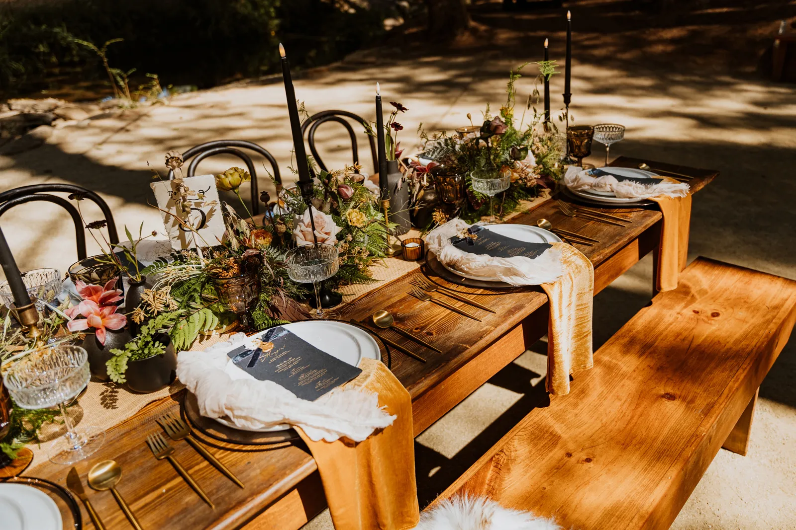 Welcome back to our next installment of Real Weddings Submitted Styled Shoots. Today’s shoot is absolutely brimming with tons of inspiration. With rich purples and black finishes set in the forest (think of a black, multi-tiered cake from Spilled Milk Co., colorful cocktails courtesy of The Parched Poppies, a feathered bolero from Perfect Dress Party and a navy suit from Tuxedo Den) you’re going to get all the romantic, moody vibes from this shoot. Keep scrolling so you can get in on all the amazing details!