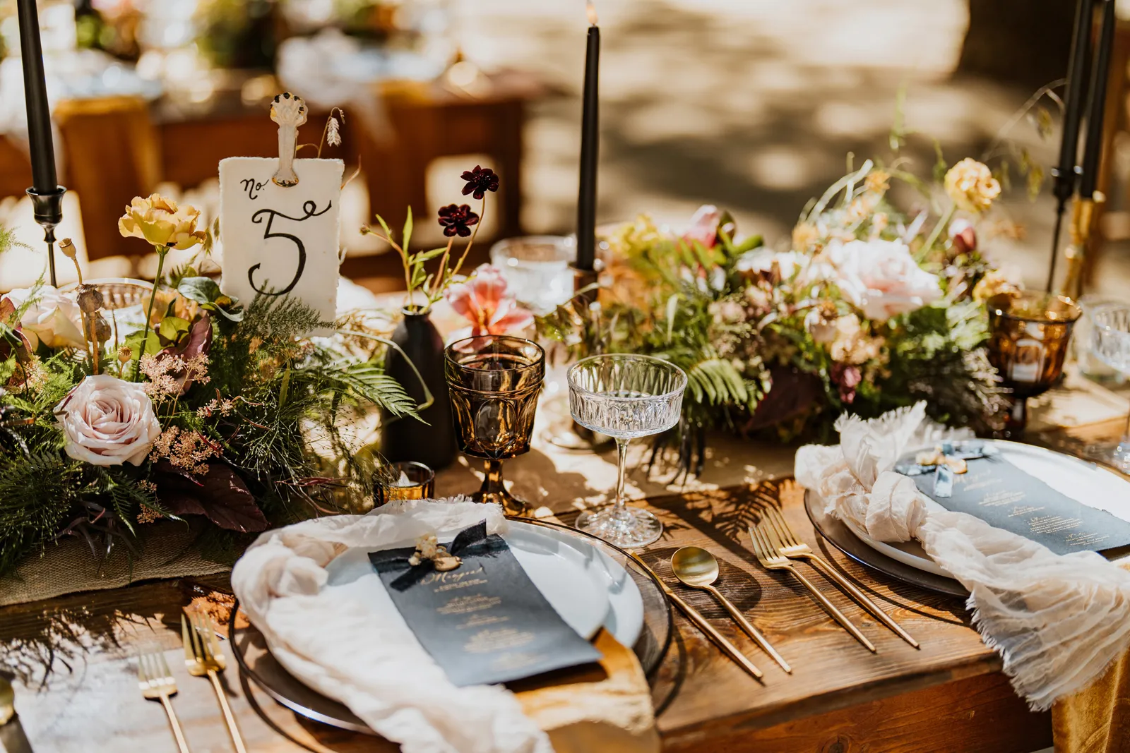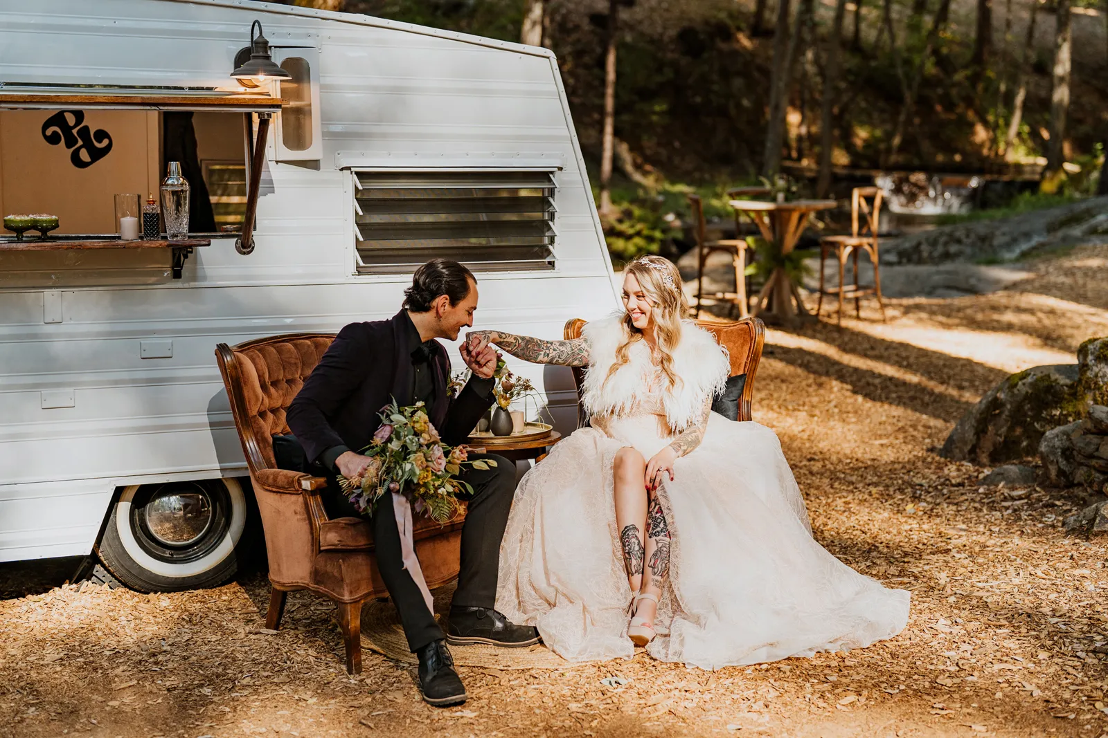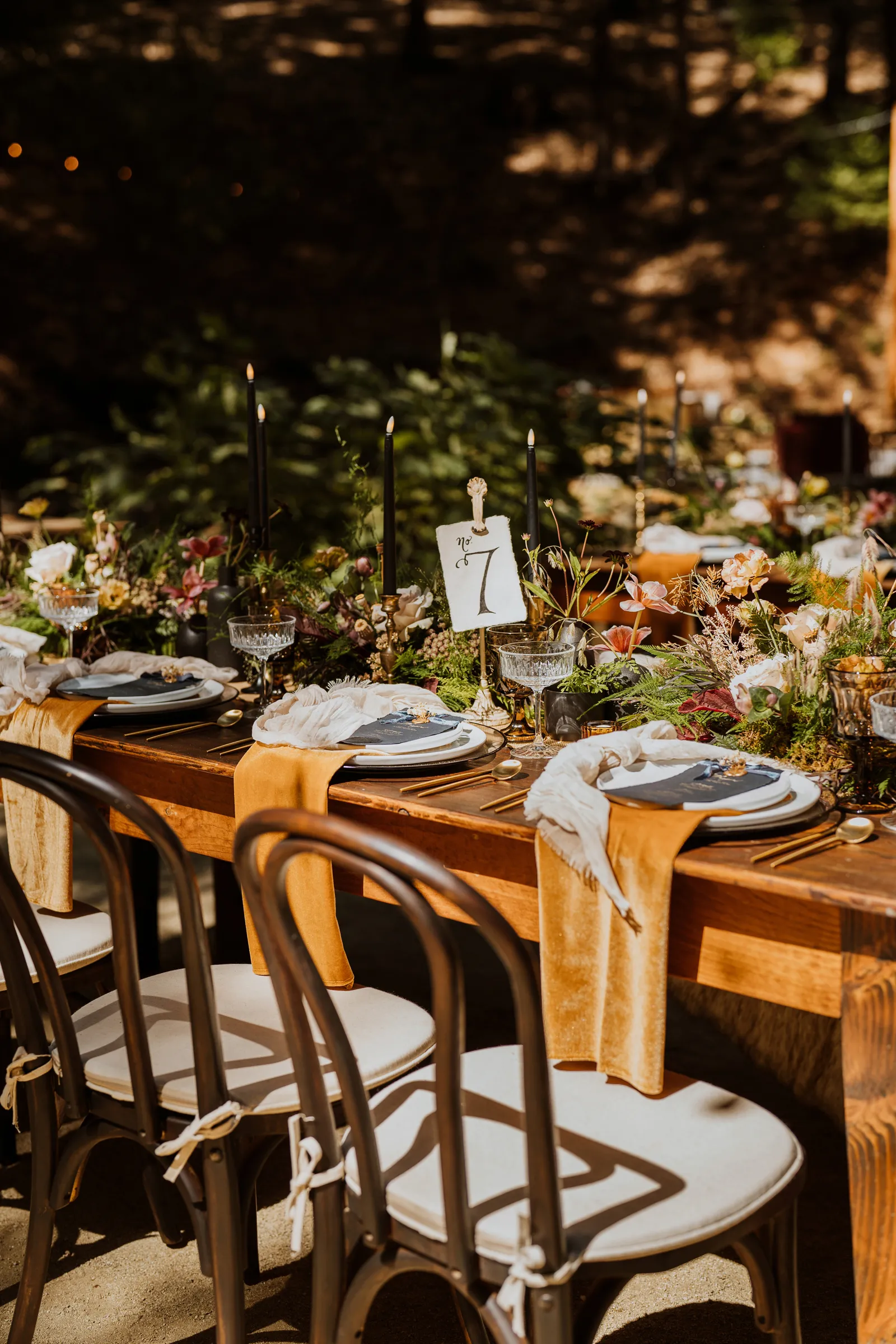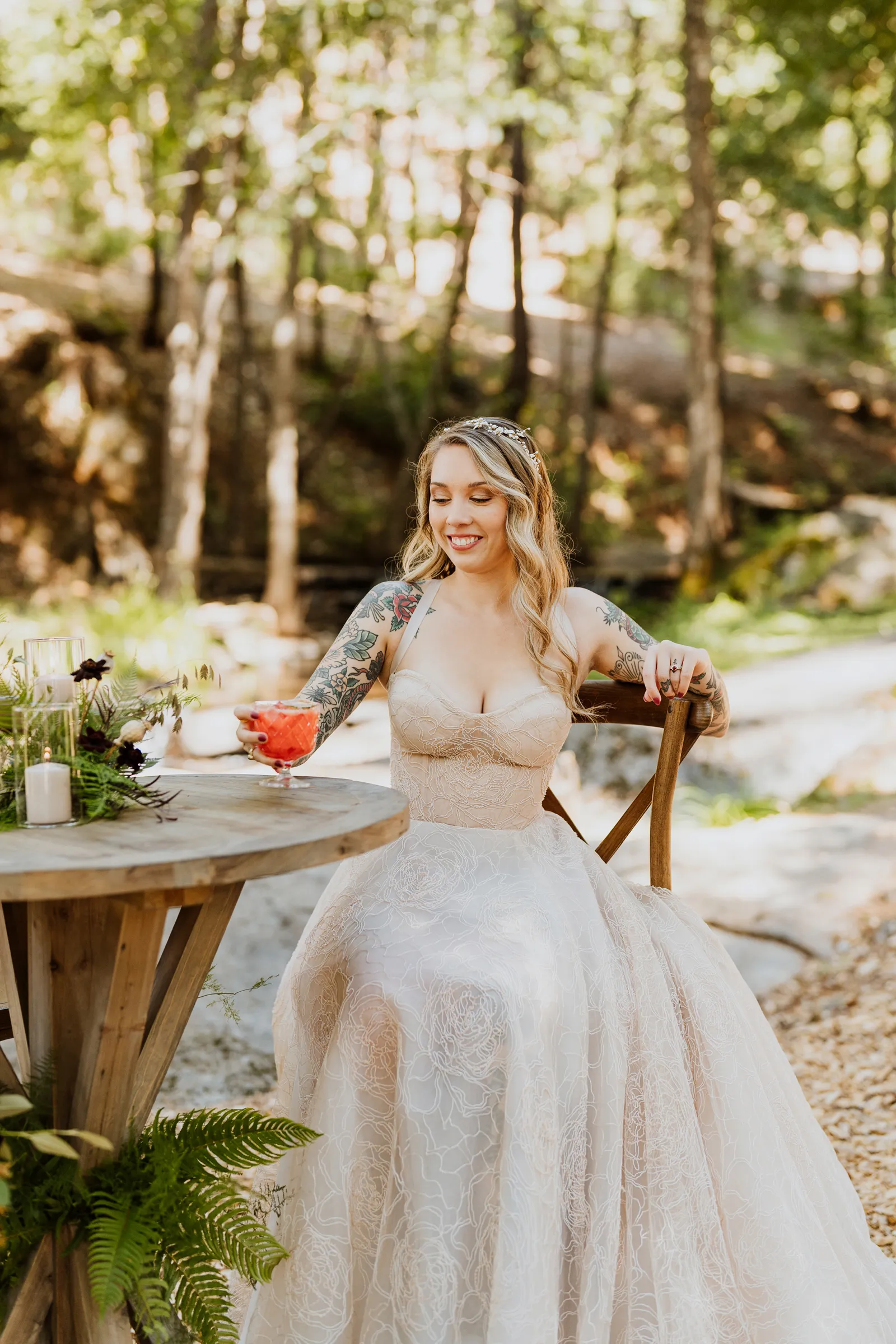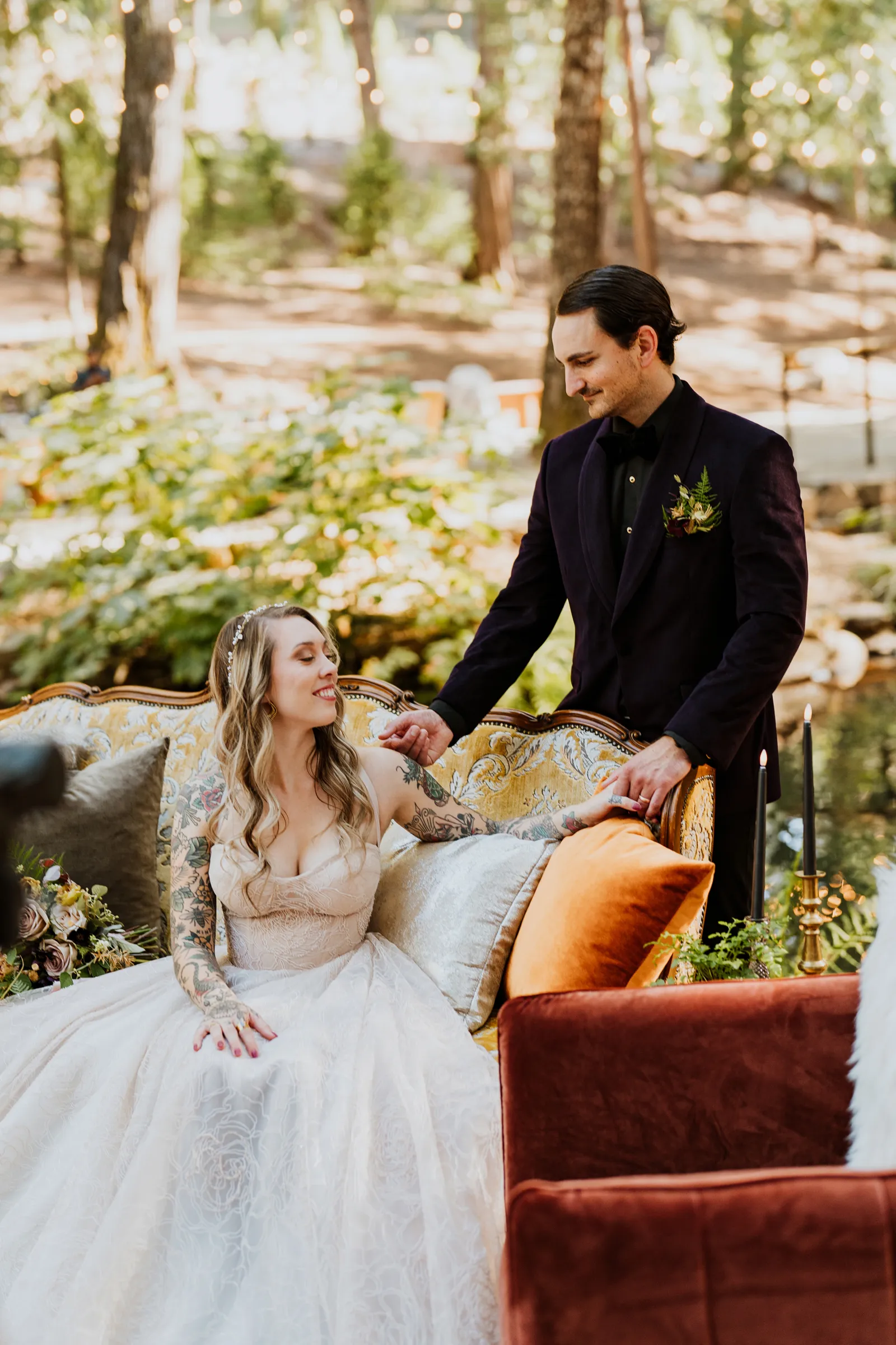 Welcome back to our next installment of Real Weddings Submitted Styled Shoots. Today’s shoot is absolutely brimming with tons of inspiration. With rich purples and black finishes set in the forest (think of a black, multi-tiered cake from Spilled Milk Co., colorful cocktails courtesy of The Parched Poppies, a feathered bolero from Perfect Dress Party and a navy suit from Tuxedo Den) you’re going to get all the romantic, moody vibes from this shoot. Keep scrolling so you can get in on all the amazing details!