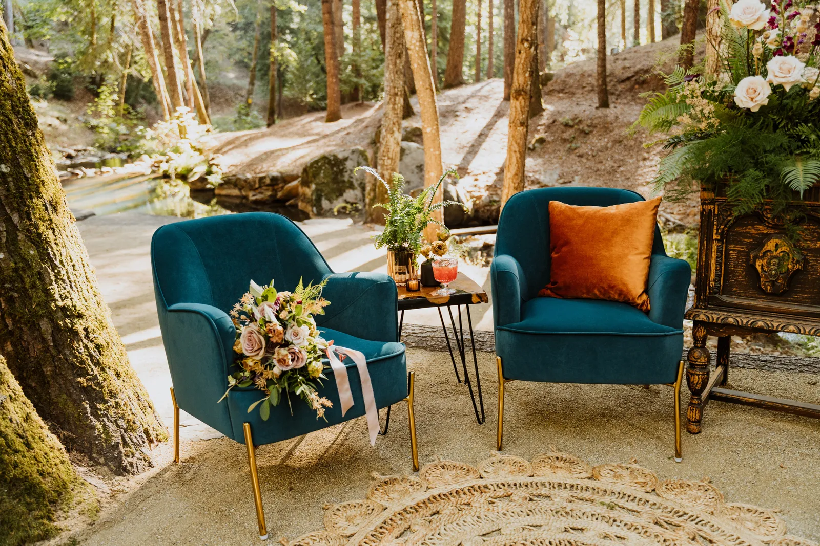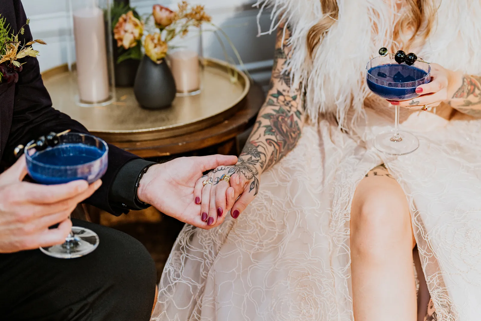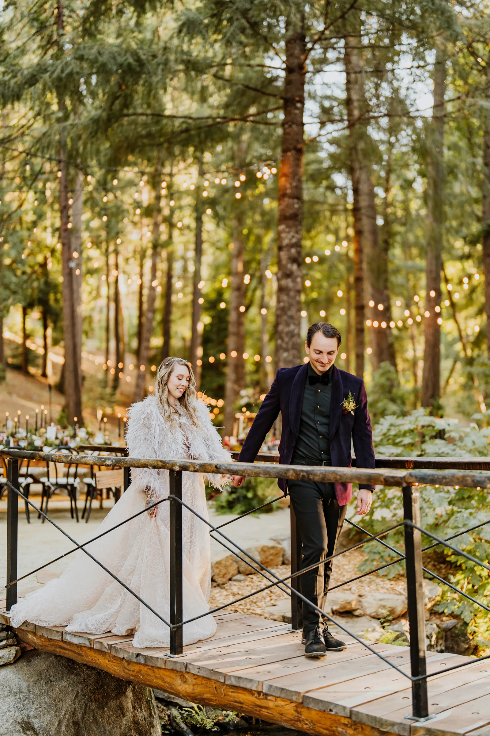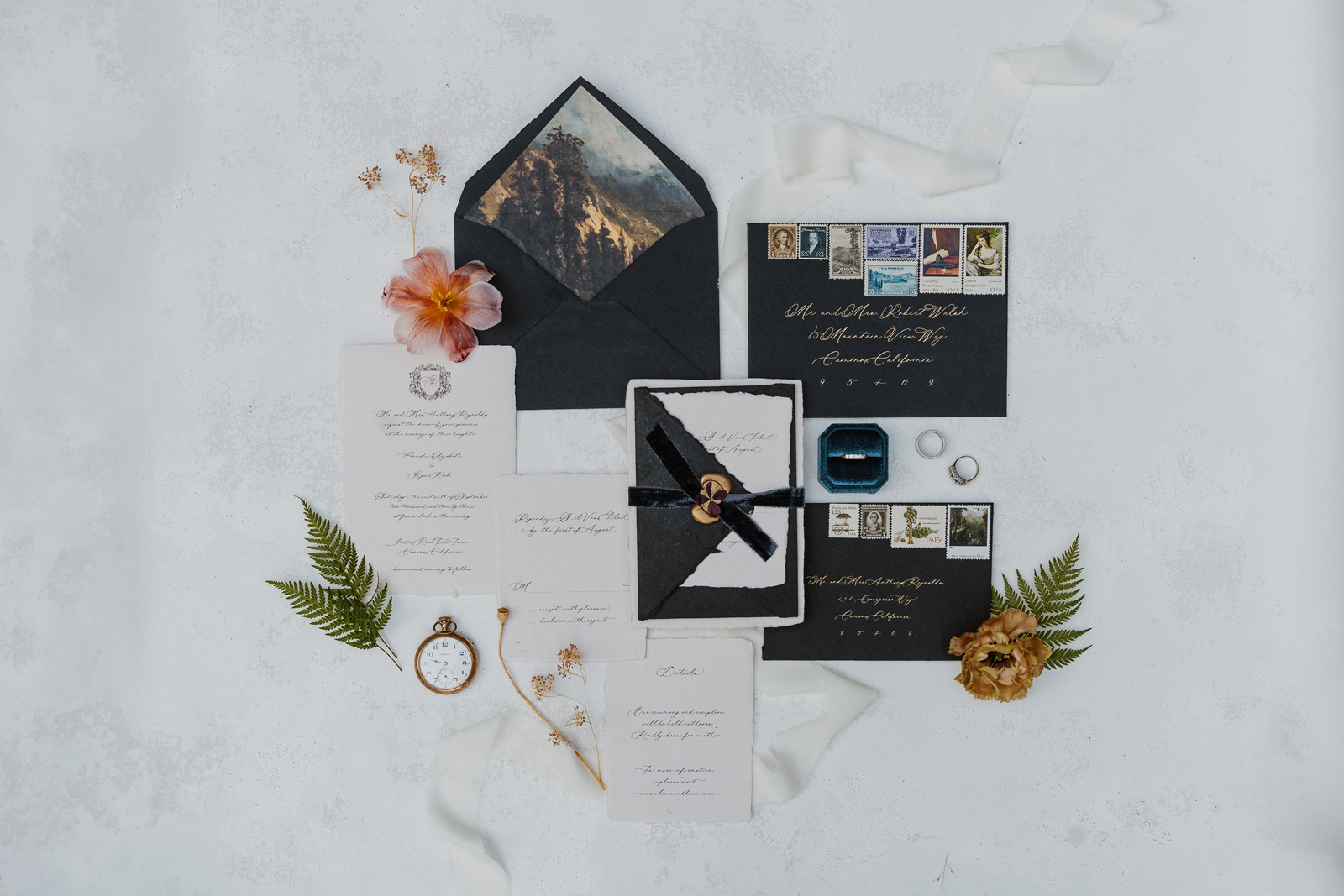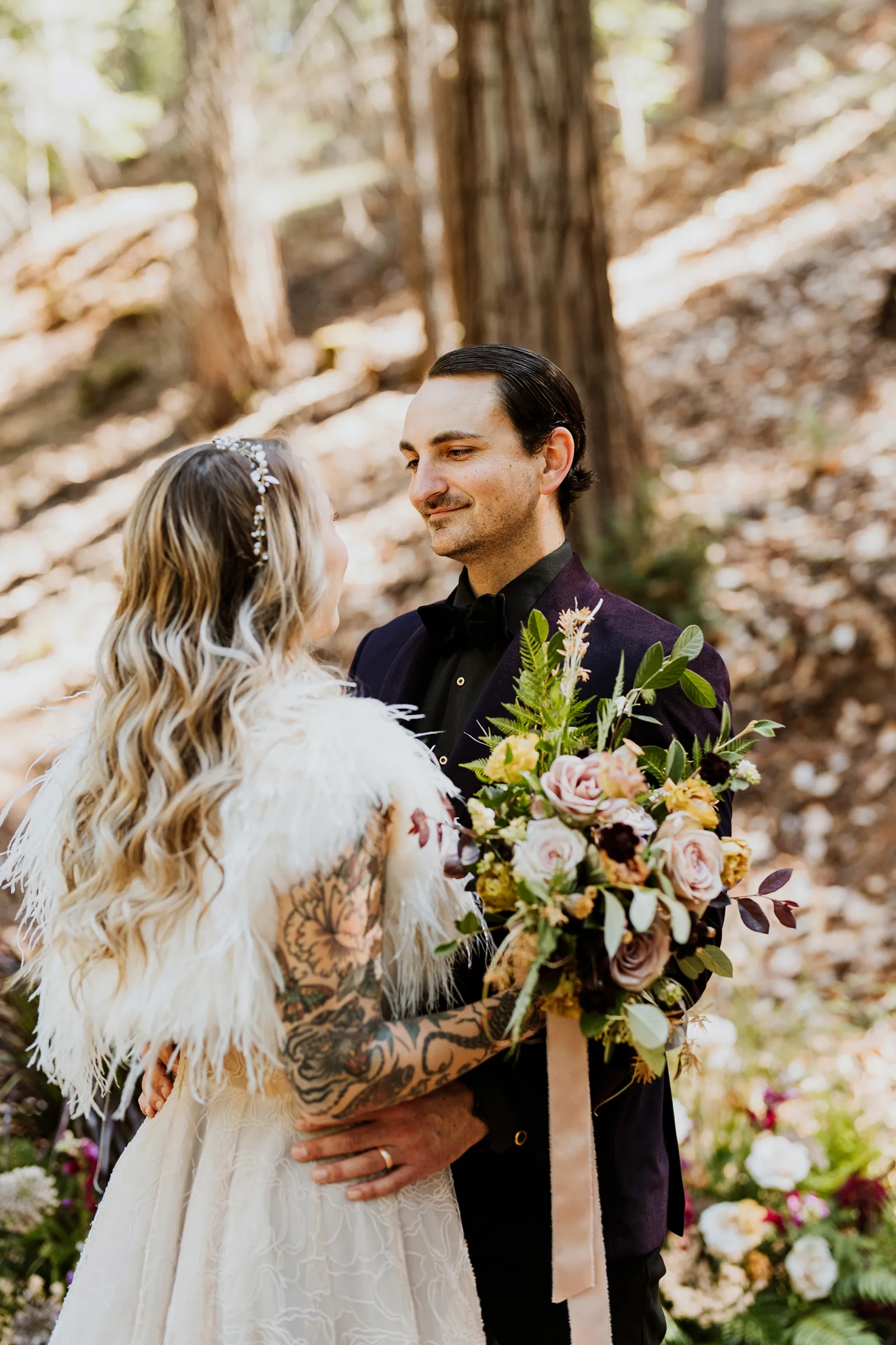 Welcome back to our next installment of Real Weddings Submitted Styled Shoots. Today’s shoot is absolutely brimming with tons of inspiration. With rich purples and black finishes set in the forest (think of a black, multi-tiered cake from Spilled Milk Co., colorful cocktails courtesy of The Parched Poppies, a feathered bolero from Perfect Dress Party and a navy suit from Tuxedo Den) you’re going to get all the romantic, moody vibes from this shoot. Keep scrolling so you can get in on all the amazing details!