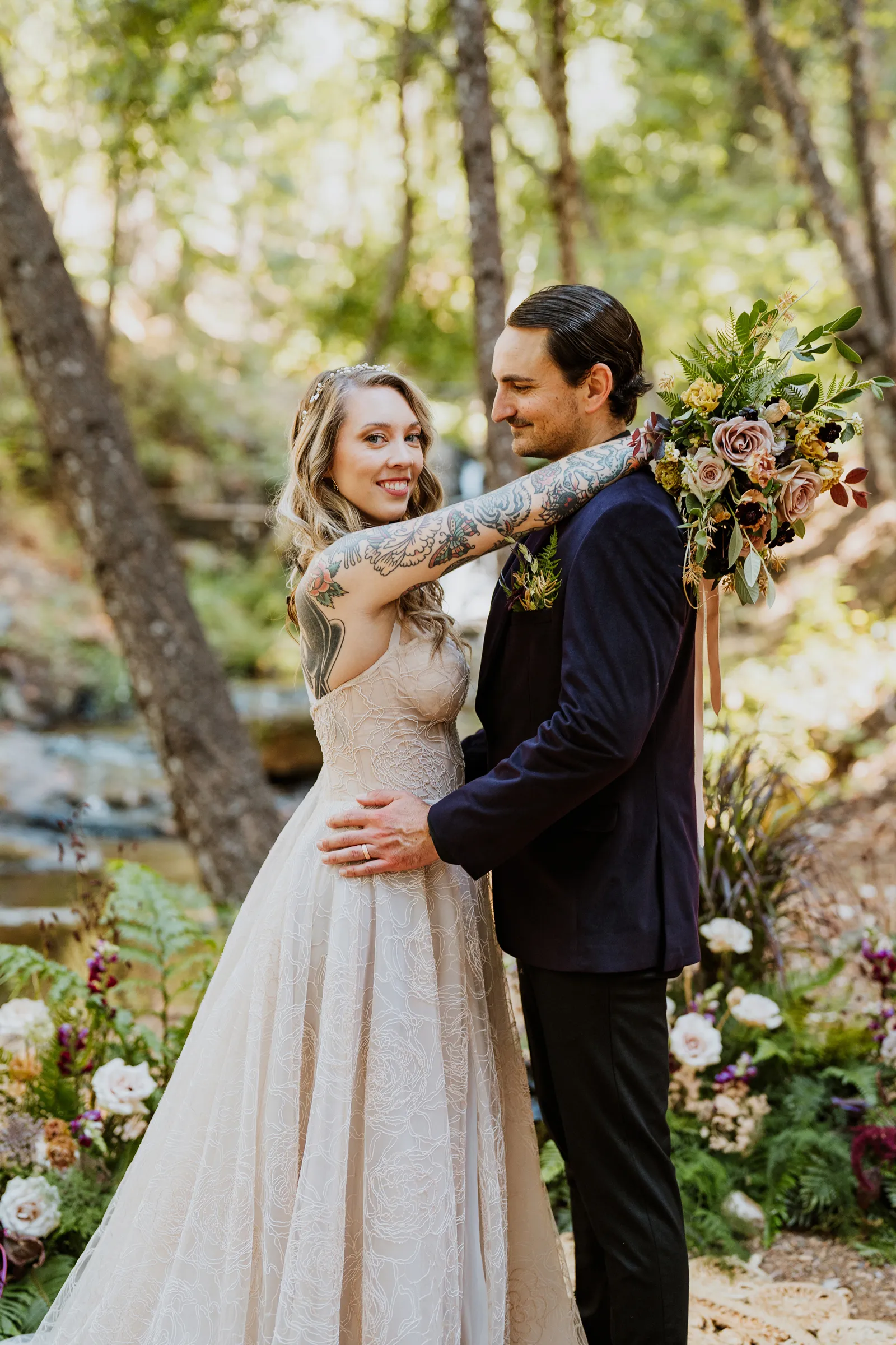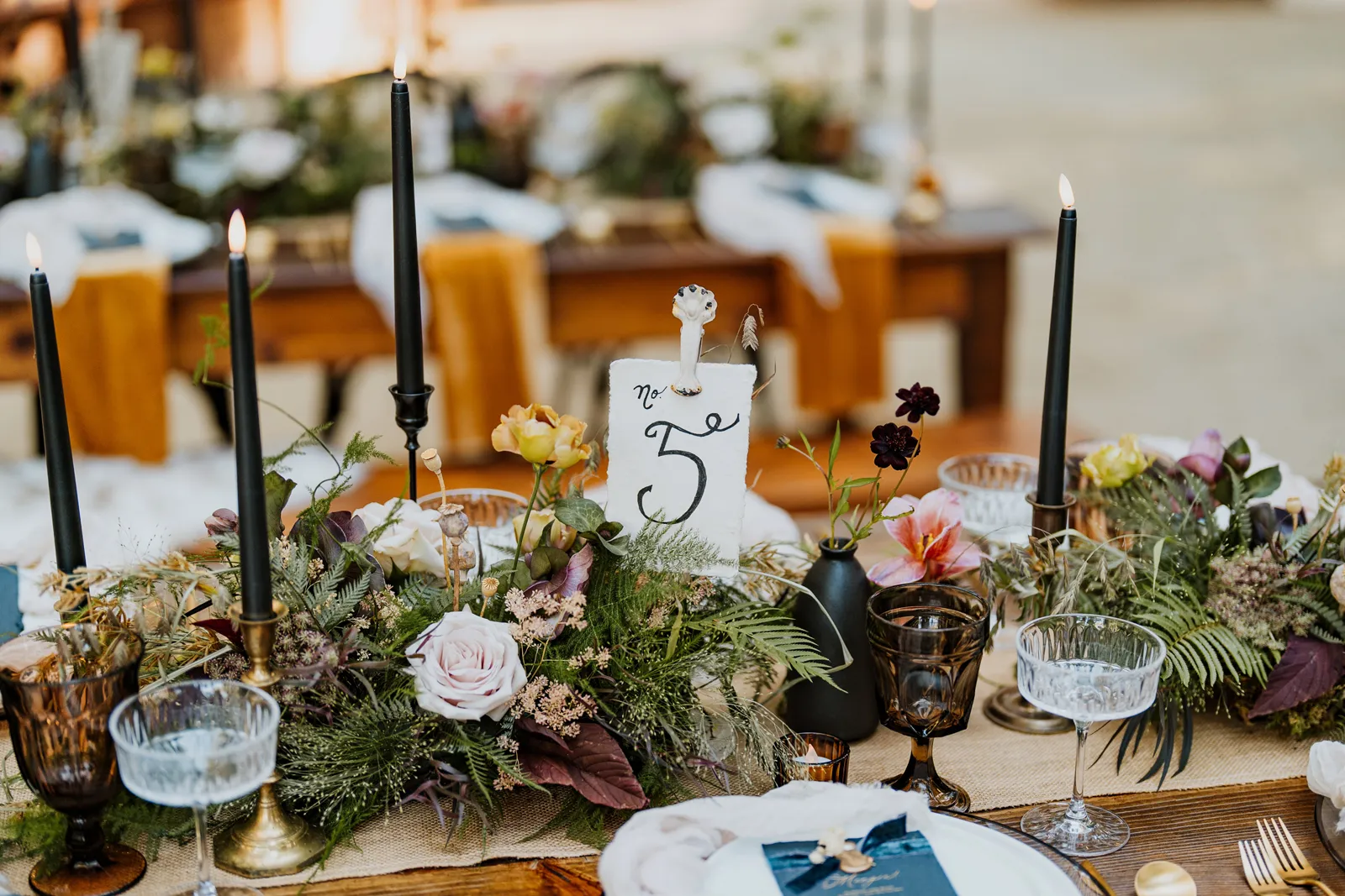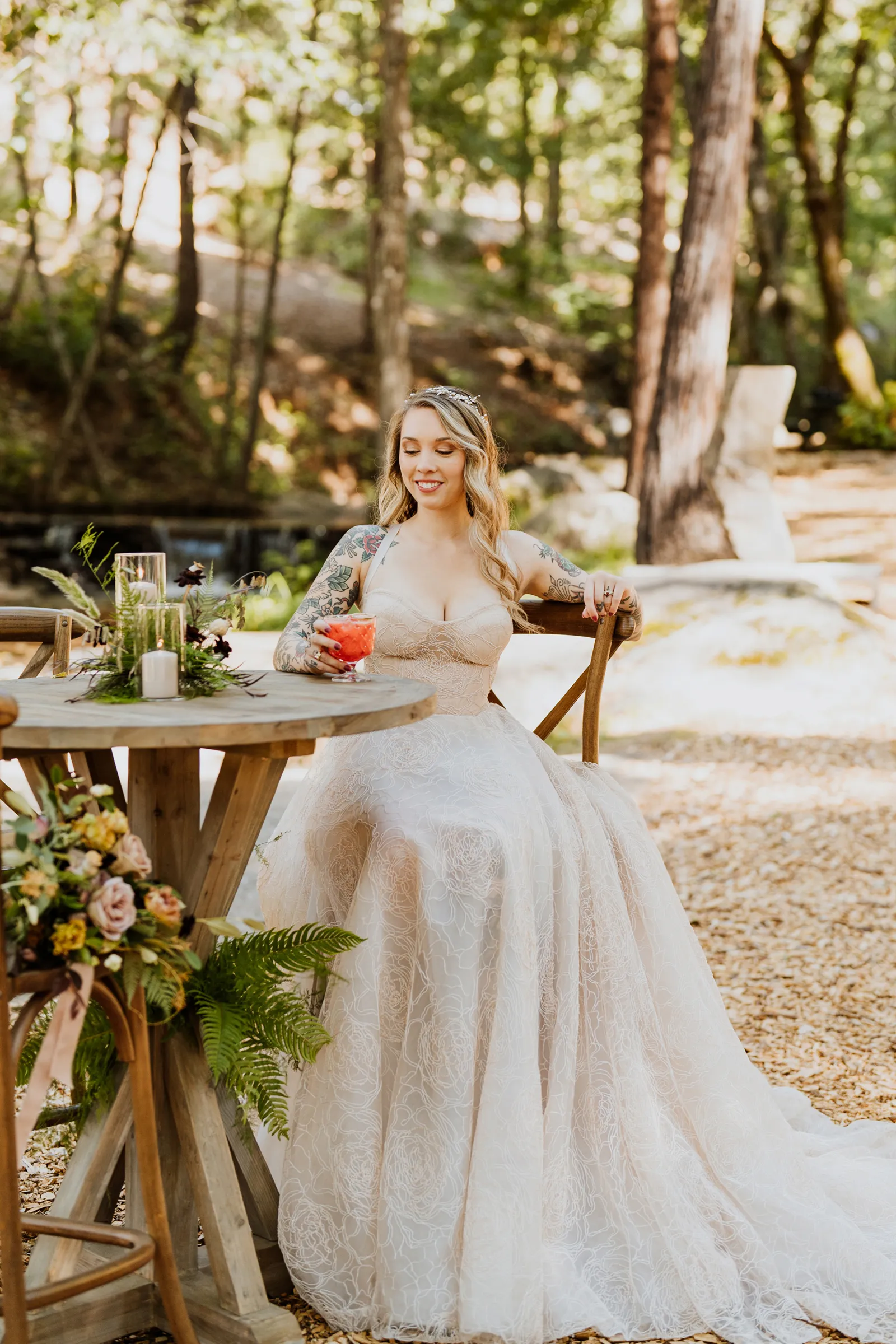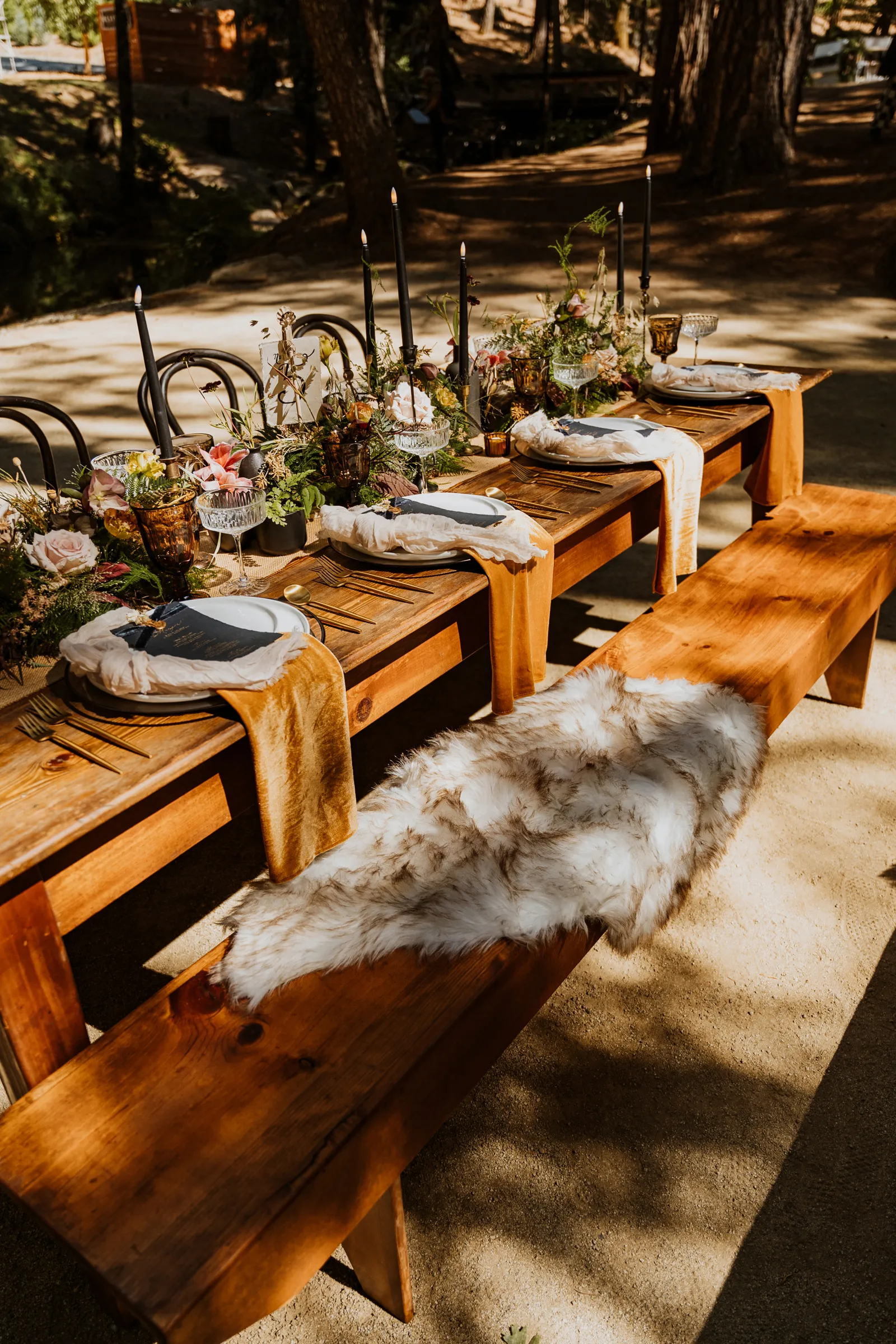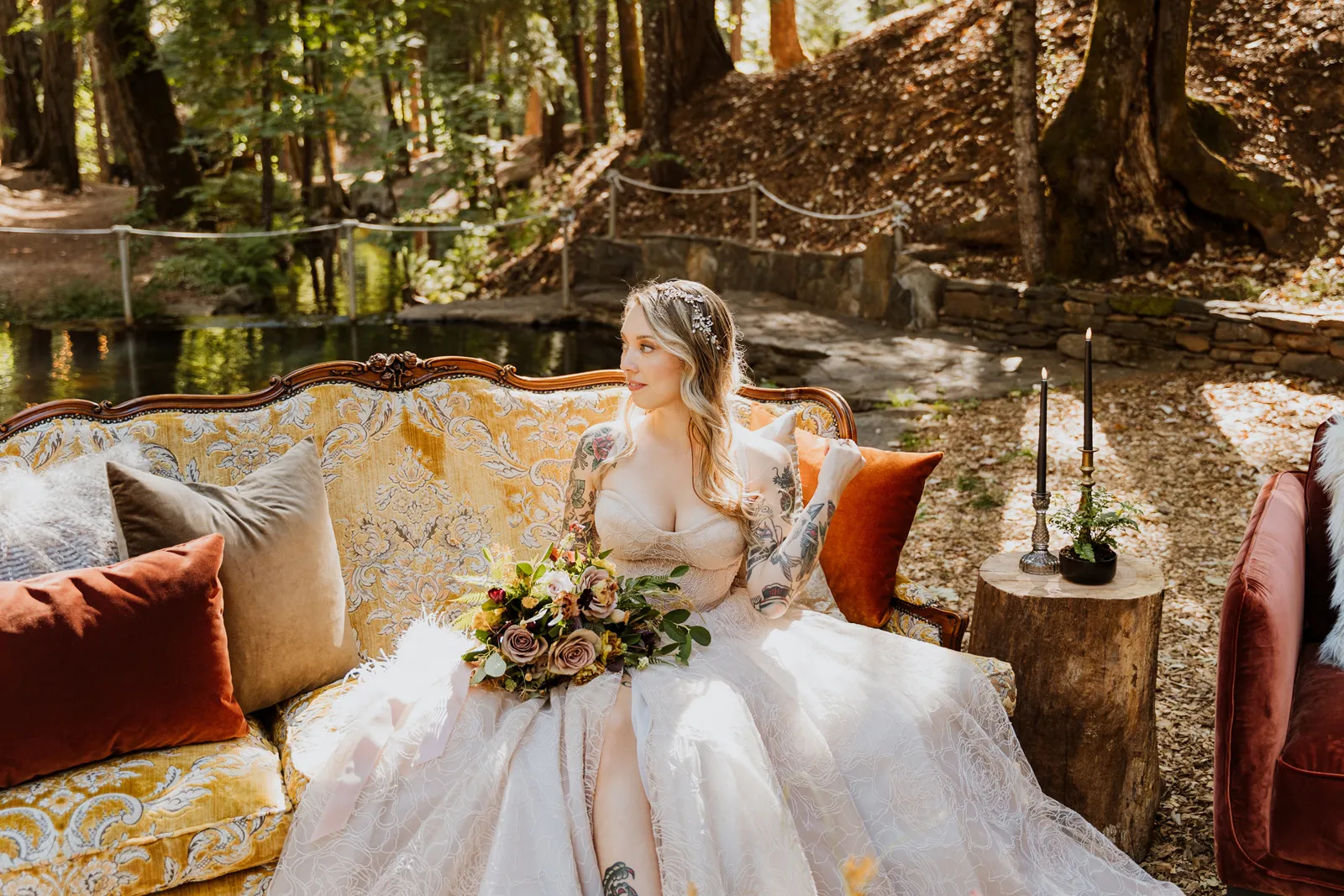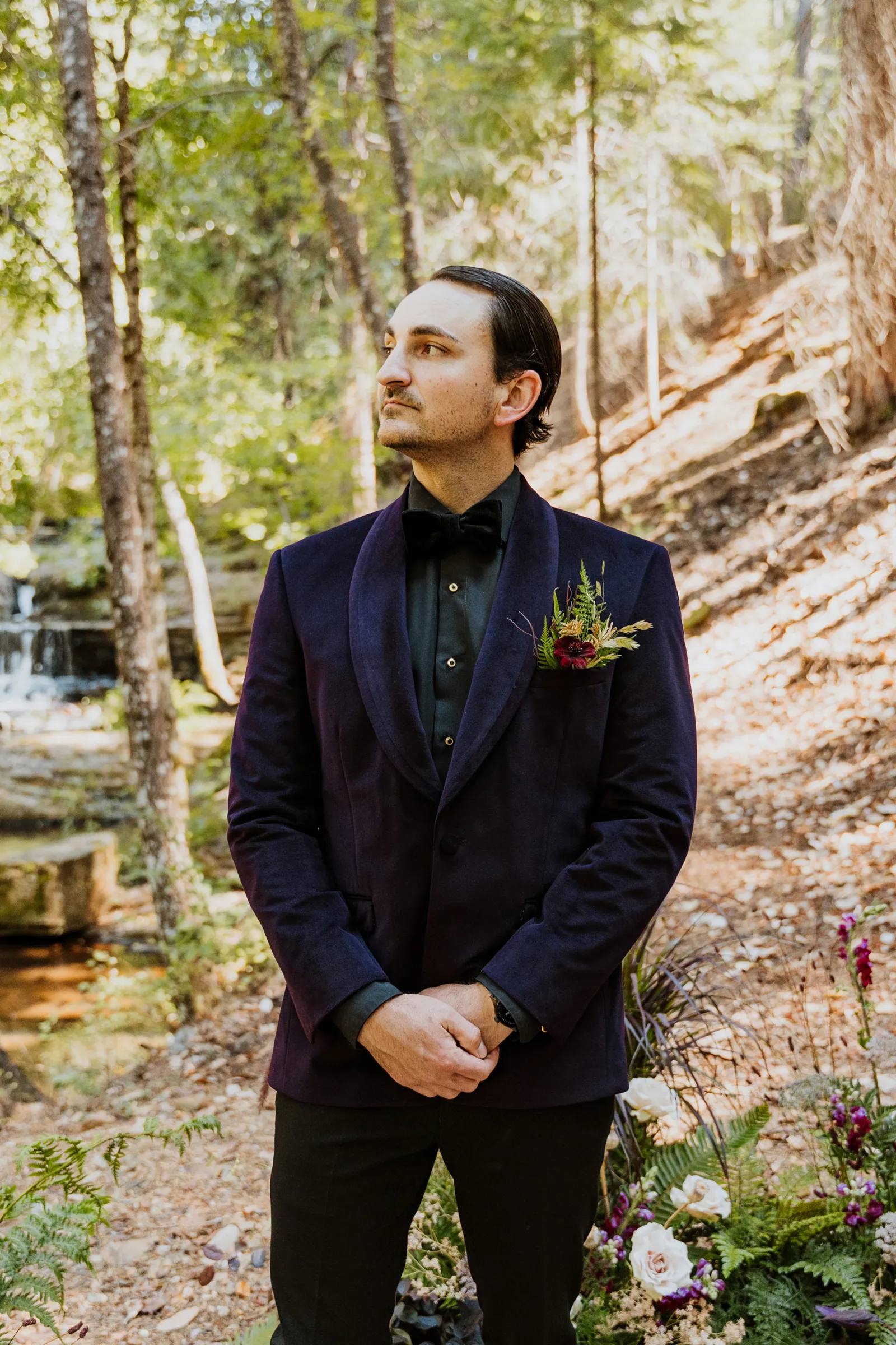 Welcome back to our next installment of Real Weddings Submitted Styled Shoots. Today’s shoot is absolutely brimming with tons of inspiration. With rich purples and black finishes set in the forest (think of a black, multi-tiered cake from Spilled Milk Co., colorful cocktails courtesy of The Parched Poppies, a feathered bolero from Perfect Dress Party and a navy suit from Tuxedo Den) you’re going to get all the romantic, moody vibes from this shoot. Keep scrolling so you can get in on all the amazing details!