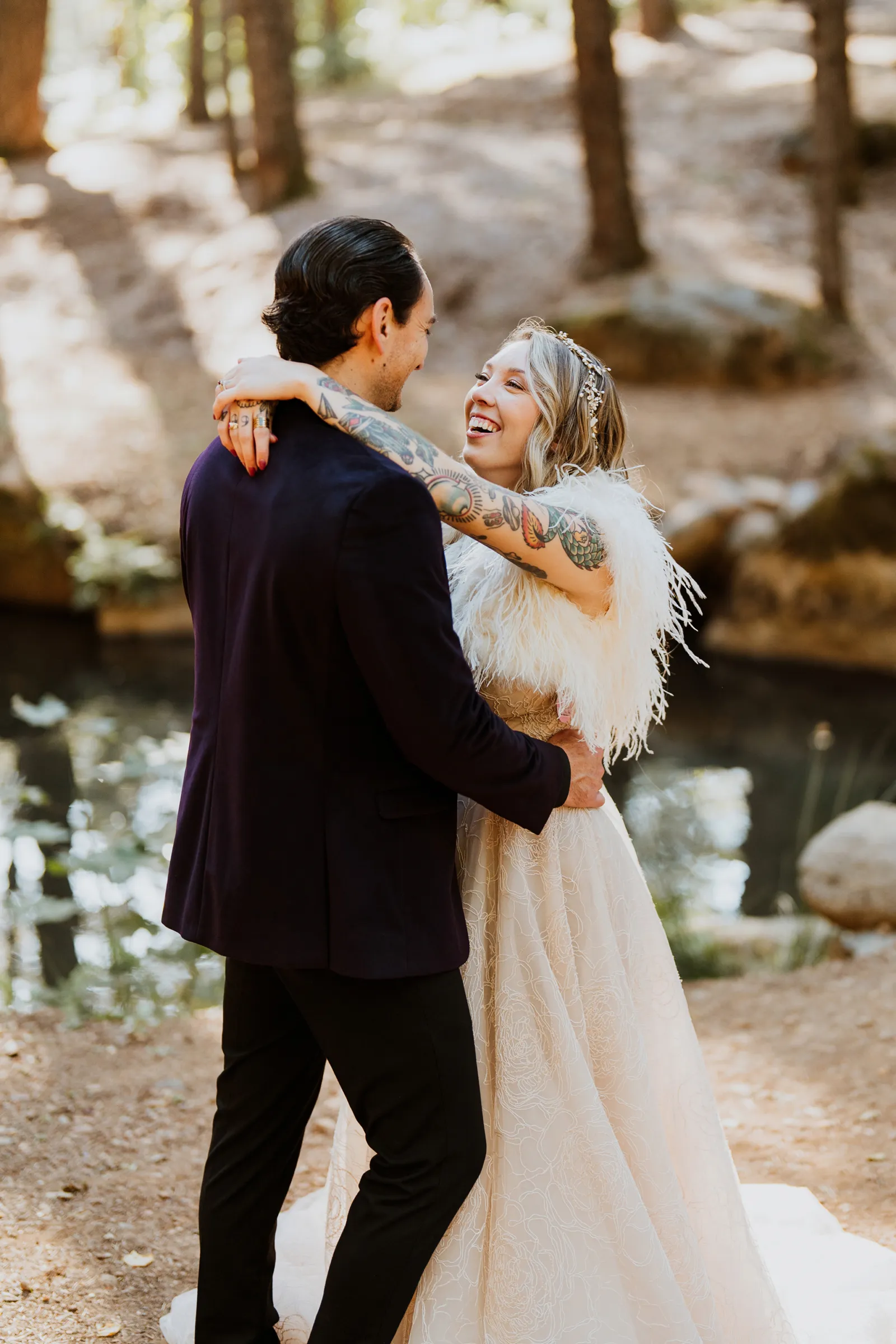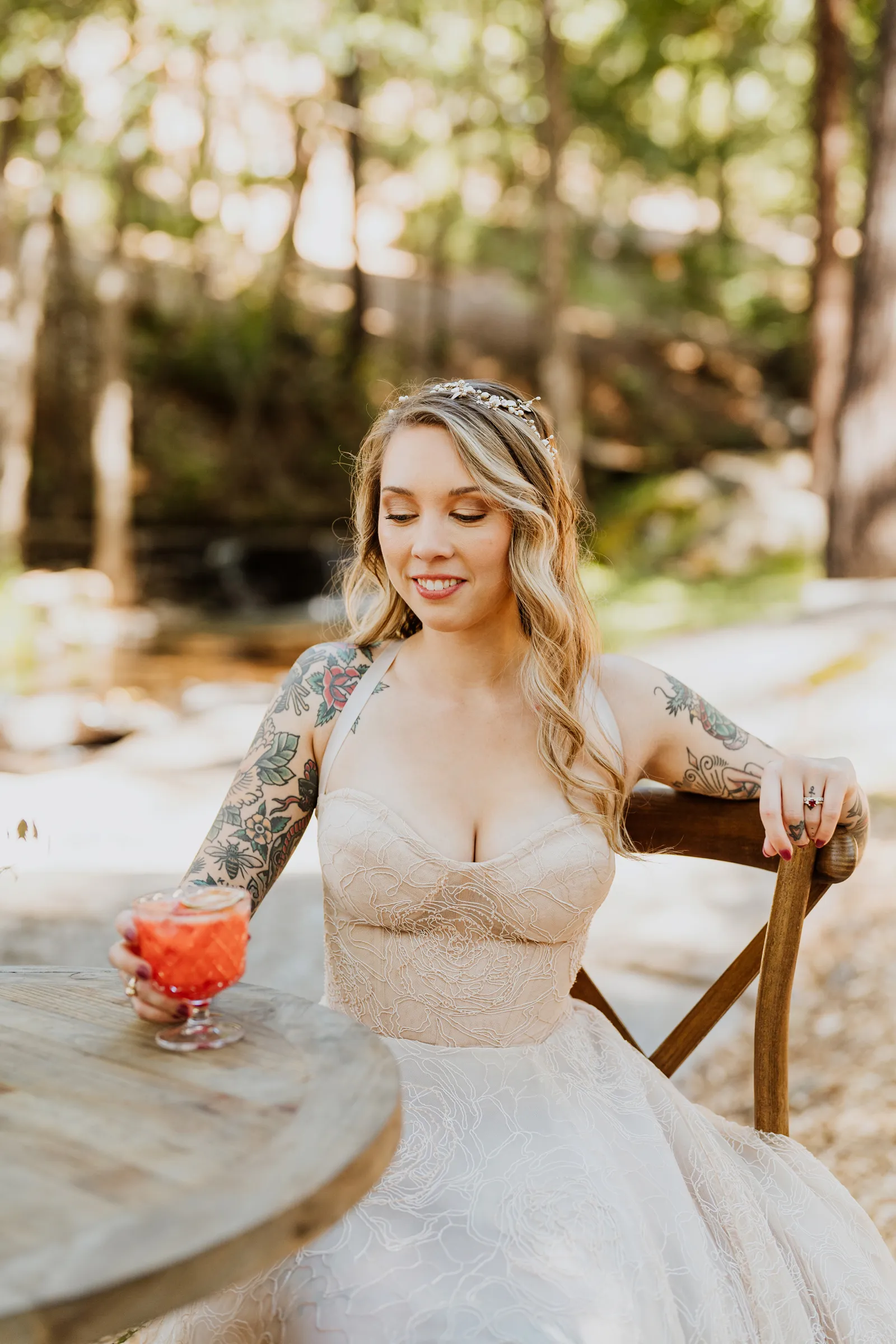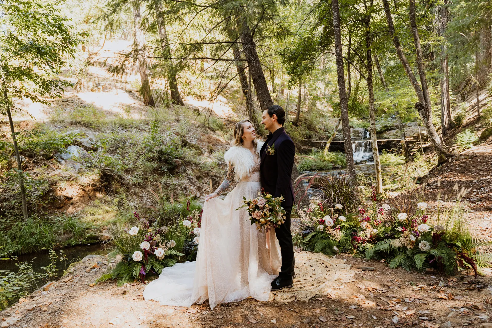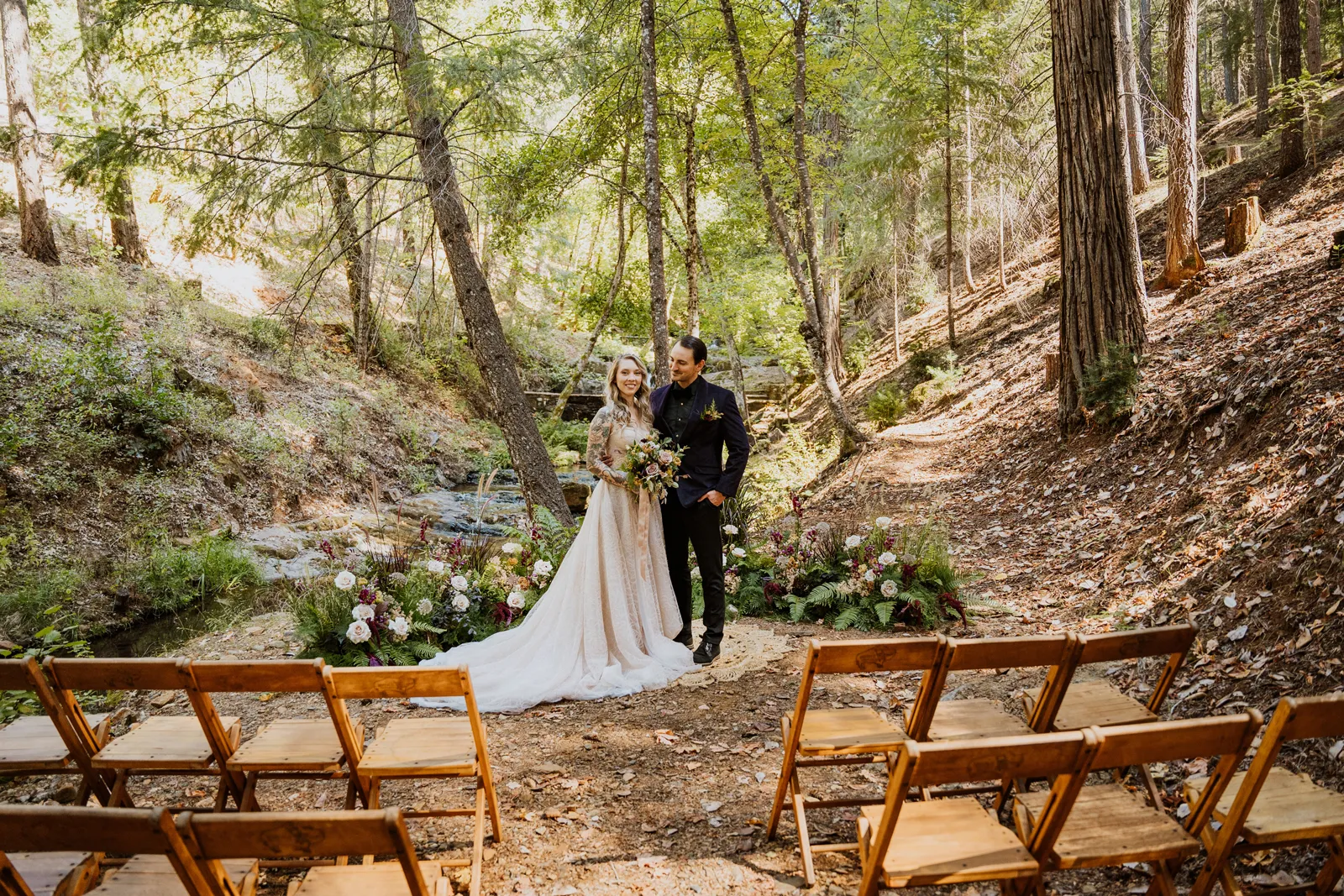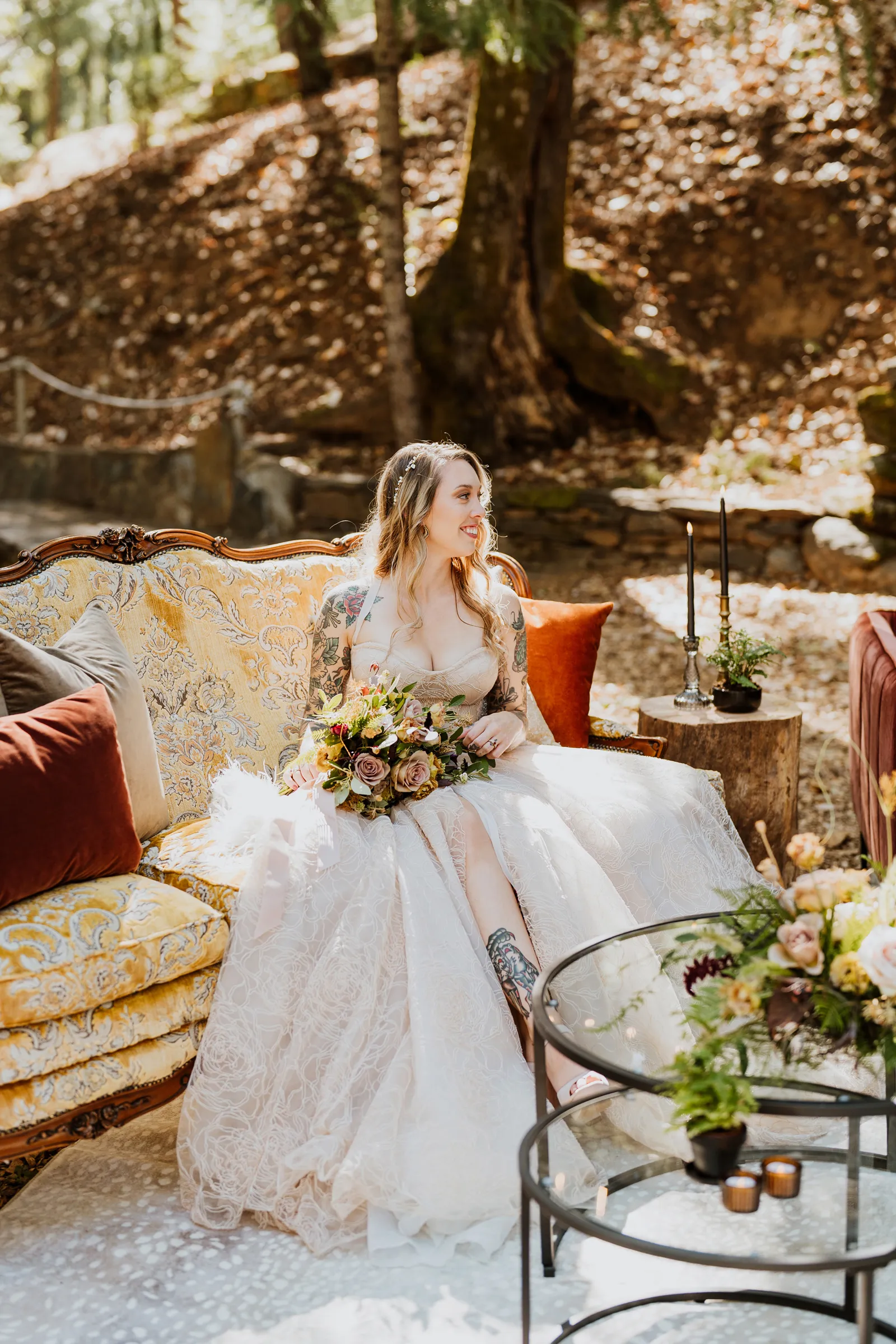 Welcome back to our next installment of Real Weddings Submitted Styled Shoots. Today’s shoot is absolutely brimming with tons of inspiration. With rich purples and black finishes set in the forest (think of a black, multi-tiered cake from Spilled Milk Co., colorful cocktails courtesy of The Parched Poppies, a feathered bolero from Perfect Dress Party and a navy suit from Tuxedo Den) you’re going to get all the romantic, moody vibes from this shoot. Keep scrolling so you can get in on all the amazing details!