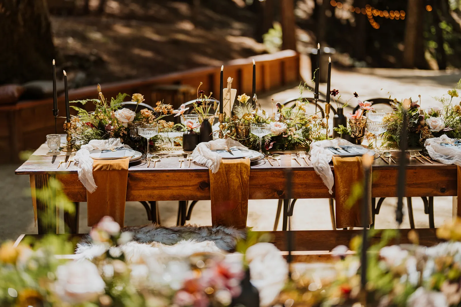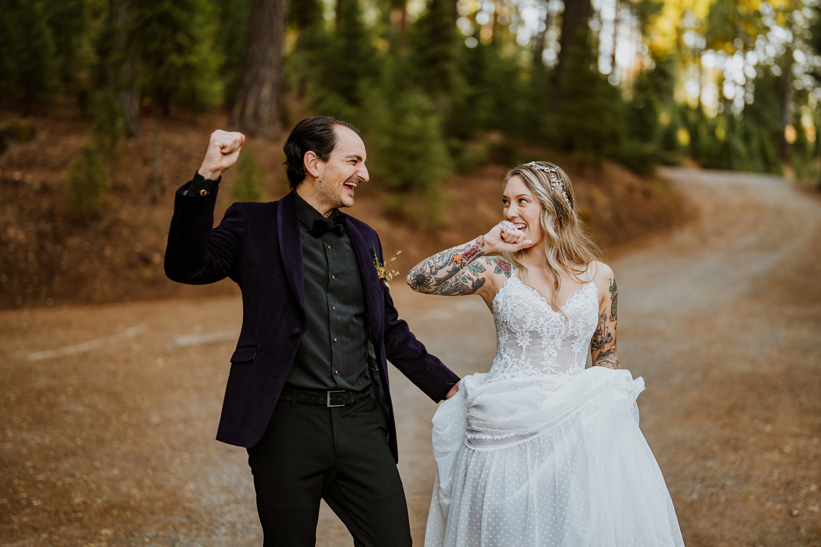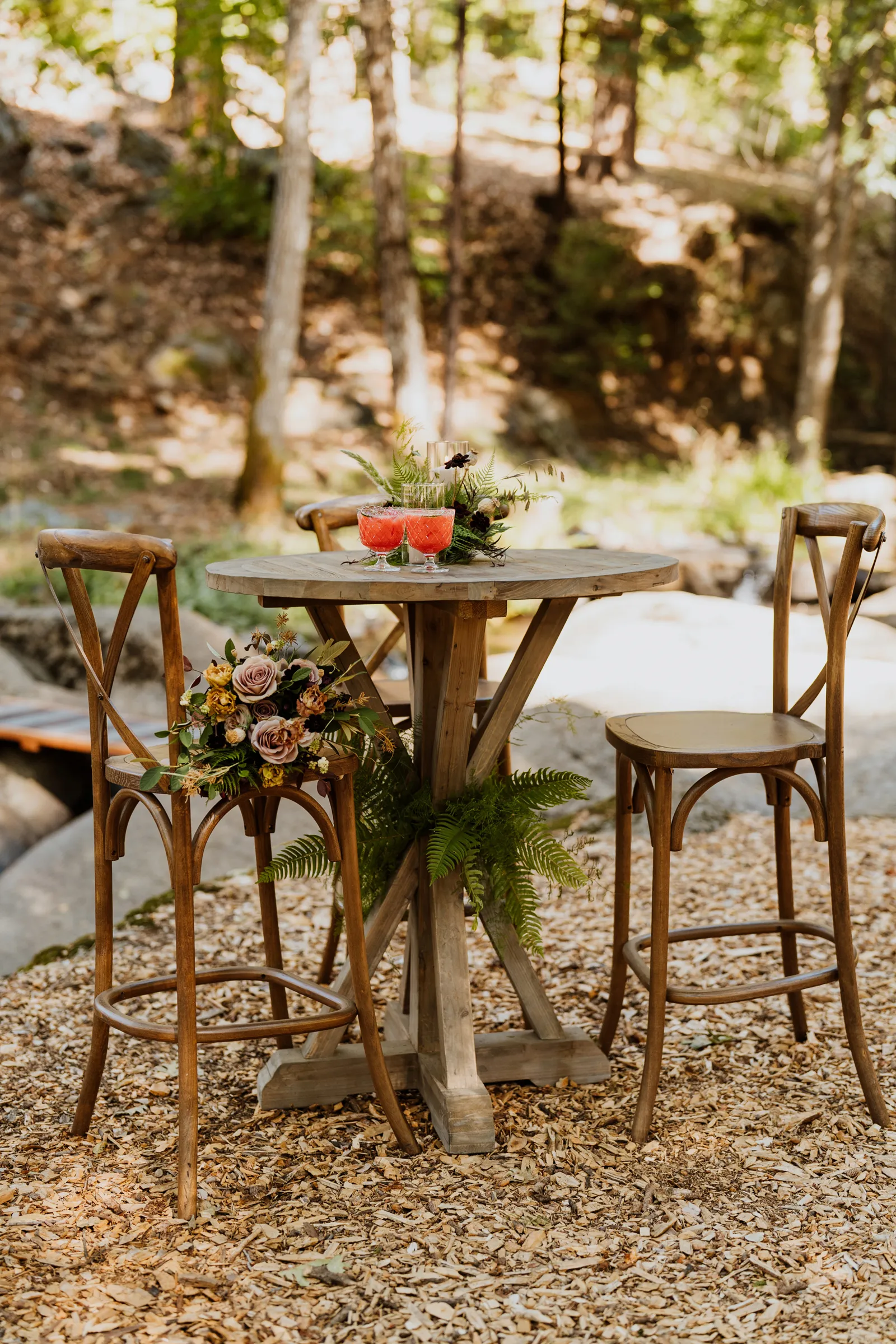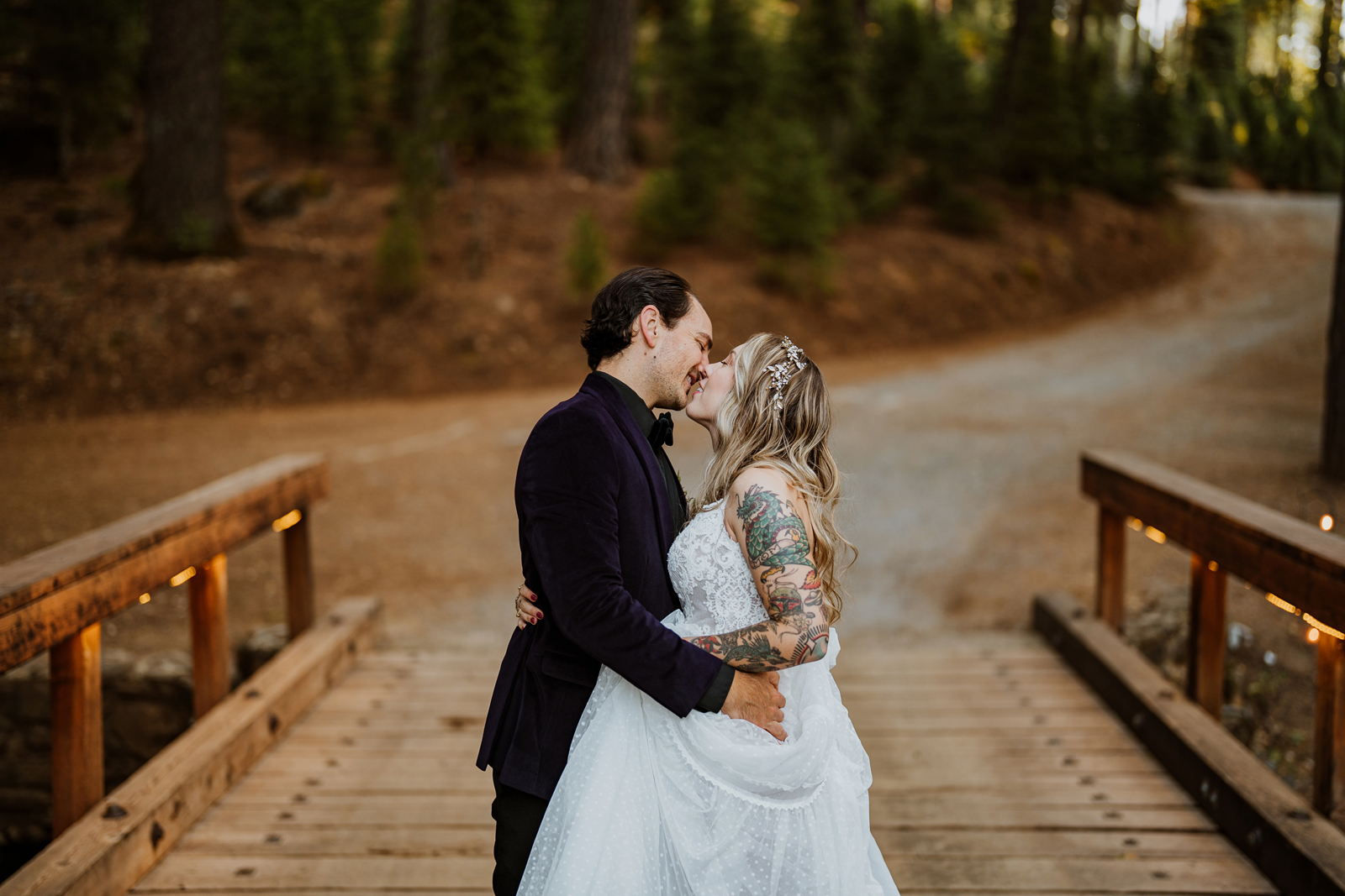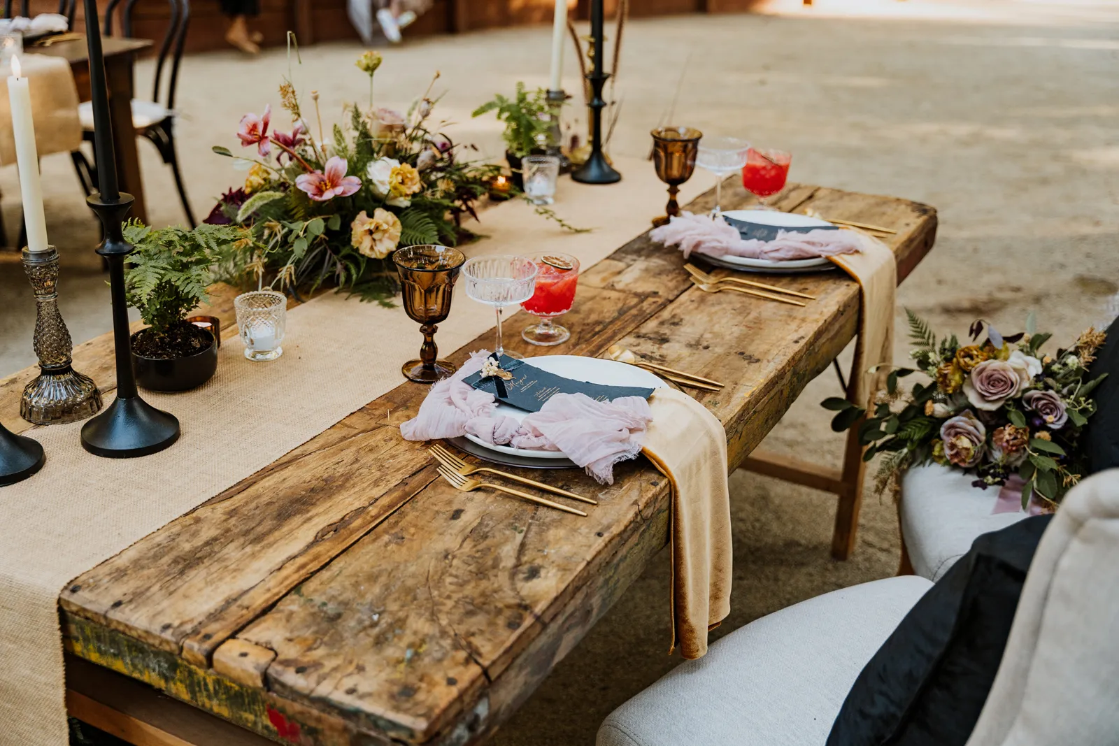 Welcome back to our next installment of Real Weddings Submitted Styled Shoots. Today’s shoot is absolutely brimming with tons of inspiration. With rich purples and black finishes set in the forest (think of a black, multi-tiered cake from Spilled Milk Co., colorful cocktails courtesy of The Parched Poppies, a feathered bolero from Perfect Dress Party and a navy suit from Tuxedo Den) you’re going to get all the romantic, moody vibes from this shoot. Keep scrolling so you can get in on all the amazing details!