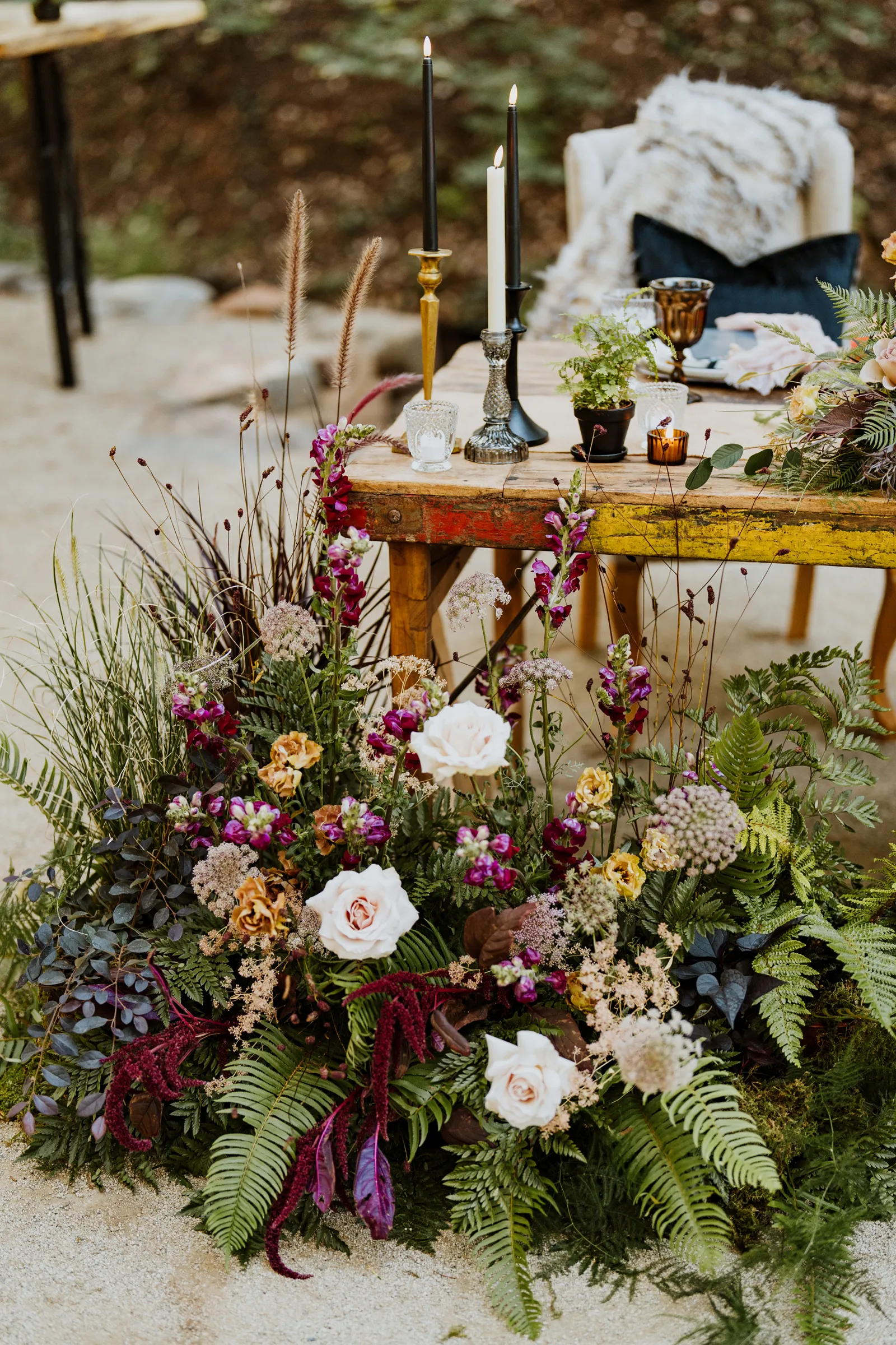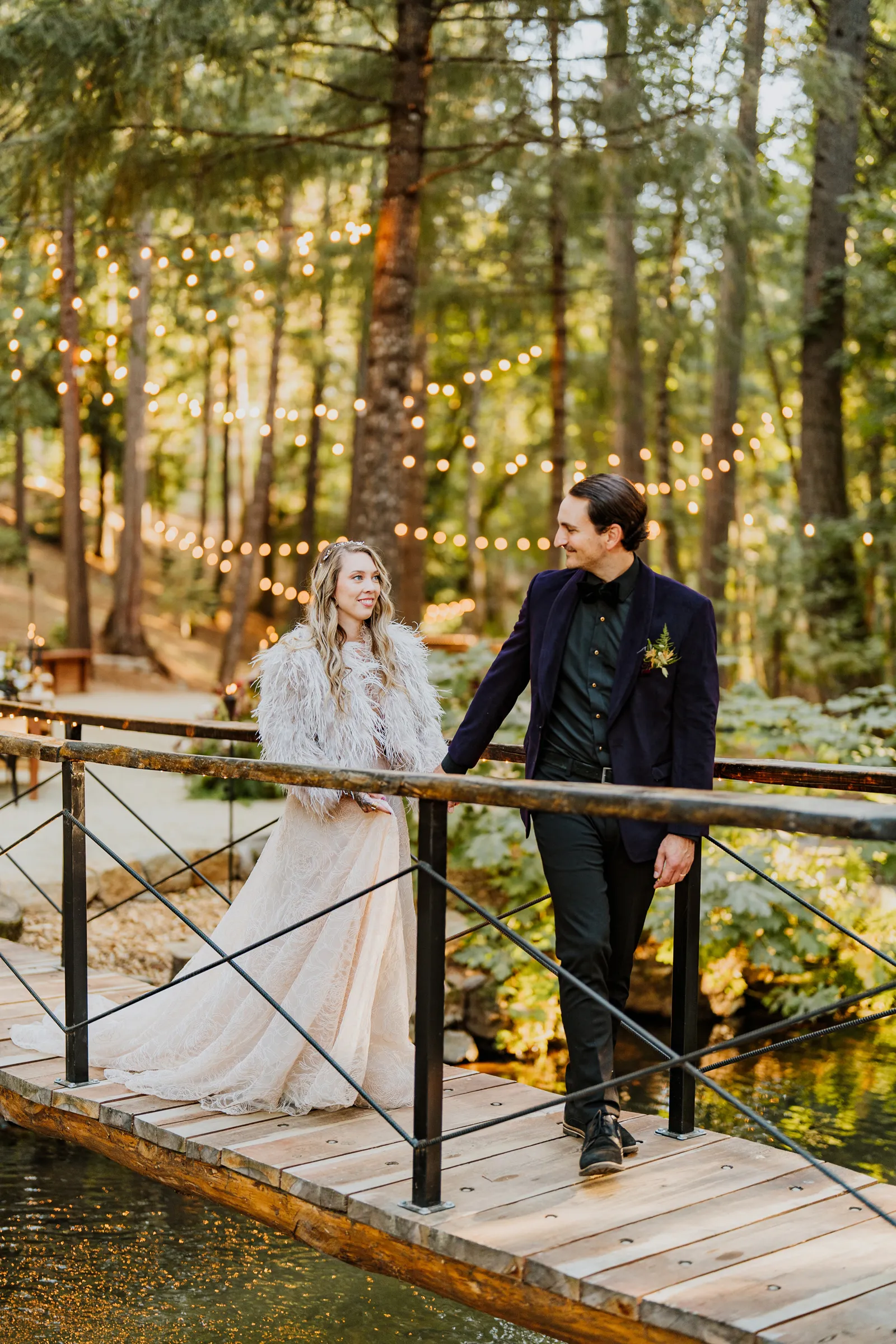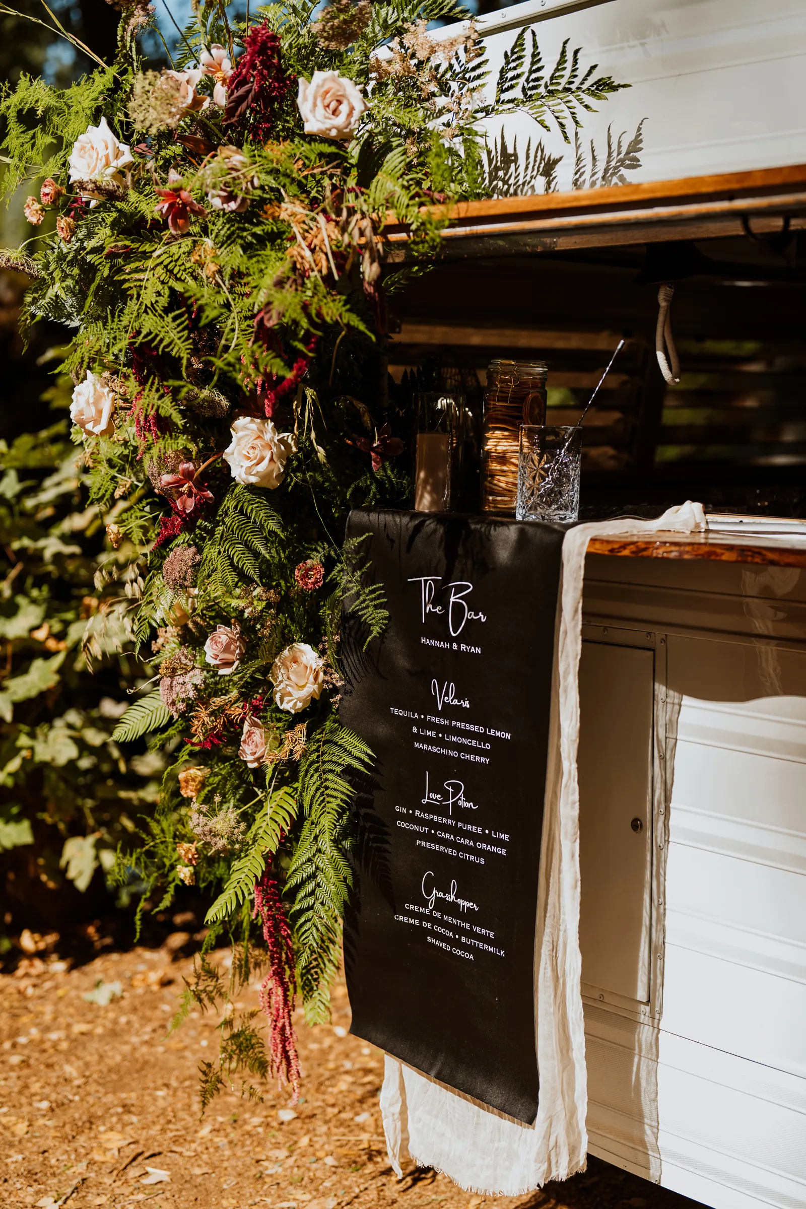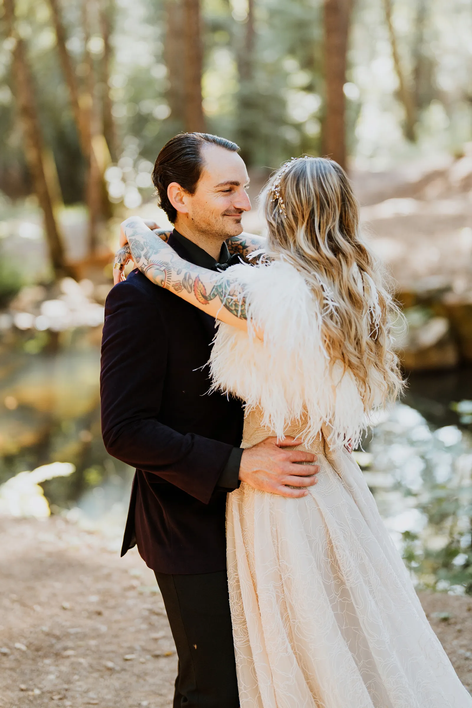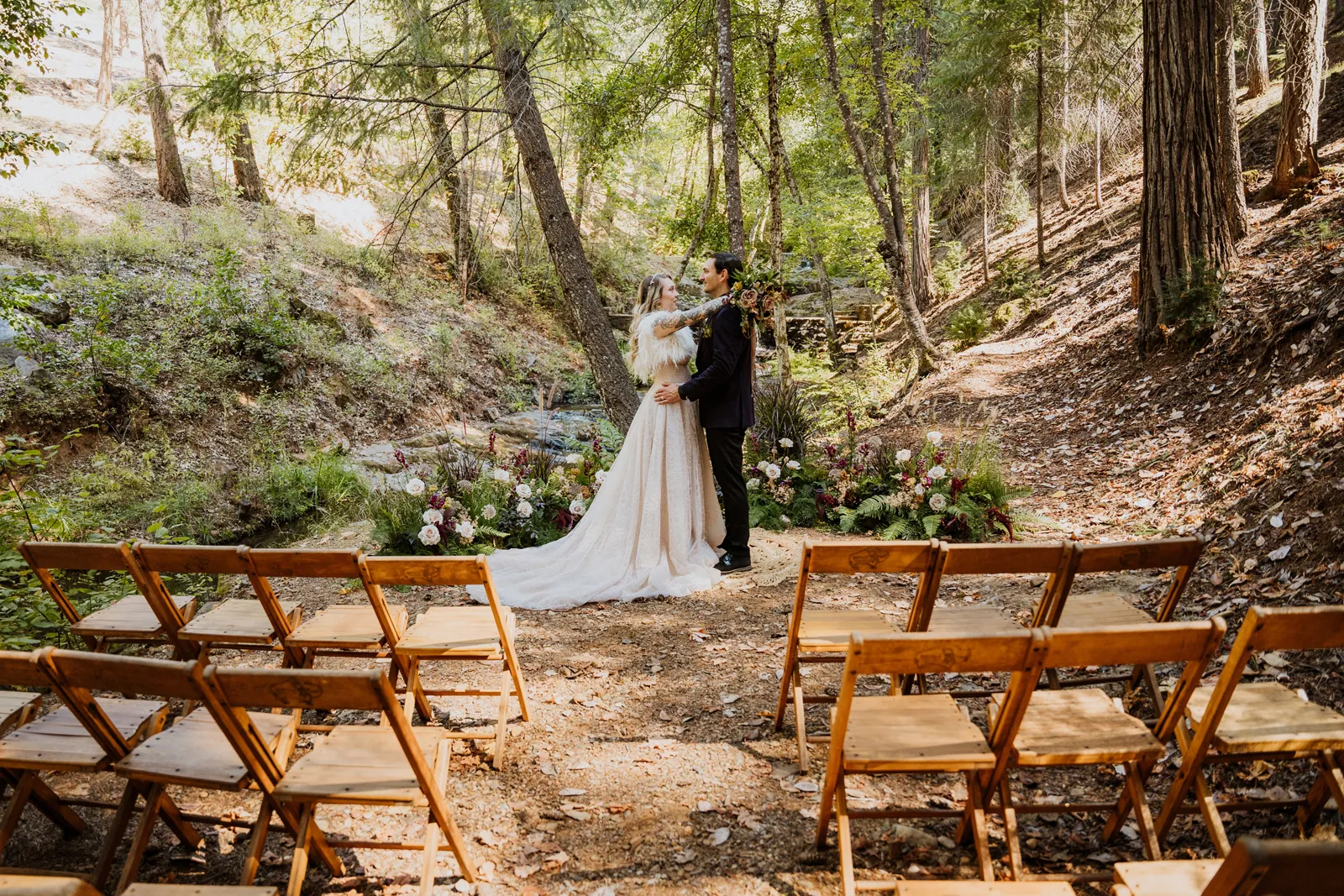 Welcome back to our next installment of Real Weddings Submitted Styled Shoots. Today’s shoot is absolutely brimming with tons of inspiration. With rich purples and black finishes set in the forest (think of a black, multi-tiered cake from Spilled Milk Co., colorful cocktails courtesy of The Parched Poppies, a feathered bolero from Perfect Dress Party and a navy suit from Tuxedo Den) you’re going to get all the romantic, moody vibes from this shoot. Keep scrolling so you can get in on all the amazing details!
