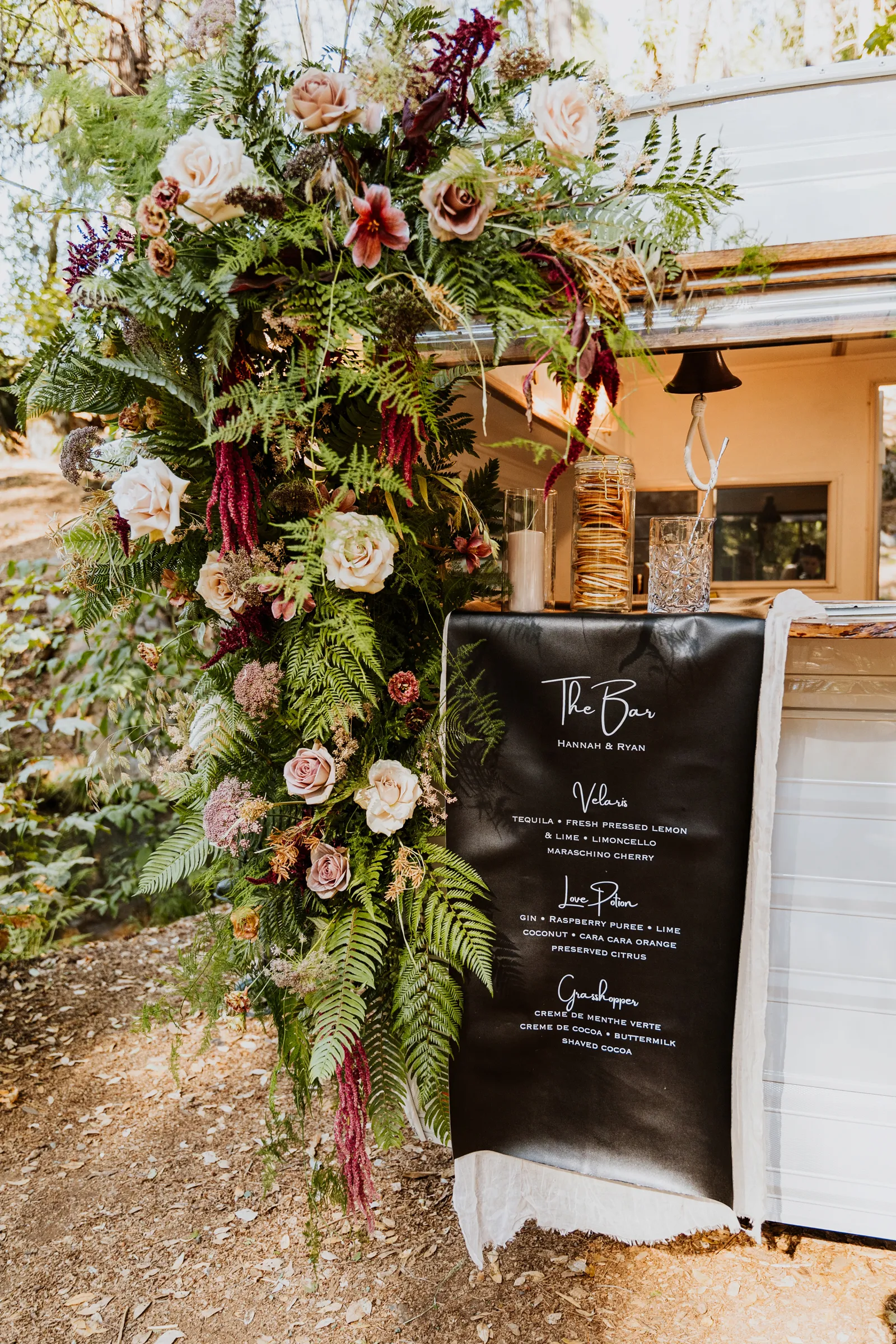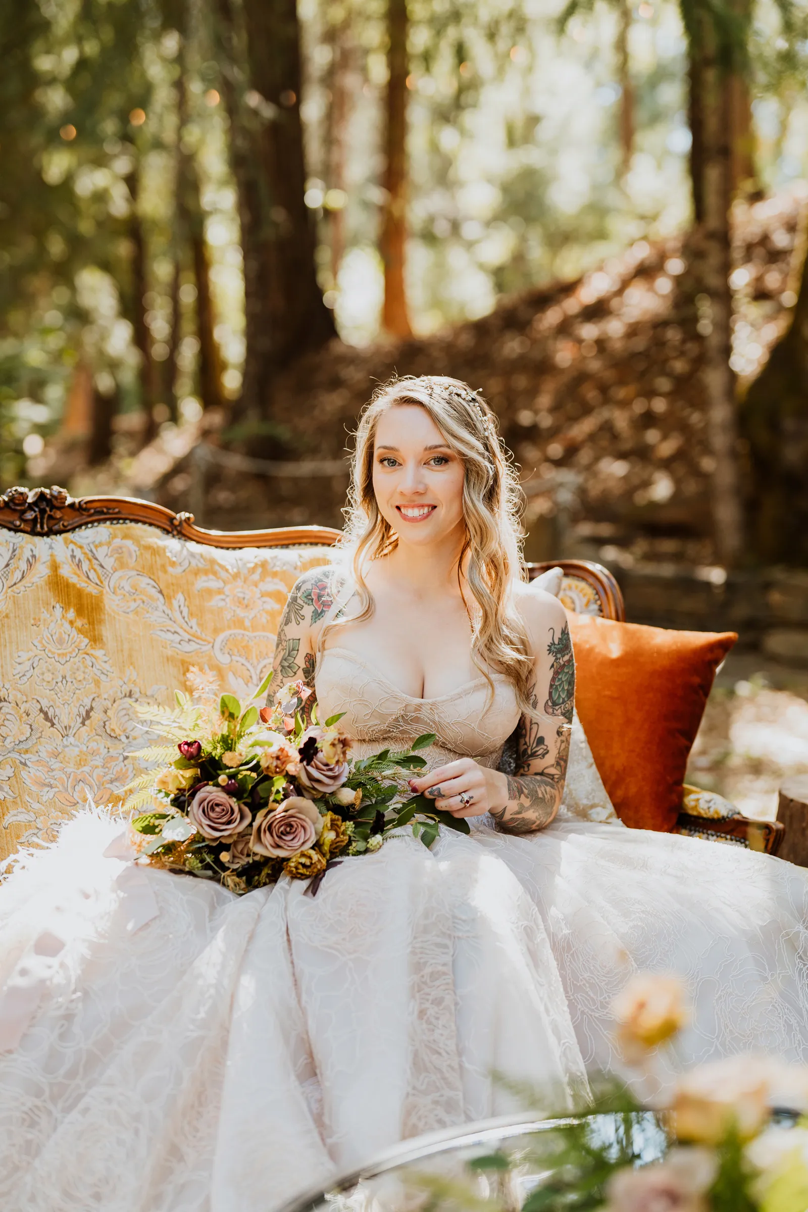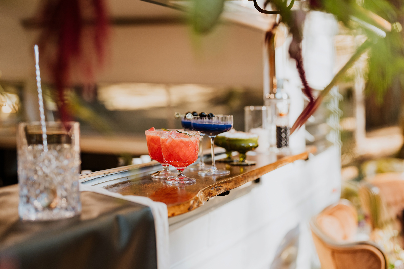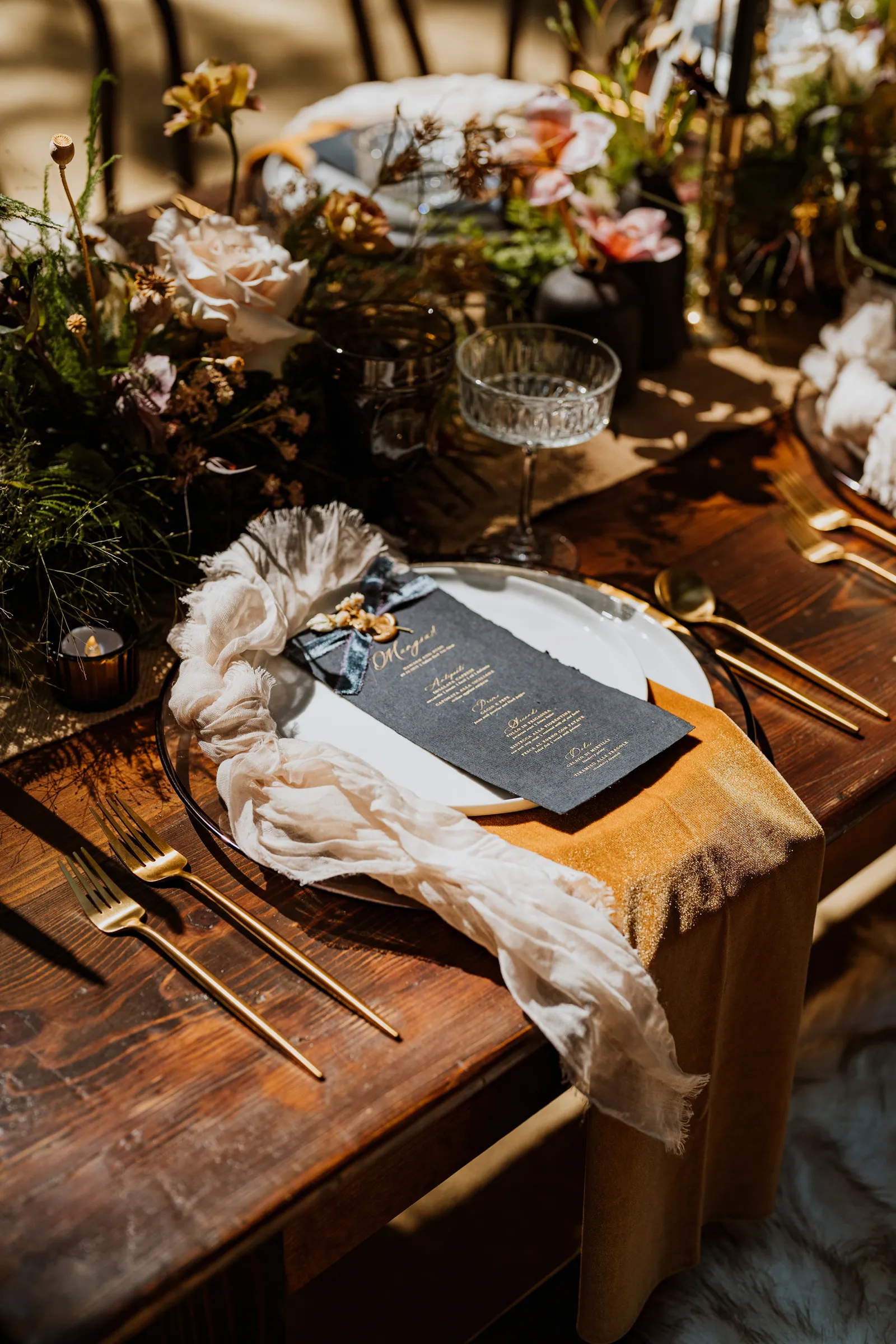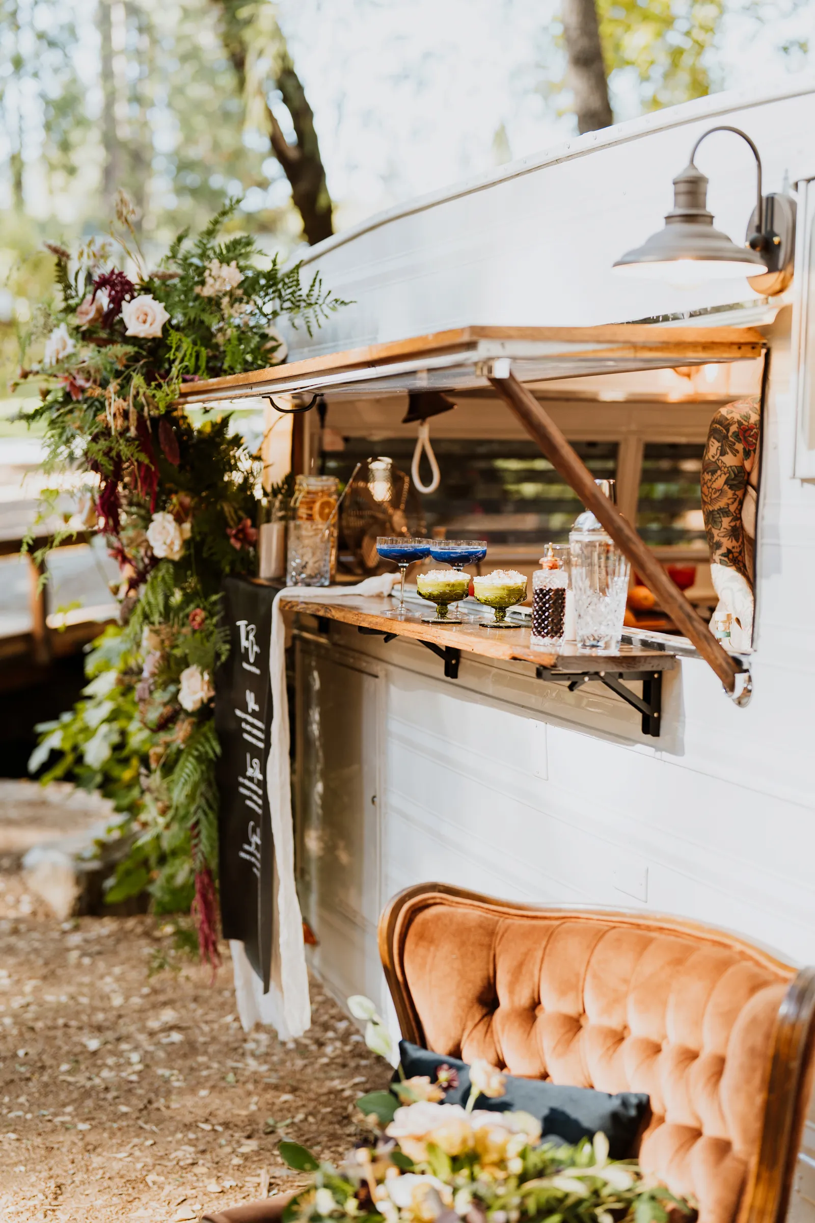 Welcome back to our next installment of Real Weddings Submitted Styled Shoots. Today’s shoot is absolutely brimming with tons of inspiration. With rich purples and black finishes set in the forest (think of a black, multi-tiered cake from Spilled Milk Co., colorful cocktails courtesy of The Parched Poppies, a feathered bolero from Perfect Dress Party and a navy suit from Tuxedo Den) you’re going to get all the romantic, moody vibes from this shoot. Keep scrolling so you can get in on all the amazing details!