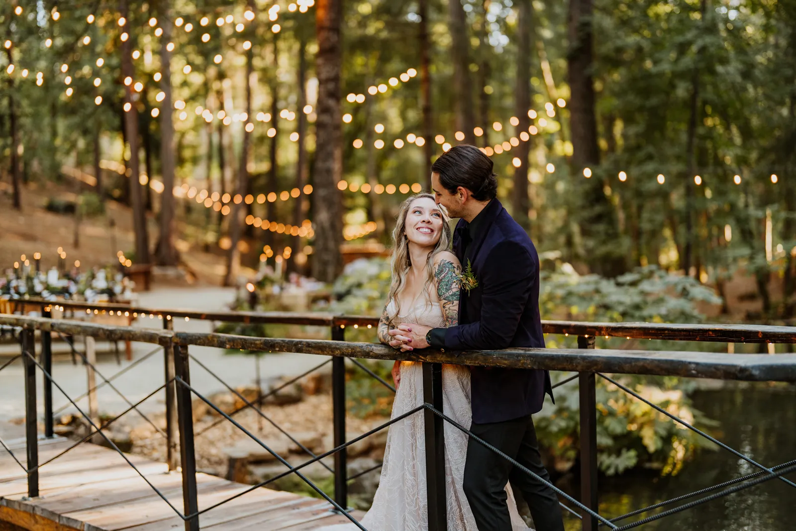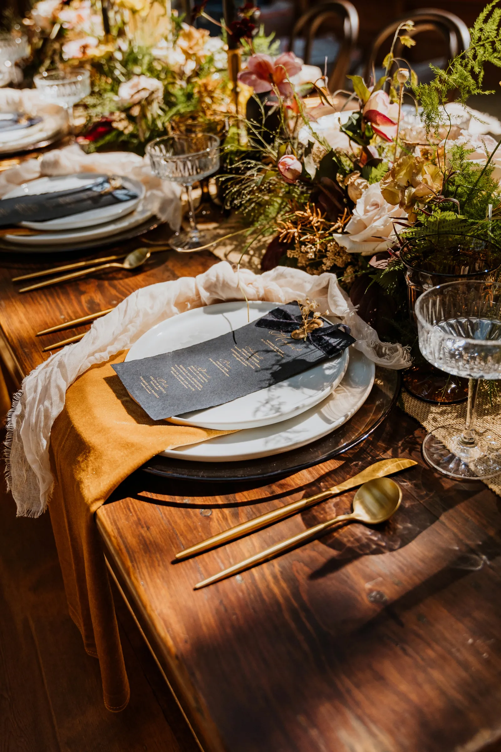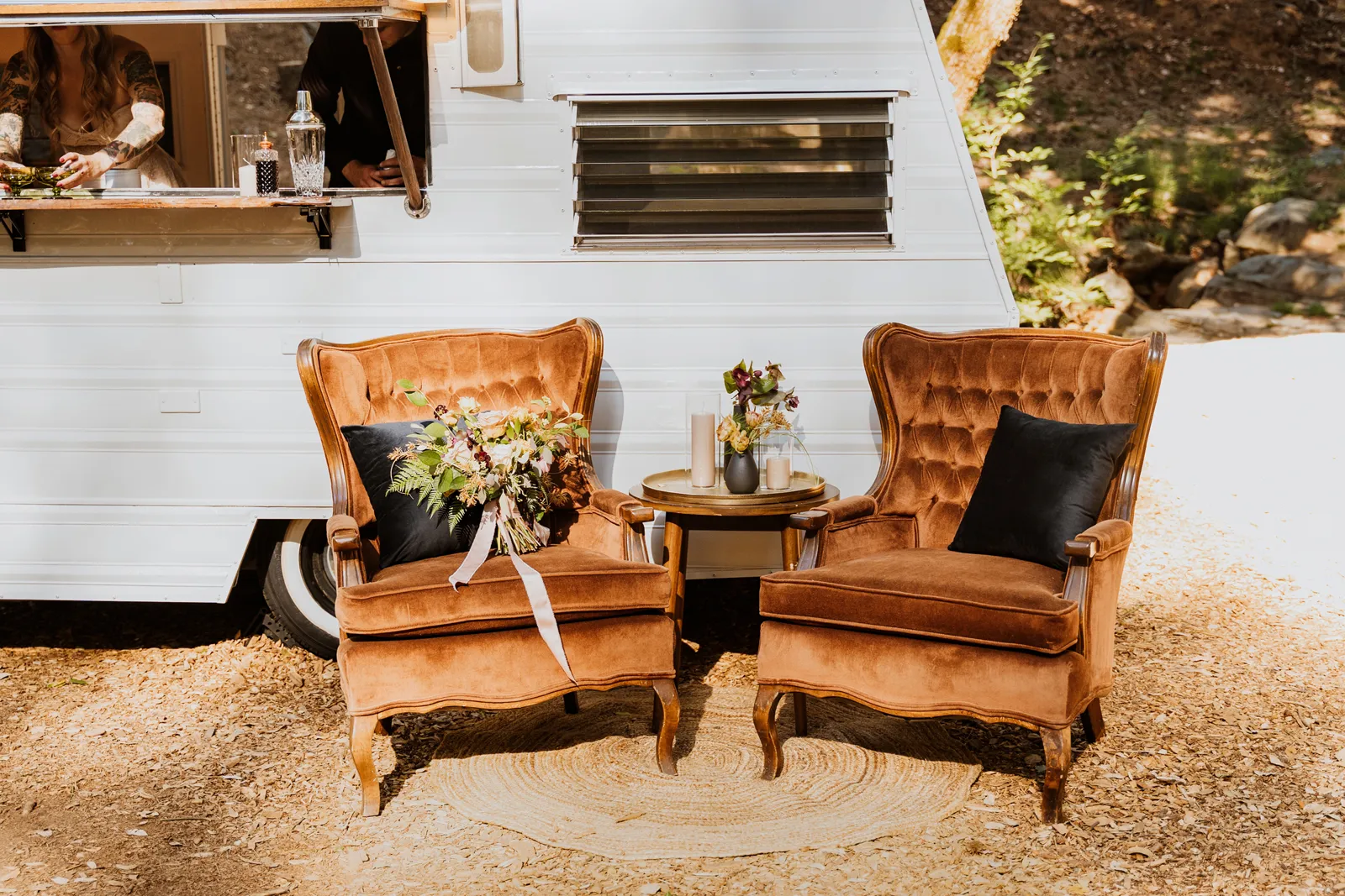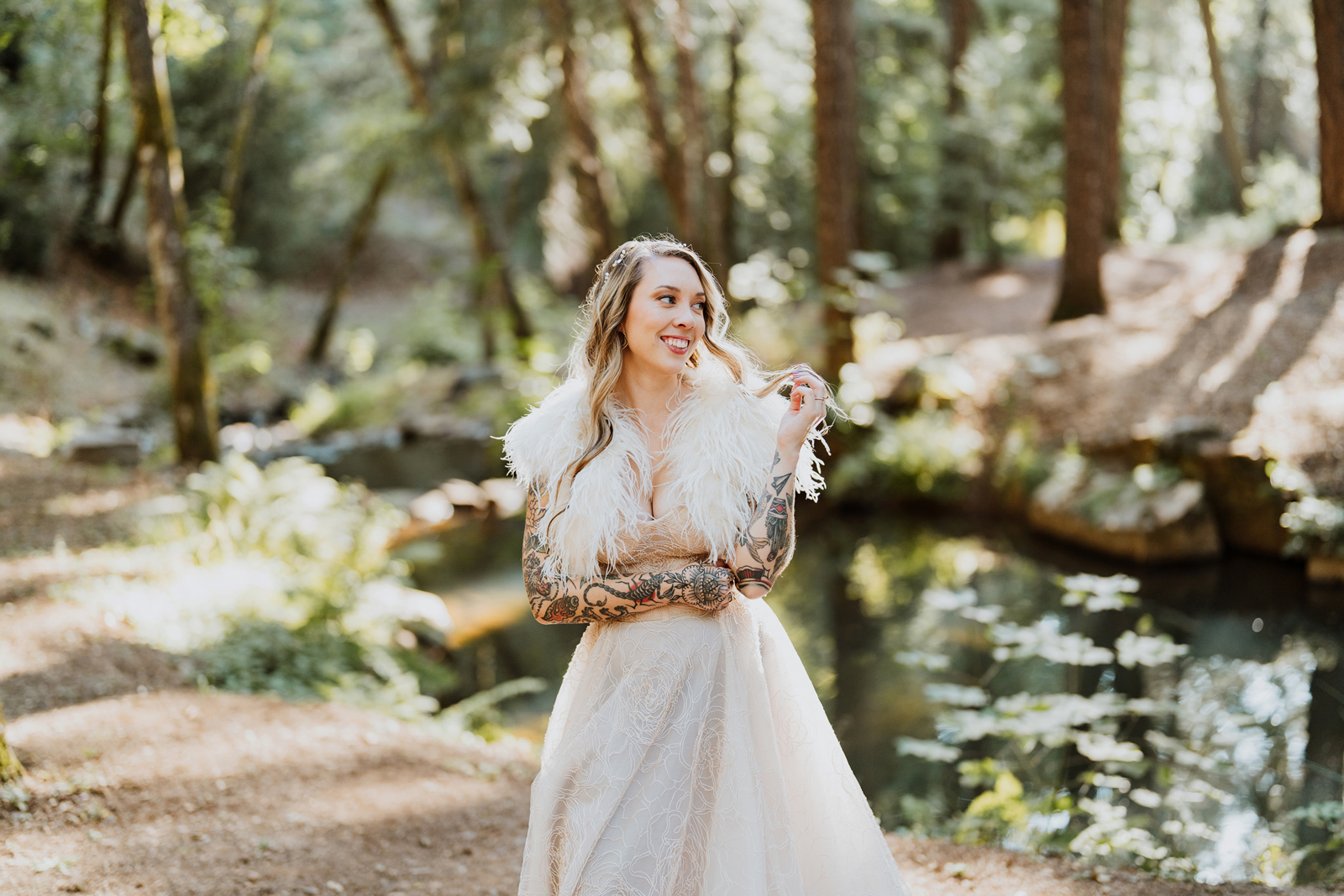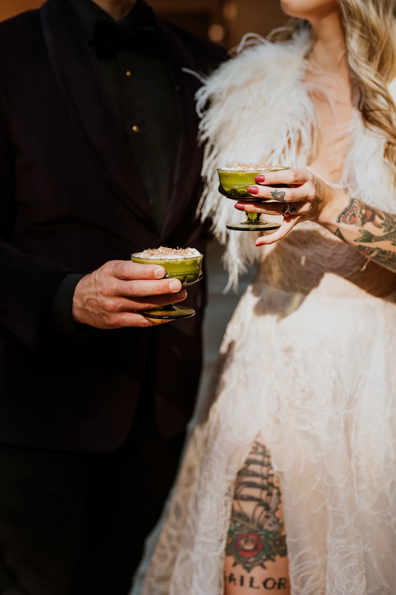 Welcome back to our next installment of Real Weddings Submitted Styled Shoots. Today’s shoot is absolutely brimming with tons of inspiration. With rich purples and black finishes set in the forest (think of a black, multi-tiered cake from Spilled Milk Co., colorful cocktails courtesy of The Parched Poppies, a feathered bolero from Perfect Dress Party and a navy suit from Tuxedo Den) you’re going to get all the romantic, moody vibes from this shoot. Keep scrolling so you can get in on all the amazing details!