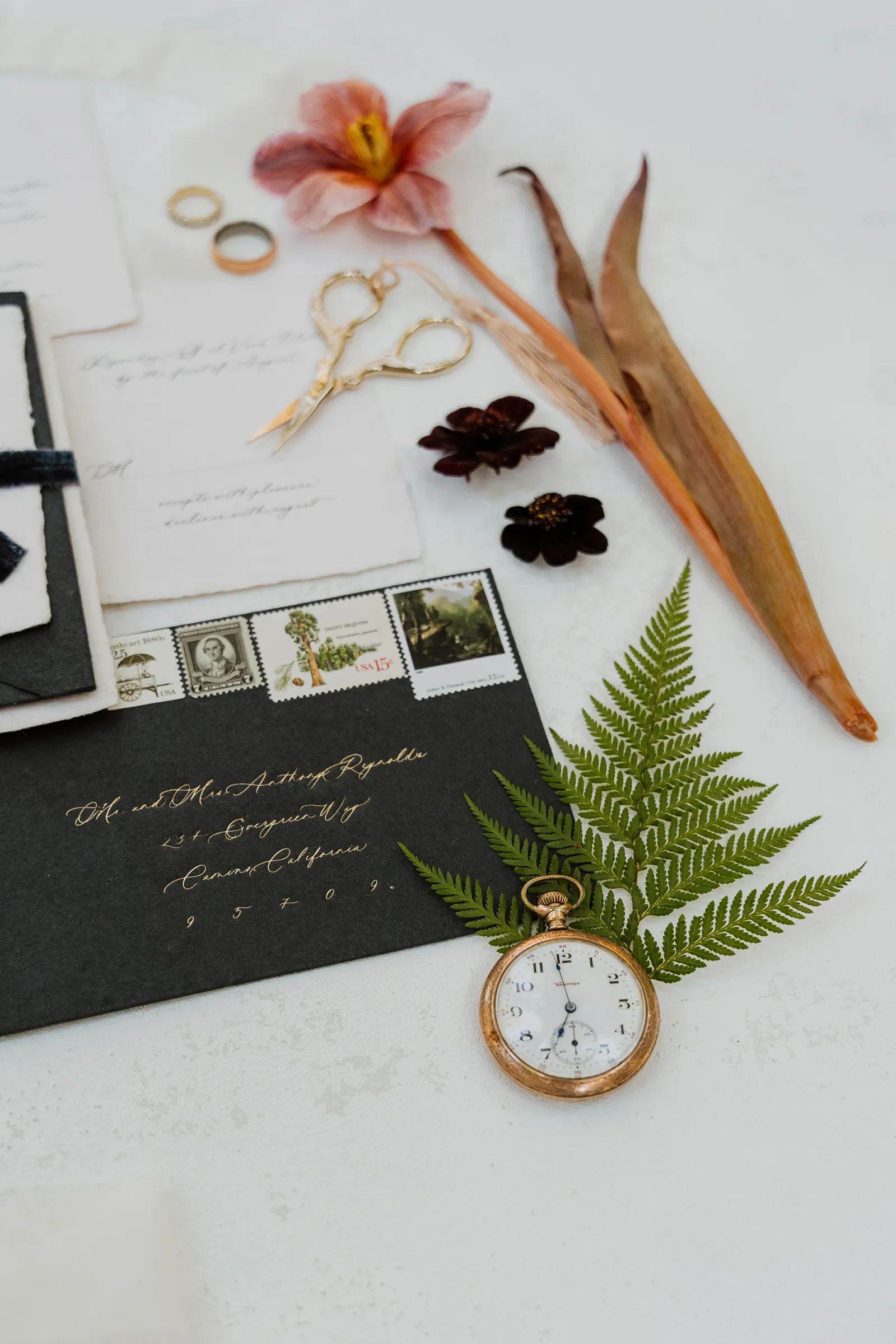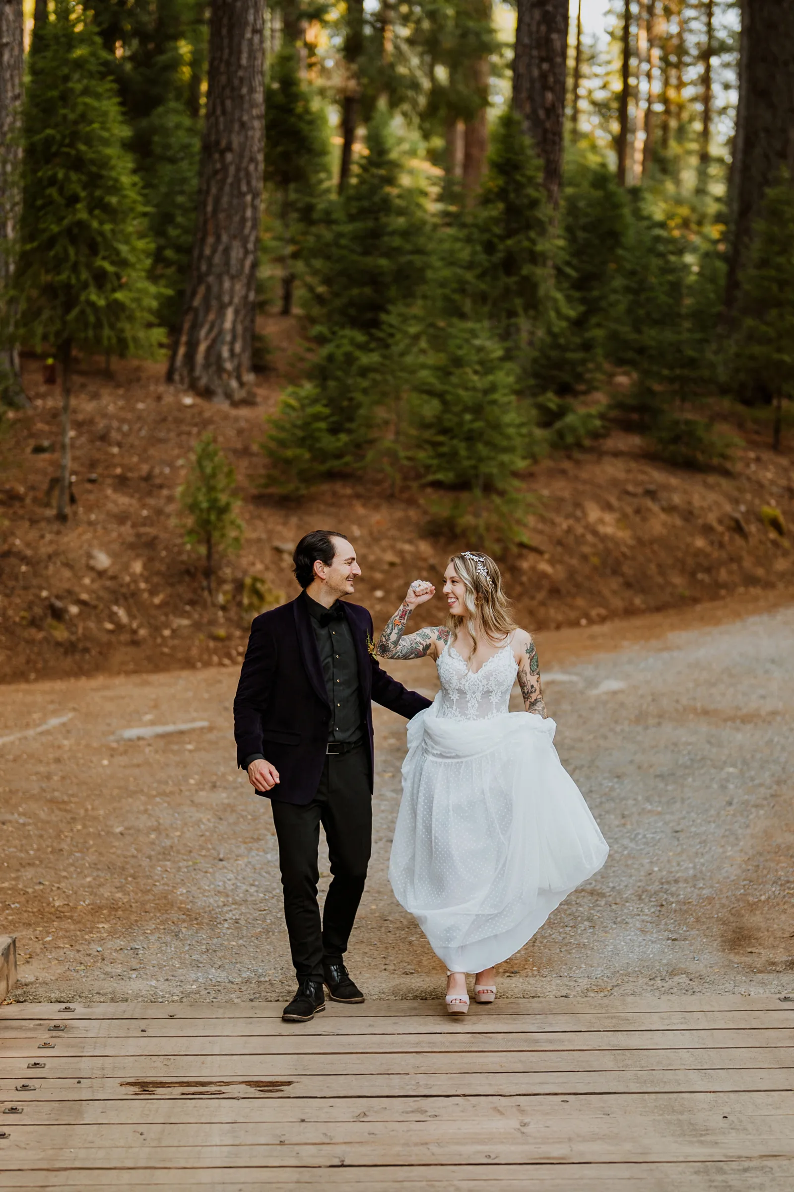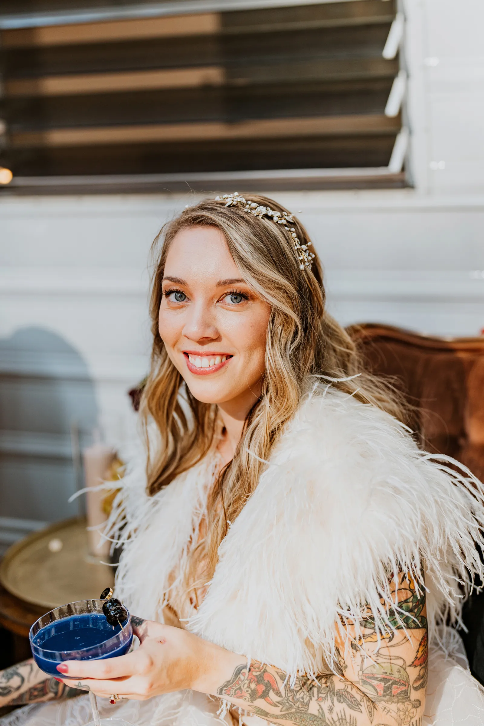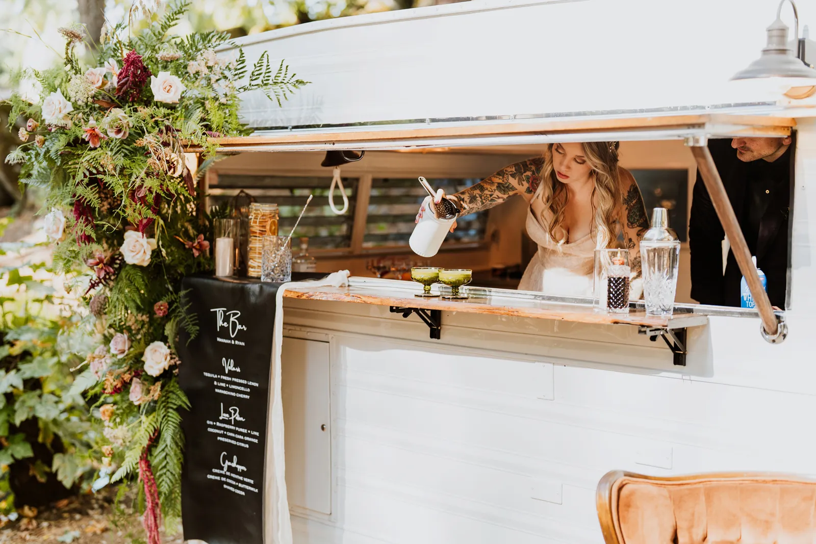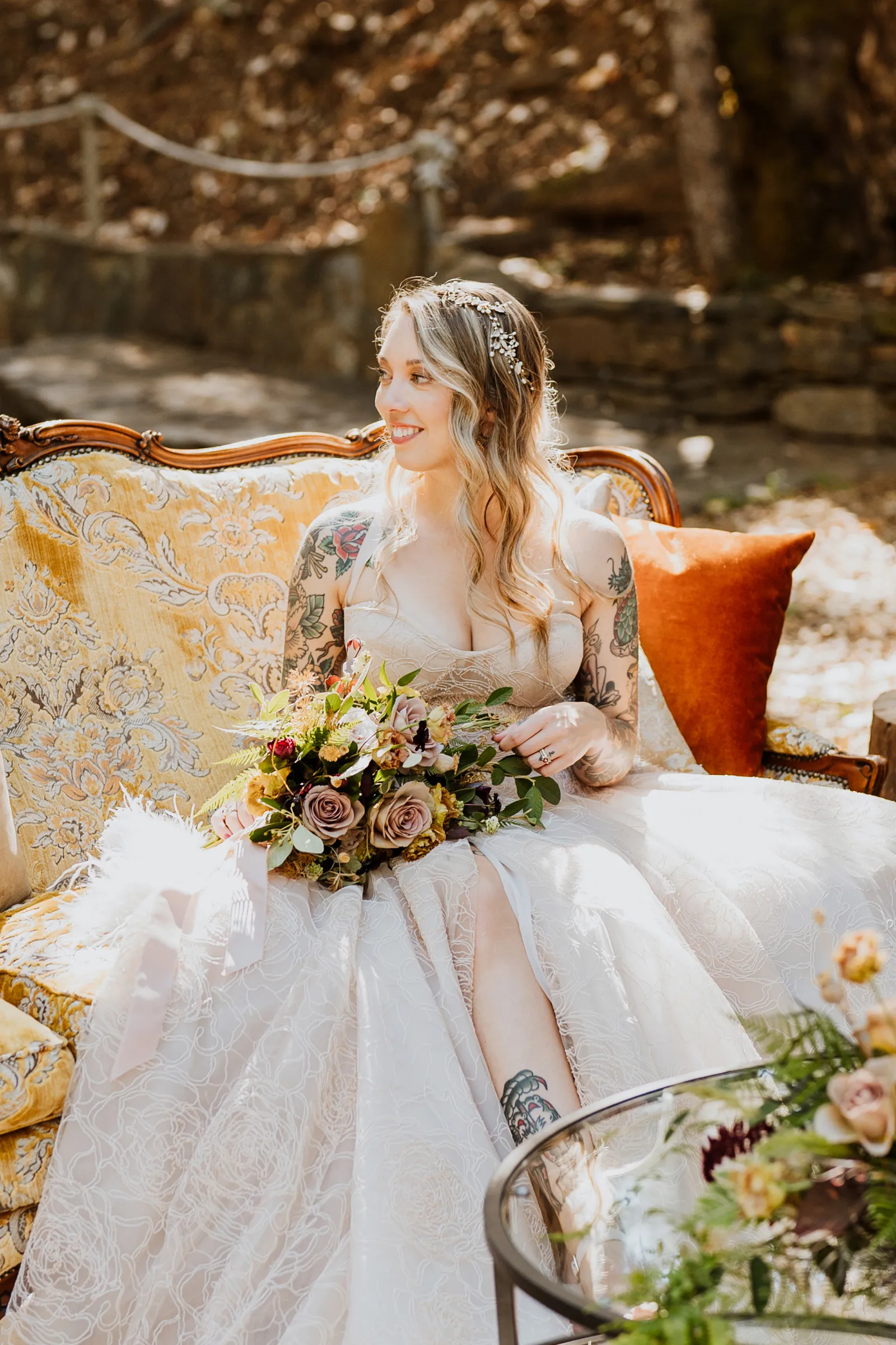 Welcome back to our next installment of Real Weddings Submitted Styled Shoots. Today’s shoot is absolutely brimming with tons of inspiration. With rich purples and black finishes set in the forest (think of a black, multi-tiered cake from Spilled Milk Co., colorful cocktails courtesy of The Parched Poppies, a feathered bolero from Perfect Dress Party and a navy suit from Tuxedo Den) you’re going to get all the romantic, moody vibes from this shoot. Keep scrolling so you can get in on all the amazing details!