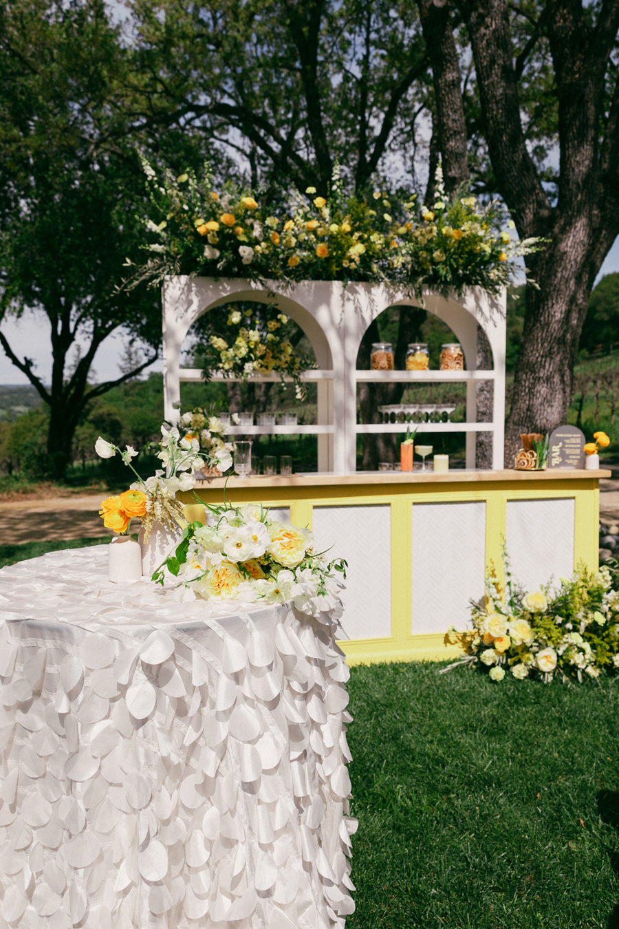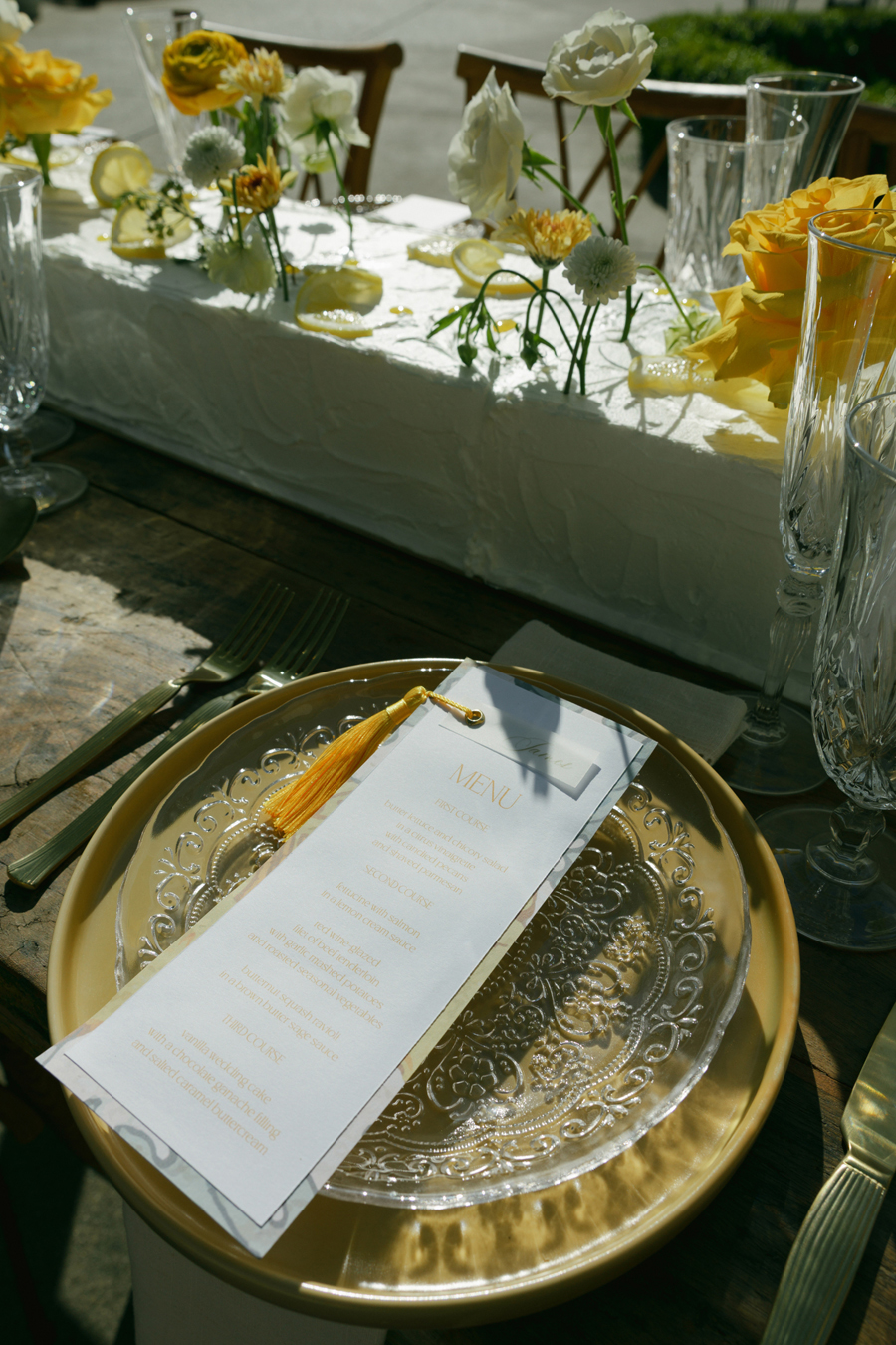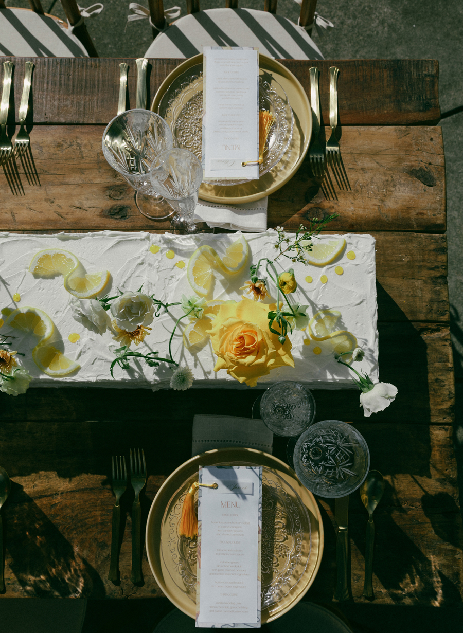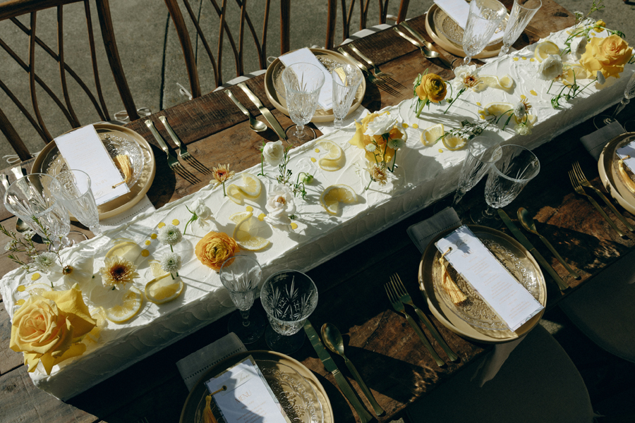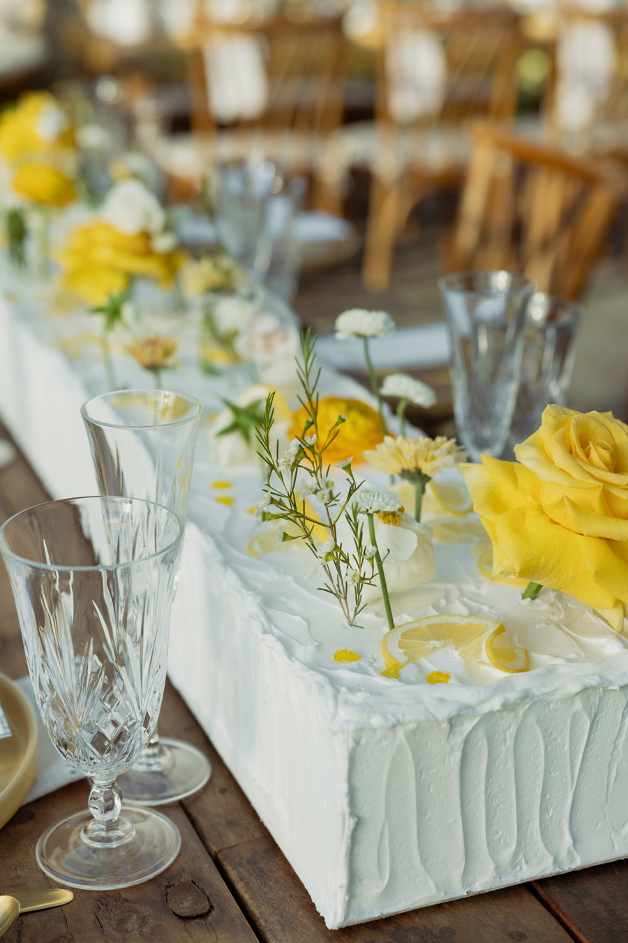 We love details. Lots and lots of details. And the details from our styled shoot, “Oh Happy Day!” made us just that…oh so so so happy—the shoot’s details had it all: rich textiles, lush florals, delicious cocktails (but we posted about that earlier!), gorgeous paperie, beautiful décor, and show-stopping cakes (did you see the five-foot long table cake? Yeah, it’s super cool!), all sprinkled with cheery yellow and lemon accents. Our vendor dream team knocked it out of the park! We’re stoked to share all the pretty details with you here! Enjoy!