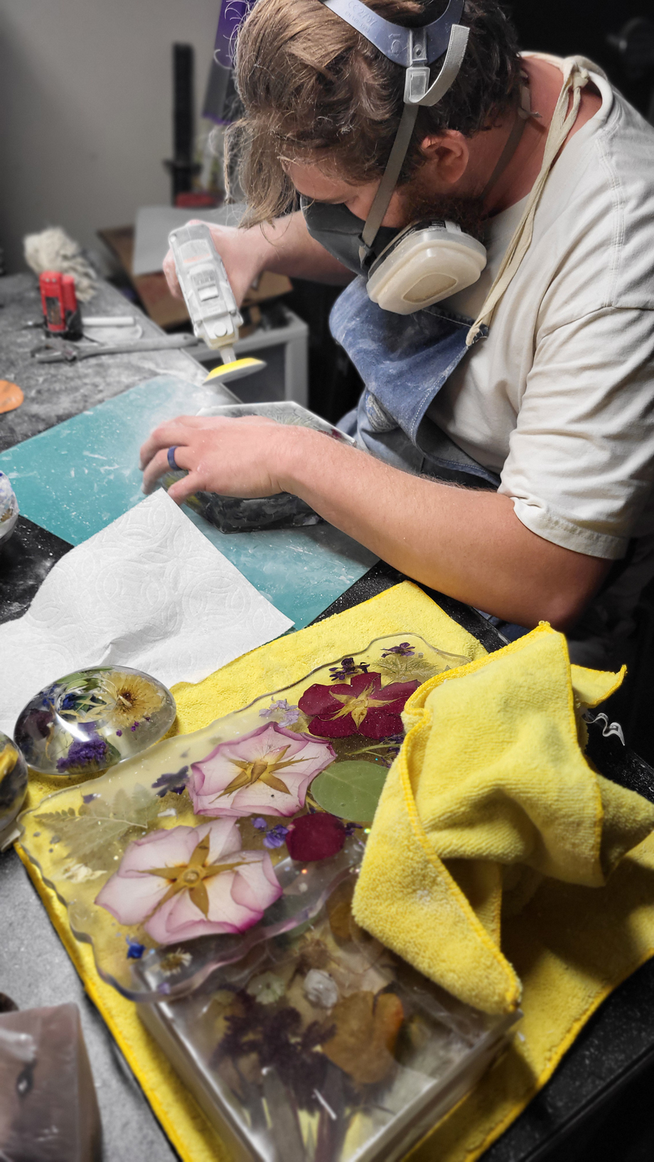 Resin is poured into silicone molds by layers. The two-part resin mixture needs to be poured and stirred exactly to manufacture suggestions. It is quite a finicky product. Room temperature and humidity play a role in the final product. Winter designs take more time as our studio is in the Sierra Nevada climate—rain and snow in the winter months mean we can’t always pour. Microbubbling, discoloration, flash curing, and the resin not hardening are all possibilities if it decides it doesn’t want to play nice that day.
