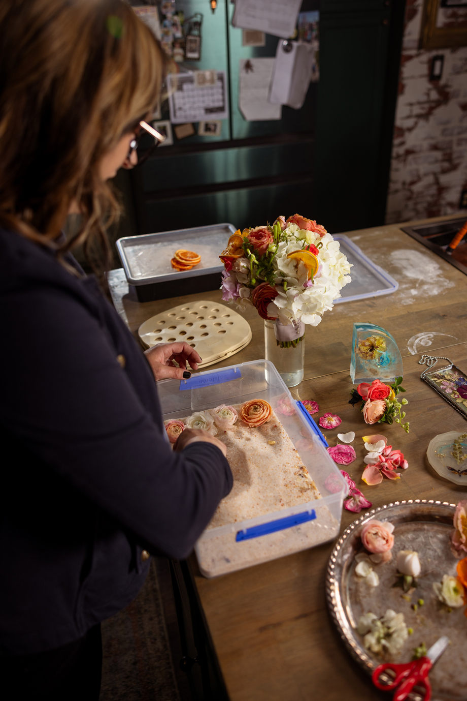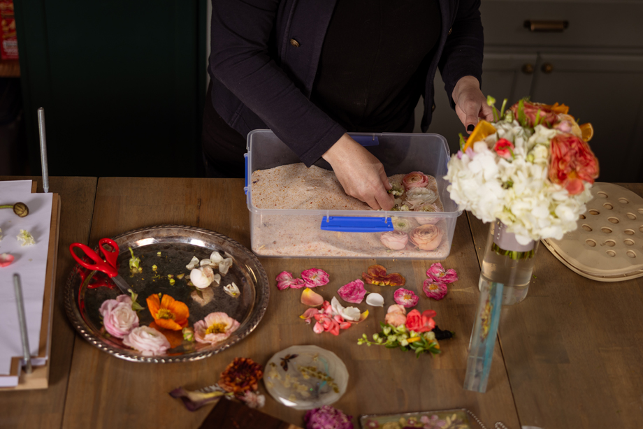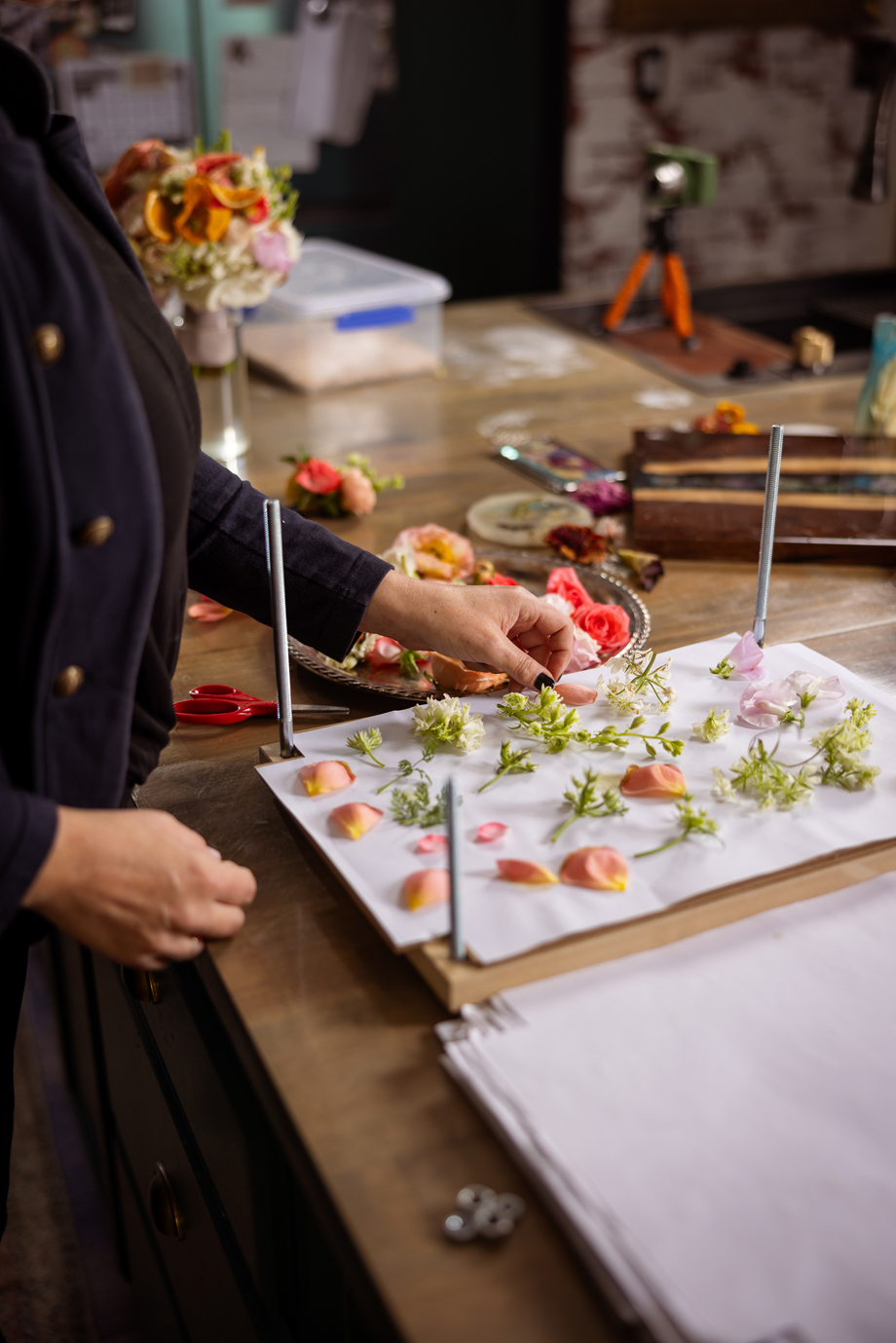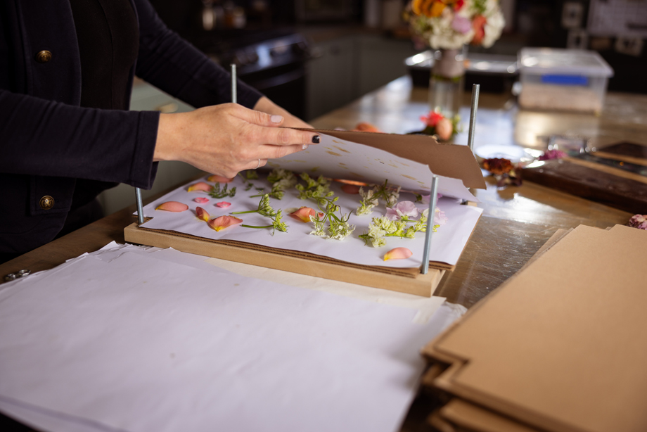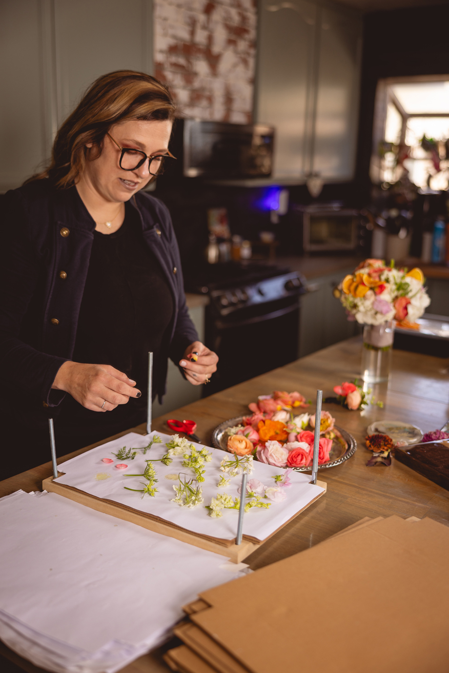 I evaluate the quality of flowers we have and keep in mind what project we are making. If we are making something in resin for the final product, I will use a mix of 3-dimensional blossoms and pressed. If we are creating a pressed frame and everything needs to be flattened, I will start with the thinnest blossoms first. They will need the least amount of attention over the span of drying.