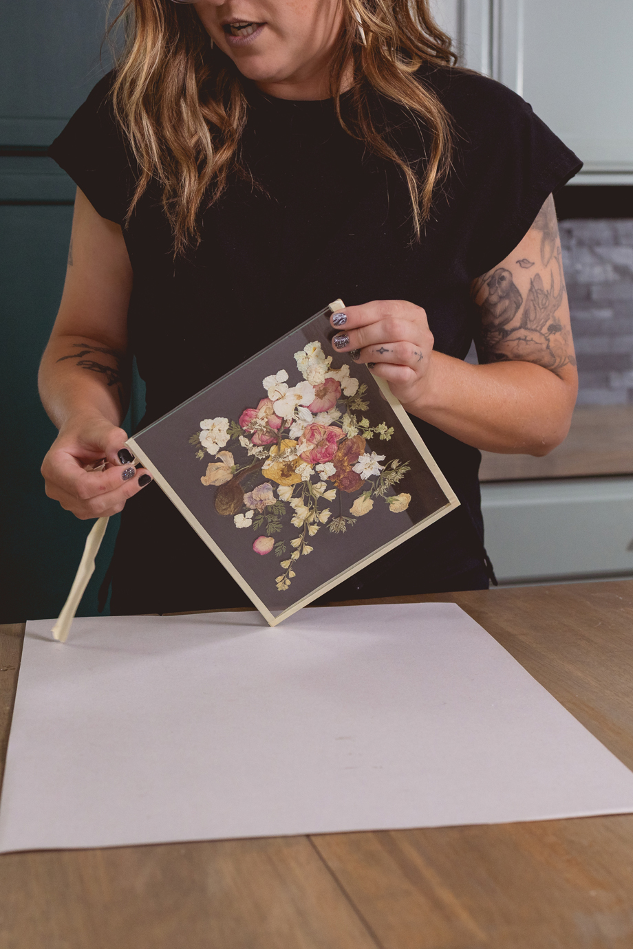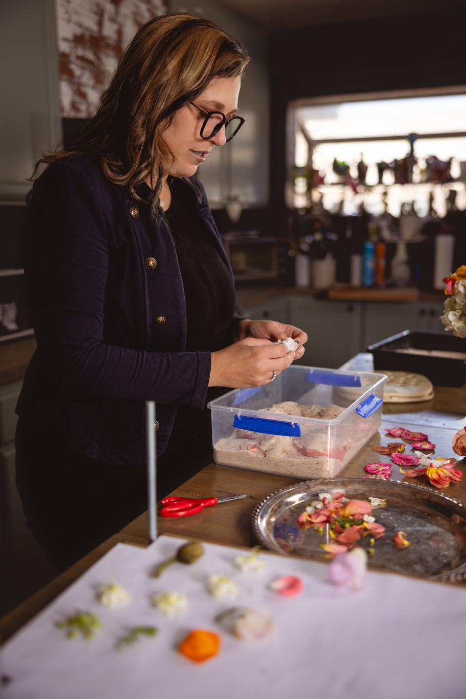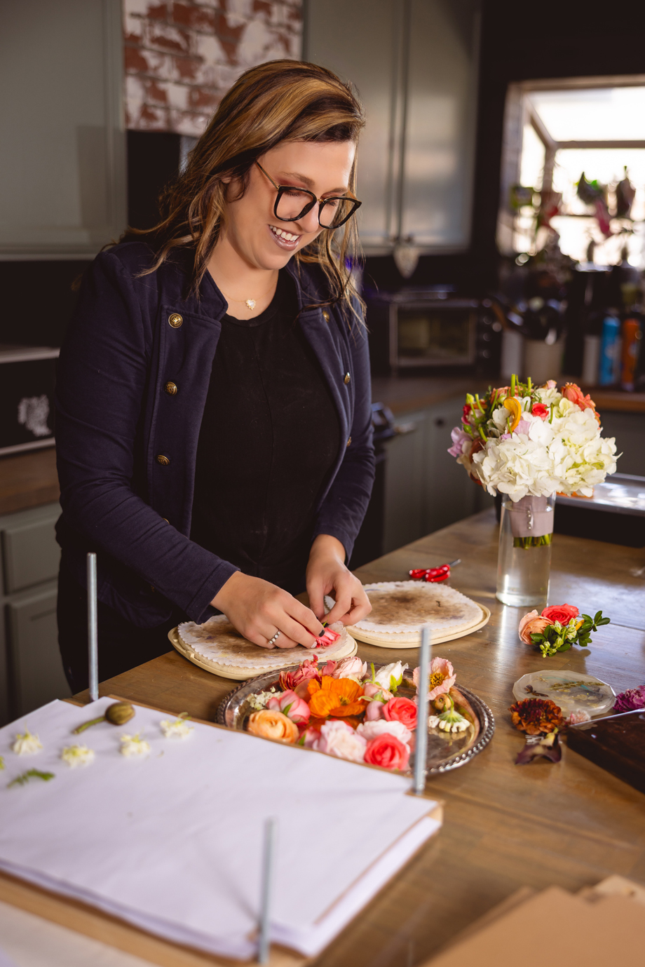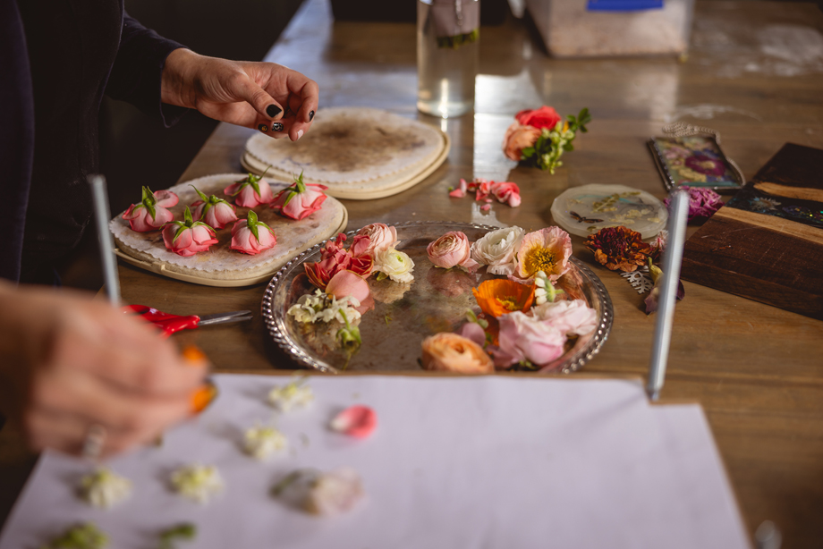 I evaluate the quality of flowers we have and keep in mind what project we are making. If we are making something in resin for the final product, I will use a mix of 3-dimensional blossoms and pressed. If we are creating a pressed frame and everything needs to be flattened, I will start with the thinnest blossoms first. They will need the least amount of attention over the span of drying.
