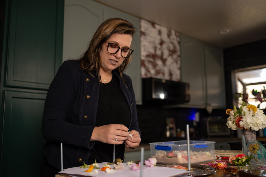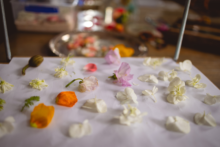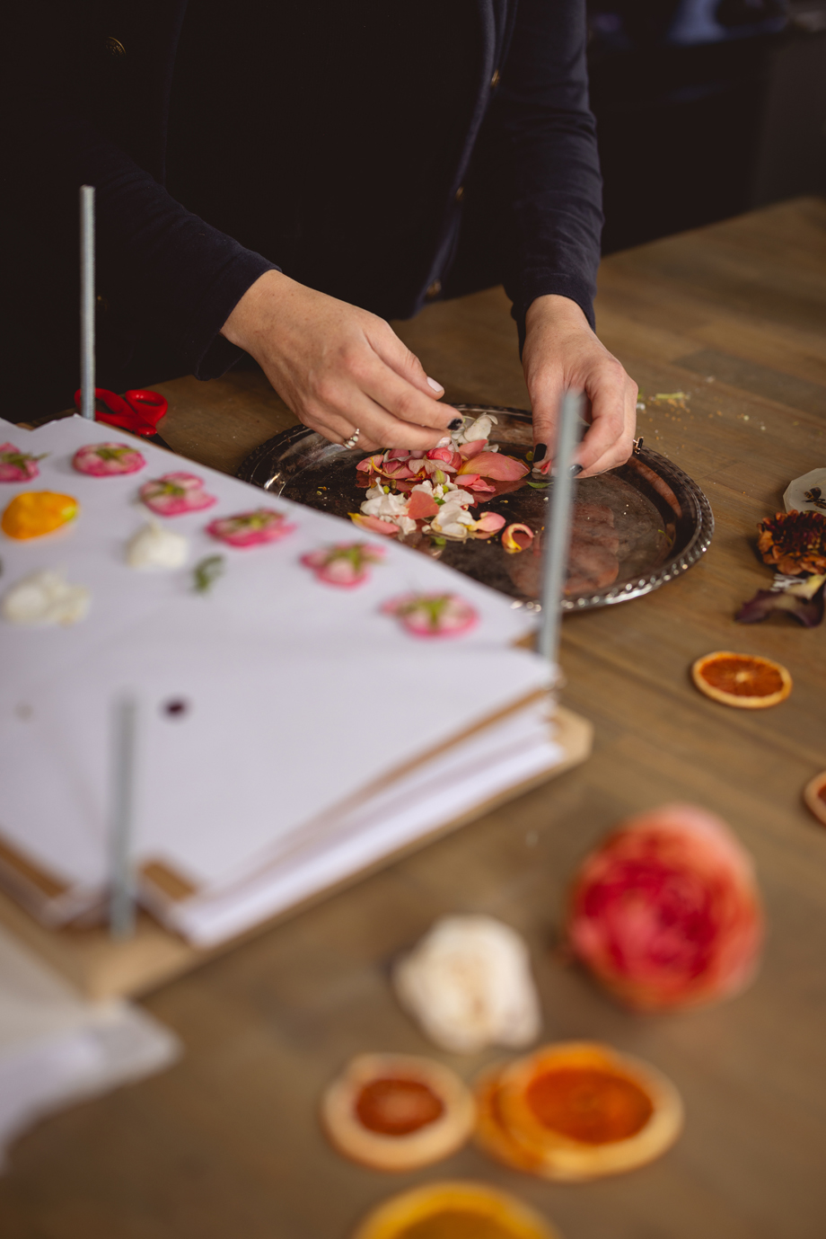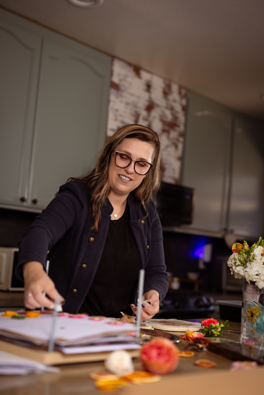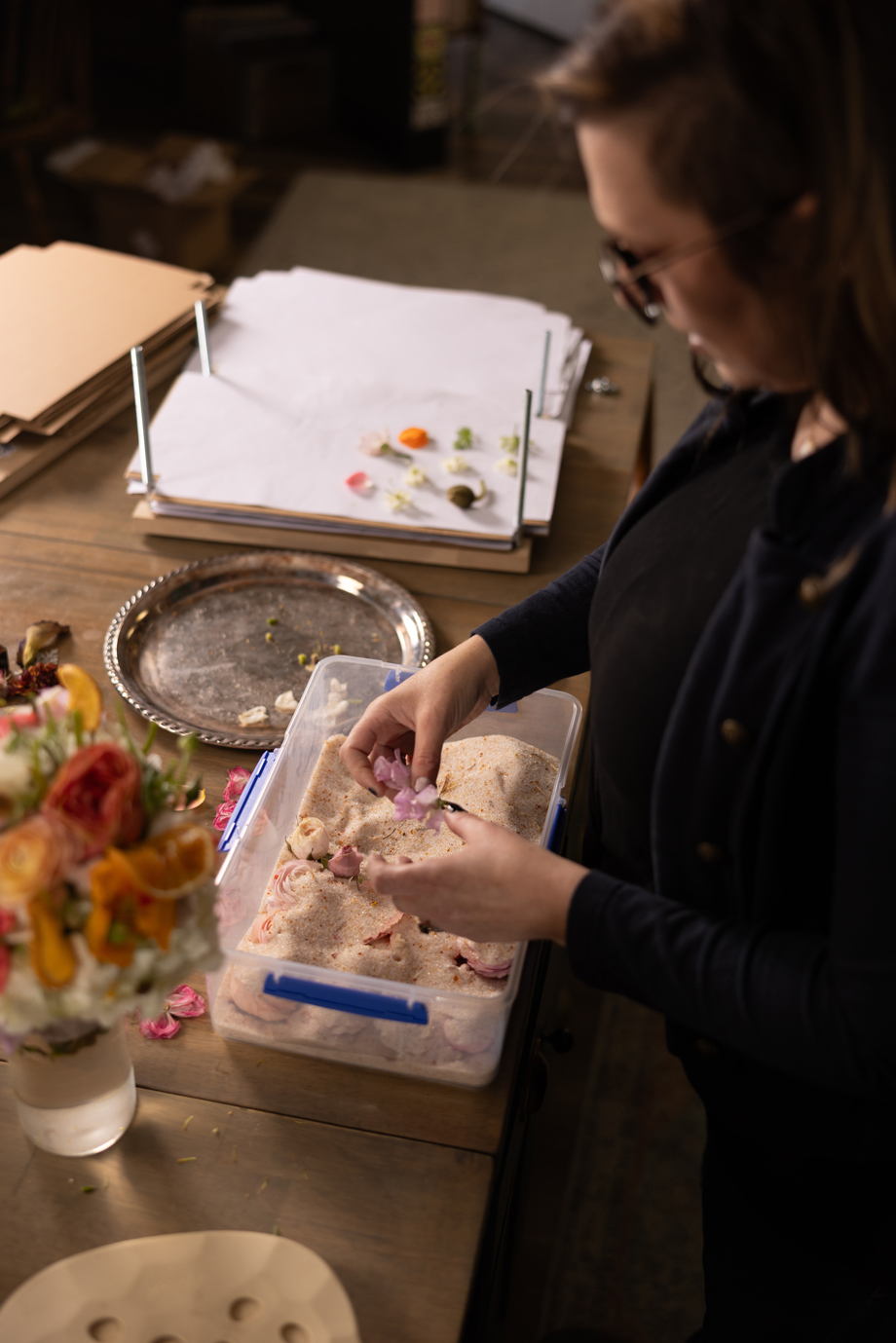 I evaluate the quality of flowers we have and keep in mind what project we are making. If we are making something in resin for the final product, I will use a mix of 3-dimensional blossoms and pressed. If we are creating a pressed frame and everything needs to be flattened, I will start with the thinnest blossoms first. They will need the least amount of attention over the span of drying.