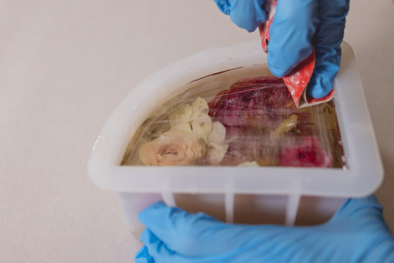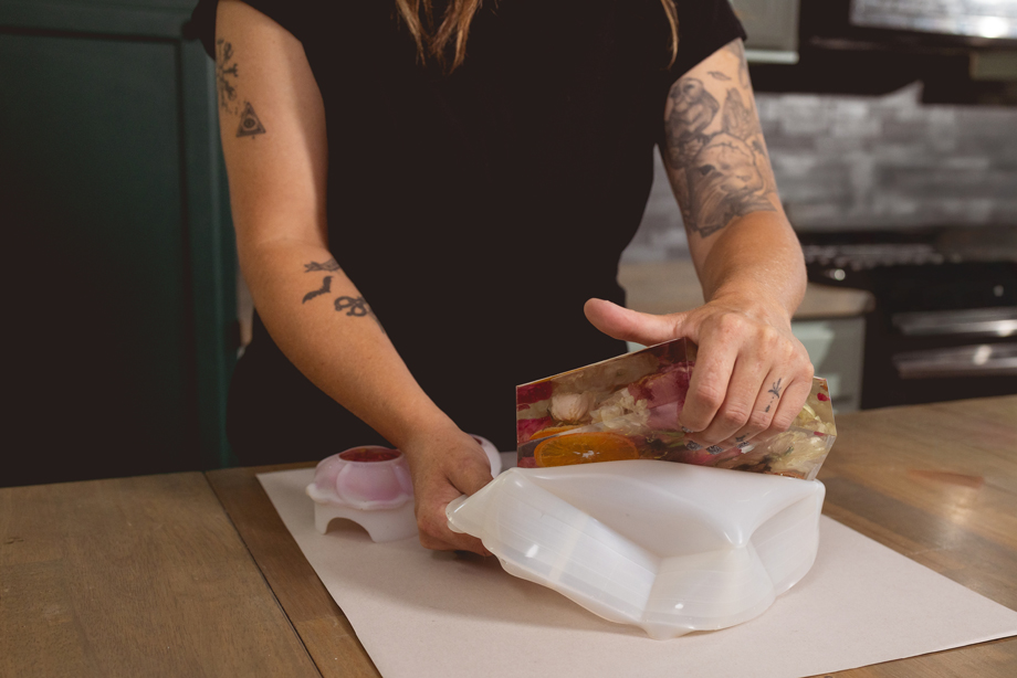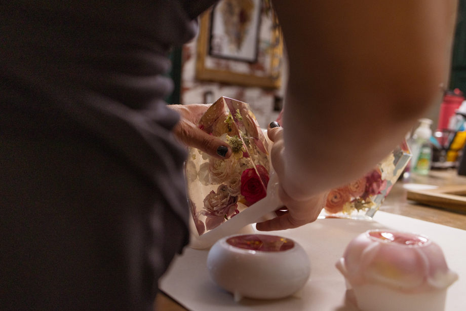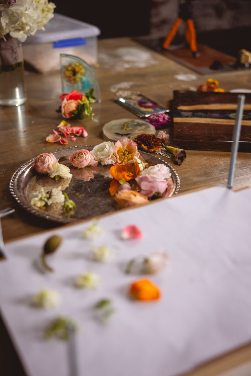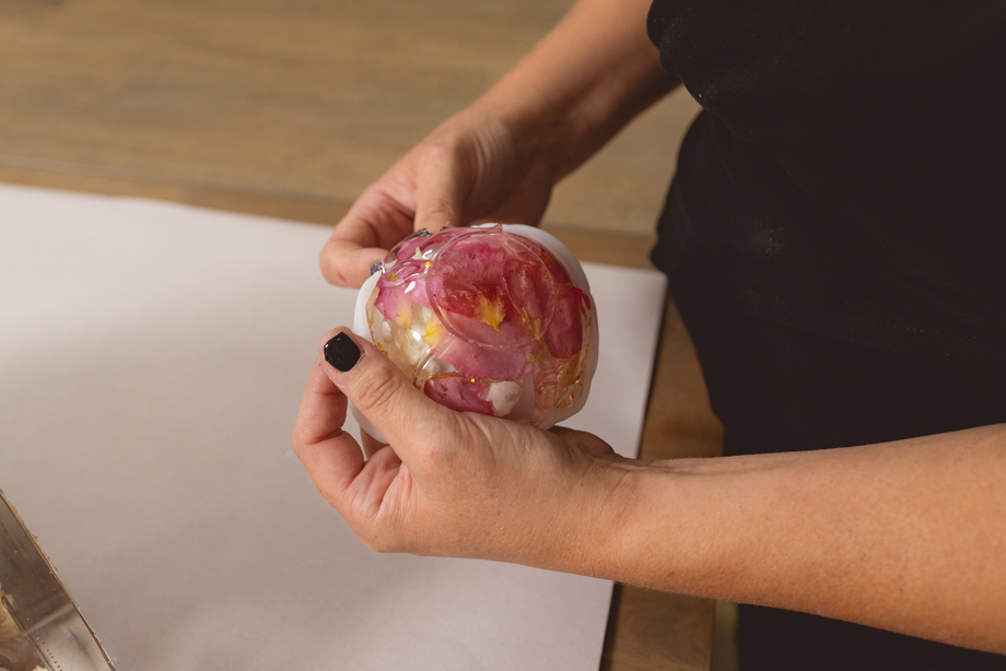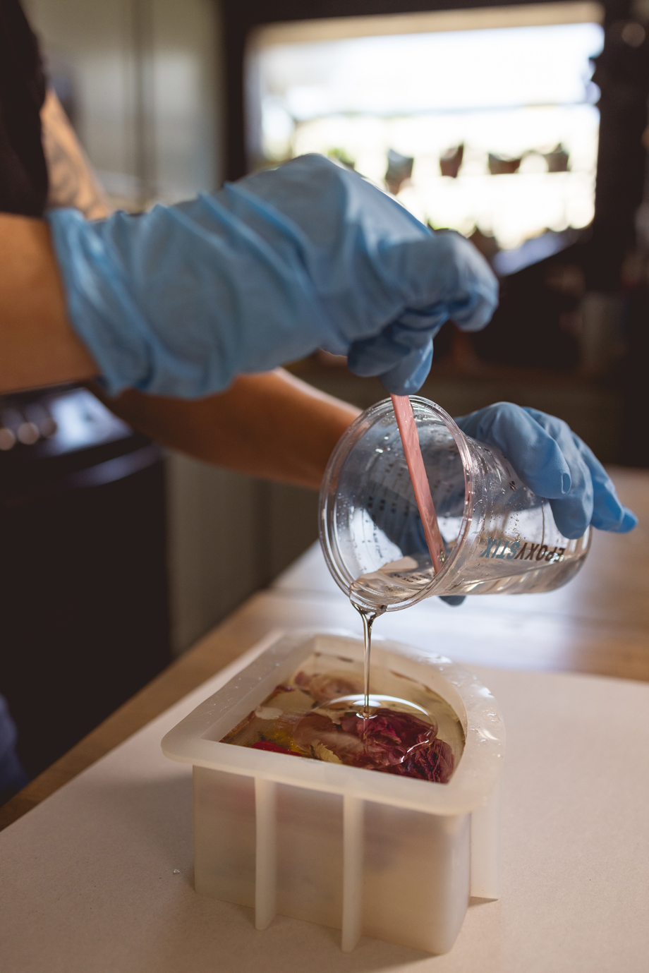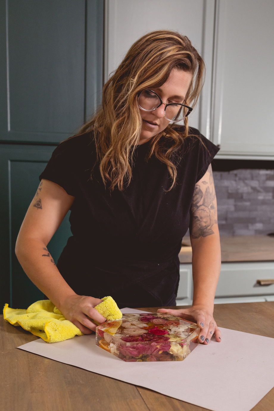 When the flowers are successfully covered in resin and there are no pieces of floral poking through the top, I let the resin dry for a week. This allows the complete structure to harden as one unit and provides a surface that I can sand. If I sand too soon from pouring the bulk, it becomes gummy and not a desired texture creating a more of a mess than help.