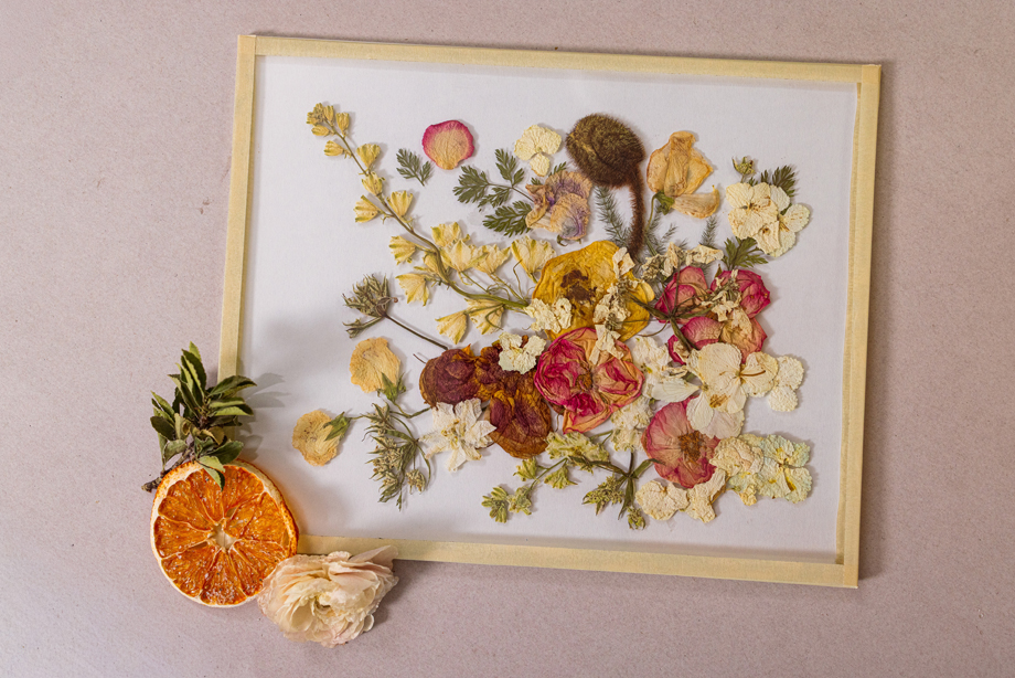 The thicker flowers (peonies, dahlias, roses, ranunculus, chrysanthemums) are placed in a microwave press to remove moisture.