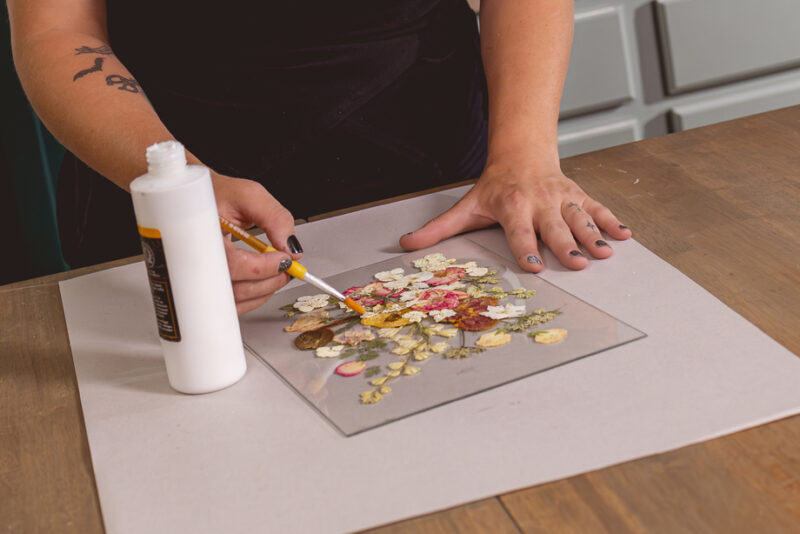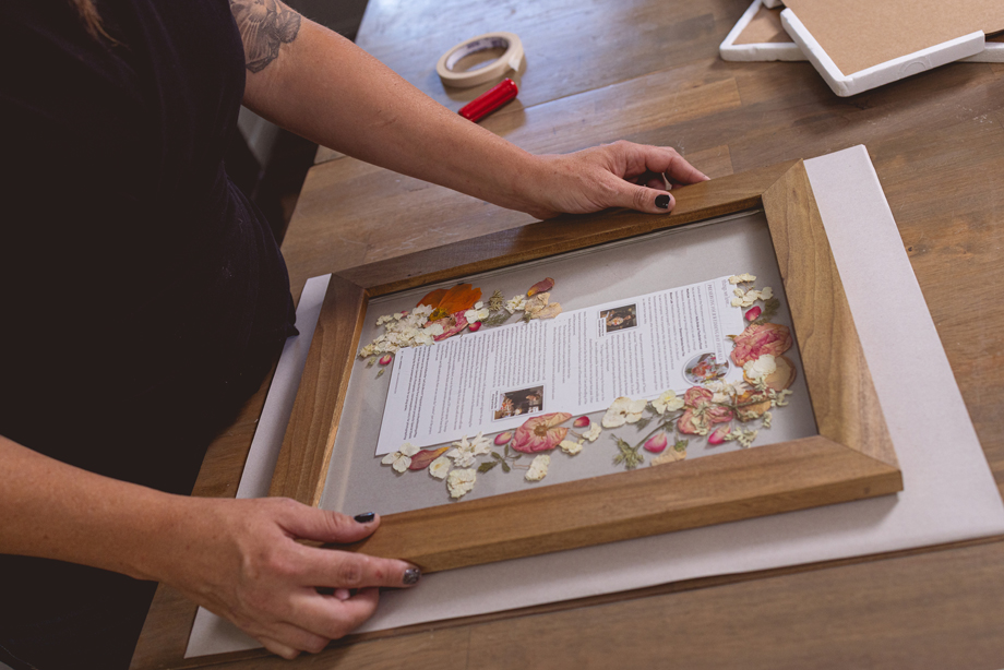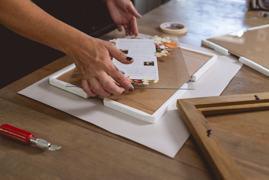 Once everything is successfully dried we seal the flowers with a UV matte spray. This keeps the flowers from creating bubbles in the resin and also provides protection from the heat during the curing process. It allows pressed frames protection from sun exposure.