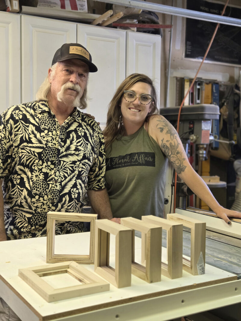 In the wood shop, my dad and I create our poplar frames. I love the hardness of poplar that allows us to create better frames than the clear pine we started out with. The wood has brown, black, and lime green tones in addition to the soft buttery wood tone that stains just amazingly. Each piece is beautiful and unique in it’s own way, which is part of The Bride’s Floral Mortician’s frame of mind.