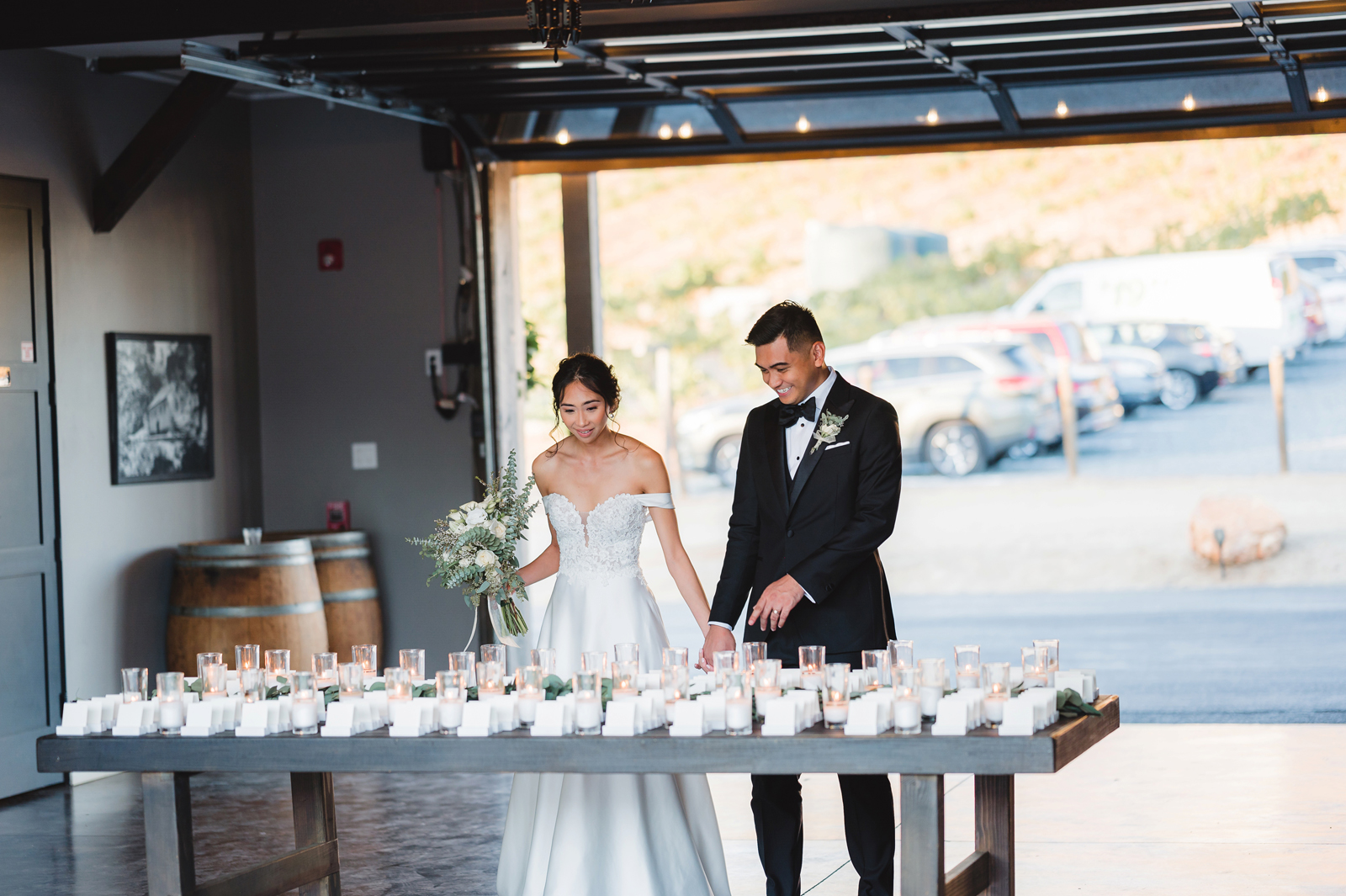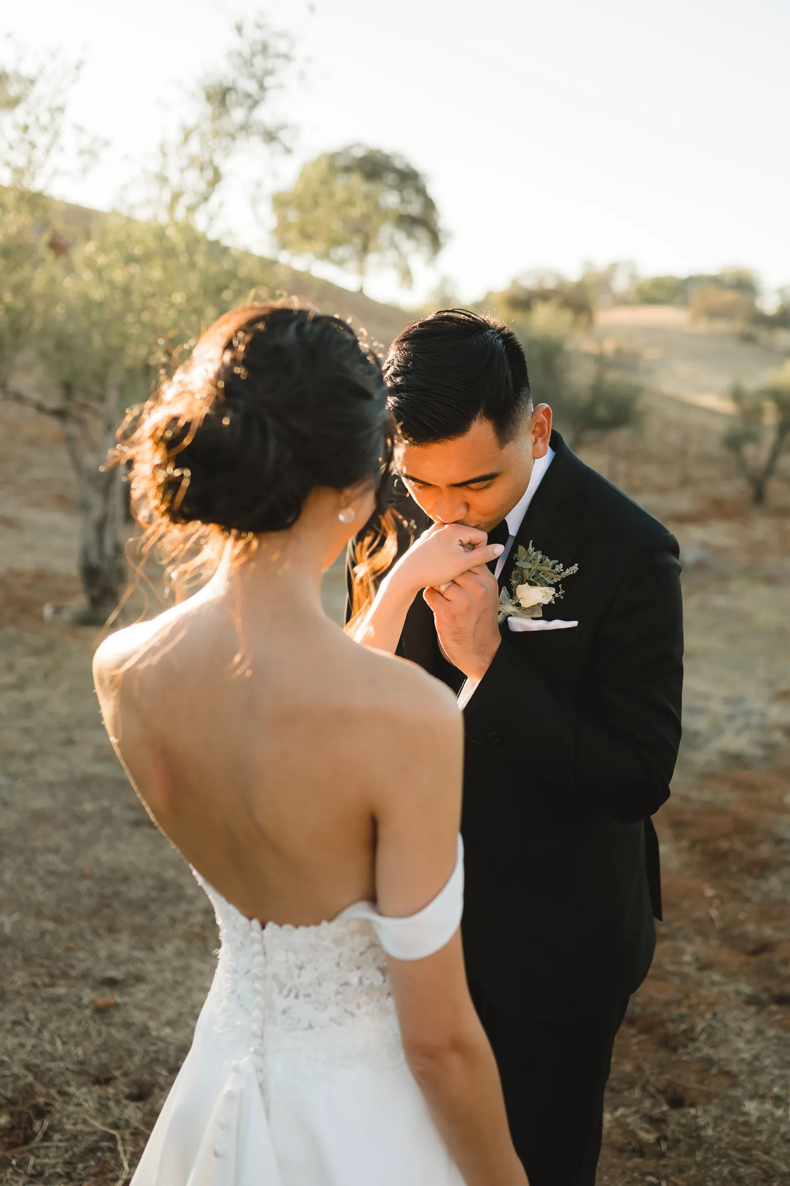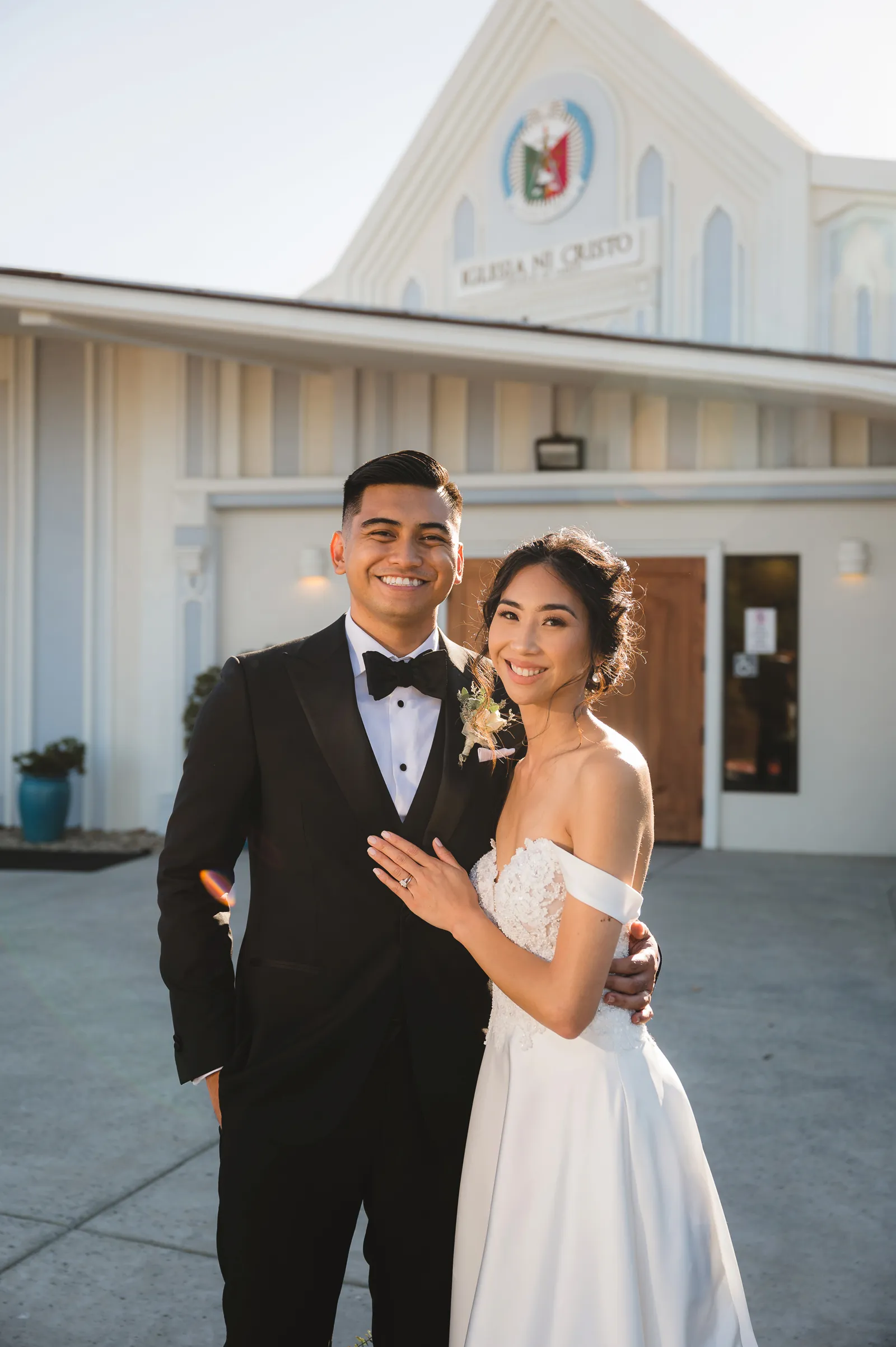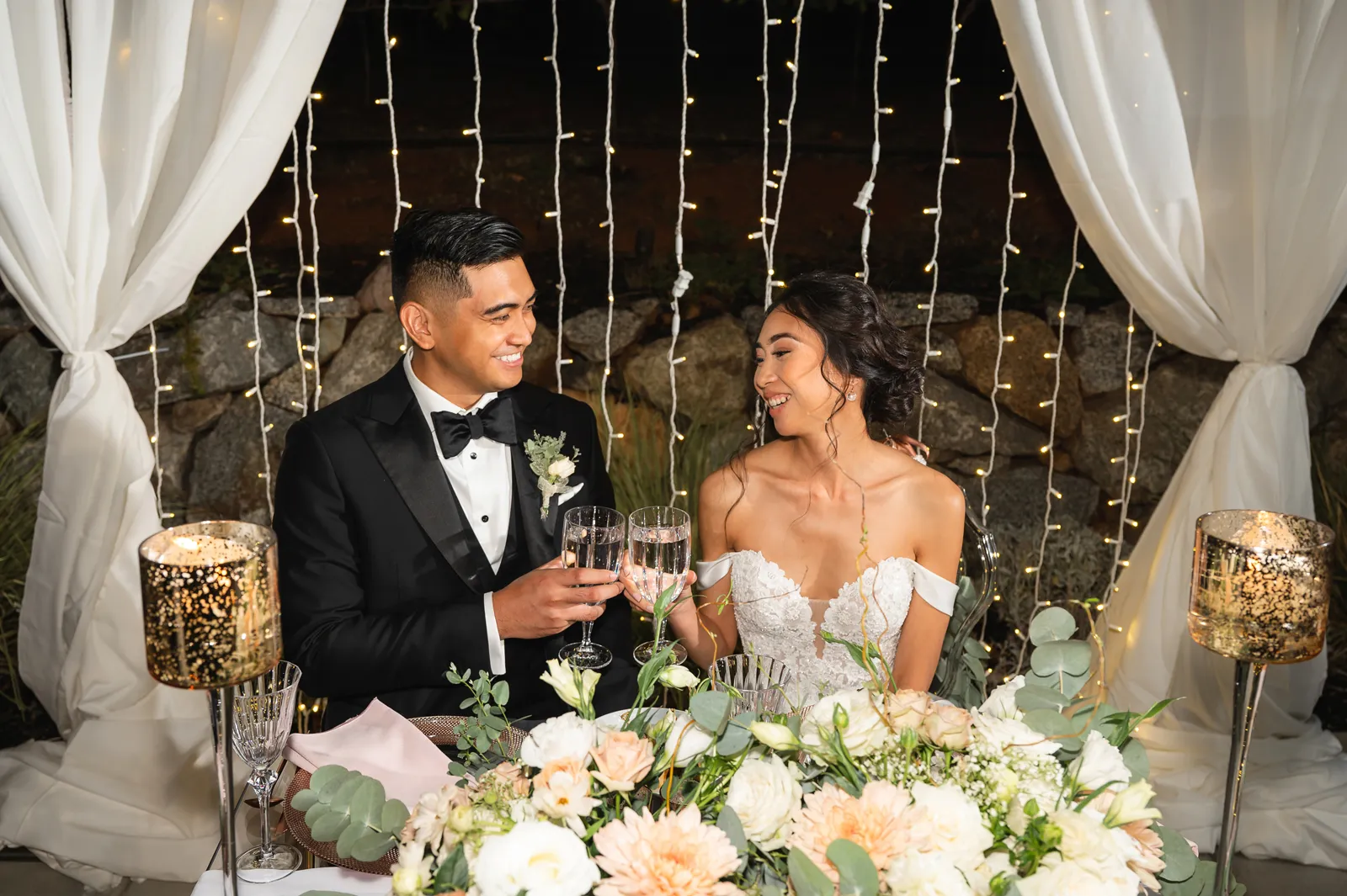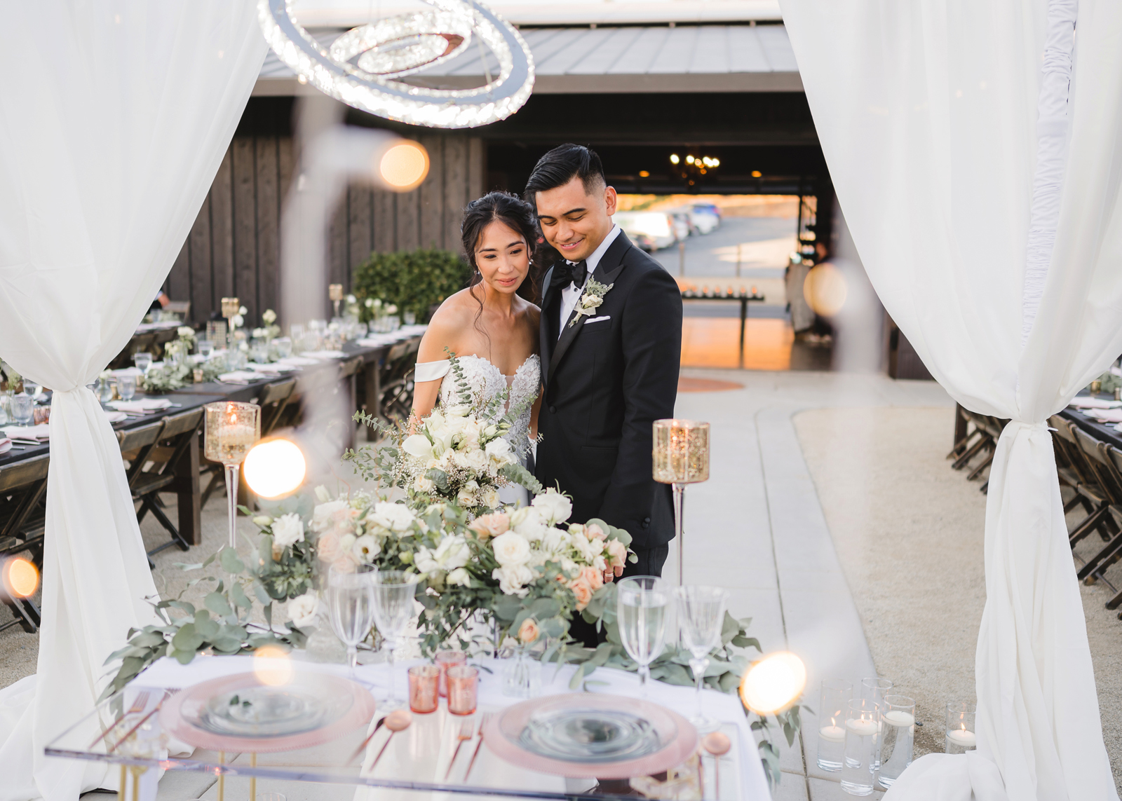 We were both at a community event, and Madeline was the stage host. She took a quick 5-minute bite for dinner. She was literally stuffing her face when a man came out from the crowd and said, “Hi” with a huge smile. She looked up, said “Hi!” and left to jump back up on stage. That stranger was Leandro. It’s not his usual character to walk up to pretty girls and say hi, but something gave him the urge to do it anyway. A month later, a mutual friend asked Madeline to reach out to “some guy” on social media so she could include him in future events. That “some guy” was Leandro. We messaged every once in a while, saw each other here and there, and a few months later hung out at get-togethers with mutual friends. We ended up bonding over hikes, star gazing, painting, and dock crabbing. Next thing we knew, we “fell in friends”. Just seven days before Madeline was moving to another state, we ended up having a talk and realized we’ve developed feelings for each other. But we both decided to give each other time to figure out what we wanted to do, and we can talk about it at the end of the week. Leandro had a rule to not do long distance relationships. But he didn’t need the whole week to decide that he wanted to be involved with Madeline. The next day, he told her that he wanted to give it a try. We dated for less than a week, then Madeline moved. Even though we were in different states, we stayed exclusive, and Leandro eventually moved too – near Madeline. After a few months in the relationship, Leandro told her that he was the stranger who walked out from the crowd to say hello. She can’t believe she doesn’t remember when she first met the love of her life! [For the proposal], it was a Friday night, and Madeline’s family was getting together for a family photo shoot for her mom’s birthday. When she arrived, she started working on a project that she had to redo and submit that night. Madeline’s sister went to get her from the other room for the family photos. Madeline follow her out to a silent house (that’s because she was being led to the backyard where their dad’s hand-built gazebo was covered with curtain lights, wisteria, and flowers). It wasn’t a family photo shoot at all, but a surprise proposal. Leandro planned an amazing and beautiful proposal with the help of Madeline’s family. Her sisters came up with a cover story that it was for their mom’s birthday photos, and her brother-in-law had one camera angle while another was set up for a different angle. Her whole family was in on it. Madeline, shocked and frozen in place, saw Leandro in a suit, all handsome, and cold after secretly waiting outside on a cold November night for over an hour! But he warmed up when he saw her appear from the two French doors. Leandro’s big and happy smile made Madeline’s heart skip. He waved her over and she stepped out. She had on a black cocktail dress, undone hair (“It was supposed to be mom’s moment, not mine!”) and tan rubber flip-flops on! That’s what happens when you get surprised! [For the wedding planning], we shared ideas and really wanted to make it a day for both of us. Neither of us had specific ideas coming into our engagement, but we discussed all of the details and agreed on everything. We both stayed involved from beginning to end, and at the end of the day, we had a great time celebrating our wedding day with the closest of family and friends in our specific L&M style.