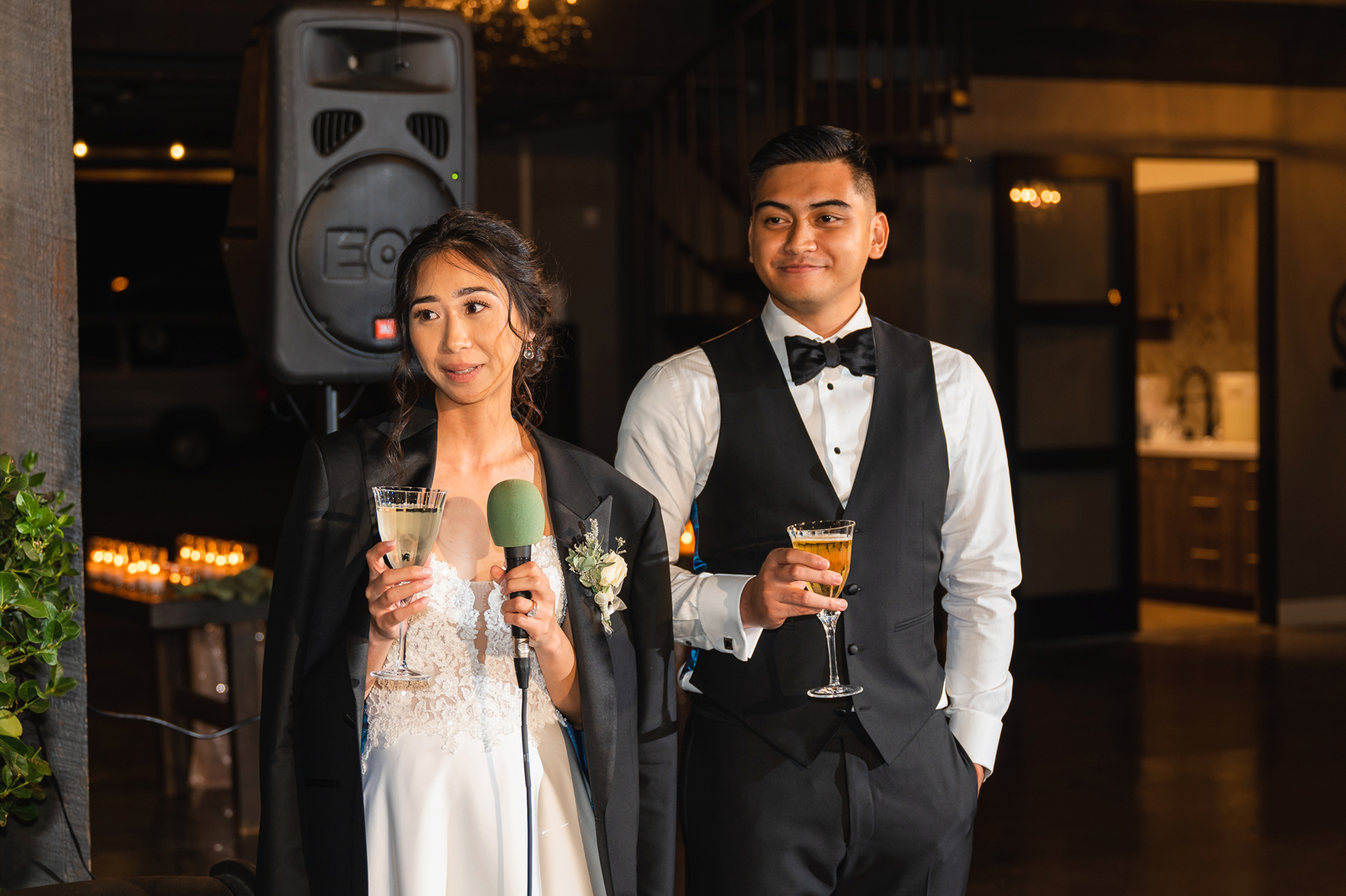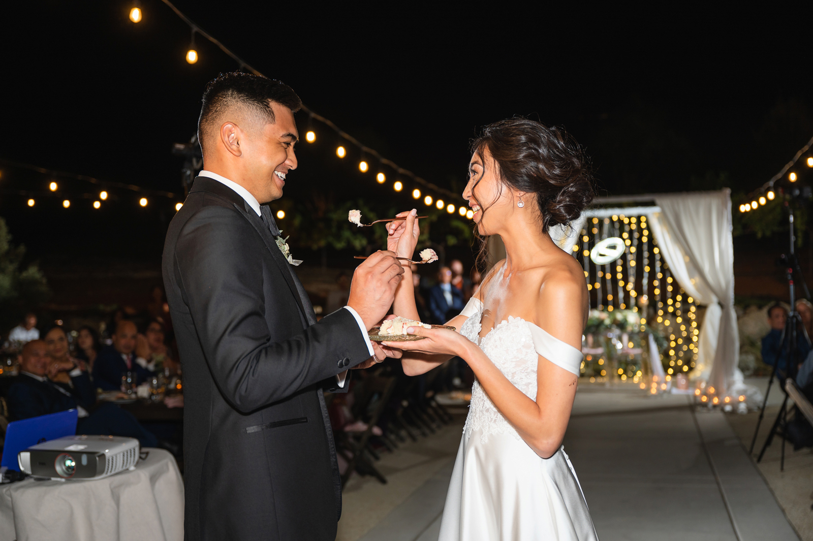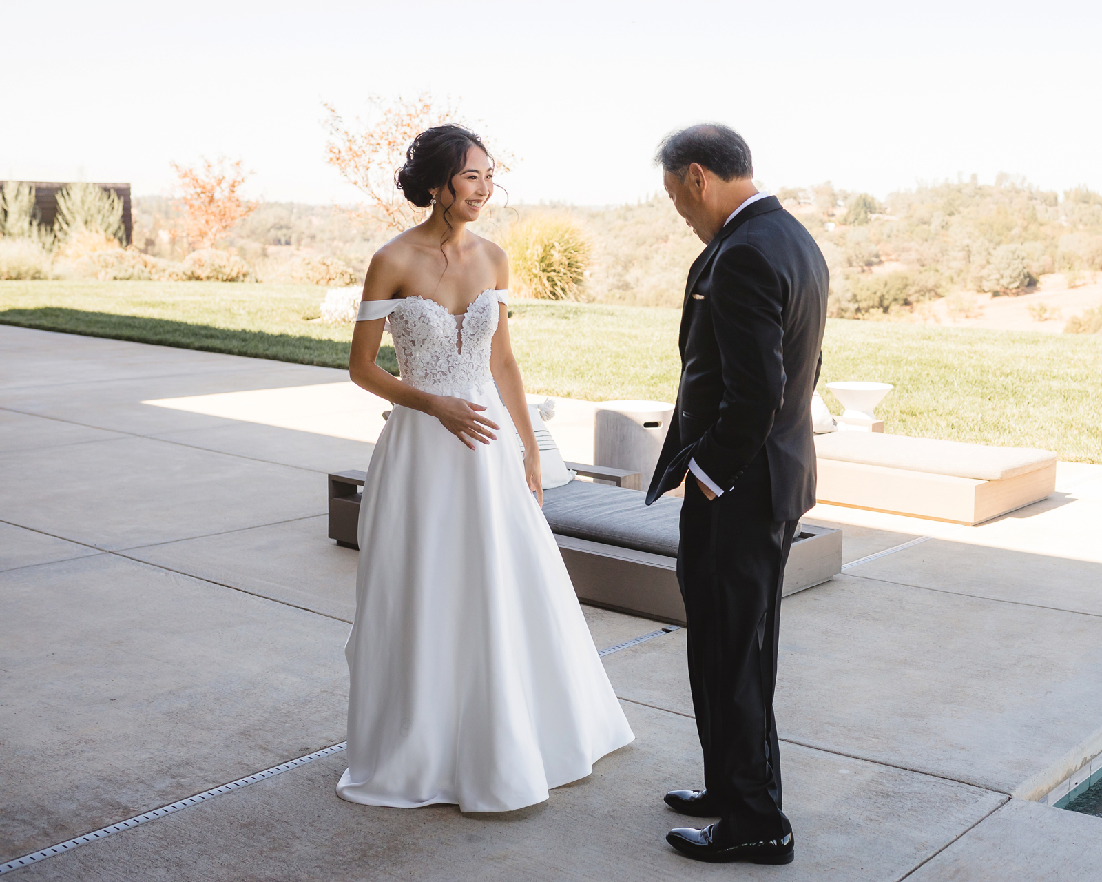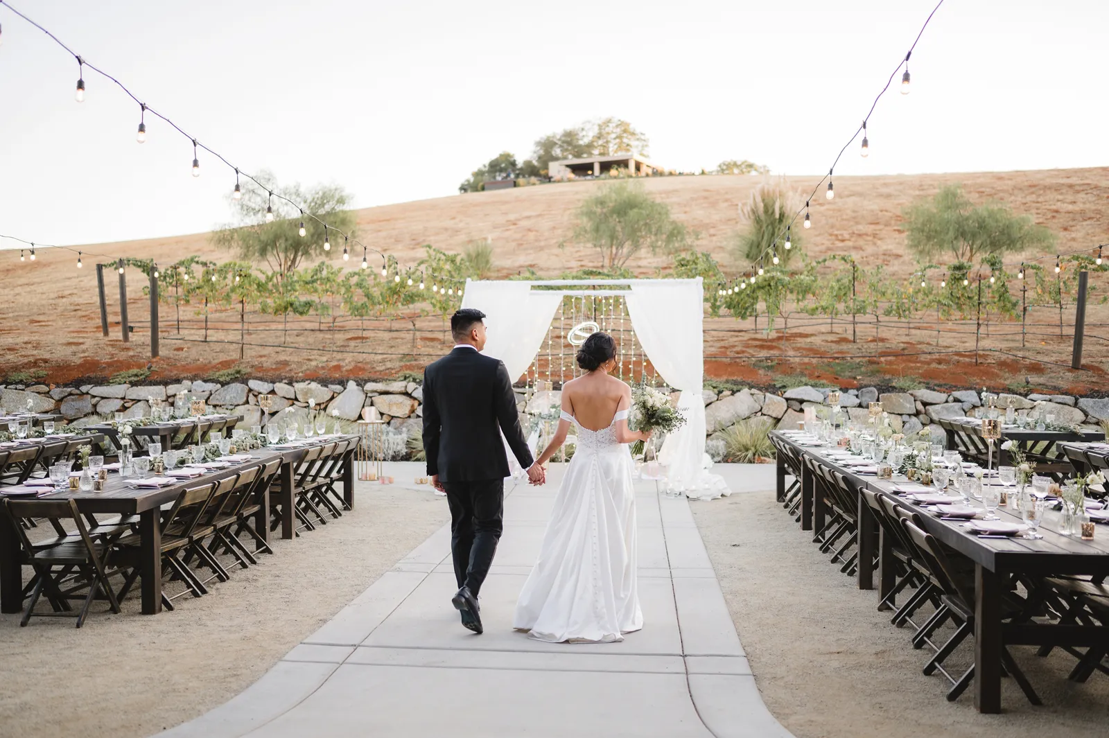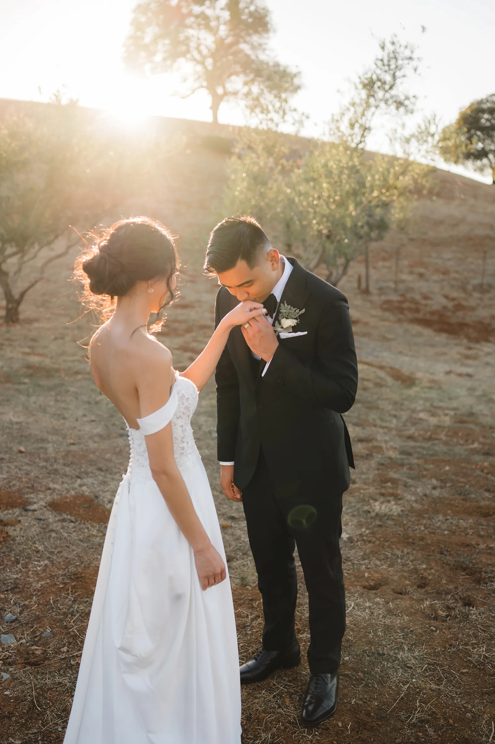 We were both at a community event, and Madeline was the stage host. She took a quick 5-minute bite for dinner. She was literally stuffing her face when a man came out from the crowd and said, “Hi” with a huge smile. She looked up, said “Hi!” and left to jump back up on stage. That stranger was Leandro. It’s not his usual character to walk up to pretty girls and say hi, but something gave him the urge to do it anyway. A month later, a mutual friend asked Madeline to reach out to “some guy” on social media so she could include him in future events. That “some guy” was Leandro. We messaged every once in a while, saw each other here and there, and a few months later hung out at get-togethers with mutual friends. We ended up bonding over hikes, star gazing, painting, and dock crabbing. Next thing we knew, we “fell in friends”. Just seven days before Madeline was moving to another state, we ended up having a talk and realized we’ve developed feelings for each other. But we both decided to give each other time to figure out what we wanted to do, and we can talk about it at the end of the week. Leandro had a rule to not do long distance relationships. But he didn’t need the whole week to decide that he wanted to be involved with Madeline. The next day, he told her that he wanted to give it a try. We dated for less than a week, then Madeline moved. Even though we were in different states, we stayed exclusive, and Leandro eventually moved too – near Madeline. After a few months in the relationship, Leandro told her that he was the stranger who walked out from the crowd to say hello. She can’t believe she doesn’t remember when she first met the love of her life! [For the proposal], it was a Friday night, and Madeline’s family was getting together for a family photo shoot for her mom’s birthday. When she arrived, she started working on a project that she had to redo and submit that night. Madeline’s sister went to get her from the other room for the family photos. Madeline follow her out to a silent house (that’s because she was being led to the backyard where their dad’s hand-built gazebo was covered with curtain lights, wisteria, and flowers). It wasn’t a family photo shoot at all, but a surprise proposal. Leandro planned an amazing and beautiful proposal with the help of Madeline’s family. Her sisters came up with a cover story that it was for their mom’s birthday photos, and her brother-in-law had one camera angle while another was set up for a different angle. Her whole family was in on it. Madeline, shocked and frozen in place, saw Leandro in a suit, all handsome, and cold after secretly waiting outside on a cold November night for over an hour! But he warmed up when he saw her appear from the two French doors. Leandro’s big and happy smile made Madeline’s heart skip. He waved her over and she stepped out. She had on a black cocktail dress, undone hair (“It was supposed to be mom’s moment, not mine!”) and tan rubber flip-flops on! That’s what happens when you get surprised! [For the wedding planning], we shared ideas and really wanted to make it a day for both of us. Neither of us had specific ideas coming into our engagement, but we discussed all of the details and agreed on everything. We both stayed involved from beginning to end, and at the end of the day, we had a great time celebrating our wedding day with the closest of family and friends in our specific L&M style.