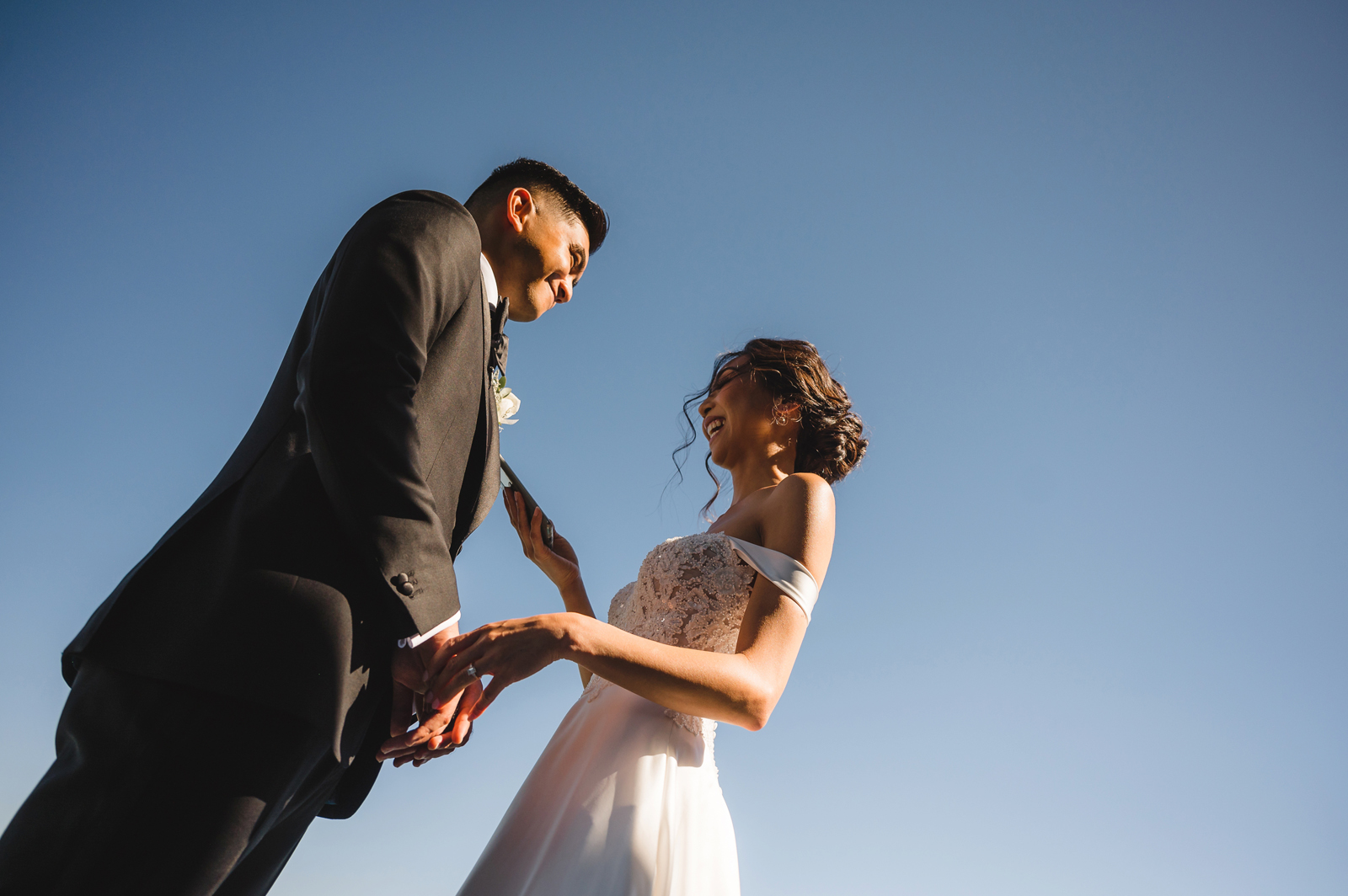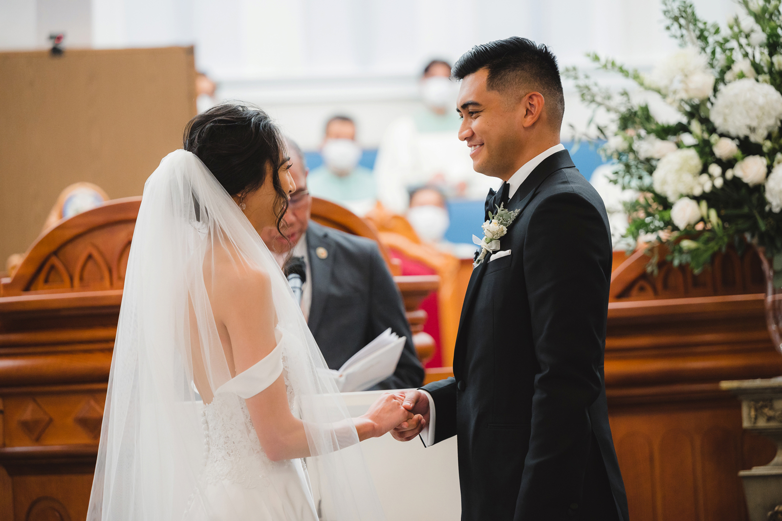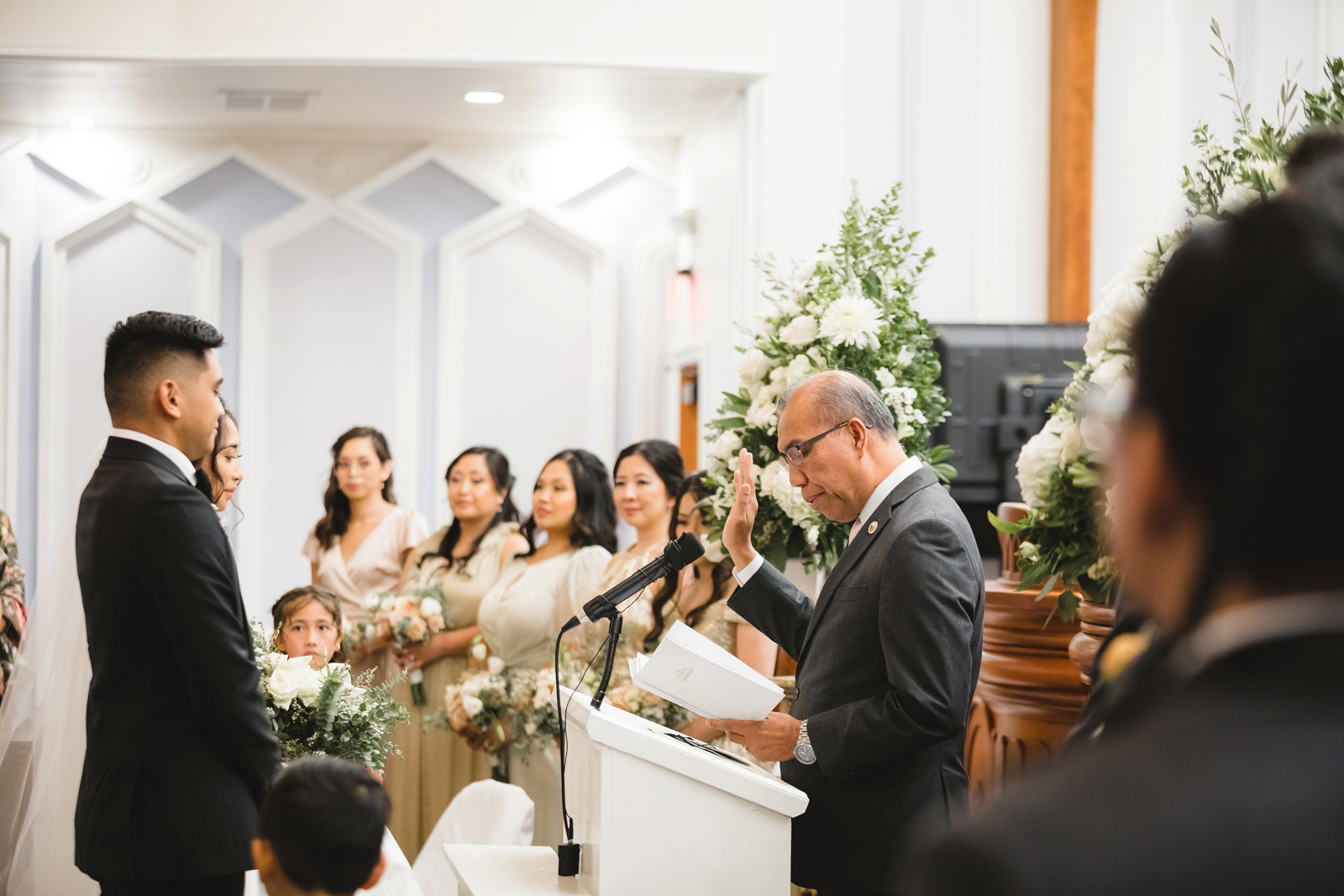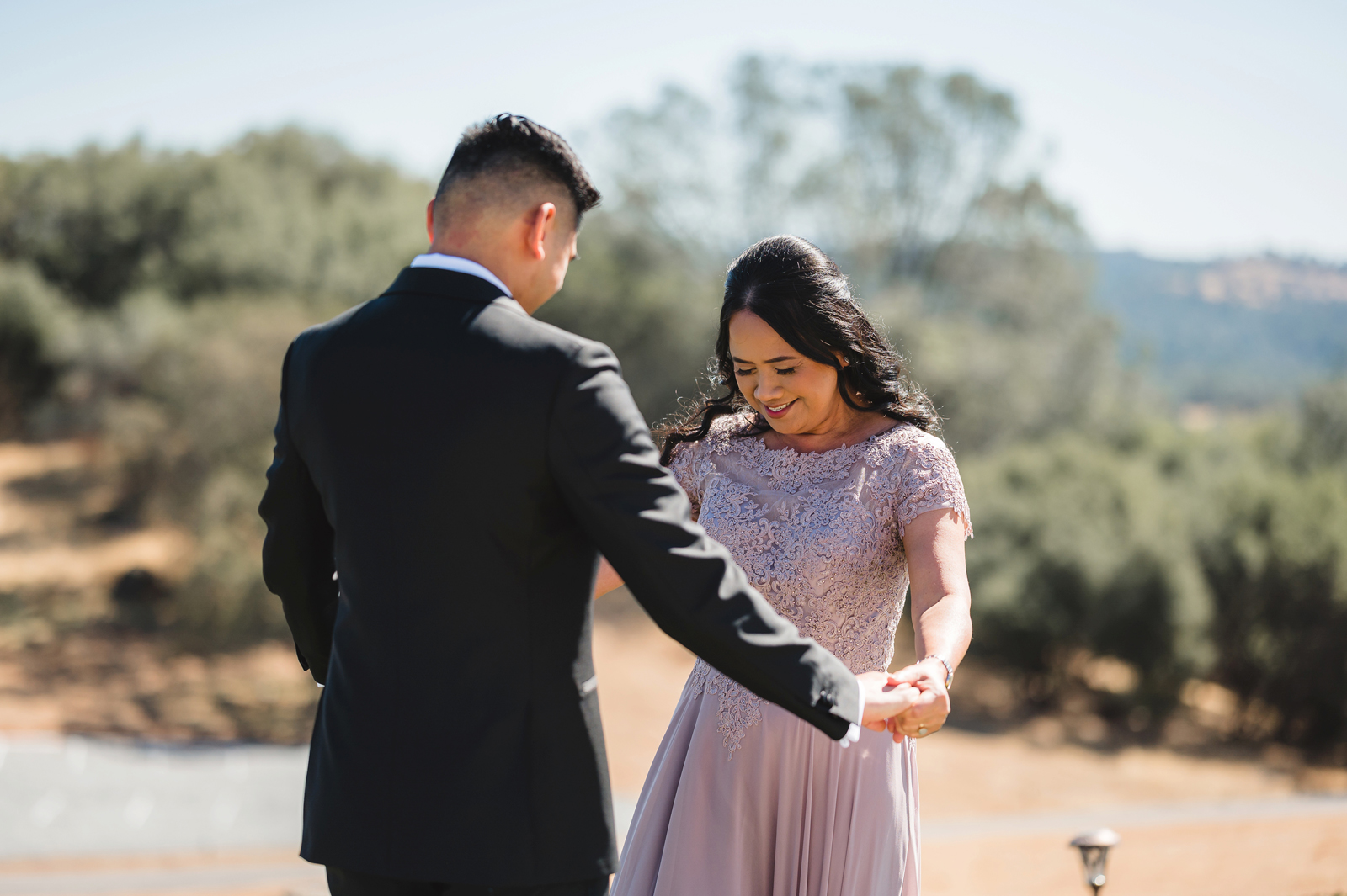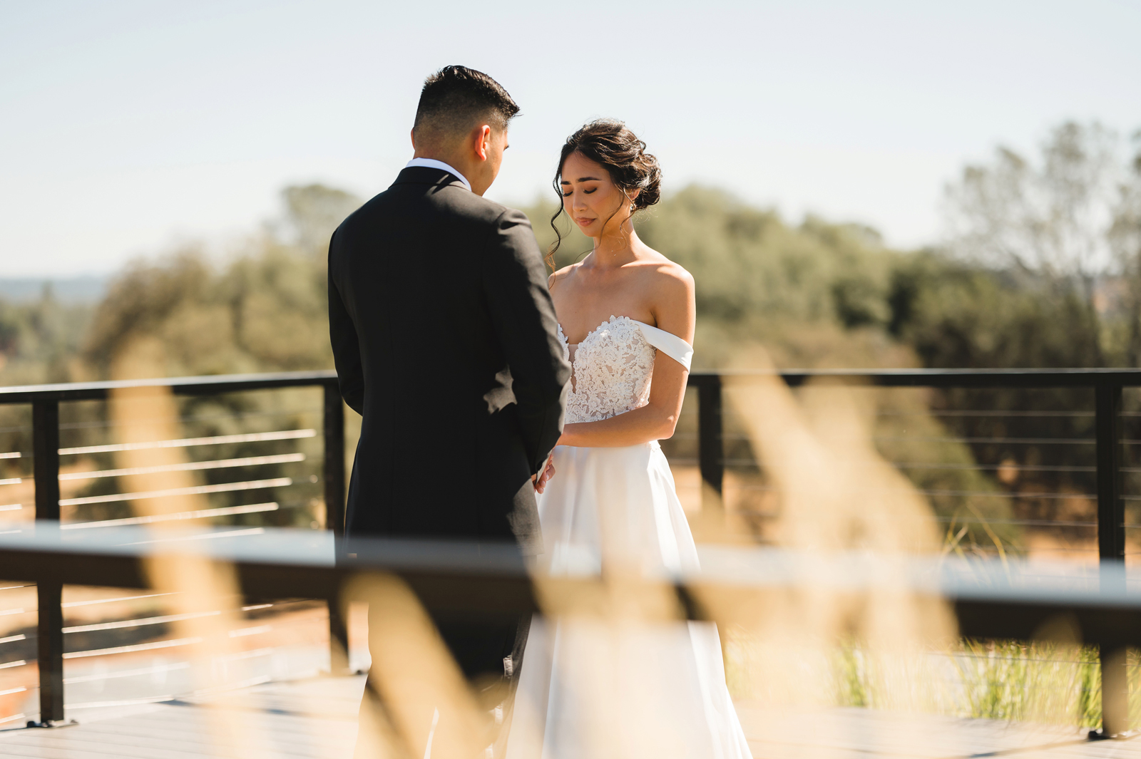 We were both at a community event, and Madeline was the stage host. She took a quick 5-minute bite for dinner. She was literally stuffing her face when a man came out from the crowd and said, “Hi” with a huge smile. She looked up, said “Hi!” and left to jump back up on stage. That stranger was Leandro. It’s not his usual character to walk up to pretty girls and say hi, but something gave him the urge to do it anyway. A month later, a mutual friend asked Madeline to reach out to “some guy” on social media so she could include him in future events. That “some guy” was Leandro. We messaged every once in a while, saw each other here and there, and a few months later hung out at get-togethers with mutual friends. We ended up bonding over hikes, star gazing, painting, and dock crabbing. Next thing we knew, we “fell in friends”. Just seven days before Madeline was moving to another state, we ended up having a talk and realized we’ve developed feelings for each other. But we both decided to give each other time to figure out what we wanted to do, and we can talk about it at the end of the week. Leandro had a rule to not do long distance relationships. But he didn’t need the whole week to decide that he wanted to be involved with Madeline. The next day, he told her that he wanted to give it a try. We dated for less than a week, then Madeline moved. Even though we were in different states, we stayed exclusive, and Leandro eventually moved too – near Madeline. After a few months in the relationship, Leandro told her that he was the stranger who walked out from the crowd to say hello. She can’t believe she doesn’t remember when she first met the love of her life! [For the proposal], it was a Friday night, and Madeline’s family was getting together for a family photo shoot for her mom’s birthday. When she arrived, she started working on a project that she had to redo and submit that night. Madeline’s sister went to get her from the other room for the family photos. Madeline follow her out to a silent house (that’s because she was being led to the backyard where their dad’s hand-built gazebo was covered with curtain lights, wisteria, and flowers). It wasn’t a family photo shoot at all, but a surprise proposal. Leandro planned an amazing and beautiful proposal with the help of Madeline’s family. Her sisters came up with a cover story that it was for their mom’s birthday photos, and her brother-in-law had one camera angle while another was set up for a different angle. Her whole family was in on it. Madeline, shocked and frozen in place, saw Leandro in a suit, all handsome, and cold after secretly waiting outside on a cold November night for over an hour! But he warmed up when he saw her appear from the two French doors. Leandro’s big and happy smile made Madeline’s heart skip. He waved her over and she stepped out. She had on a black cocktail dress, undone hair (“It was supposed to be mom’s moment, not mine!”) and tan rubber flip-flops on! That’s what happens when you get surprised! [For the wedding planning], we shared ideas and really wanted to make it a day for both of us. Neither of us had specific ideas coming into our engagement, but we discussed all of the details and agreed on everything. We both stayed involved from beginning to end, and at the end of the day, we had a great time celebrating our wedding day with the closest of family and friends in our specific L&M style.