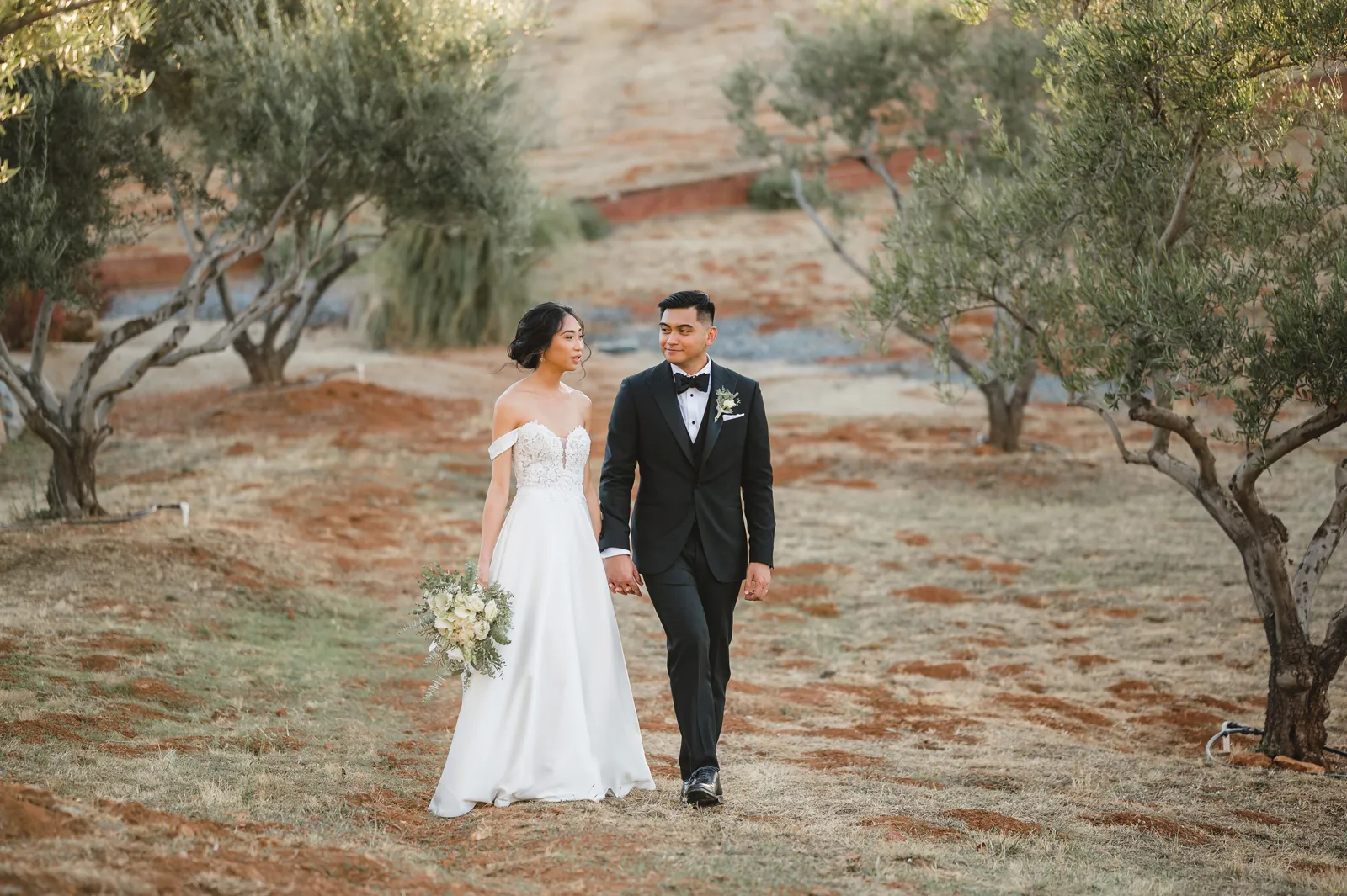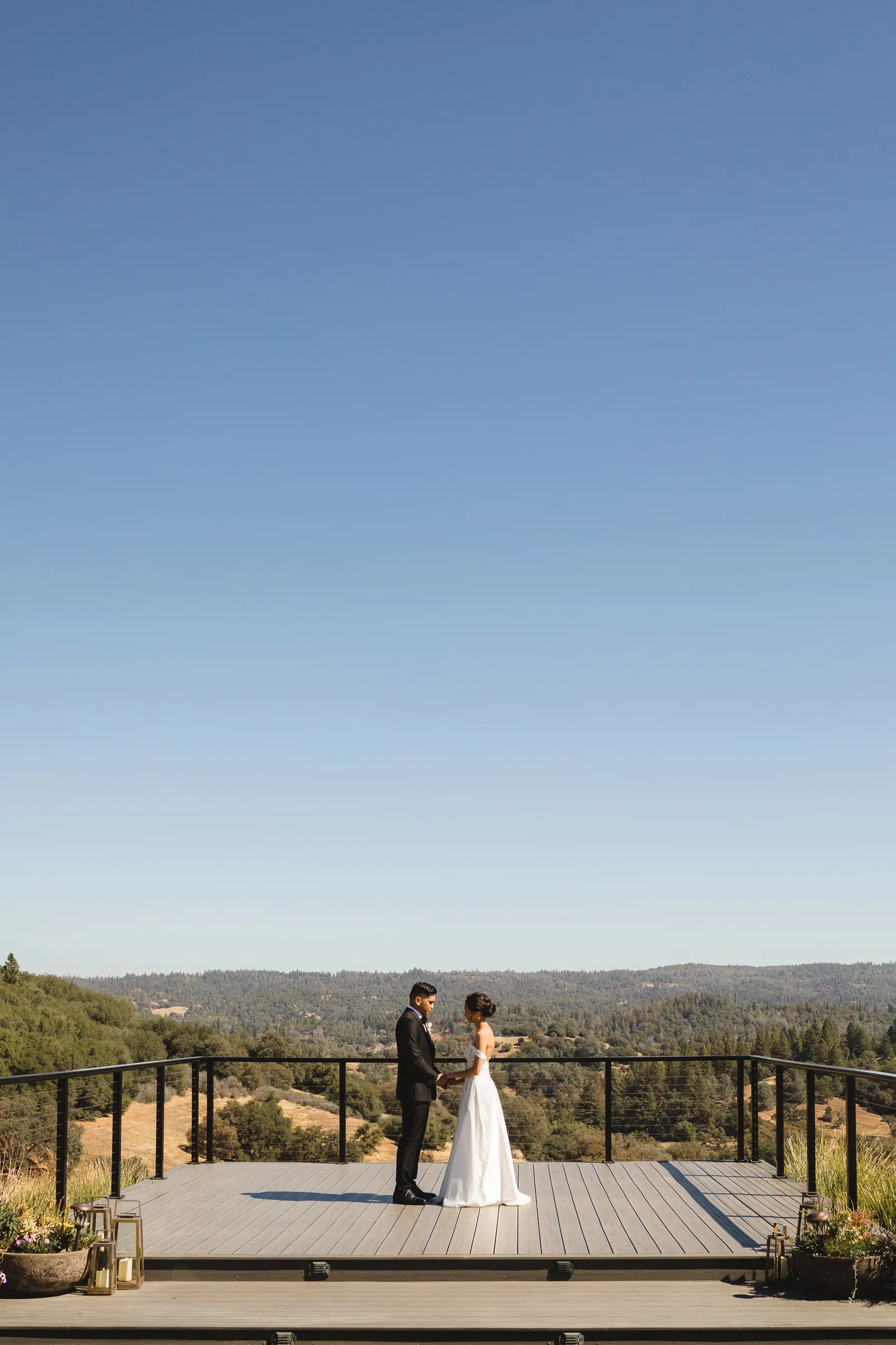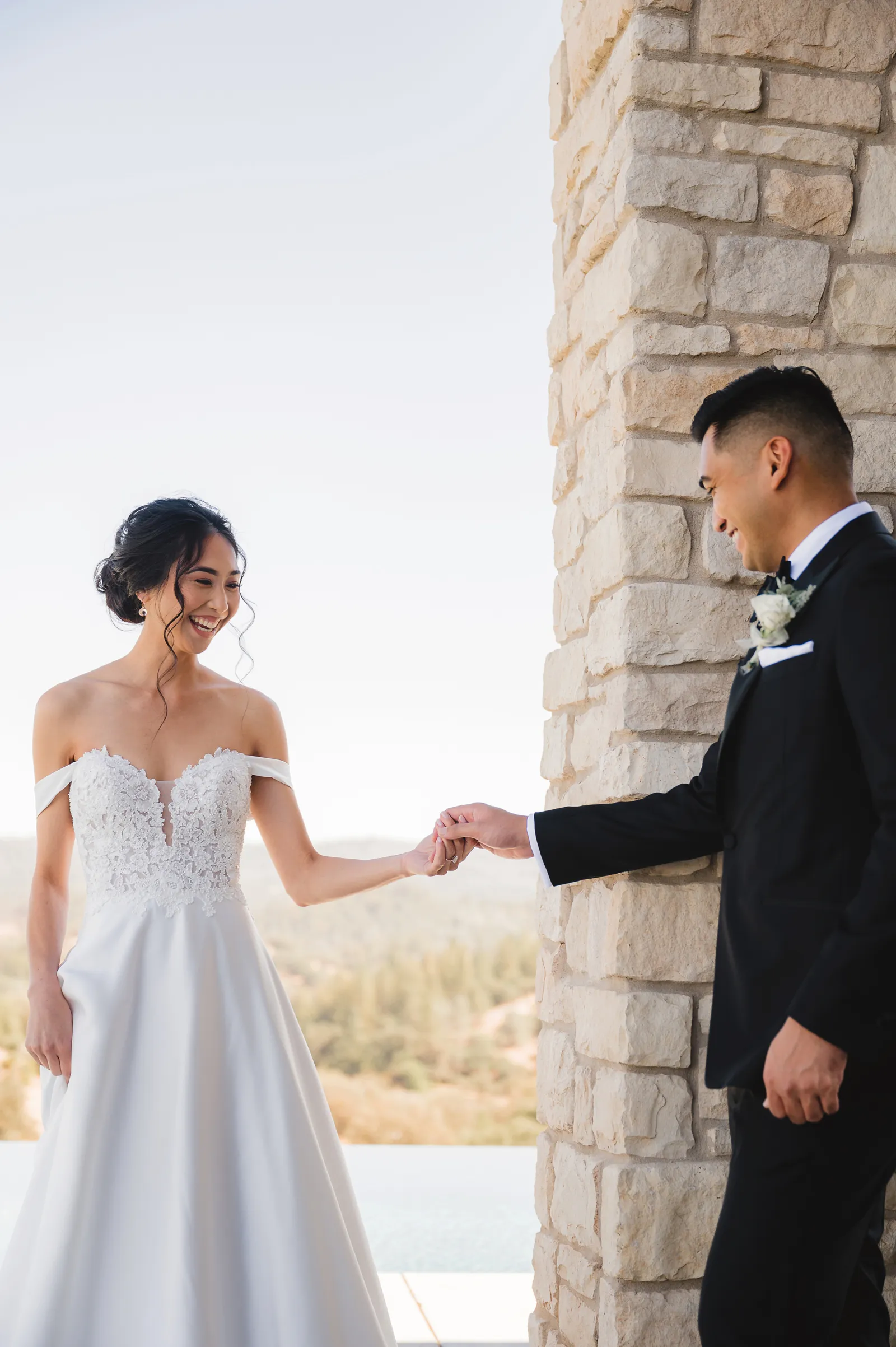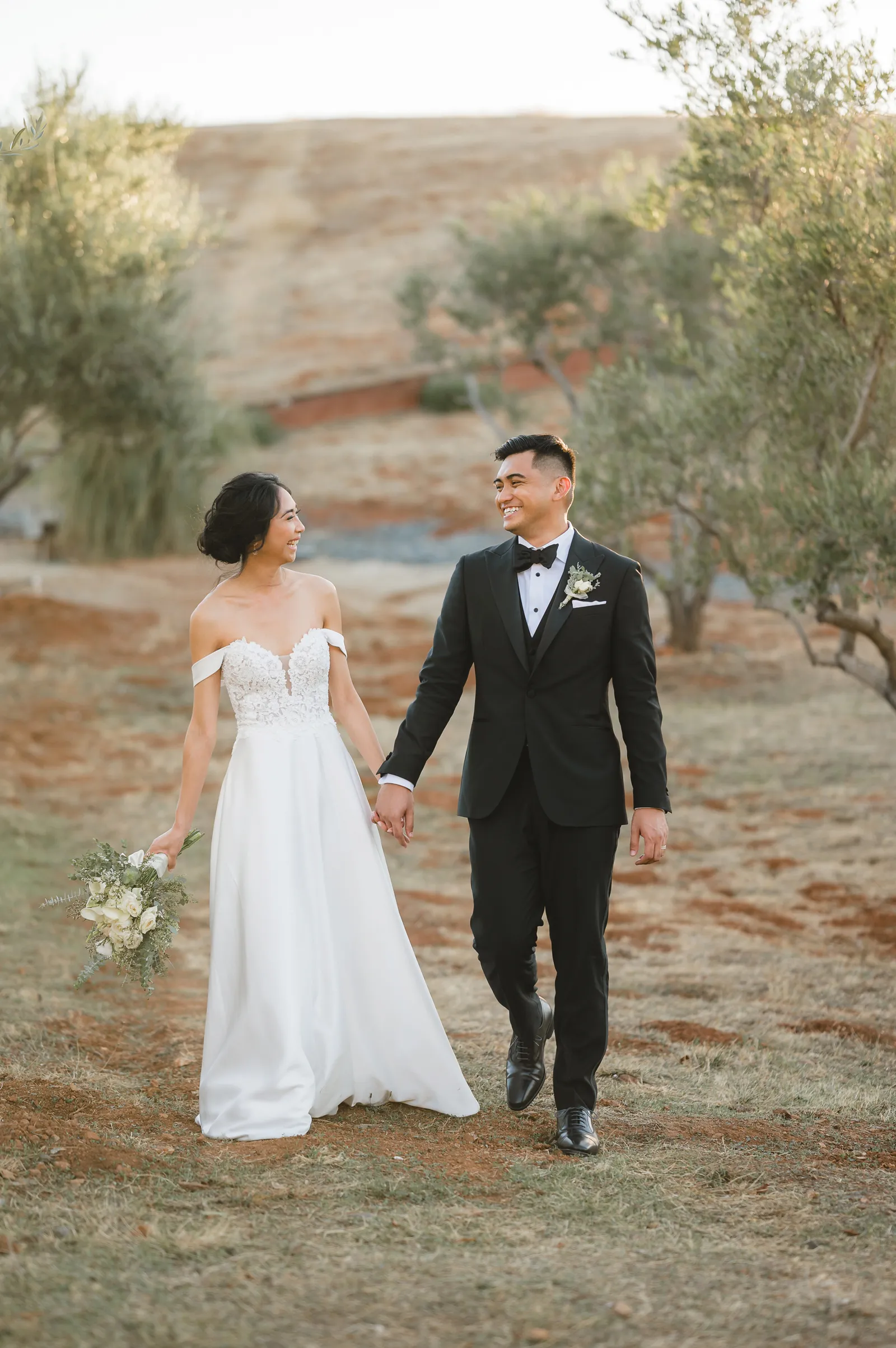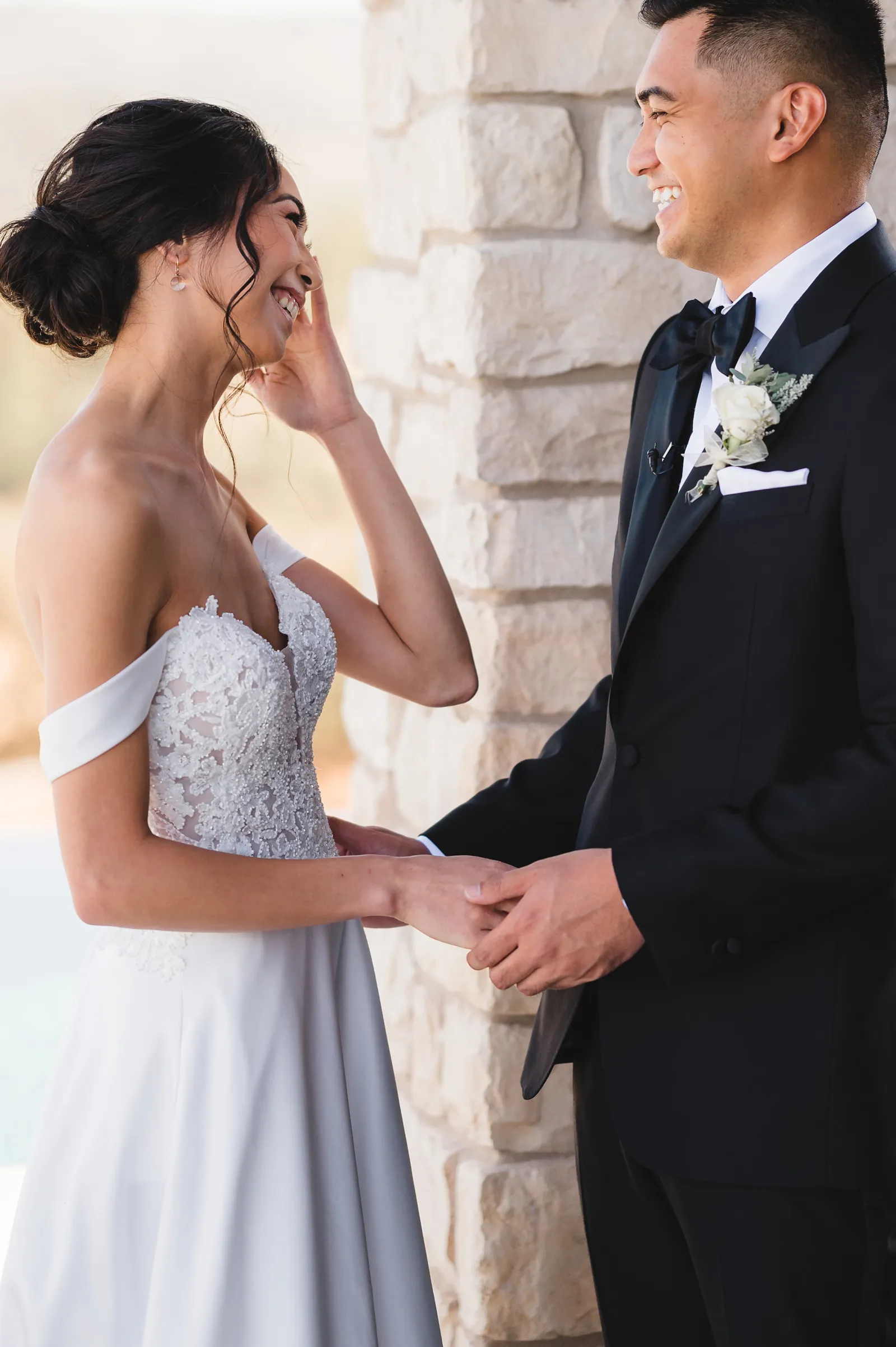 We were both at a community event, and Madeline was the stage host. She took a quick 5-minute bite for dinner. She was literally stuffing her face when a man came out from the crowd and said, “Hi” with a huge smile. She looked up, said “Hi!” and left to jump back up on stage. That stranger was Leandro. It’s not his usual character to walk up to pretty girls and say hi, but something gave him the urge to do it anyway. A month later, a mutual friend asked Madeline to reach out to “some guy” on social media so she could include him in future events. That “some guy” was Leandro. We messaged every once in a while, saw each other here and there, and a few months later hung out at get-togethers with mutual friends. We ended up bonding over hikes, star gazing, painting, and dock crabbing. Next thing we knew, we “fell in friends”. Just seven days before Madeline was moving to another state, we ended up having a talk and realized we’ve developed feelings for each other. But we both decided to give each other time to figure out what we wanted to do, and we can talk about it at the end of the week. Leandro had a rule to not do long distance relationships. But he didn’t need the whole week to decide that he wanted to be involved with Madeline. The next day, he told her that he wanted to give it a try. We dated for less than a week, then Madeline moved. Even though we were in different states, we stayed exclusive, and Leandro eventually moved too – near Madeline. After a few months in the relationship, Leandro told her that he was the stranger who walked out from the crowd to say hello. She can’t believe she doesn’t remember when she first met the love of her life! [For the proposal], it was a Friday night, and Madeline’s family was getting together for a family photo shoot for her mom’s birthday. When she arrived, she started working on a project that she had to redo and submit that night. Madeline’s sister went to get her from the other room for the family photos. Madeline follow her out to a silent house (that’s because she was being led to the backyard where their dad’s hand-built gazebo was covered with curtain lights, wisteria, and flowers). It wasn’t a family photo shoot at all, but a surprise proposal. Leandro planned an amazing and beautiful proposal with the help of Madeline’s family. Her sisters came up with a cover story that it was for their mom’s birthday photos, and her brother-in-law had one camera angle while another was set up for a different angle. Her whole family was in on it. Madeline, shocked and frozen in place, saw Leandro in a suit, all handsome, and cold after secretly waiting outside on a cold November night for over an hour! But he warmed up when he saw her appear from the two French doors. Leandro’s big and happy smile made Madeline’s heart skip. He waved her over and she stepped out. She had on a black cocktail dress, undone hair (“It was supposed to be mom’s moment, not mine!”) and tan rubber flip-flops on! That’s what happens when you get surprised! [For the wedding planning], we shared ideas and really wanted to make it a day for both of us. Neither of us had specific ideas coming into our engagement, but we discussed all of the details and agreed on everything. We both stayed involved from beginning to end, and at the end of the day, we had a great time celebrating our wedding day with the closest of family and friends in our specific L&M style.