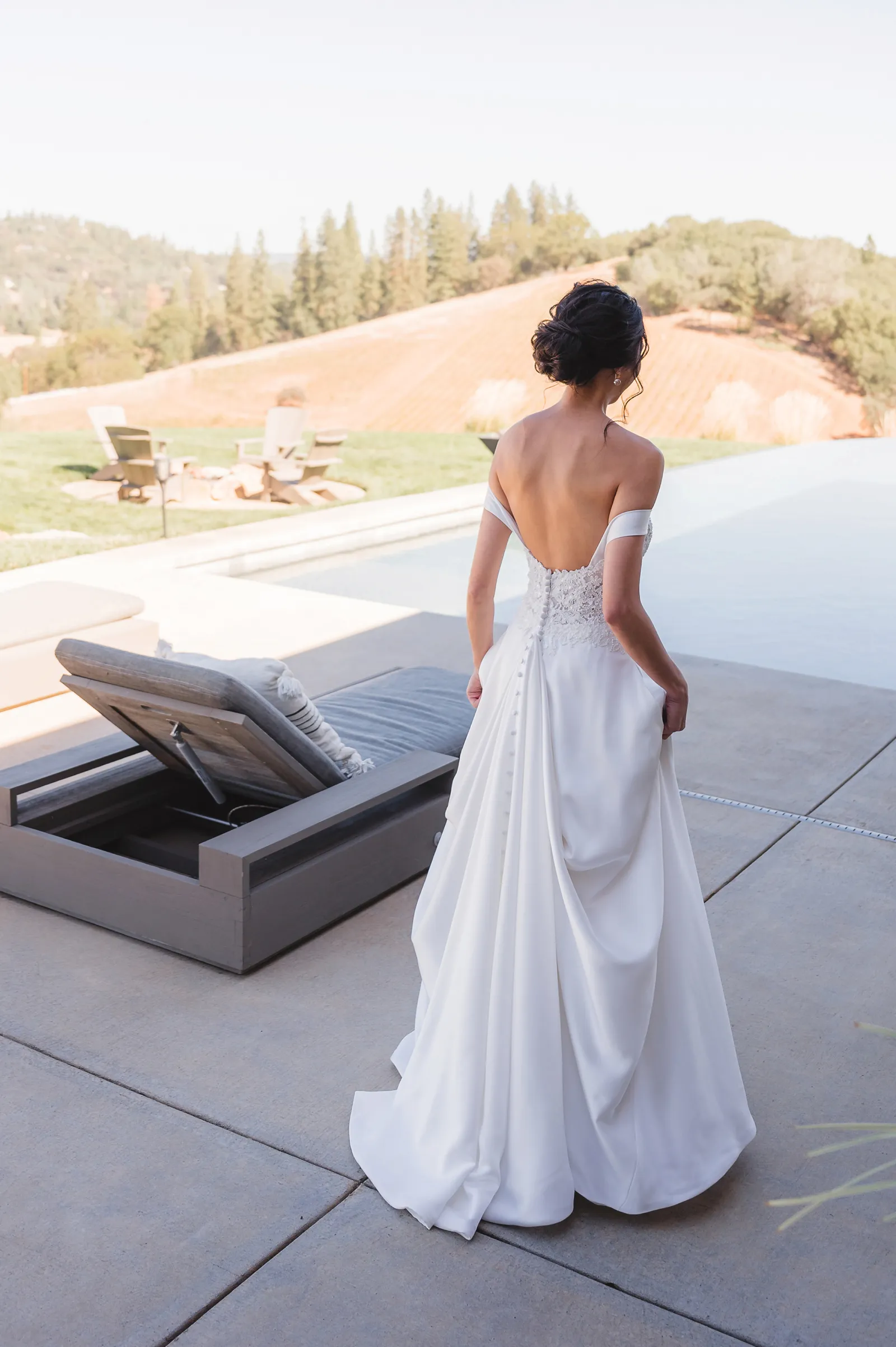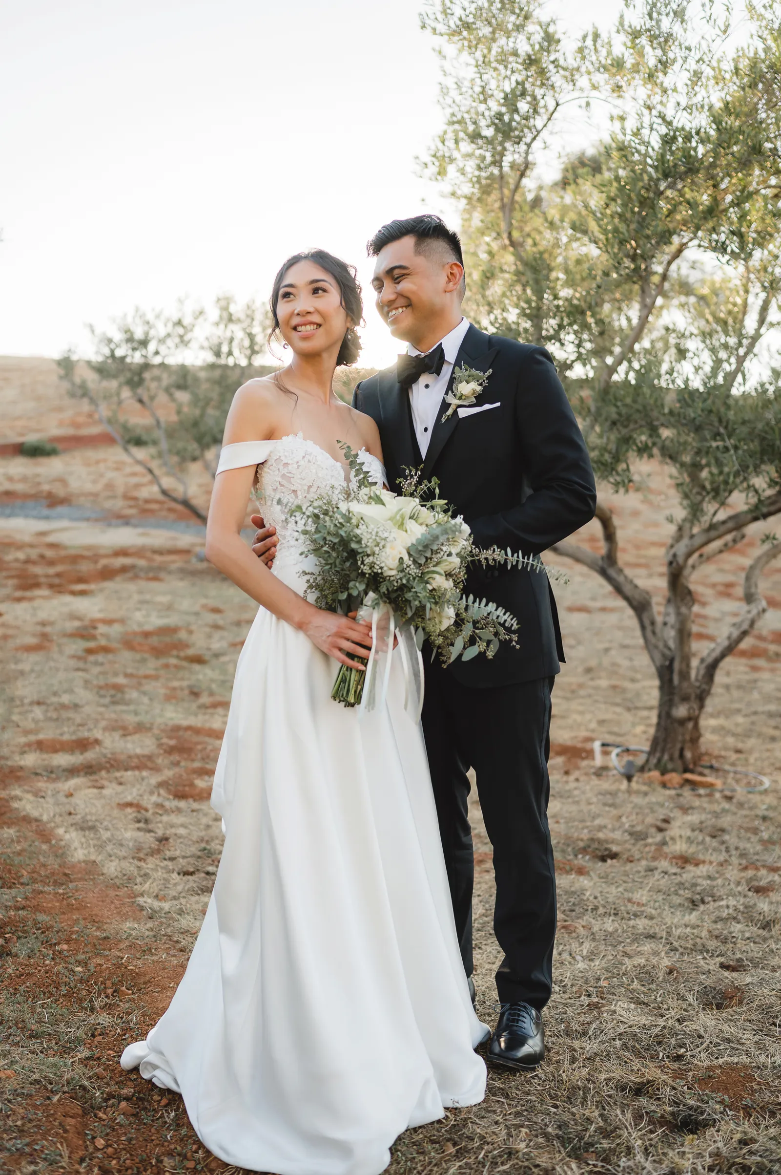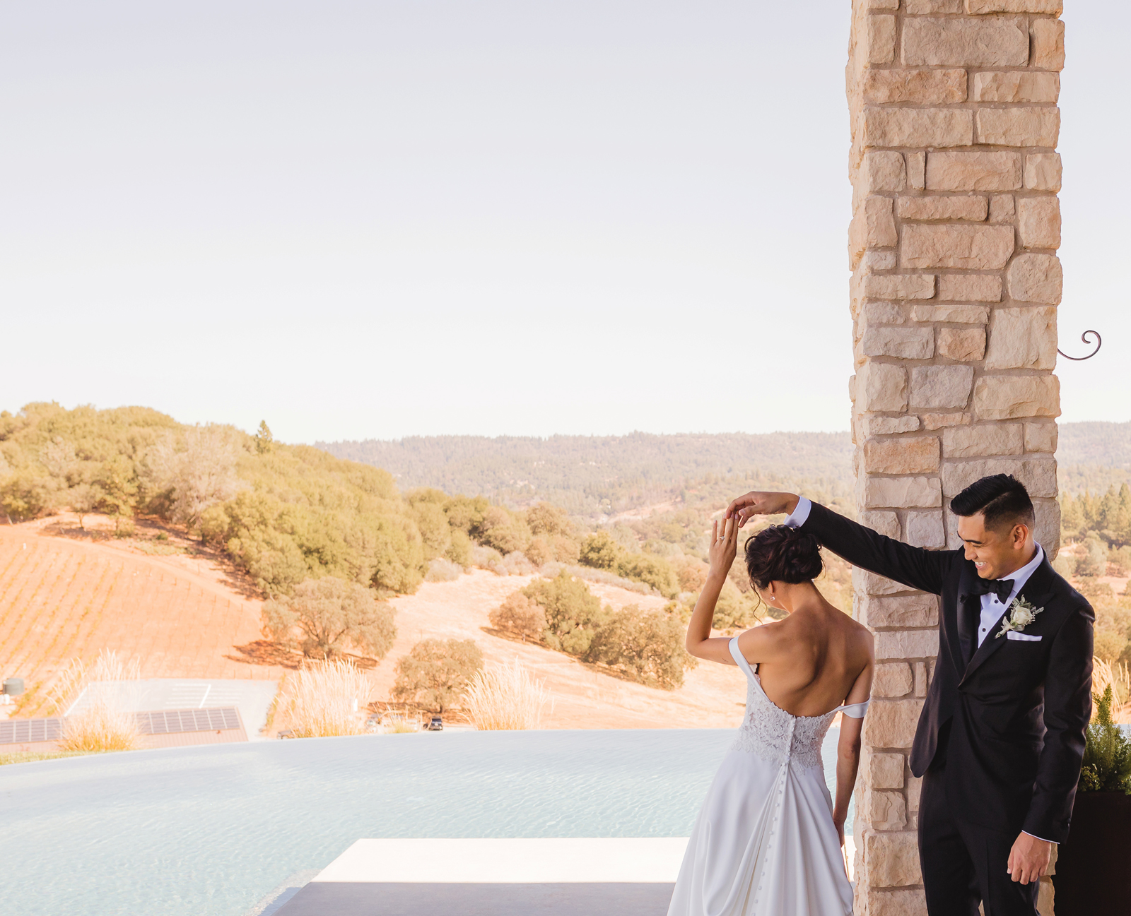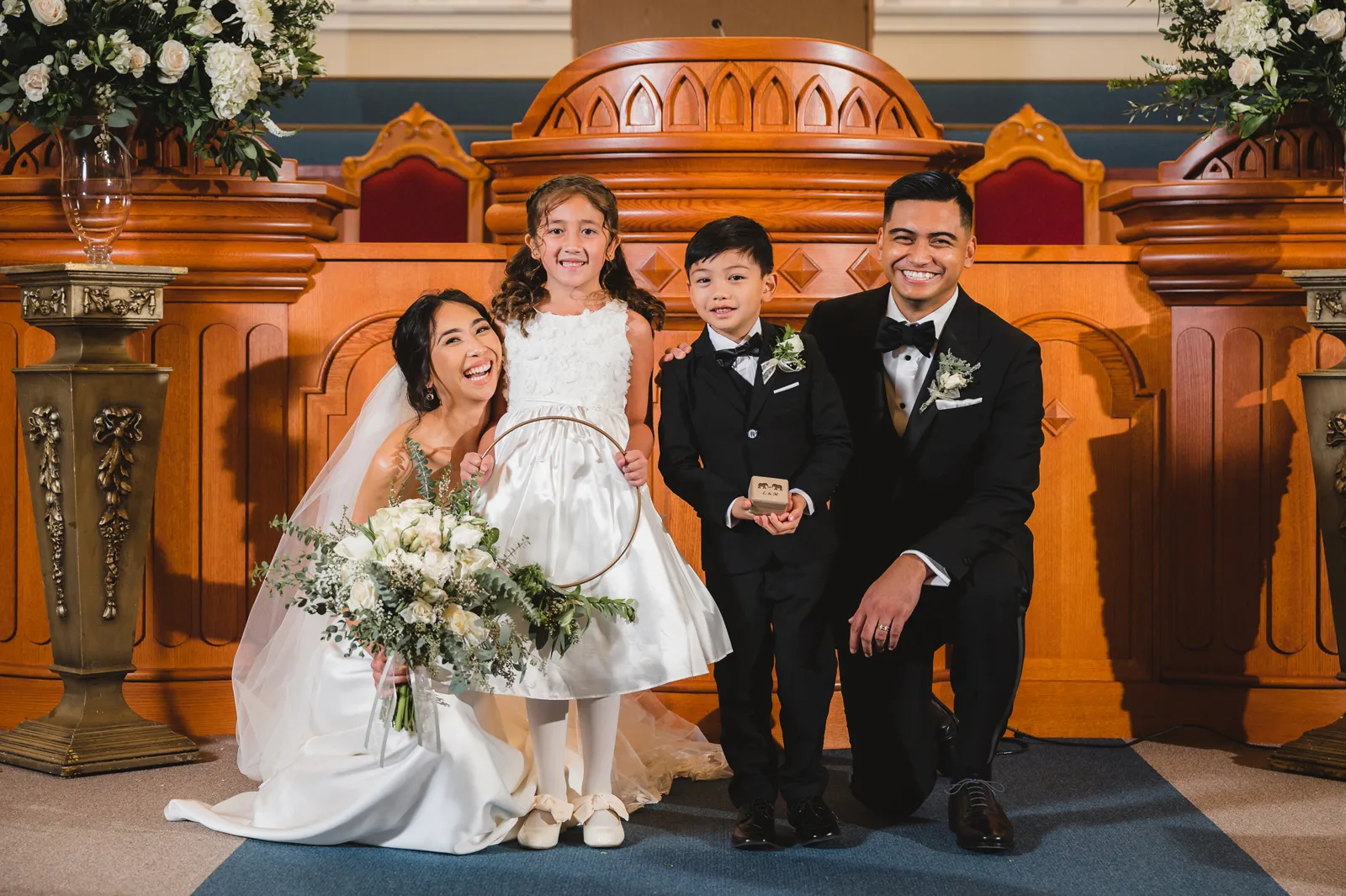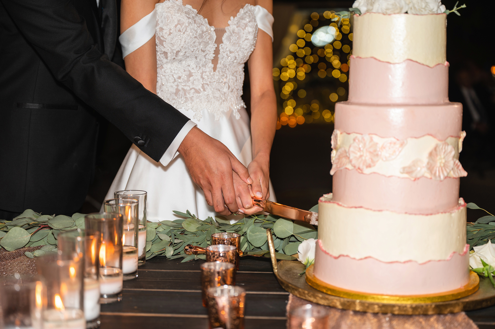 We were both at a community event, and Madeline was the stage host. She took a quick 5-minute bite for dinner. She was literally stuffing her face when a man came out from the crowd and said, “Hi” with a huge smile. She looked up, said “Hi!” and left to jump back up on stage. That stranger was Leandro. It’s not his usual character to walk up to pretty girls and say hi, but something gave him the urge to do it anyway. A month later, a mutual friend asked Madeline to reach out to “some guy” on social media so she could include him in future events. That “some guy” was Leandro. We messaged every once in a while, saw each other here and there, and a few months later hung out at get-togethers with mutual friends. We ended up bonding over hikes, star gazing, painting, and dock crabbing. Next thing we knew, we “fell in friends”. Just seven days before Madeline was moving to another state, we ended up having a talk and realized we’ve developed feelings for each other. But we both decided to give each other time to figure out what we wanted to do, and we can talk about it at the end of the week. Leandro had a rule to not do long distance relationships. But he didn’t need the whole week to decide that he wanted to be involved with Madeline. The next day, he told her that he wanted to give it a try. We dated for less than a week, then Madeline moved. Even though we were in different states, we stayed exclusive, and Leandro eventually moved too – near Madeline. After a few months in the relationship, Leandro told her that he was the stranger who walked out from the crowd to say hello. She can’t believe she doesn’t remember when she first met the love of her life! [For the proposal], it was a Friday night, and Madeline’s family was getting together for a family photo shoot for her mom’s birthday. When she arrived, she started working on a project that she had to redo and submit that night. Madeline’s sister went to get her from the other room for the family photos. Madeline follow her out to a silent house (that’s because she was being led to the backyard where their dad’s hand-built gazebo was covered with curtain lights, wisteria, and flowers). It wasn’t a family photo shoot at all, but a surprise proposal. Leandro planned an amazing and beautiful proposal with the help of Madeline’s family. Her sisters came up with a cover story that it was for their mom’s birthday photos, and her brother-in-law had one camera angle while another was set up for a different angle. Her whole family was in on it. Madeline, shocked and frozen in place, saw Leandro in a suit, all handsome, and cold after secretly waiting outside on a cold November night for over an hour! But he warmed up when he saw her appear from the two French doors. Leandro’s big and happy smile made Madeline’s heart skip. He waved her over and she stepped out. She had on a black cocktail dress, undone hair (“It was supposed to be mom’s moment, not mine!”) and tan rubber flip-flops on! That’s what happens when you get surprised! [For the wedding planning], we shared ideas and really wanted to make it a day for both of us. Neither of us had specific ideas coming into our engagement, but we discussed all of the details and agreed on everything. We both stayed involved from beginning to end, and at the end of the day, we had a great time celebrating our wedding day with the closest of family and friends in our specific L&M style.
