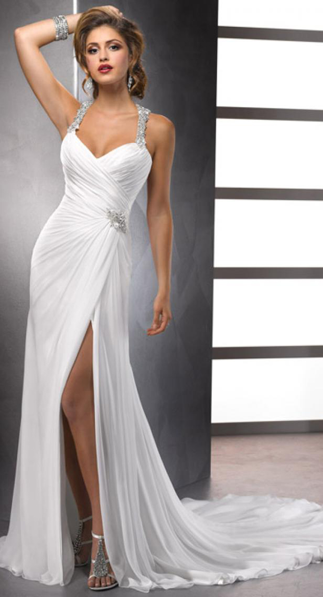 Sleek and sexy, this slim silhouette of Paris Chiffon shows off a high slit and Swarovski crystal racer-back shoulder straps and hip embellishment.