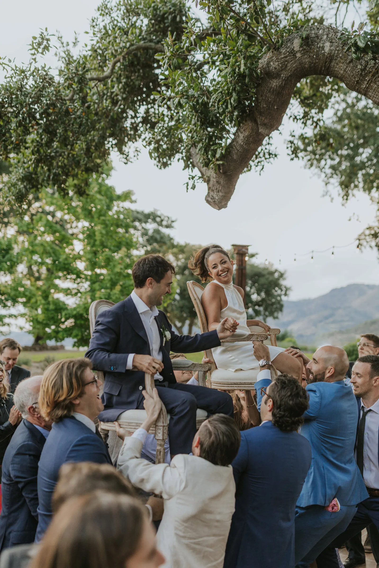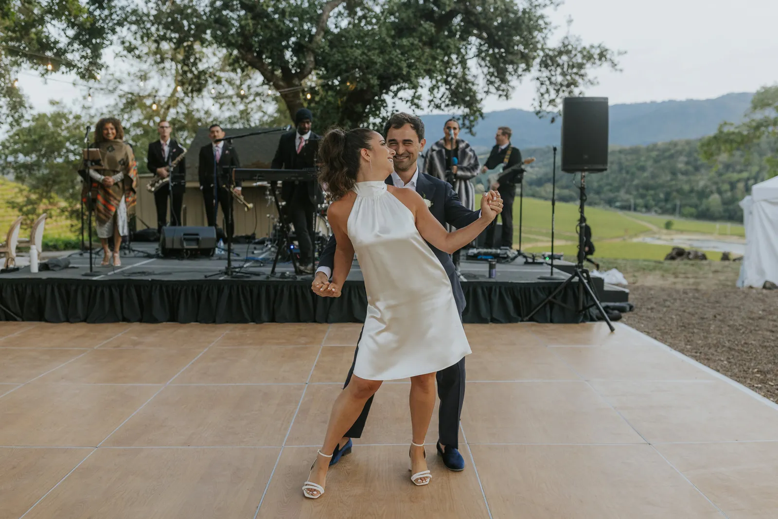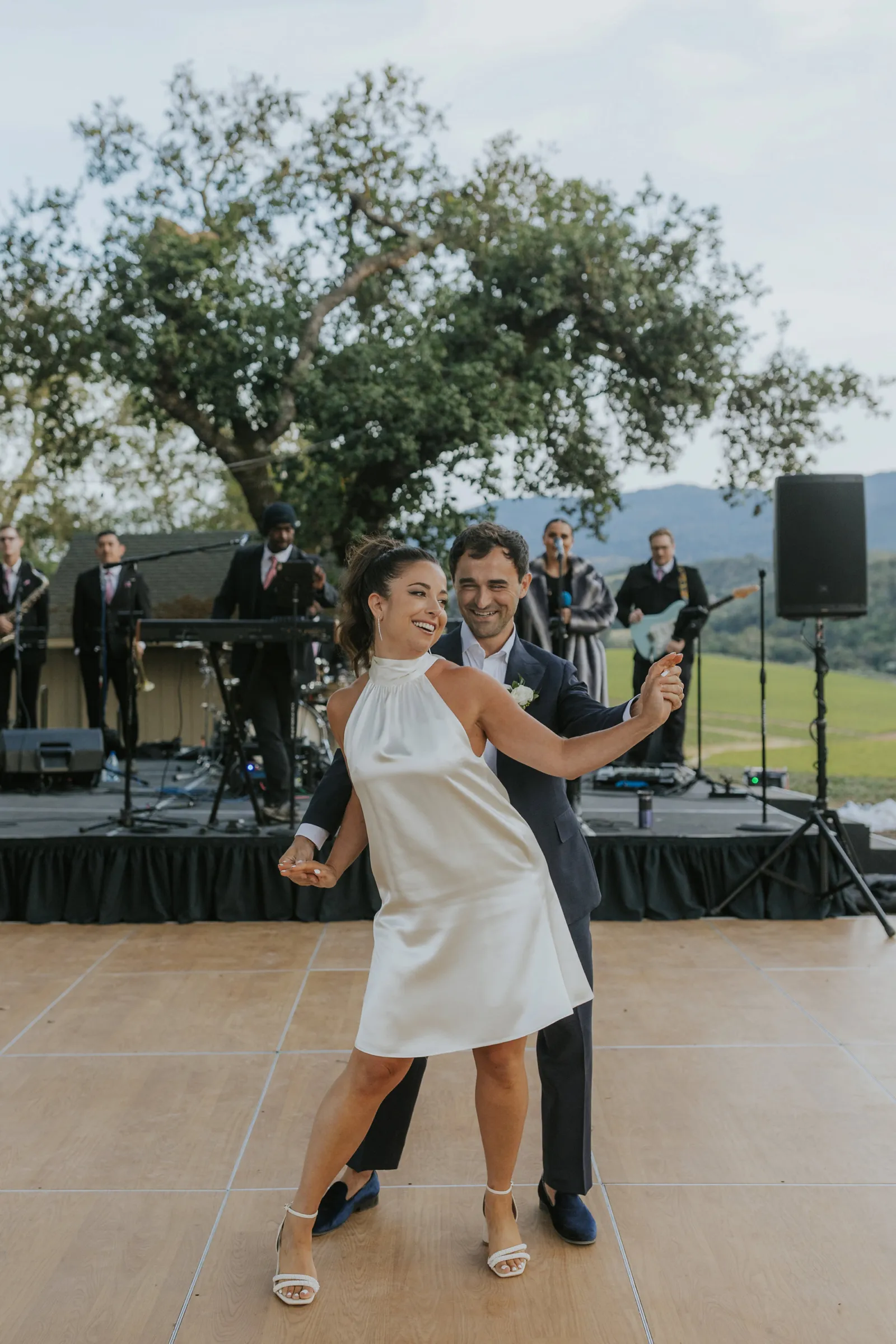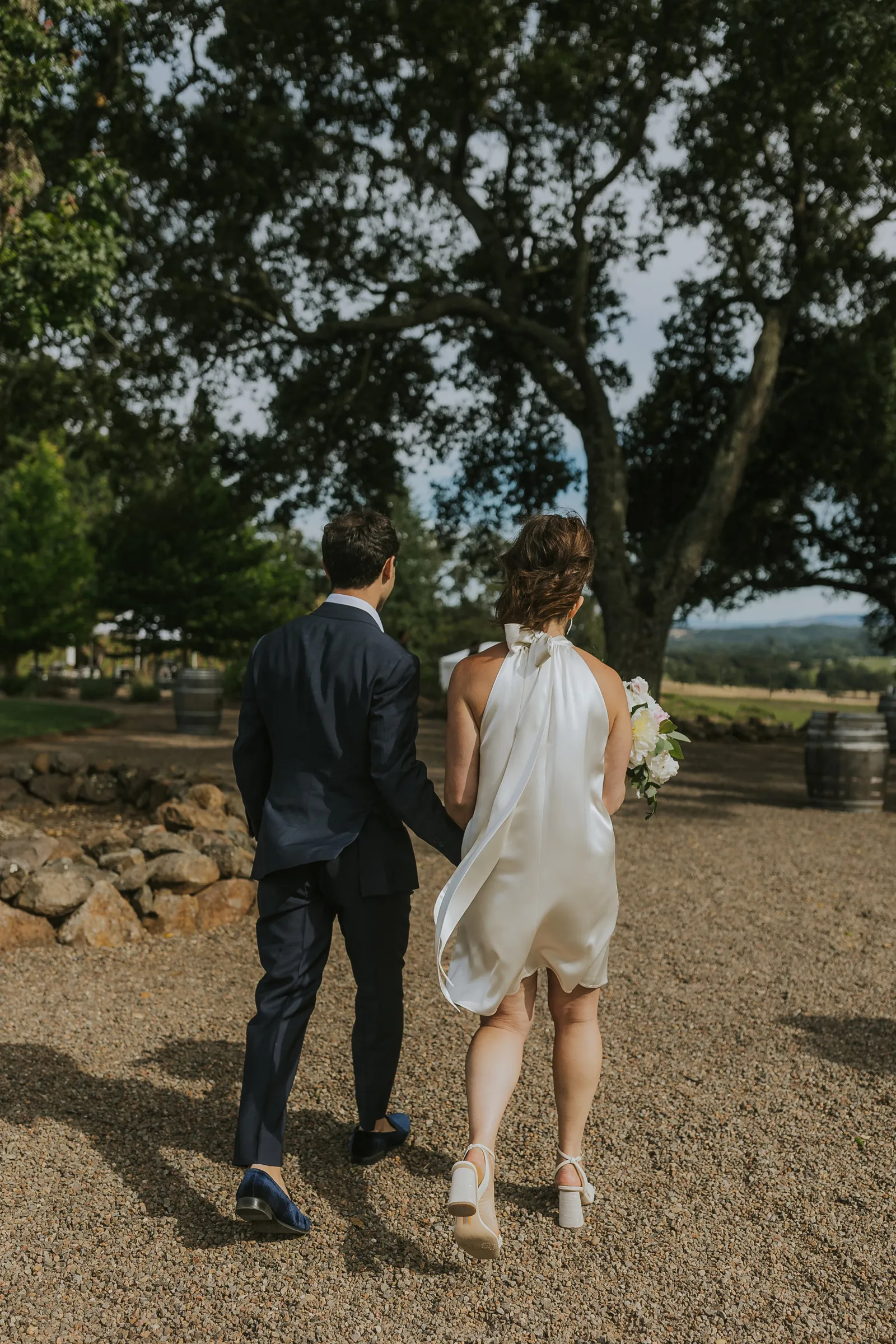 We met at work in 2014, became close friends, and in 2016 at the BottleRock festival Stevie Wonder decided to play a riff on “I Want to Hold Your Hand” asking everyone to hold hands. We couldn’t disobey one of our icons, and we’ve been together ever since. In 2021, while at a swimming hole on the Tuolumne River in Yosemite with some of our favorite people, we looked at each other and said “Should this be our engagement?”. Our planning for the wedding was always based around that special summertime Sonoma-at-dusk vibe. We pulled it off with incredible soul music, family-style seasonal gems for dinner, a gelato cart, wine from Daniella’s dad’s winery, glam and attire that made us feel like “us”, and minimal peonies-only florals to emphasize being in the stunning vineyard.