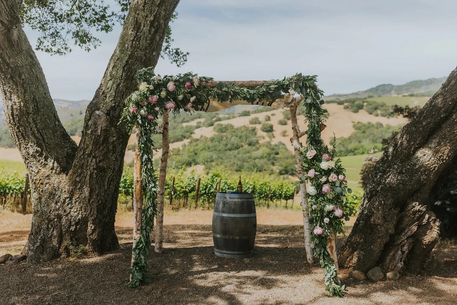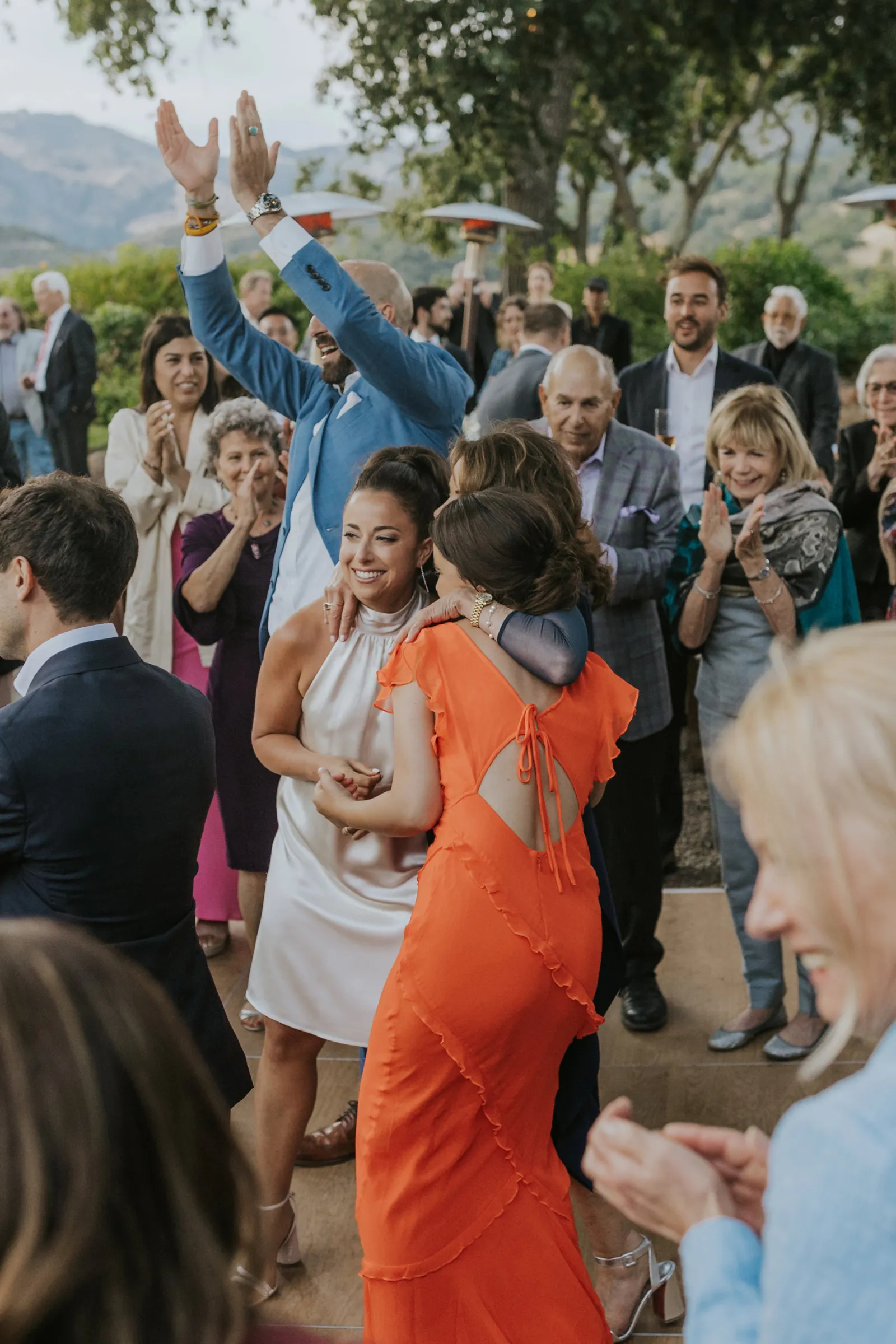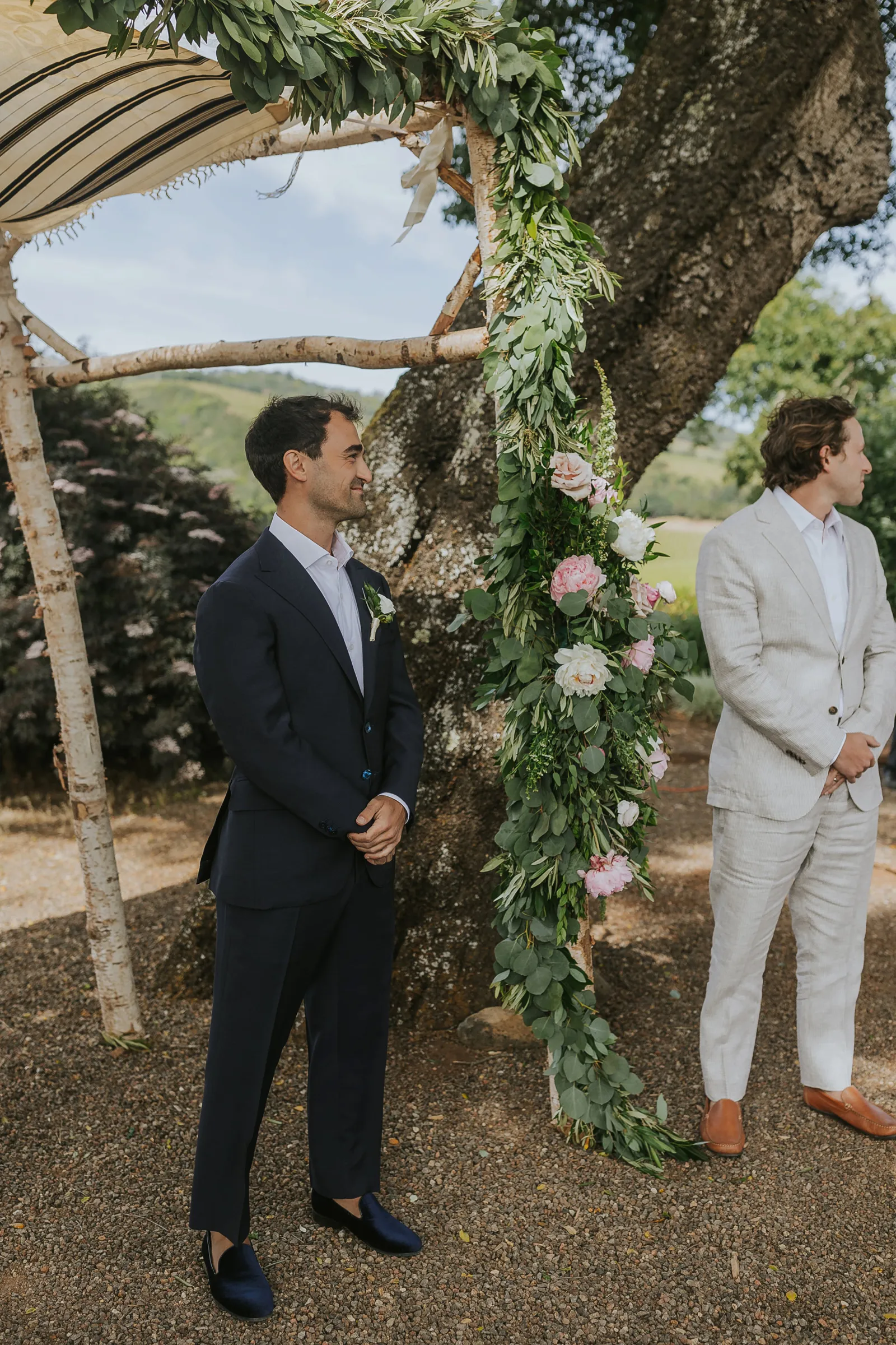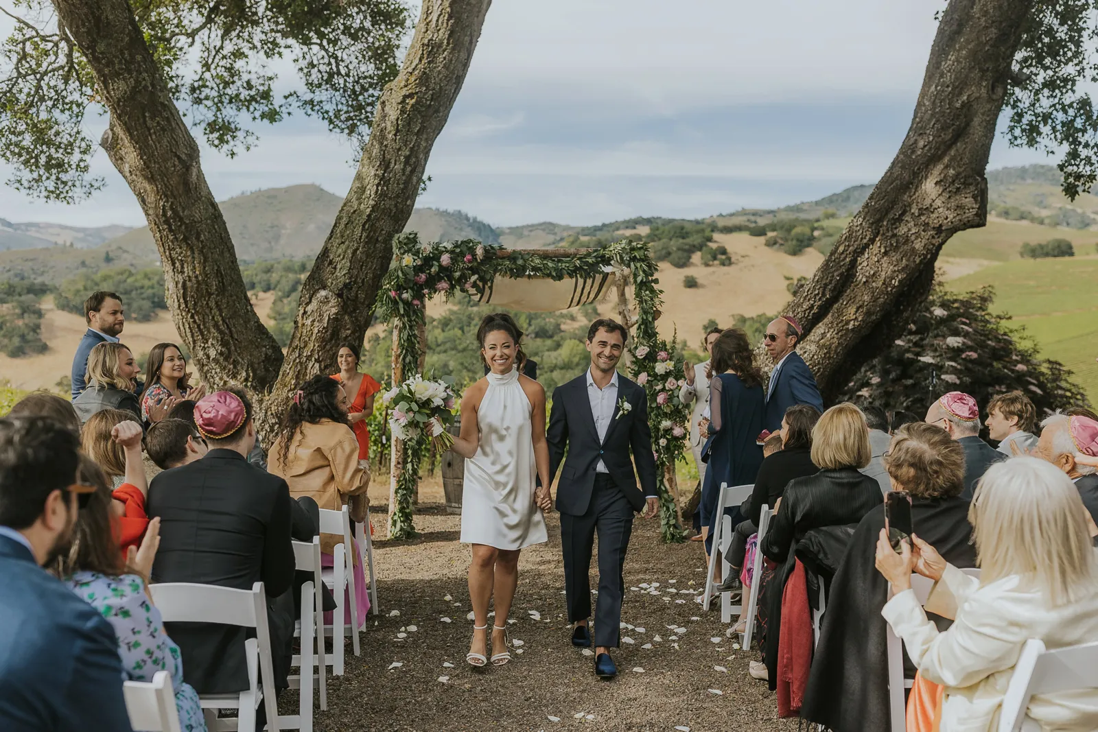 We met at work in 2014, became close friends, and in 2016 at the BottleRock festival Stevie Wonder decided to play a riff on “I Want to Hold Your Hand” asking everyone to hold hands. We couldn’t disobey one of our icons, and we’ve been together ever since. In 2021, while at a swimming hole on the Tuolumne River in Yosemite with some of our favorite people, we looked at each other and said “Should this be our engagement?”. Our planning for the wedding was always based around that special summertime Sonoma-at-dusk vibe. We pulled it off with incredible soul music, family-style seasonal gems for dinner, a gelato cart, wine from Daniella’s dad’s winery, glam and attire that made us feel like “us”, and minimal peonies-only florals to emphasize being in the stunning vineyard.