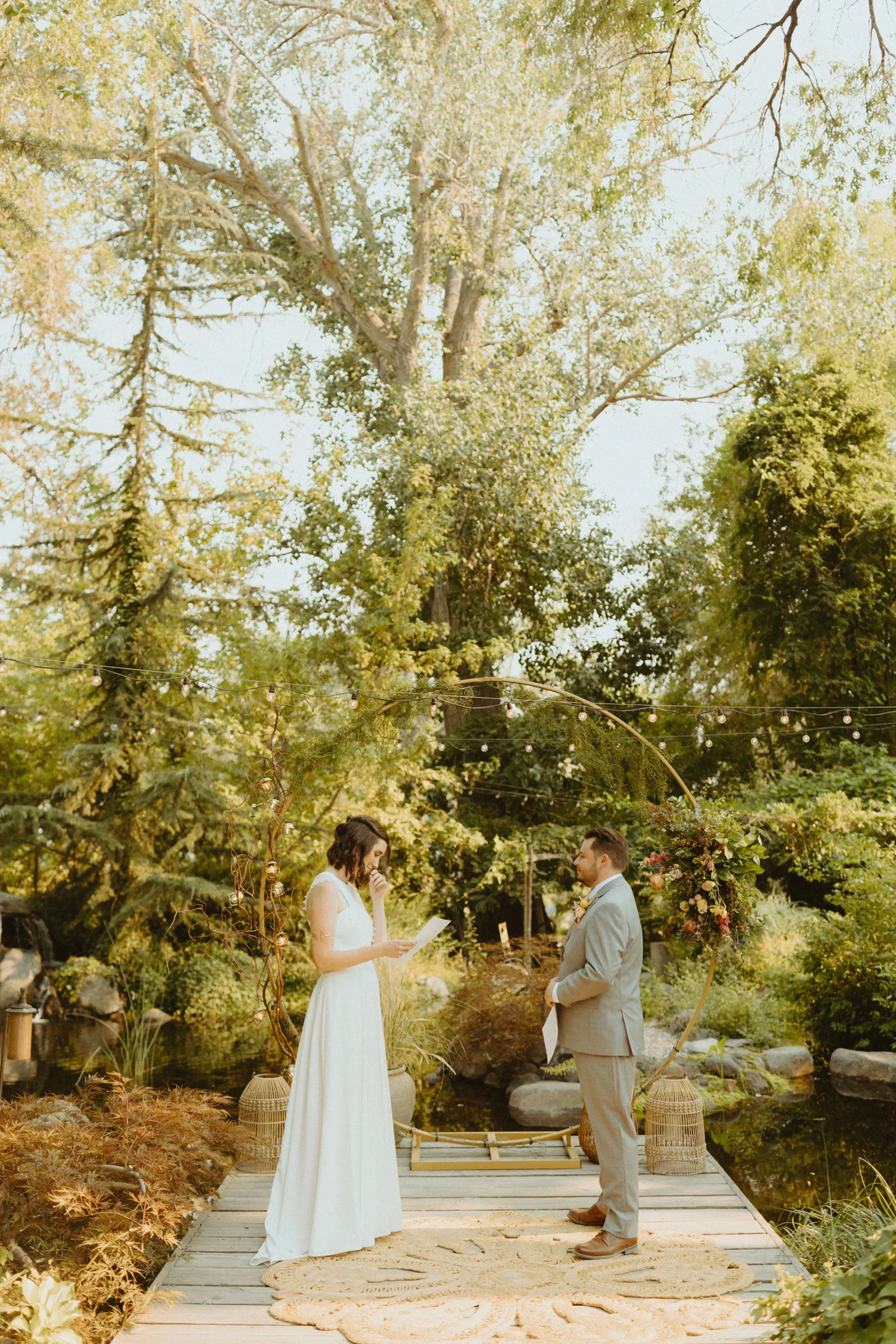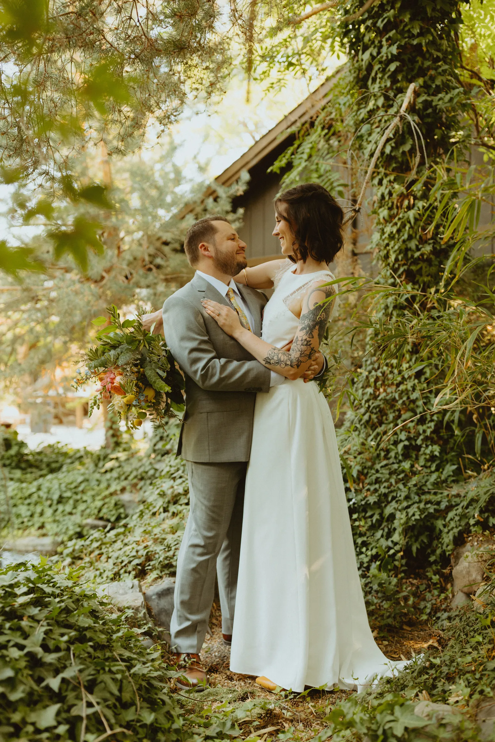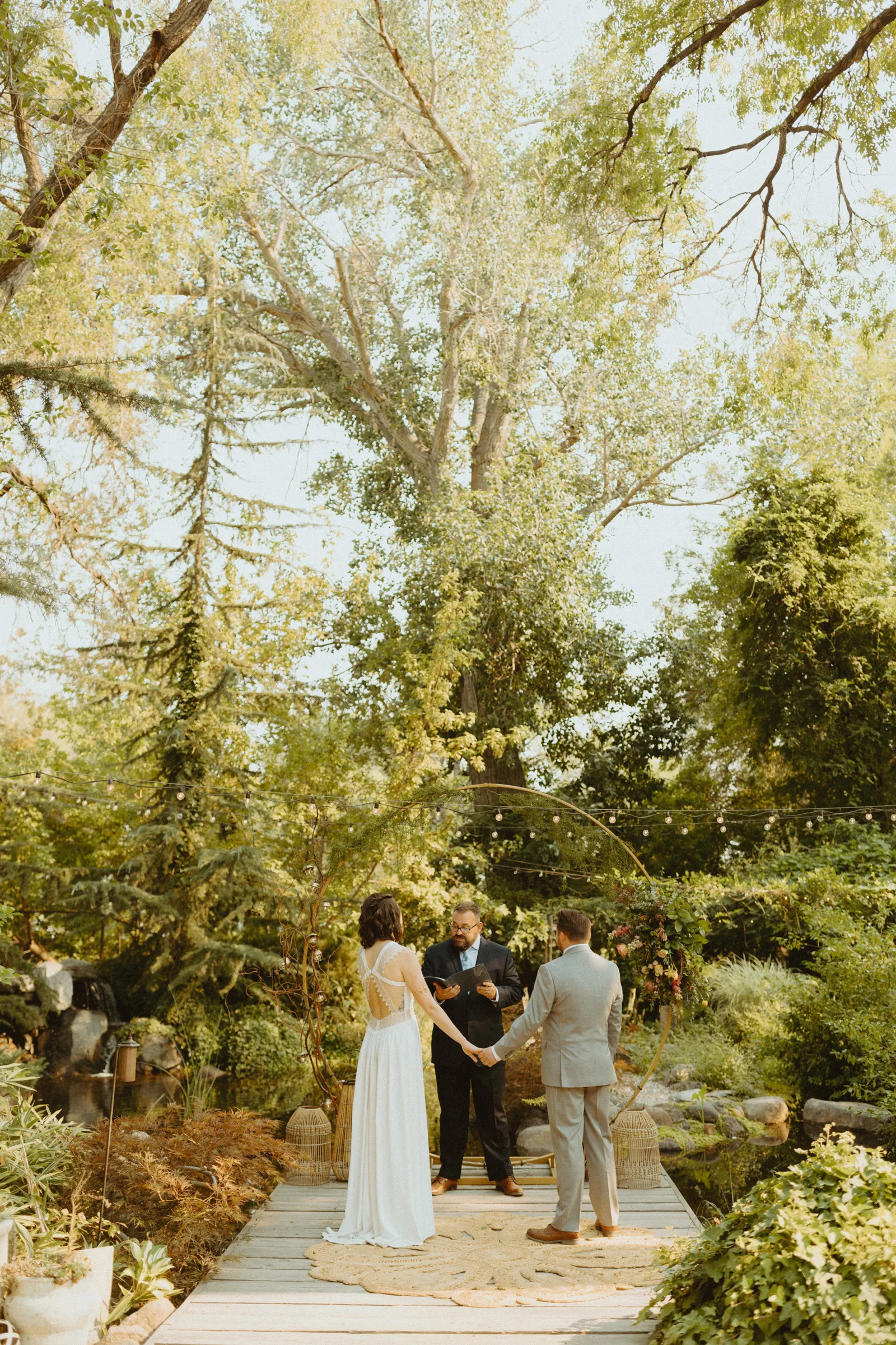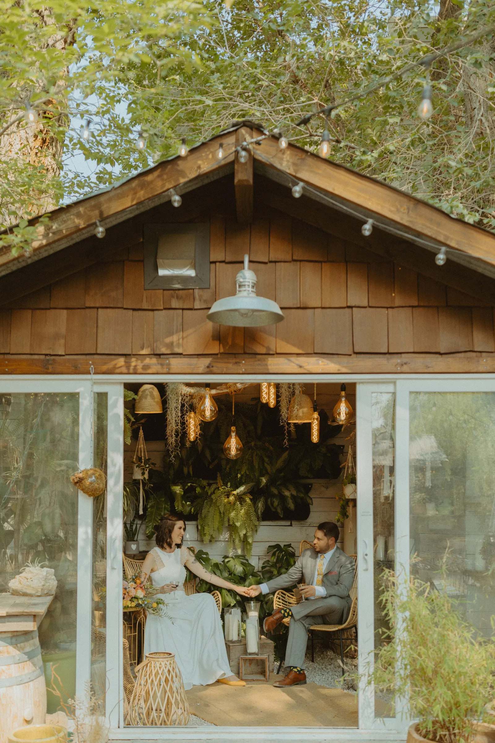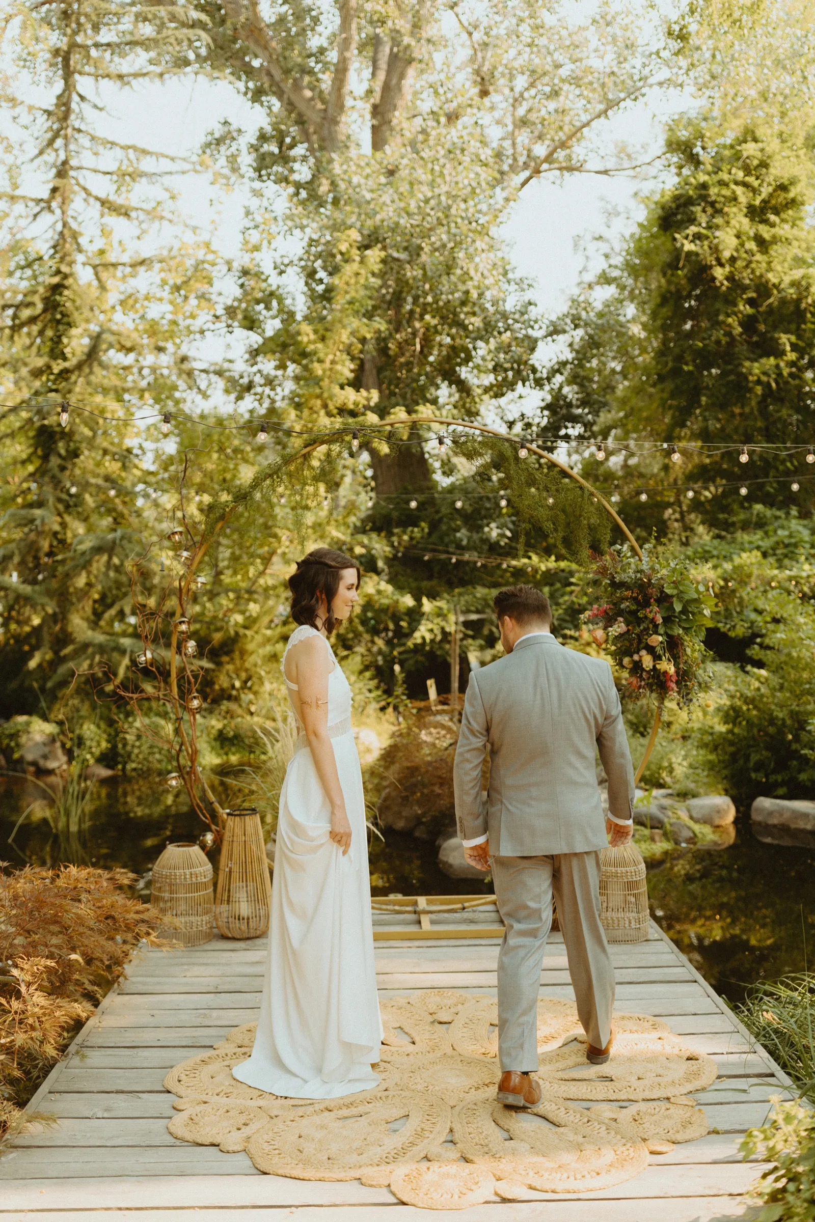 We met at the University of Nevada, Reno, where we both studied music and played the saxophone. After graduation, we moved to Las Vegas, N.V. We love hiking at Red Rock Canyon, so it was the perfect place for Mark to propose in May, 2020. We hiked one of our favorite trails, and on our way back, Mark got down on one knee and asked me to marry him! From the beginning, we knew that we wanted an intimate wedding, and not just because of the COVID-19 pandemic and lock-down at the time. We also knew that we wanted to have our special day in Reno so that our friends from school could attend. We researched ‘elopement’ and came across The Hytch. Jenny used to visit Sierra Water Gardens when it was an outdoor plant store, so when we saw that it was now a max 50-person wedding venue, we knew it was perfect.