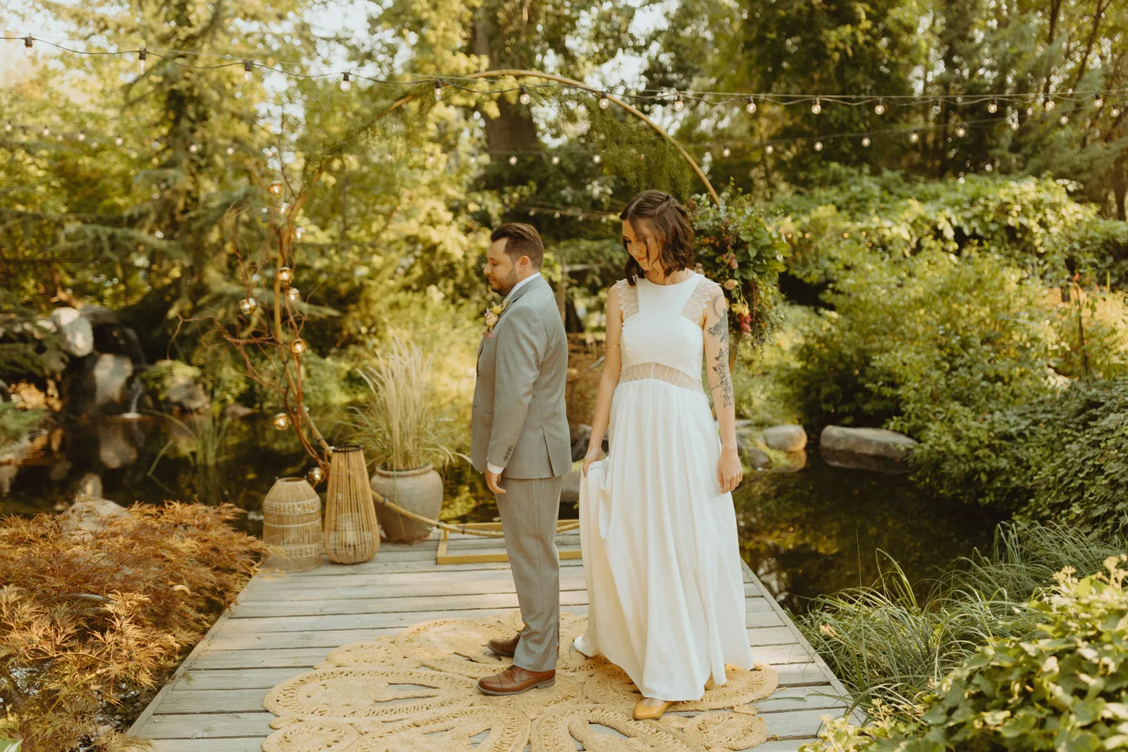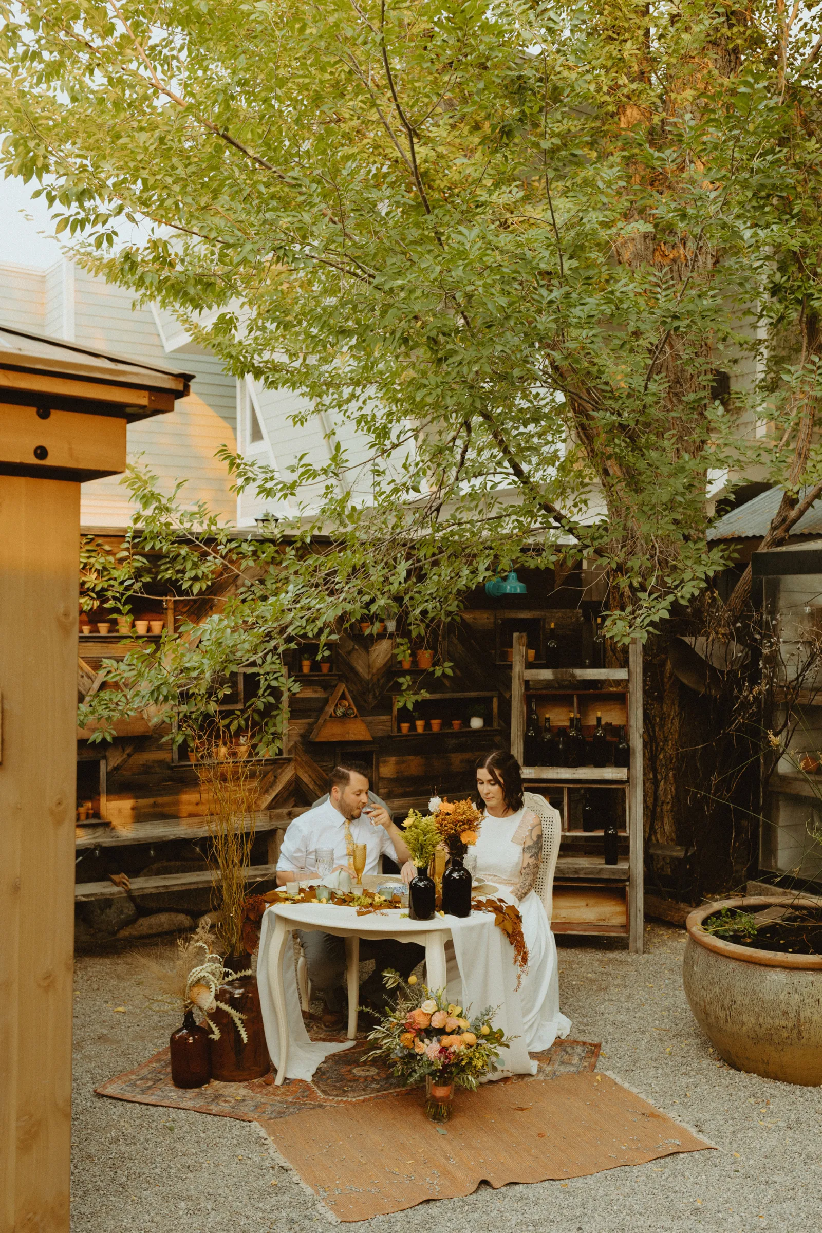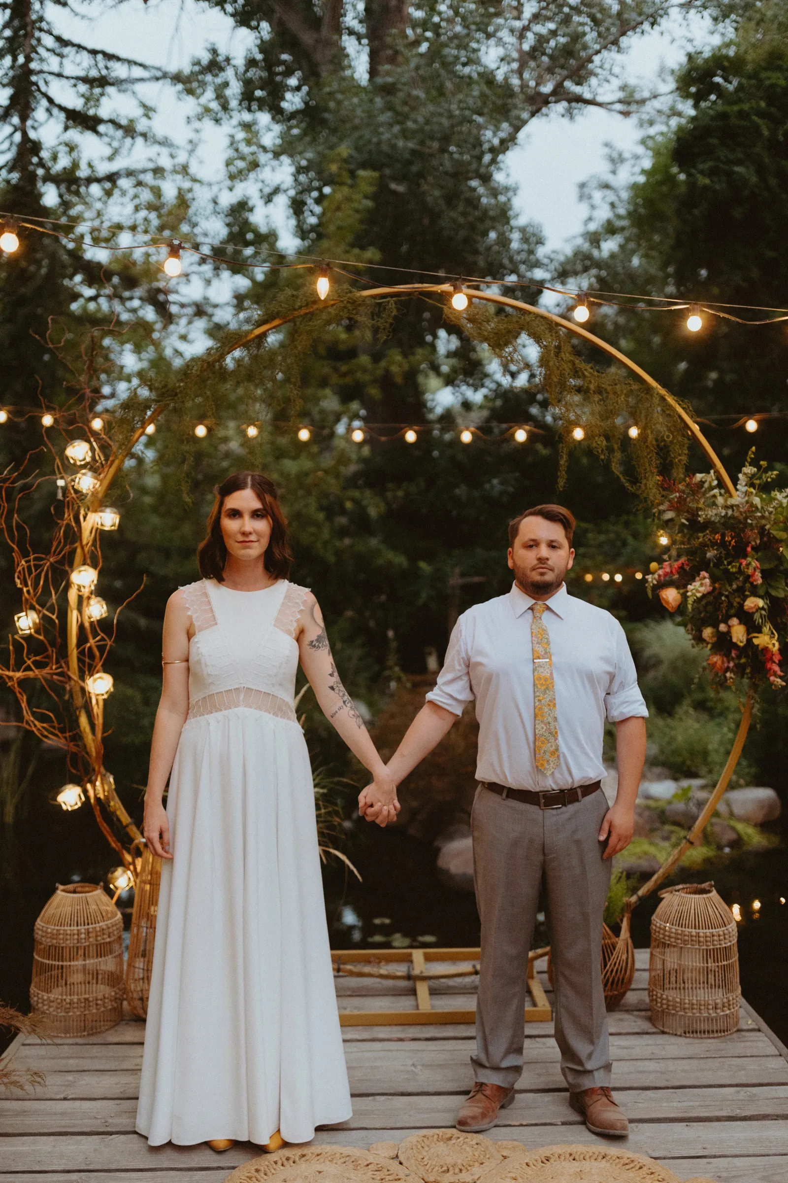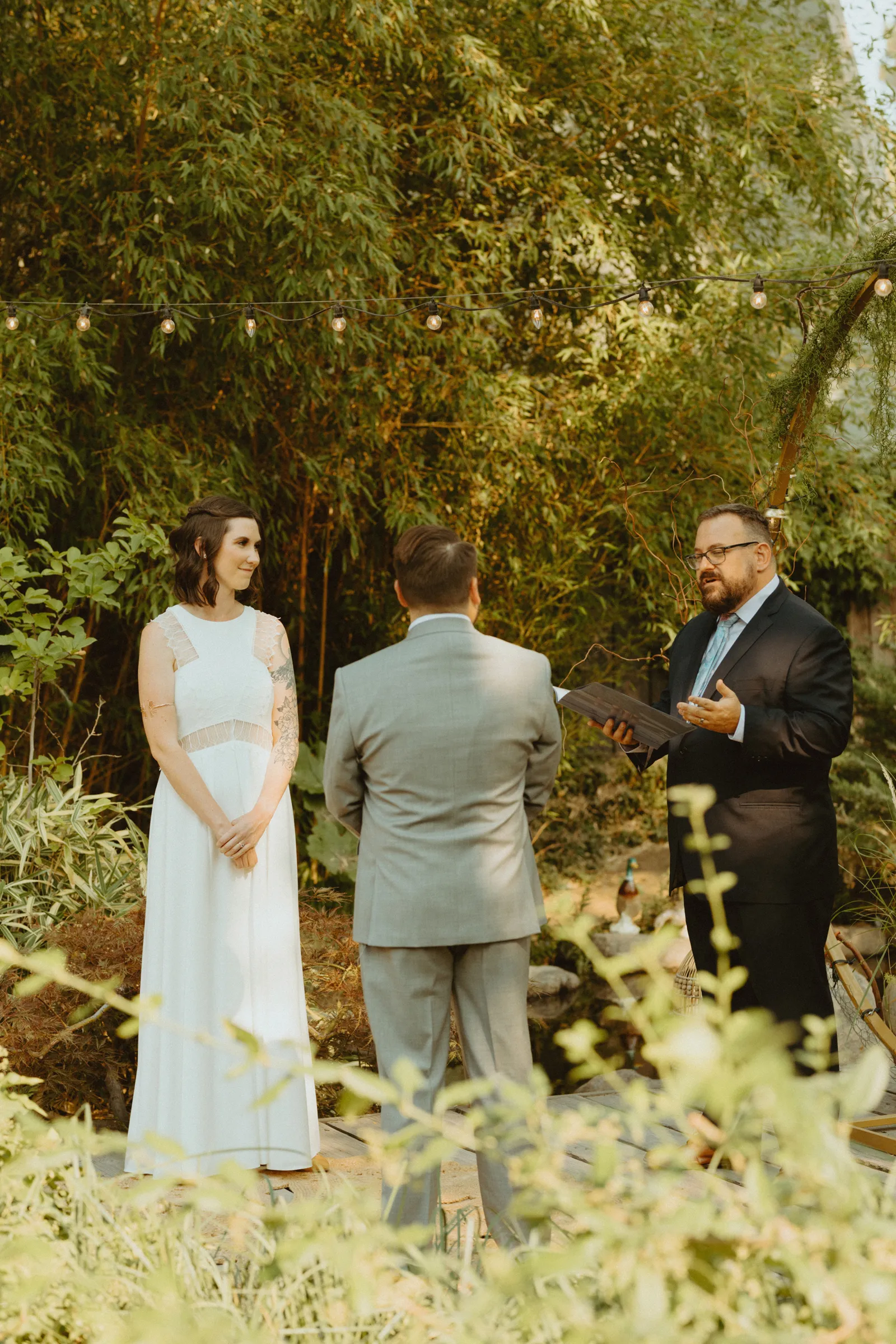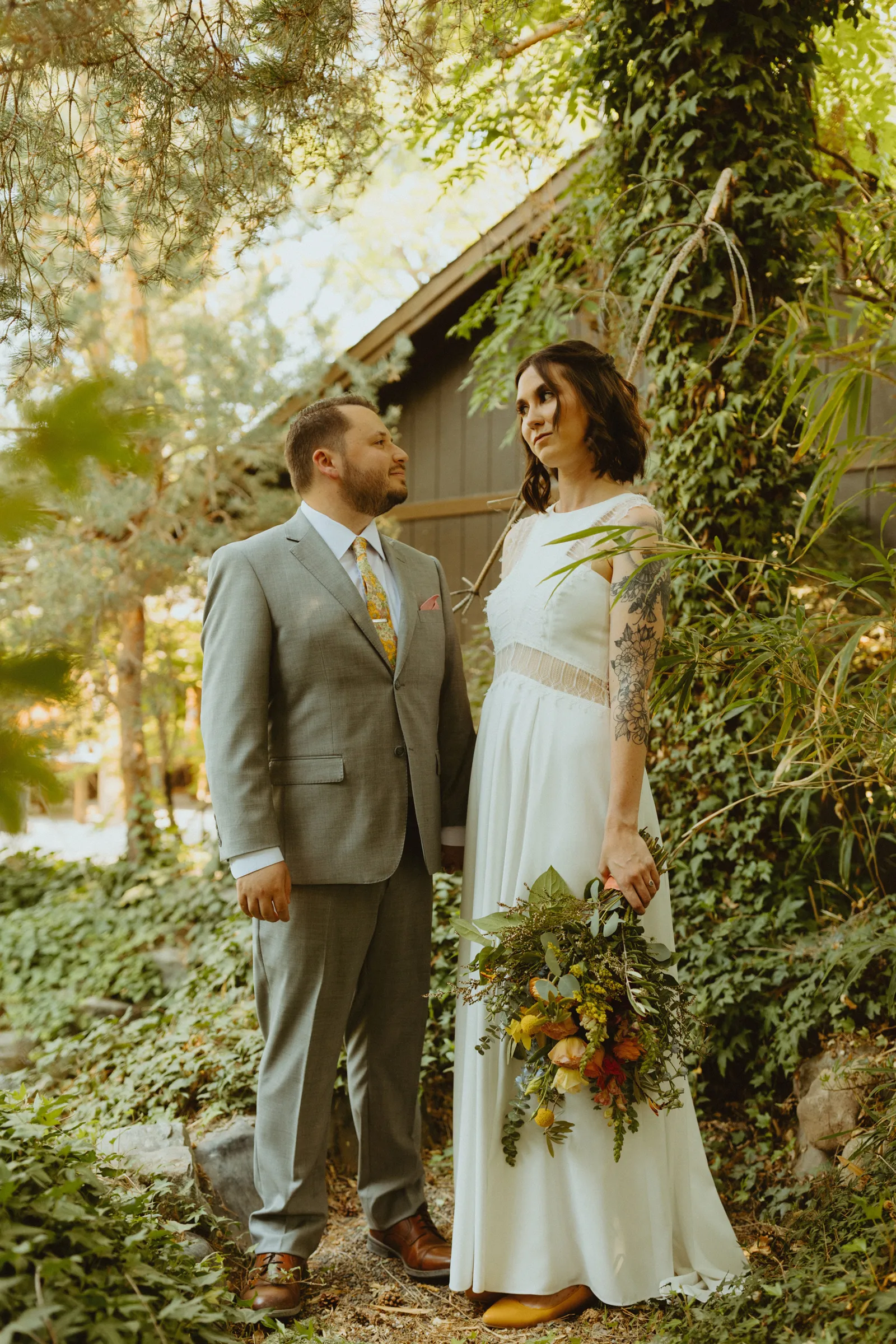 We met at the University of Nevada, Reno, where we both studied music and played the saxophone. After graduation, we moved to Las Vegas, N.V. We love hiking at Red Rock Canyon, so it was the perfect place for Mark to propose in May, 2020. We hiked one of our favorite trails, and on our way back, Mark got down on one knee and asked me to marry him! From the beginning, we knew that we wanted an intimate wedding, and not just because of the COVID-19 pandemic and lock-down at the time. We also knew that we wanted to have our special day in Reno so that our friends from school could attend. We researched ‘elopement’ and came across The Hytch. Jenny used to visit Sierra Water Gardens when it was an outdoor plant store, so when we saw that it was now a max 50-person wedding venue, we knew it was perfect.