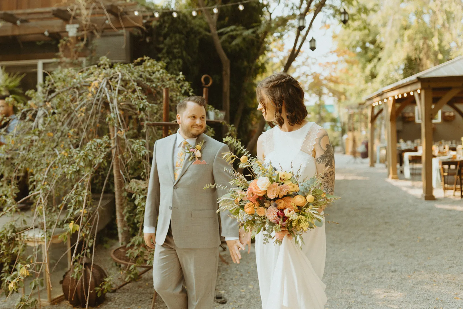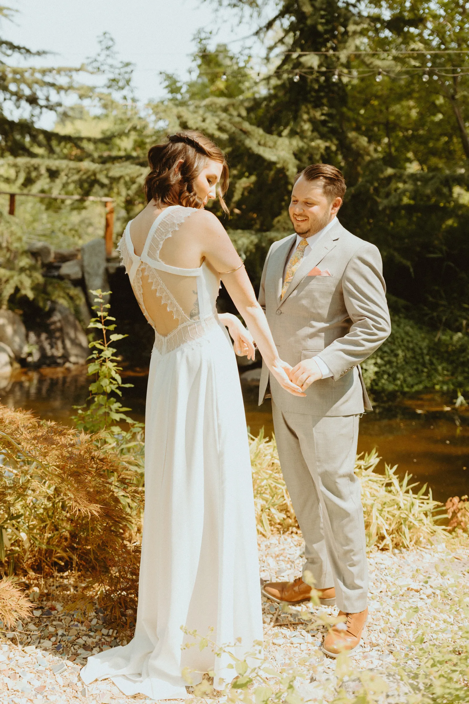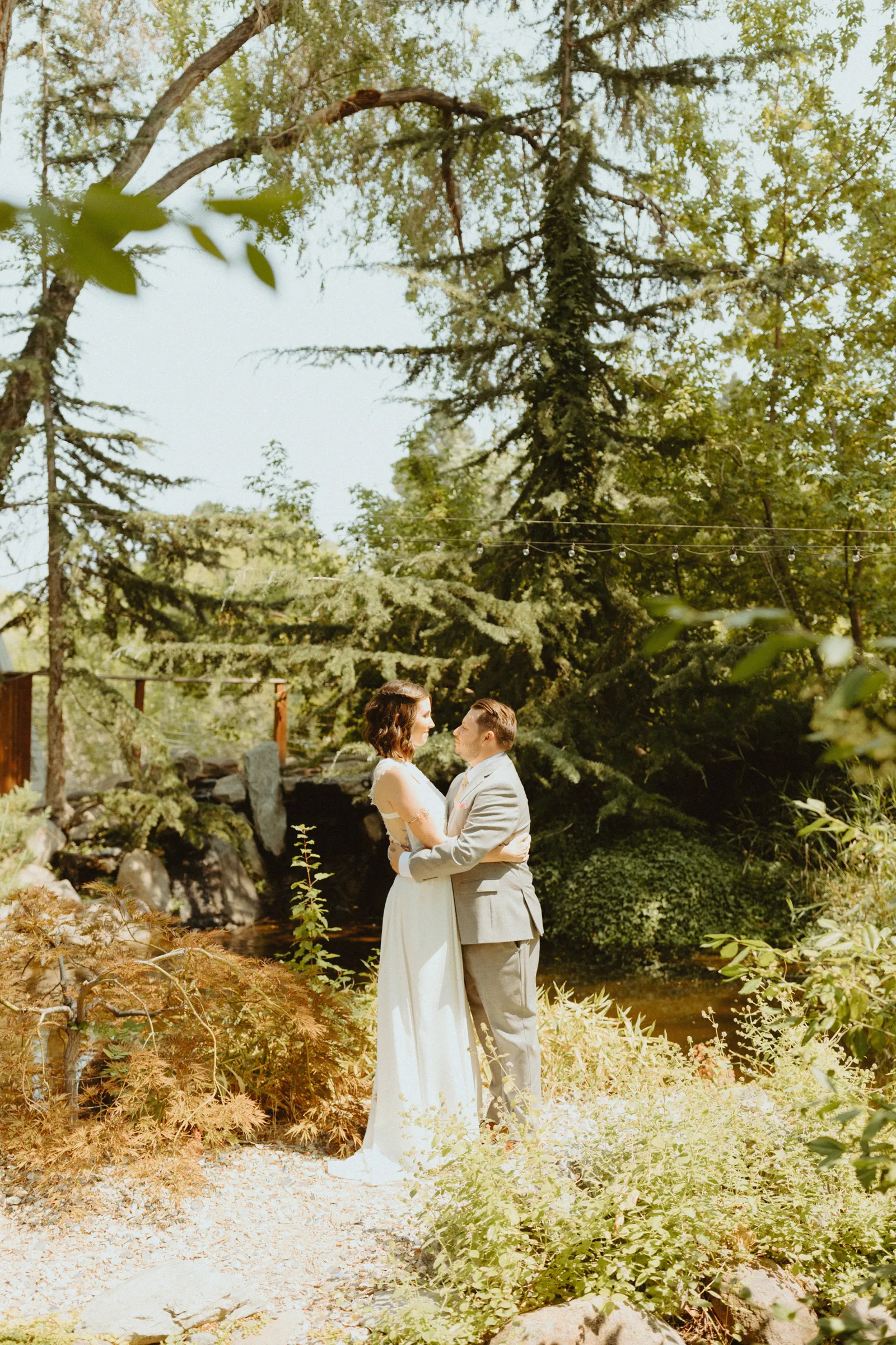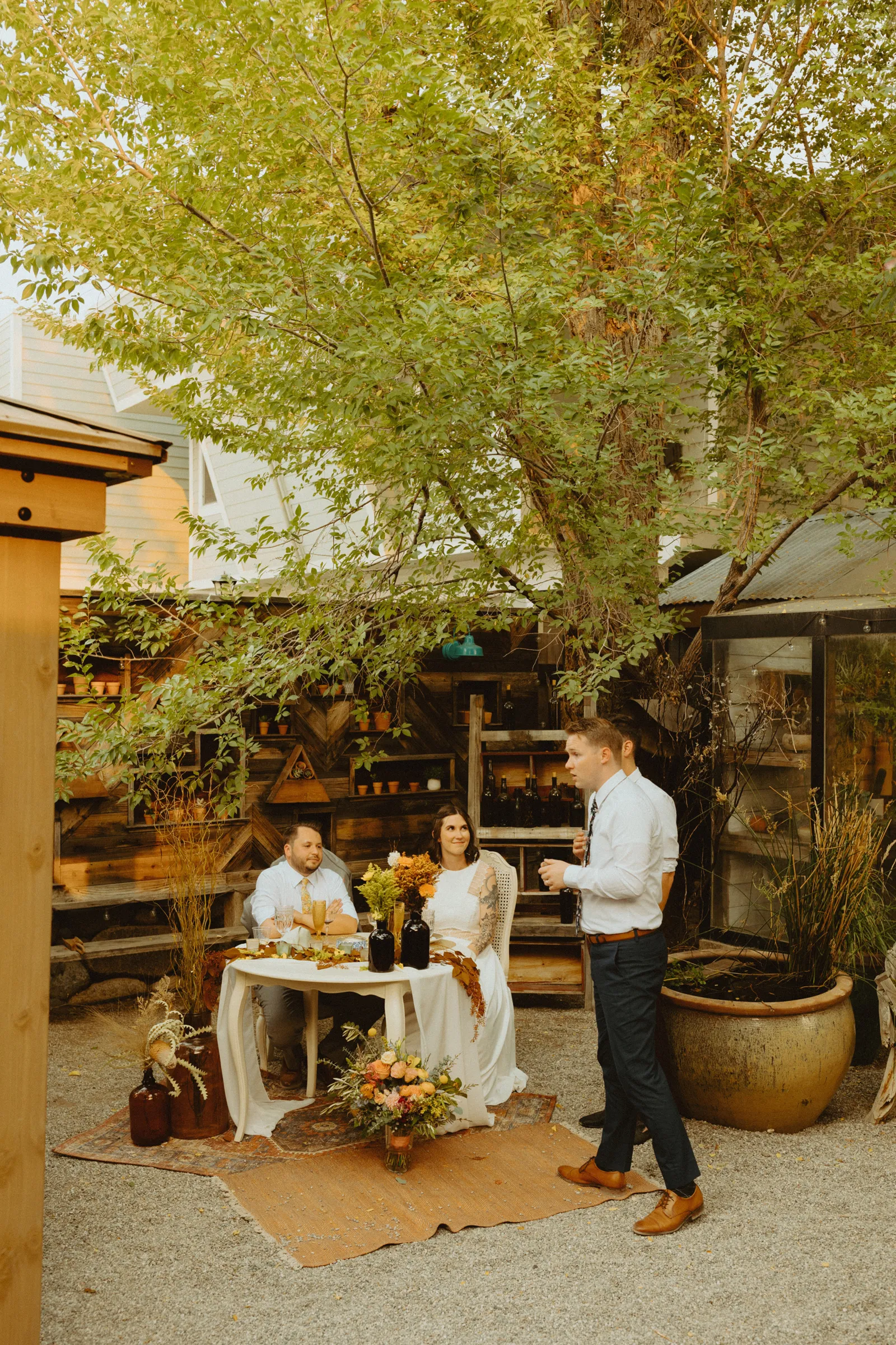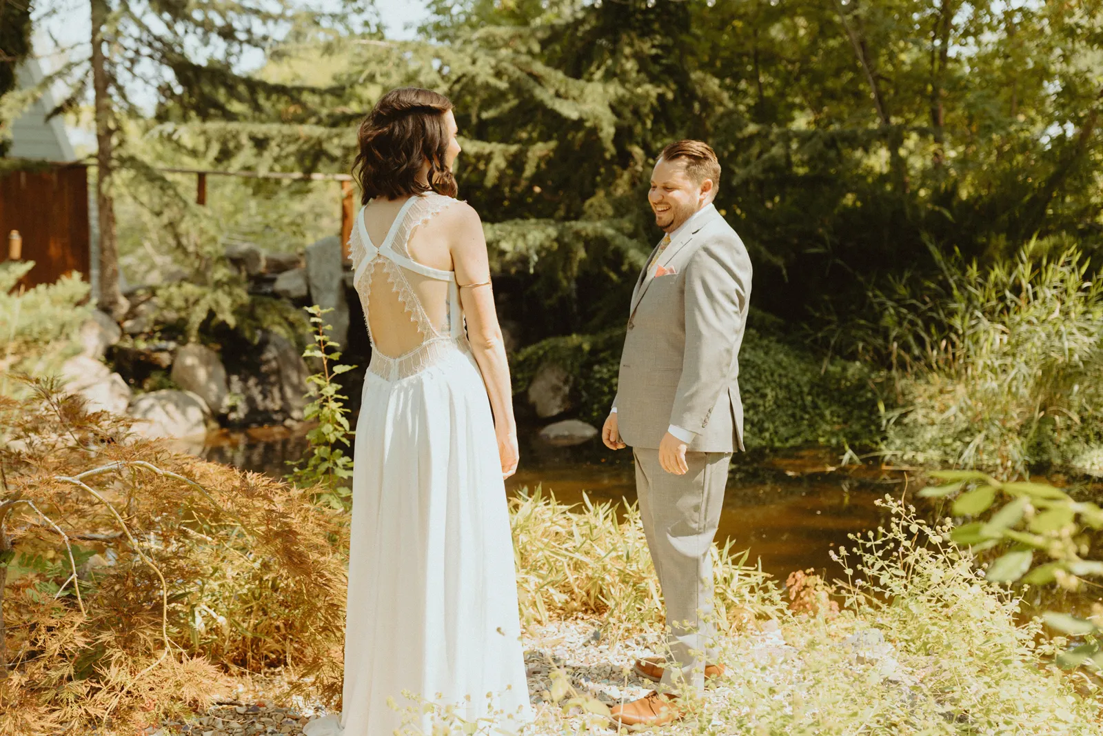 We met at the University of Nevada, Reno, where we both studied music and played the saxophone. After graduation, we moved to Las Vegas, N.V. We love hiking at Red Rock Canyon, so it was the perfect place for Mark to propose in May, 2020. We hiked one of our favorite trails, and on our way back, Mark got down on one knee and asked me to marry him! From the beginning, we knew that we wanted an intimate wedding, and not just because of the COVID-19 pandemic and lock-down at the time. We also knew that we wanted to have our special day in Reno so that our friends from school could attend. We researched ‘elopement’ and came across The Hytch. Jenny used to visit Sierra Water Gardens when it was an outdoor plant store, so when we saw that it was now a max 50-person wedding venue, we knew it was perfect.