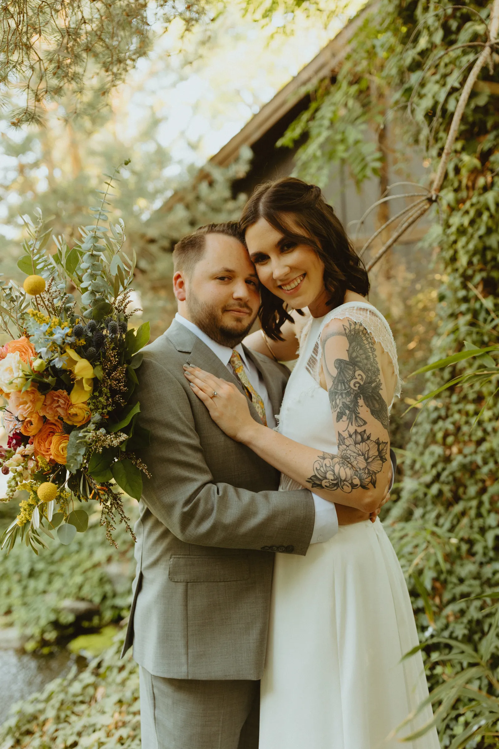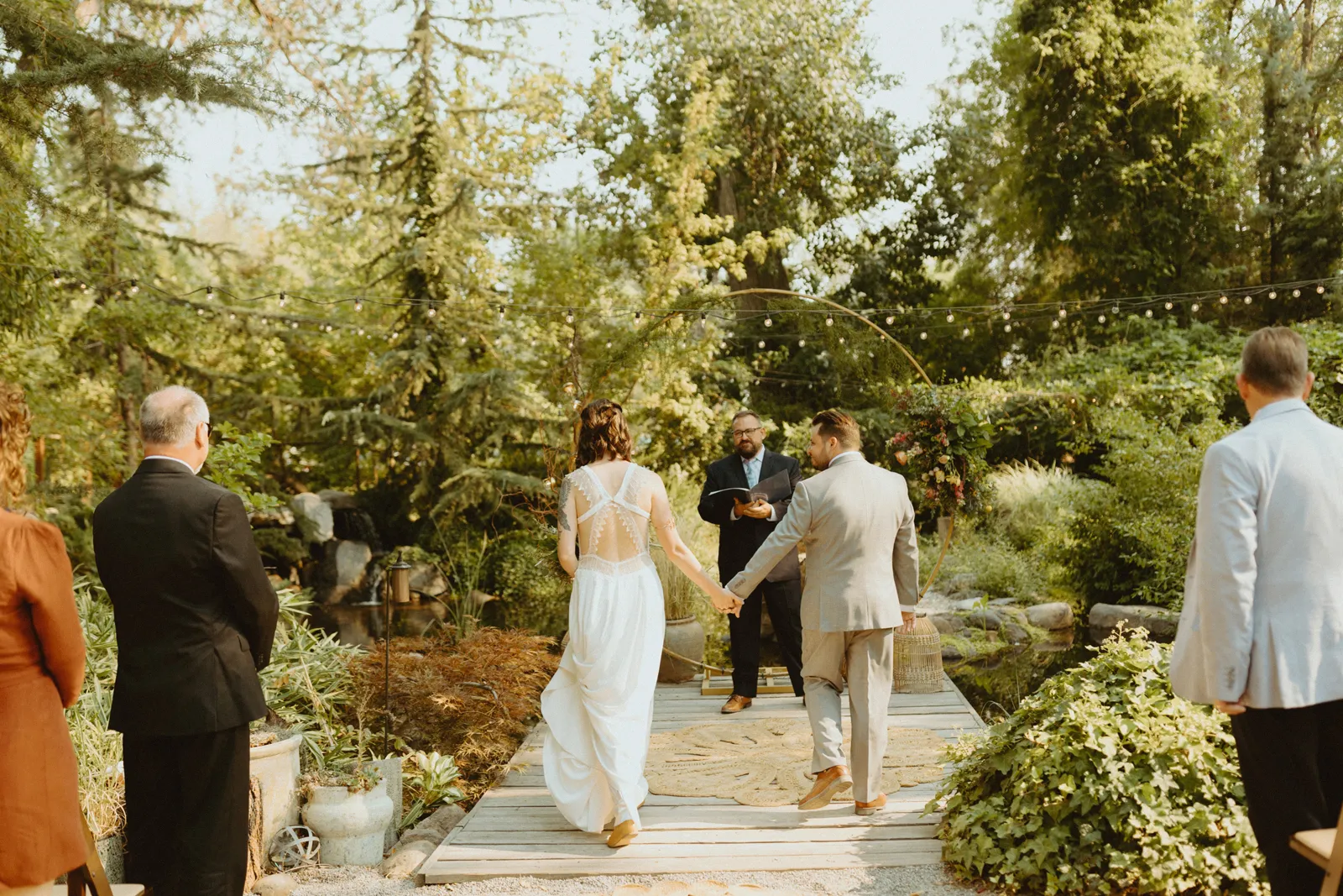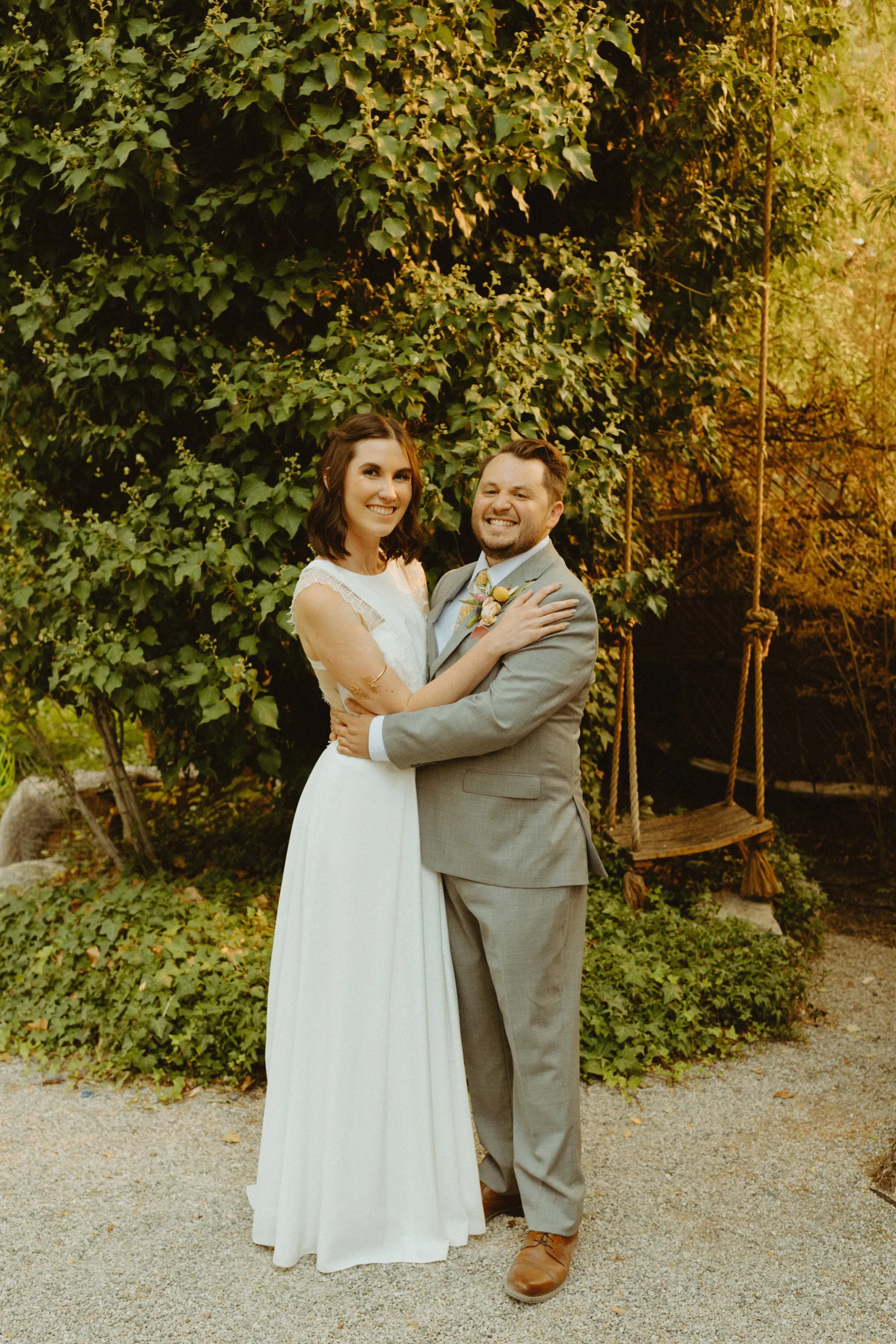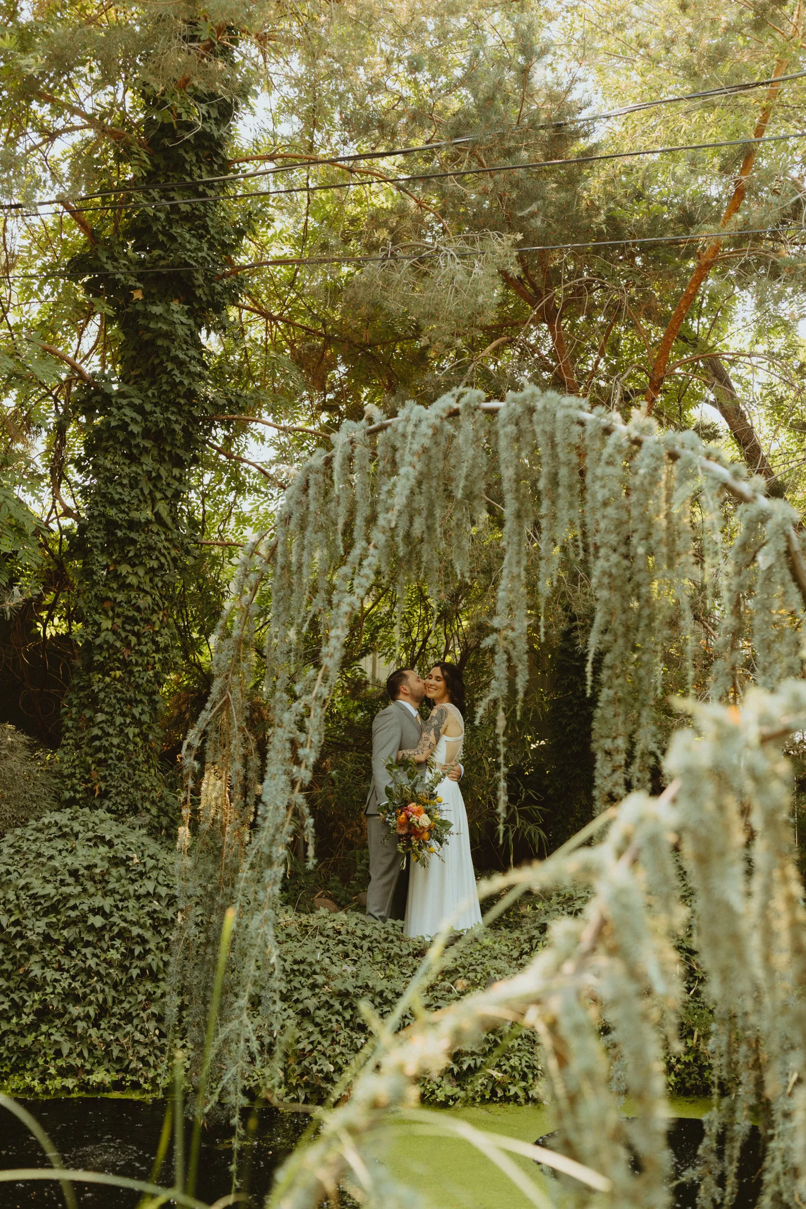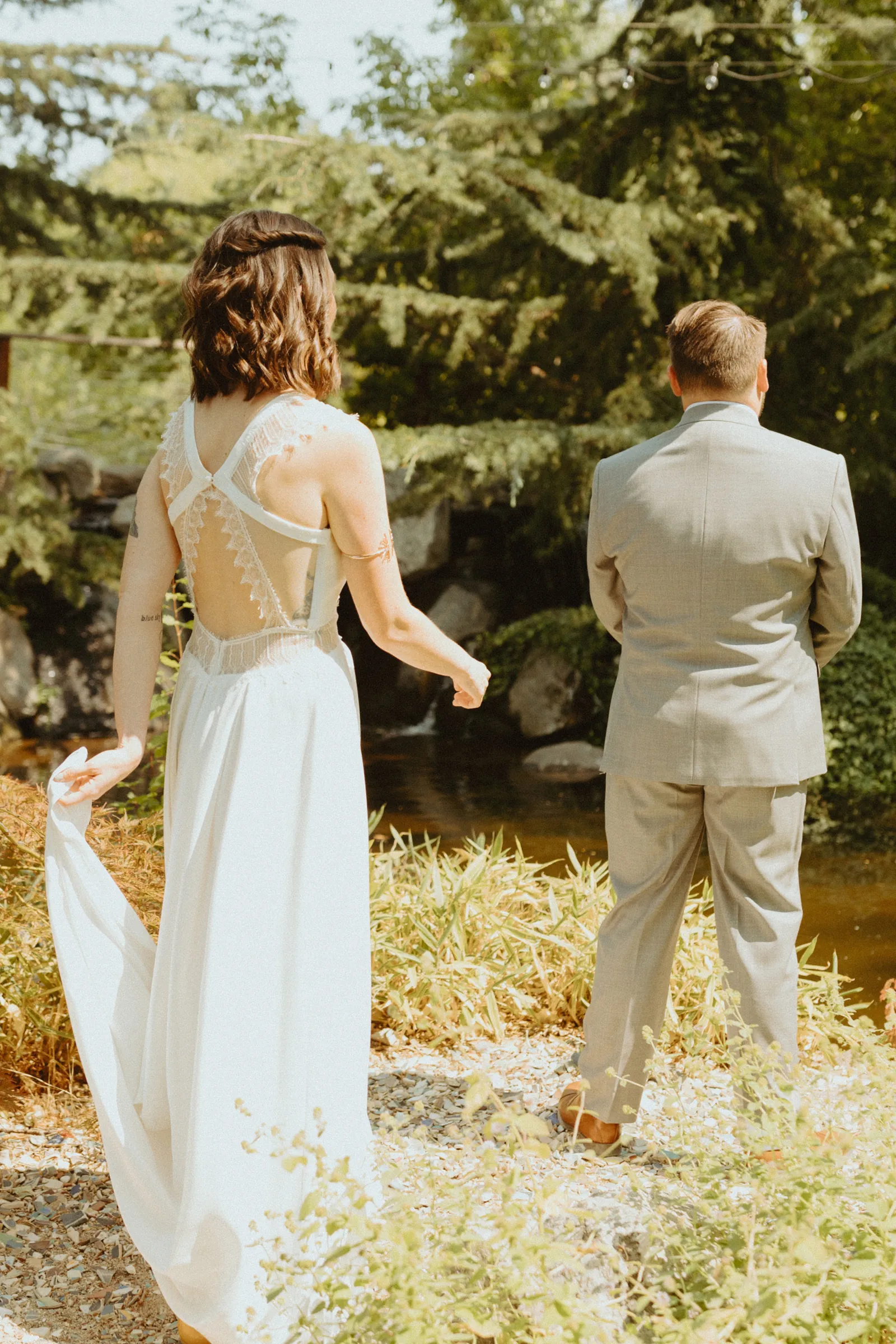 We met at the University of Nevada, Reno, where we both studied music and played the saxophone. After graduation, we moved to Las Vegas, N.V. We love hiking at Red Rock Canyon, so it was the perfect place for Mark to propose in May, 2020. We hiked one of our favorite trails, and on our way back, Mark got down on one knee and asked me to marry him! From the beginning, we knew that we wanted an intimate wedding, and not just because of the COVID-19 pandemic and lock-down at the time. We also knew that we wanted to have our special day in Reno so that our friends from school could attend. We researched ‘elopement’ and came across The Hytch. Jenny used to visit Sierra Water Gardens when it was an outdoor plant store, so when we saw that it was now a max 50-person wedding venue, we knew it was perfect.