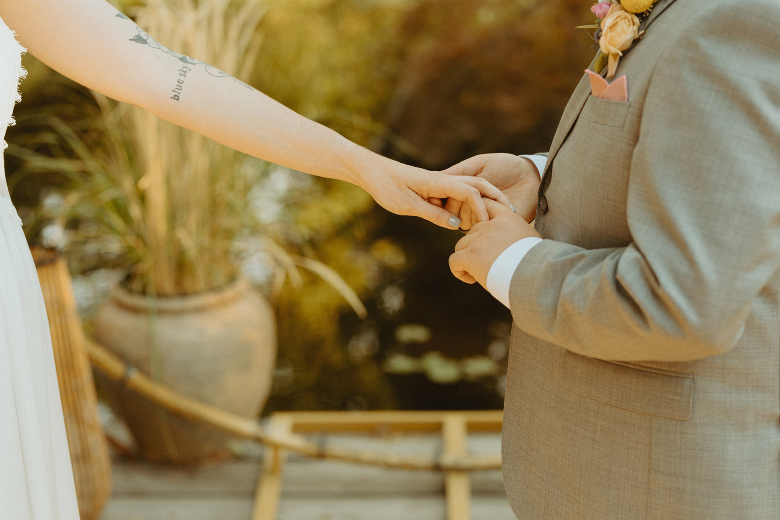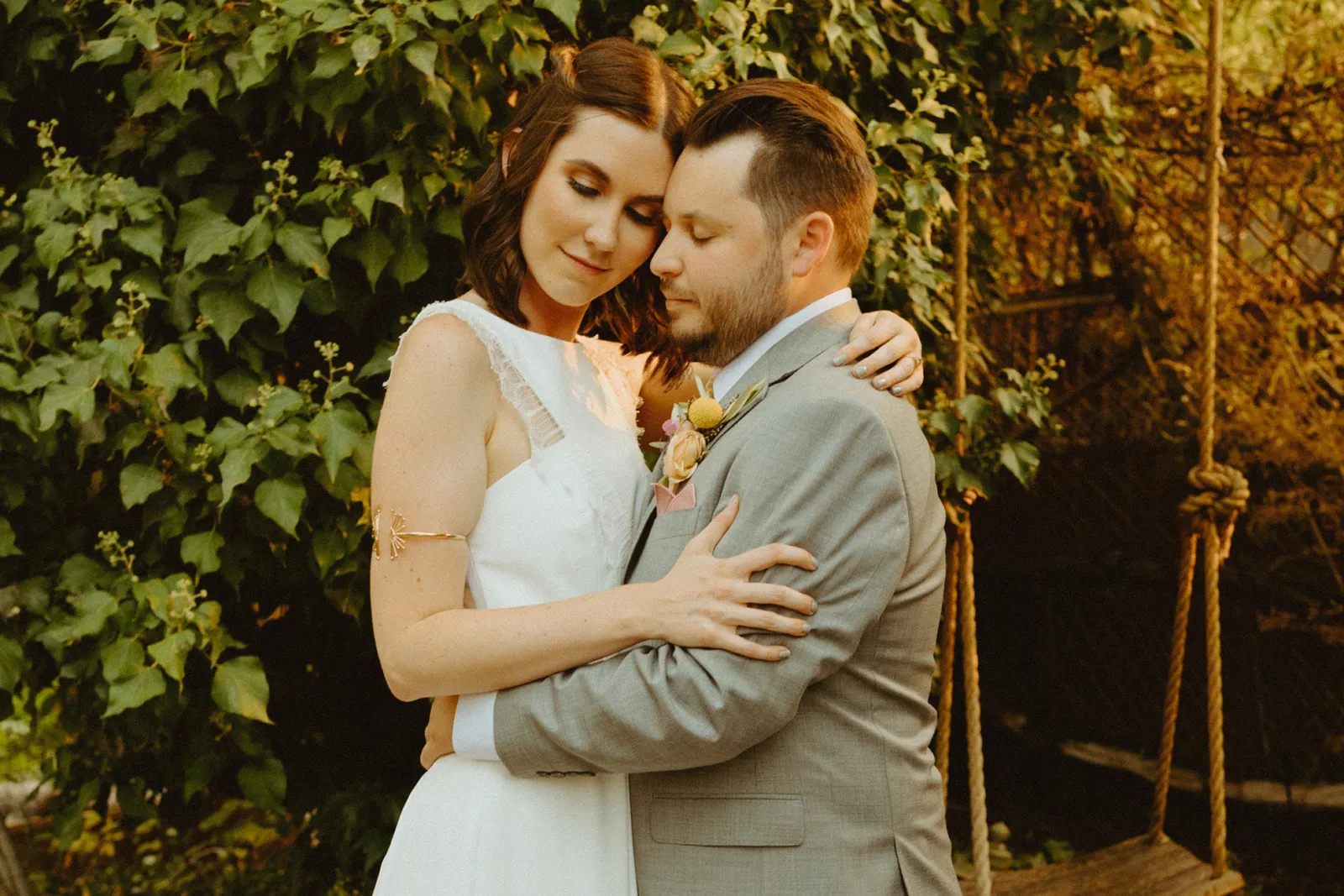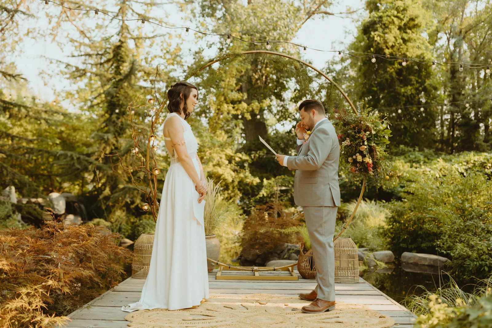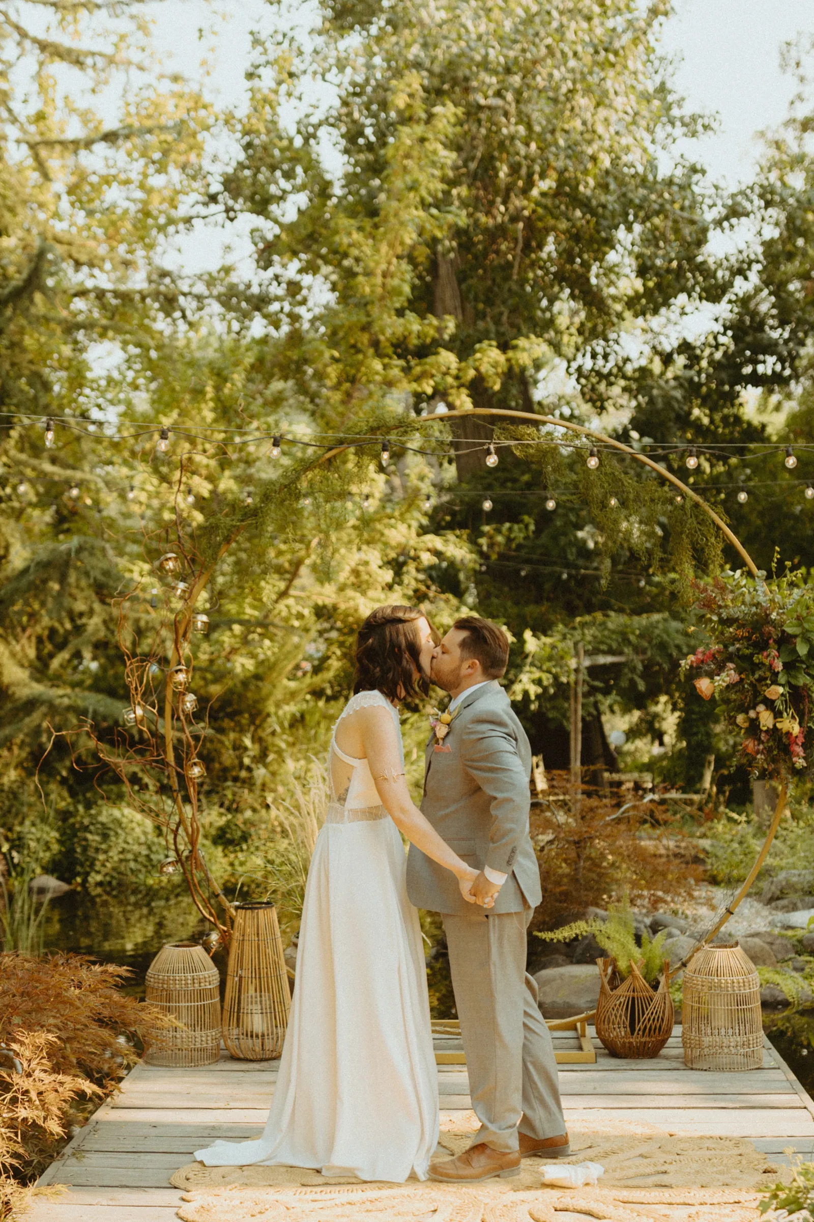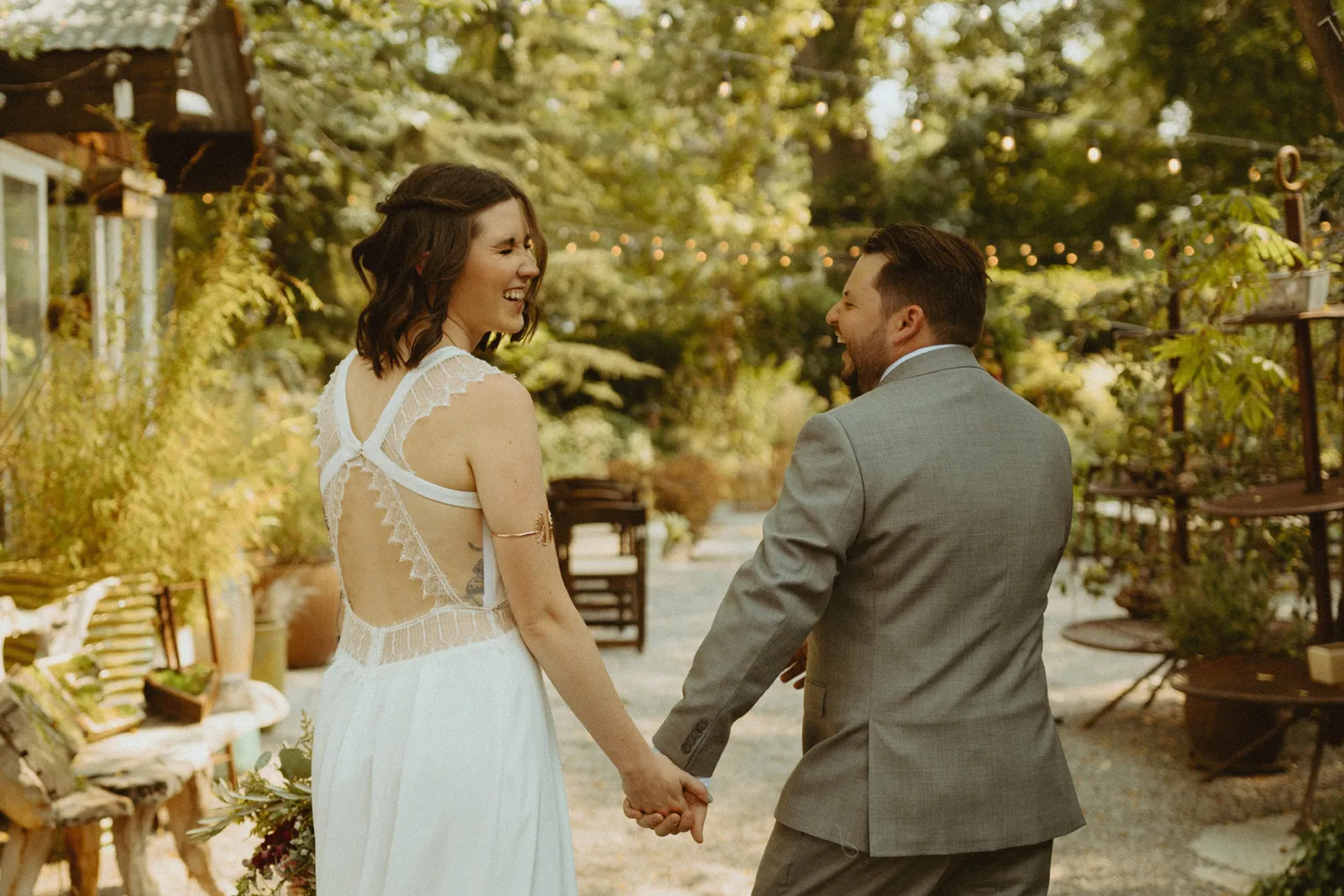 We met at the University of Nevada, Reno, where we both studied music and played the saxophone. After graduation, we moved to Las Vegas, N.V. We love hiking at Red Rock Canyon, so it was the perfect place for Mark to propose in May, 2020. We hiked one of our favorite trails, and on our way back, Mark got down on one knee and asked me to marry him! From the beginning, we knew that we wanted an intimate wedding, and not just because of the COVID-19 pandemic and lock-down at the time. We also knew that we wanted to have our special day in Reno so that our friends from school could attend. We researched ‘elopement’ and came across The Hytch. Jenny used to visit Sierra Water Gardens when it was an outdoor plant store, so when we saw that it was now a max 50-person wedding venue, we knew it was perfect.