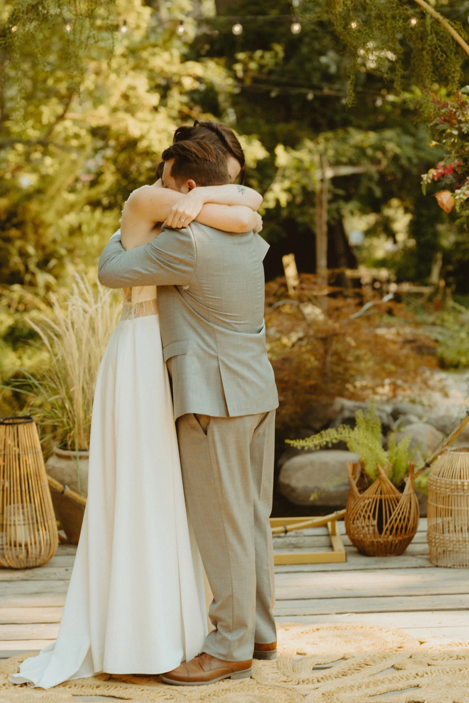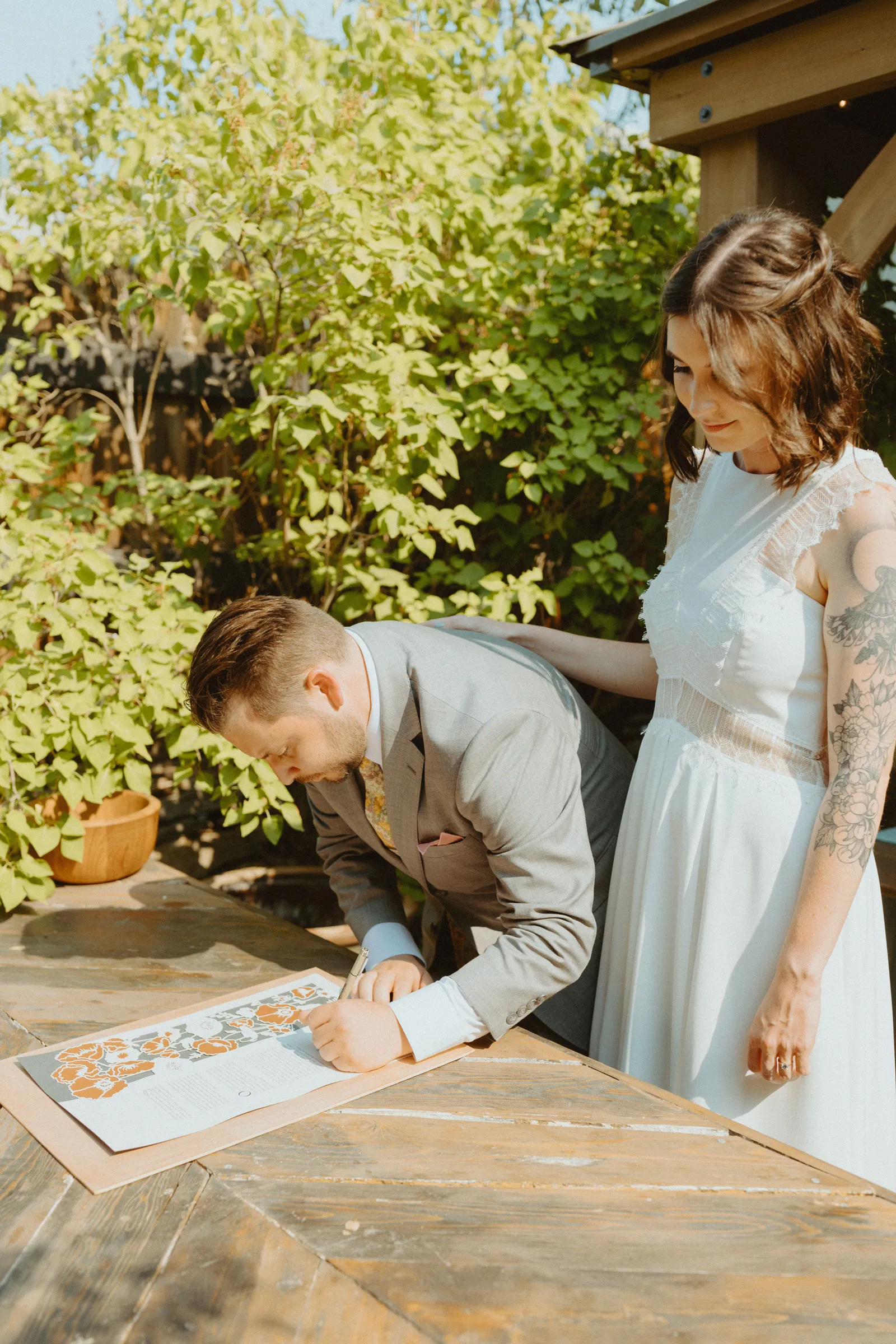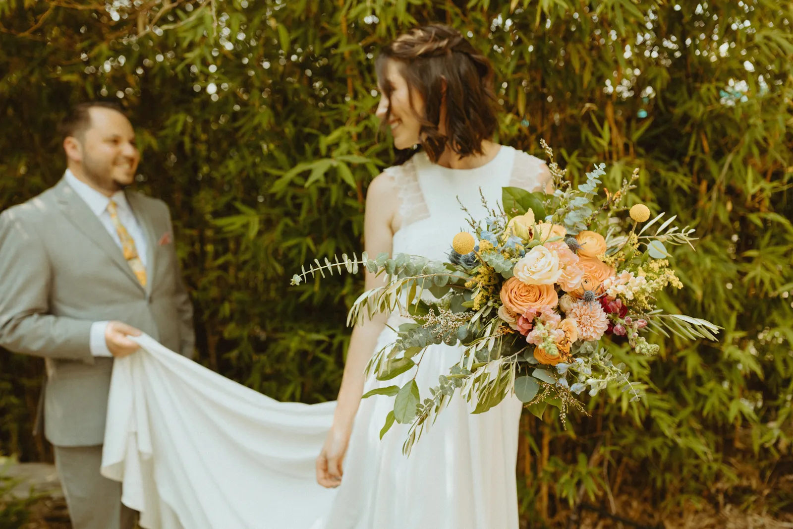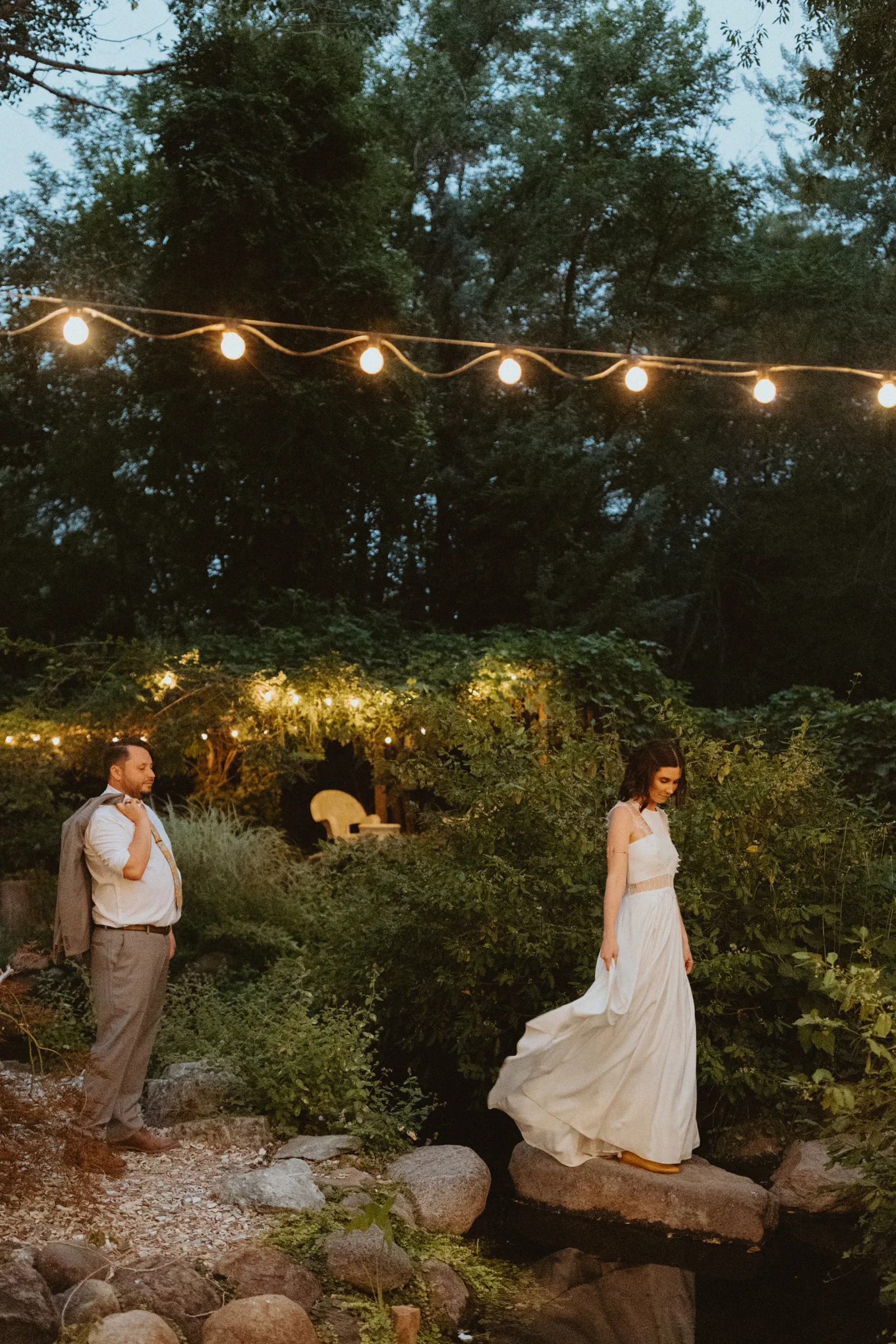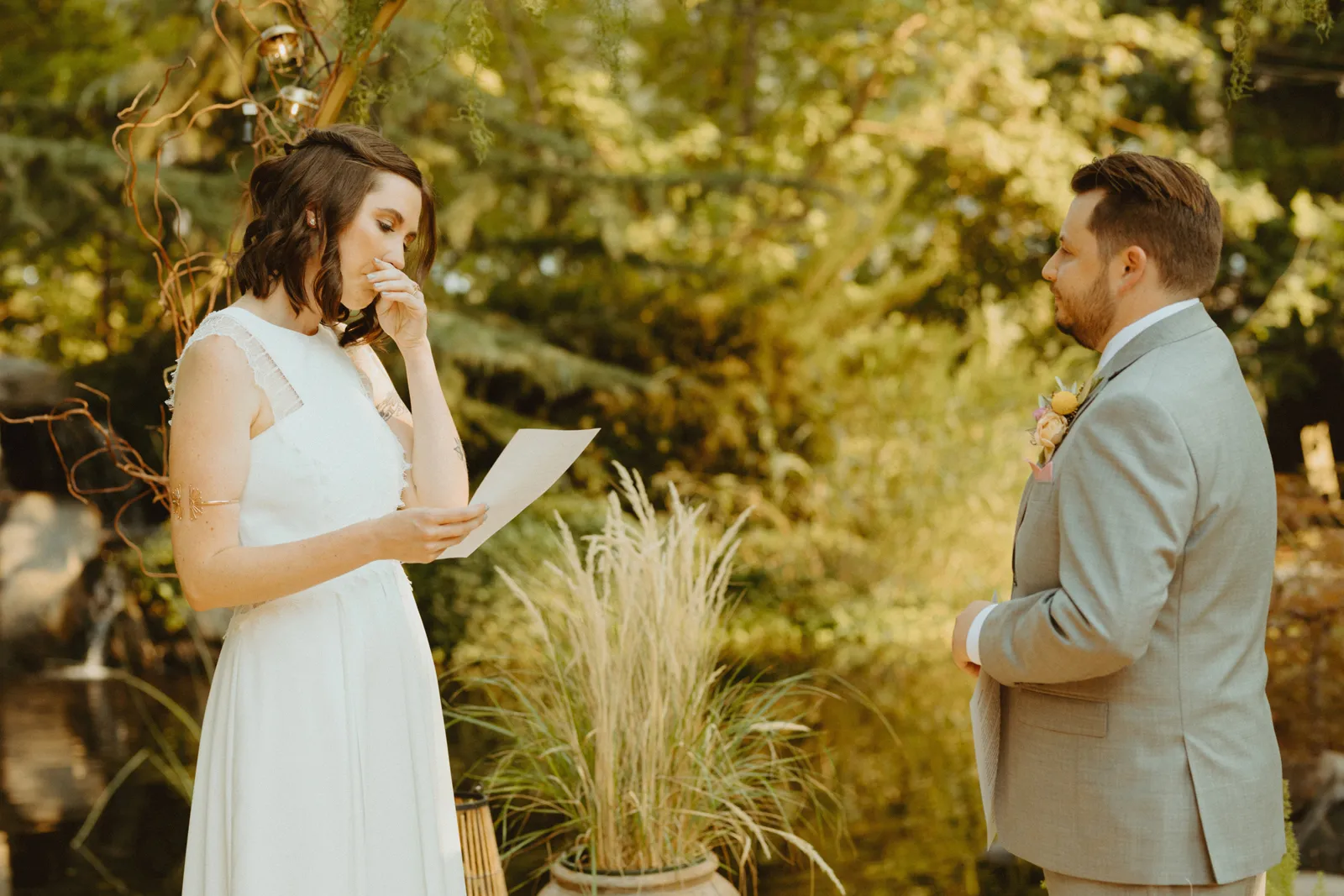We met at the University of Nevada, Reno, where we both studied music and played the saxophone. After graduation, we moved to Las Vegas, N.V. We love hiking at Red Rock Canyon, so it was the perfect place for Mark to propose in May, 2020. We hiked one of our favorite trails, and on our way back, Mark got down on one knee and asked me to marry him! From the beginning, we knew that we wanted an intimate wedding, and not just because of the COVID-19 pandemic and lock-down at the time. We also knew that we wanted to have our special day in Reno so that our friends from school could attend. We researched ‘elopement’ and came across The Hytch. Jenny used to visit Sierra Water Gardens when it was an outdoor plant store, so when we saw that it was now a max 50-person wedding venue, we knew it was perfect.