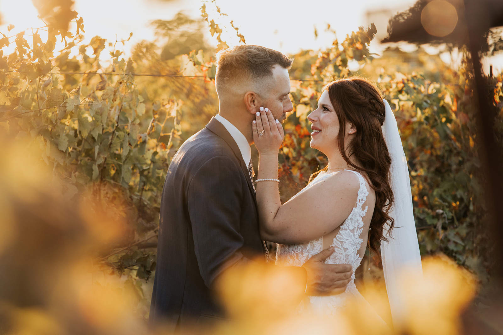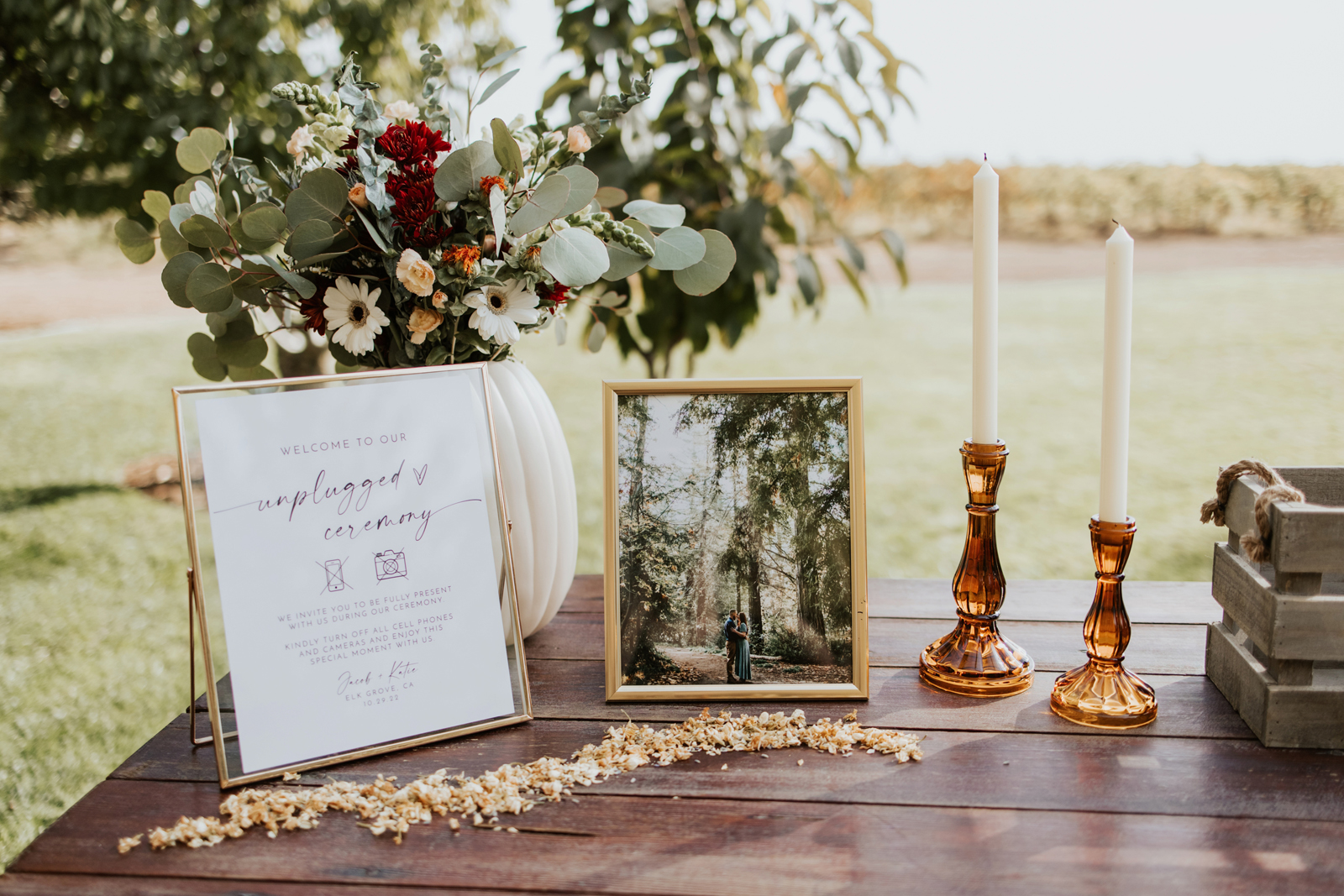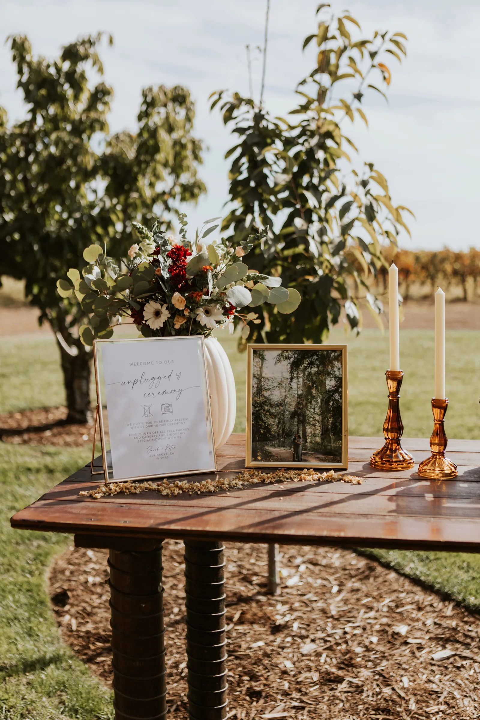 We casually knew each other in high school, but it was until almost a decade later when Jacob reached out to me about a dog I rescued. We went on our first date to Brix and Hops brewery, and the rest is history. Jacob proposed at Monkey Rock in Lake Tahoe after hiking to the top with our best friends and fur babies. We were engaged for about a year and a half because we wanted a fall wedding without feeling rushed.