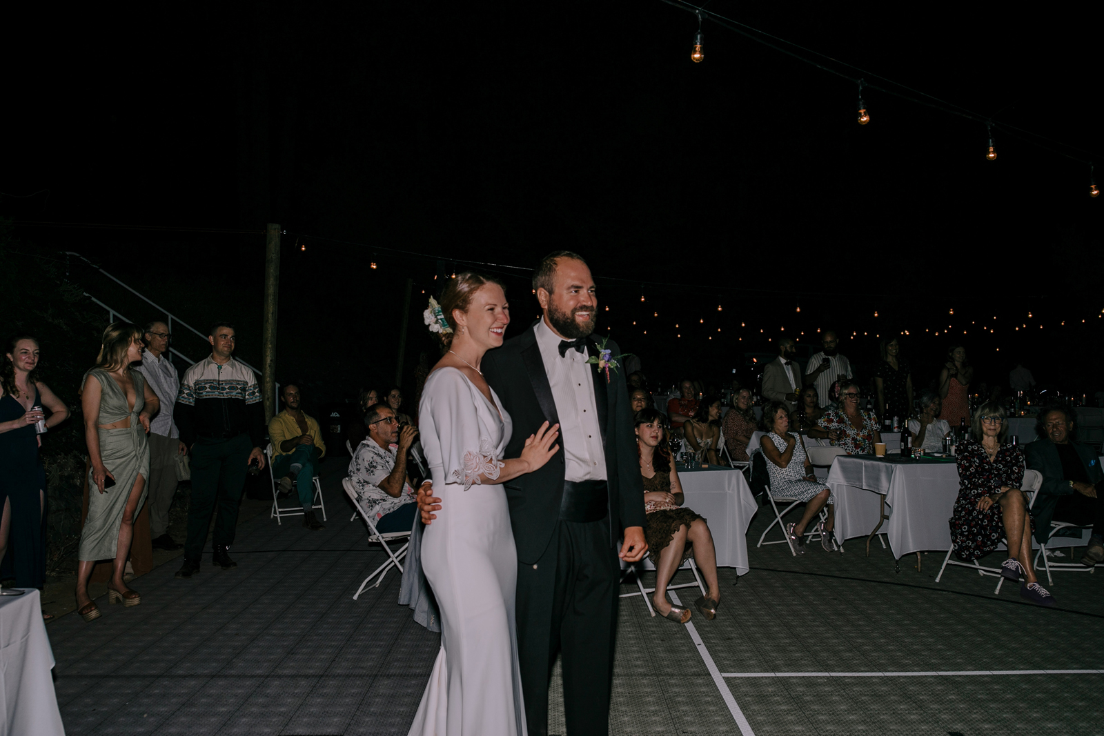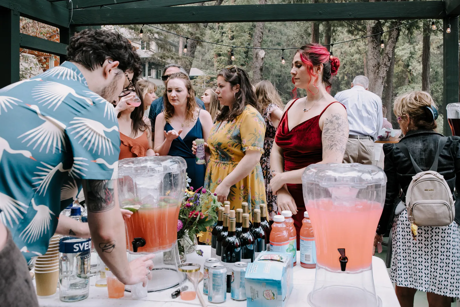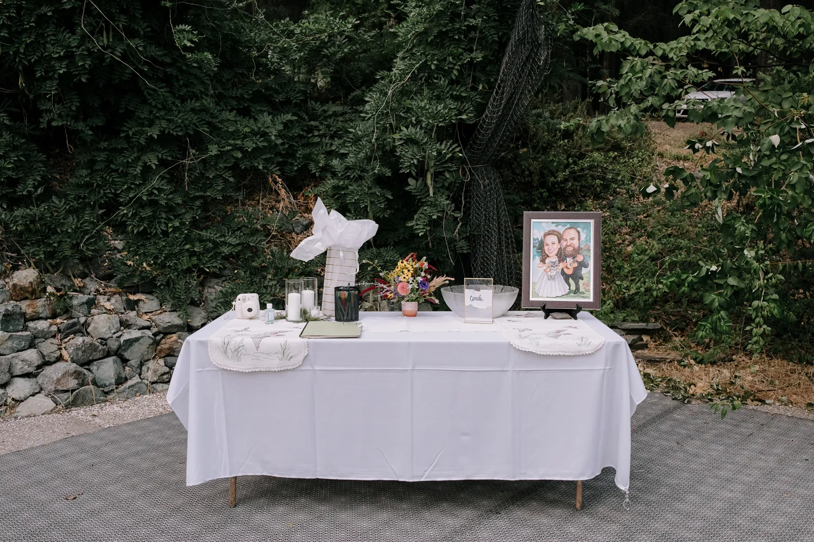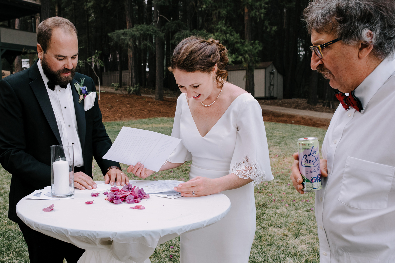 Joe and I are two love birds who find each other very, very funny. We met at The Benchwarmer, a little dive in Ventura, CA. I walked in and after an hour or so of pep talking from a friend, Joe finally walked up and said, “Hi, are you that cute girl I was talking to on Bumble?” I was! [It was] a little hybrid tech-real life love story. Three years later, backpacking in Santa Barbara County, Joe proposed with my Nana’s engagement ring. We were sitting by a crystal clear pool that had not one but three little waterfalls flowing into it. It was a beautiful moment. For the next year we planned the best party either of us could have hoped for. My mom has the organization, the mind for logistics, and so much practice throwing backyard parties; Joe and I had the scratch paper lists of ideas all over our house; Joe’s Mom and sister have the knack for details and a good time that can make a backyard party a champagne worthy event. Our Dads are classic gentlemen and sat back and gave us the space to call back and forth relentlessly about cup rentals, table cloths, and who knows what else — probably more cup and table cloth talk!