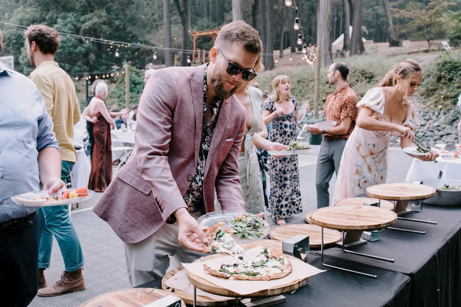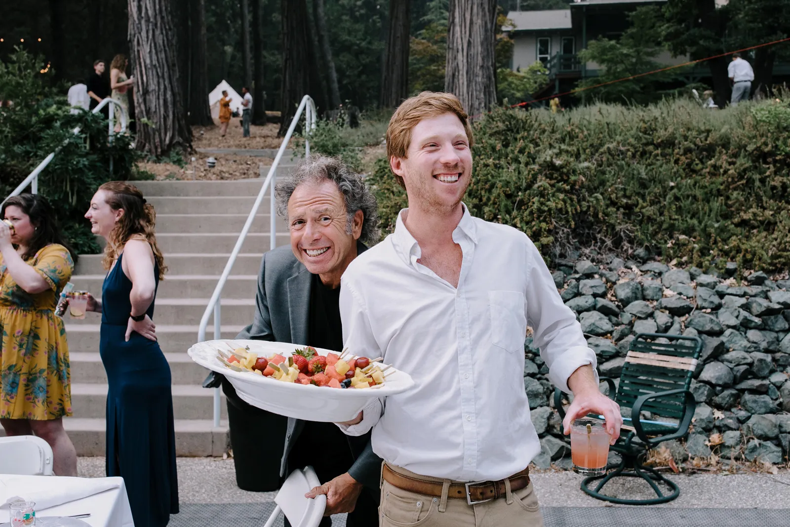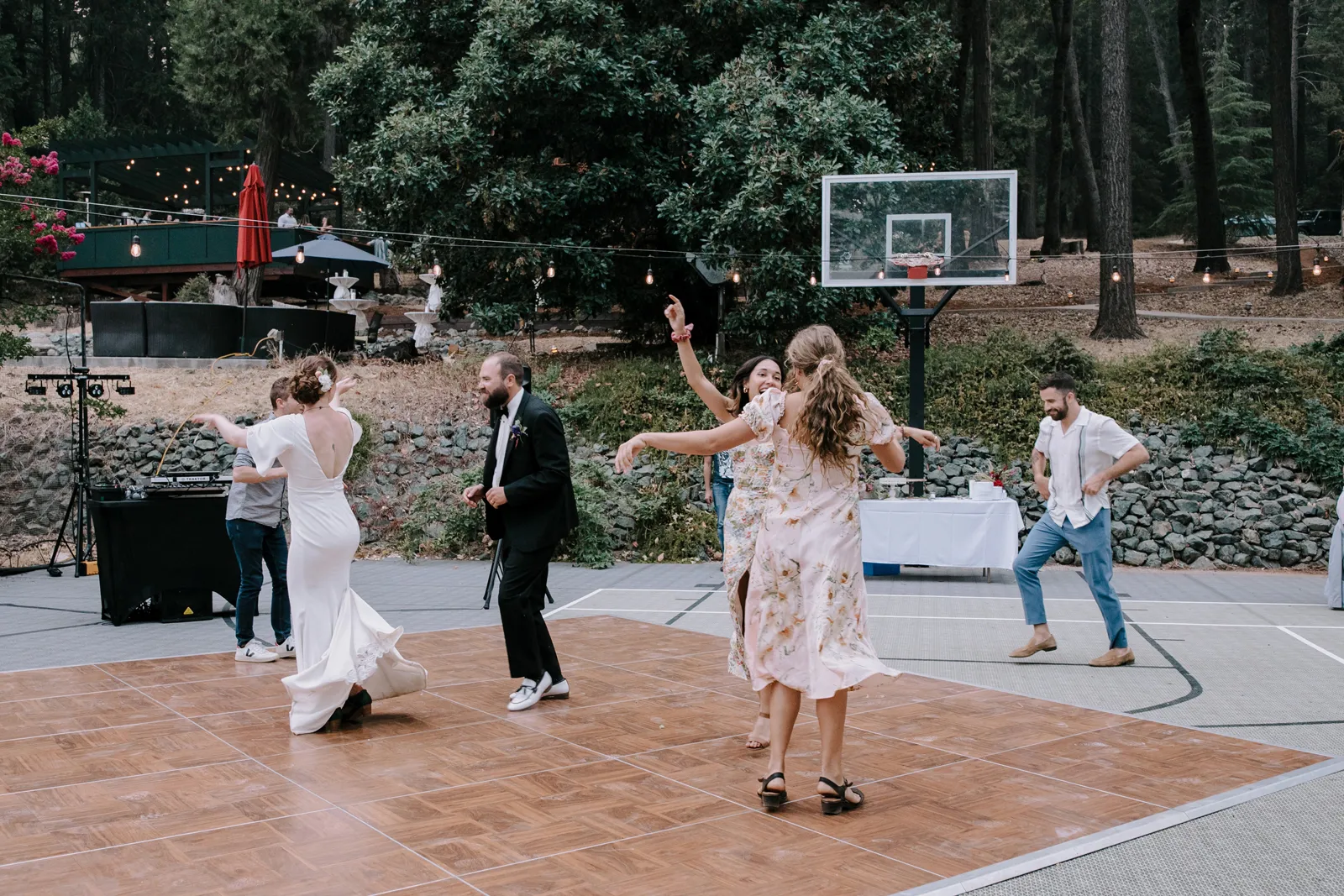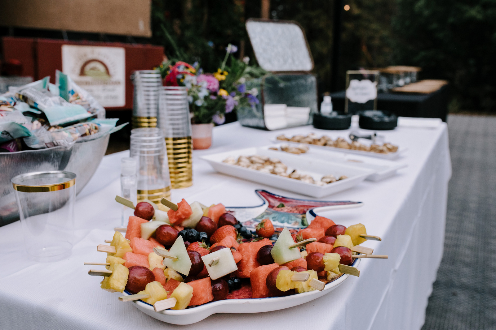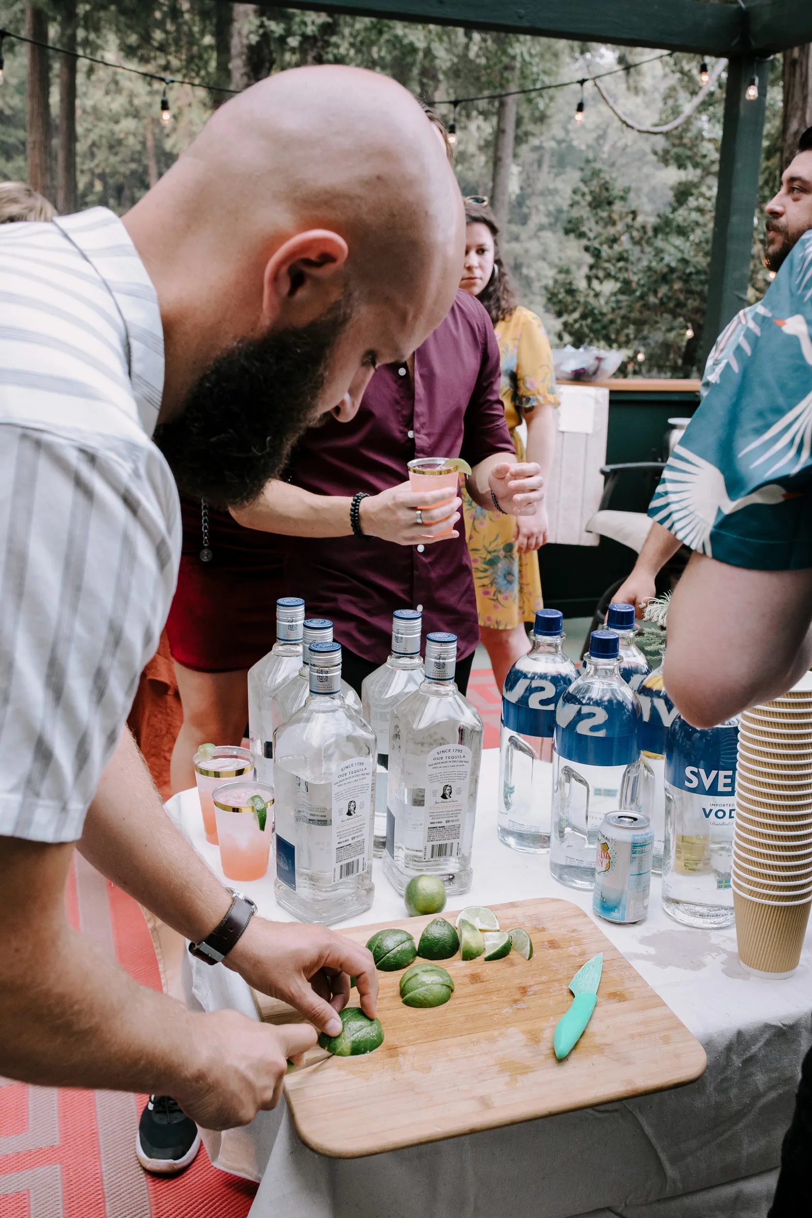 Joe and I are two love birds who find each other very, very funny. We met at The Benchwarmer, a little dive in Ventura, CA. I walked in and after an hour or so of pep talking from a friend, Joe finally walked up and said, “Hi, are you that cute girl I was talking to on Bumble?” I was! [It was] a little hybrid tech-real life love story. Three years later, backpacking in Santa Barbara County, Joe proposed with my Nana’s engagement ring. We were sitting by a crystal clear pool that had not one but three little waterfalls flowing into it. It was a beautiful moment. For the next year we planned the best party either of us could have hoped for. My mom has the organization, the mind for logistics, and so much practice throwing backyard parties; Joe and I had the scratch paper lists of ideas all over our house; Joe’s Mom and sister have the knack for details and a good time that can make a backyard party a champagne worthy event. Our Dads are classic gentlemen and sat back and gave us the space to call back and forth relentlessly about cup rentals, table cloths, and who knows what else — probably more cup and table cloth talk!