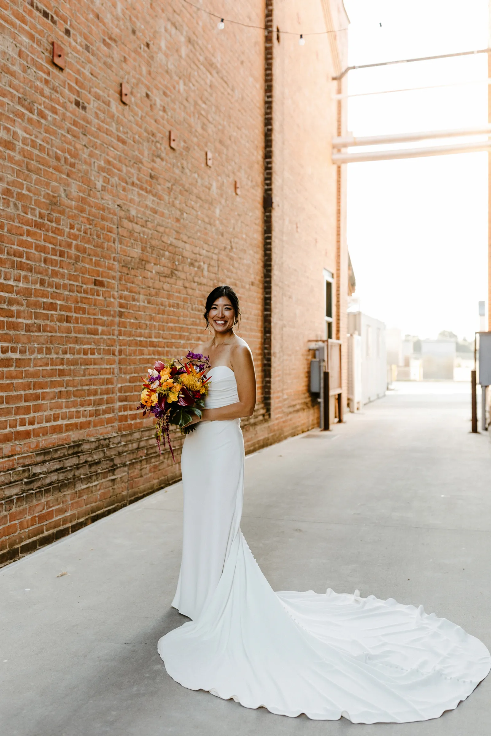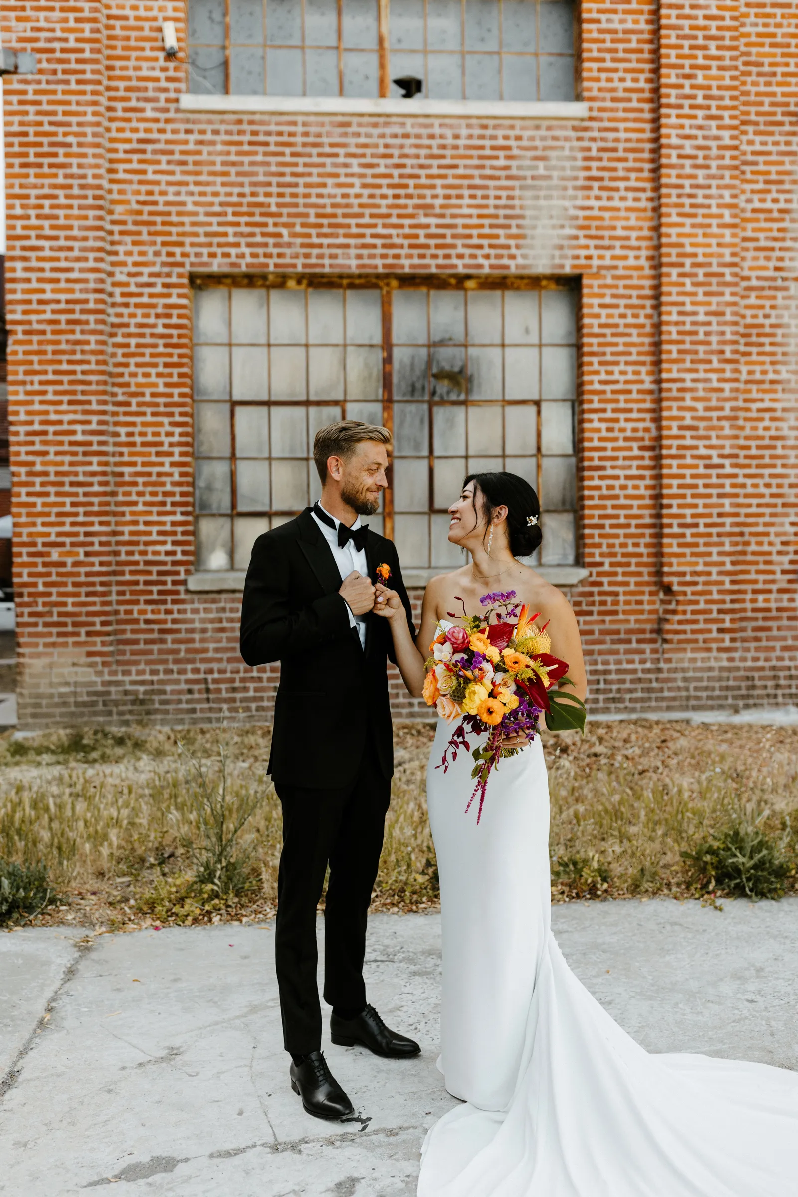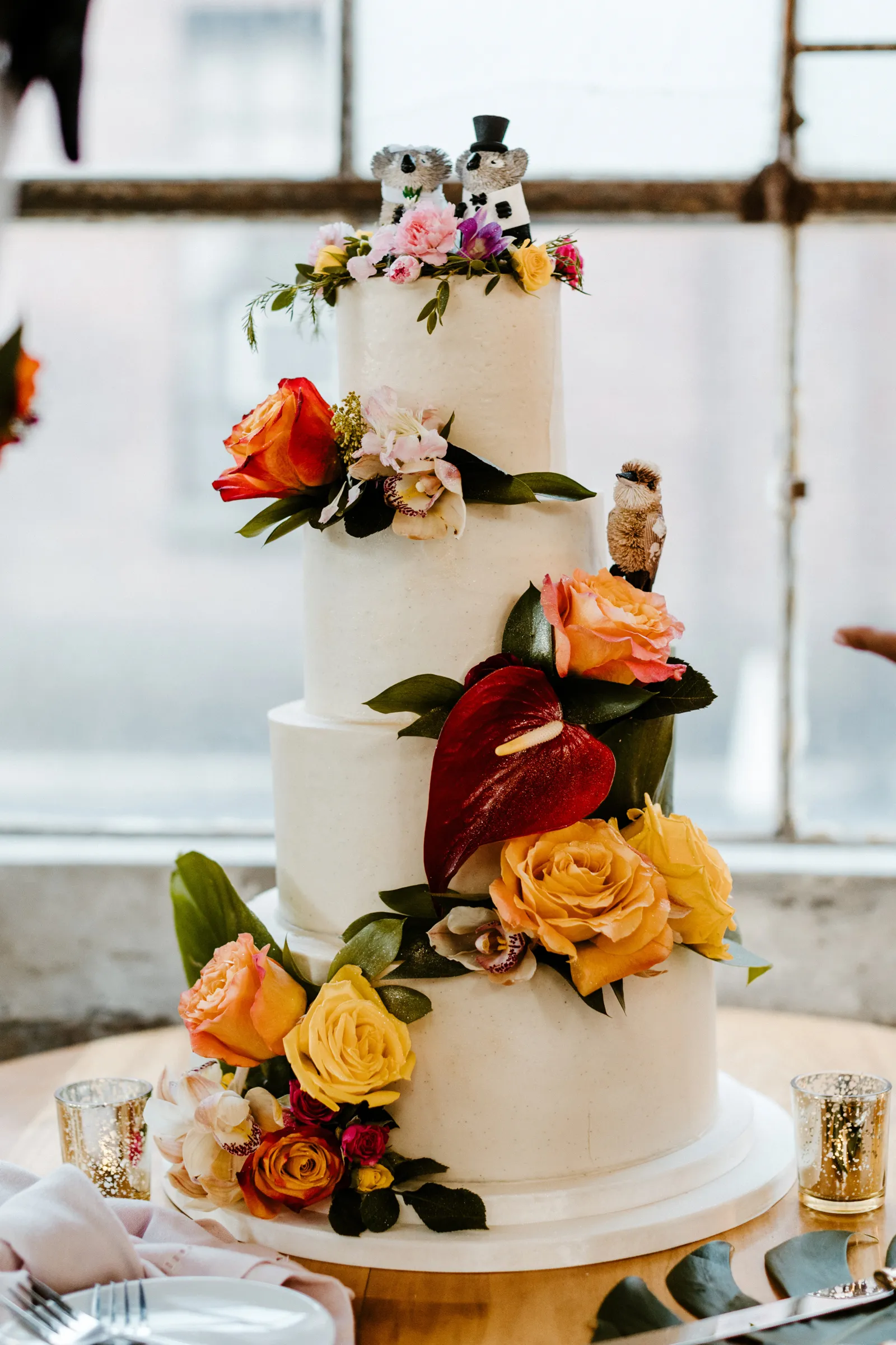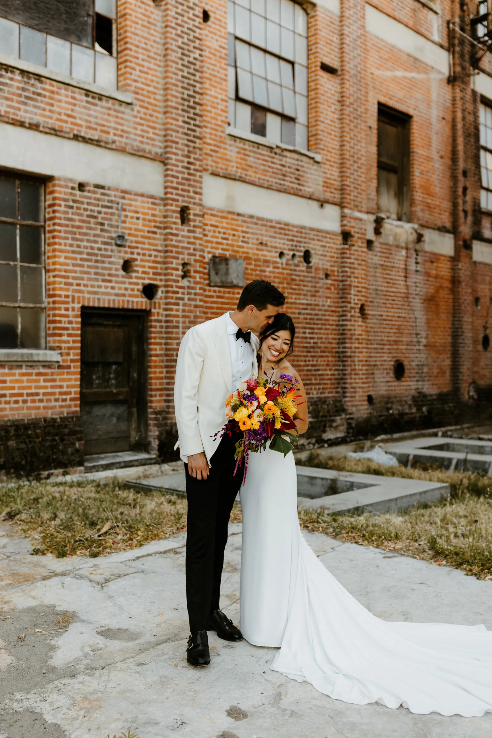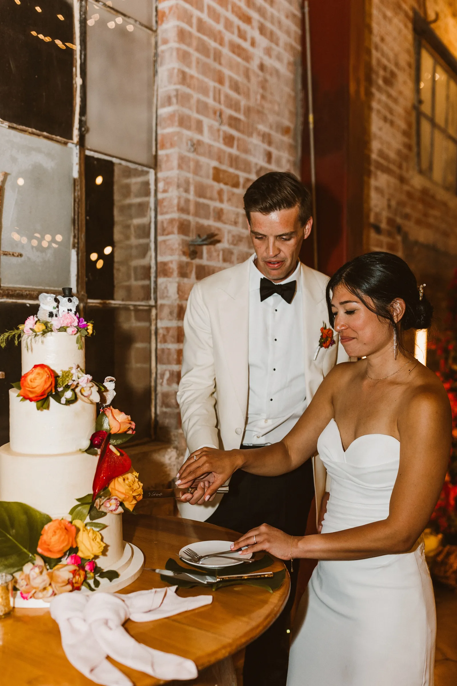 Their REAL wedding (hence, Real Weddings Wednesday), is what we’re here to celebrate today – set at Old Sugar Mill and complete with lots of (puppy) love! We’re talking chic and industrial photos with a furry guest appearance, amazing hair and makeup artistry from our dear partner, All Dolled Up, amazing planning from Magnolia Avenue Events, a koala-inspired cake from Baker & A Black Cat, and stunning florals (thanks Strelitzia Flower Co.!) that are sure to inspire. Keep scrolling to read about the lovely couple and to get in on more of photos from Kayla Esparza Photography!