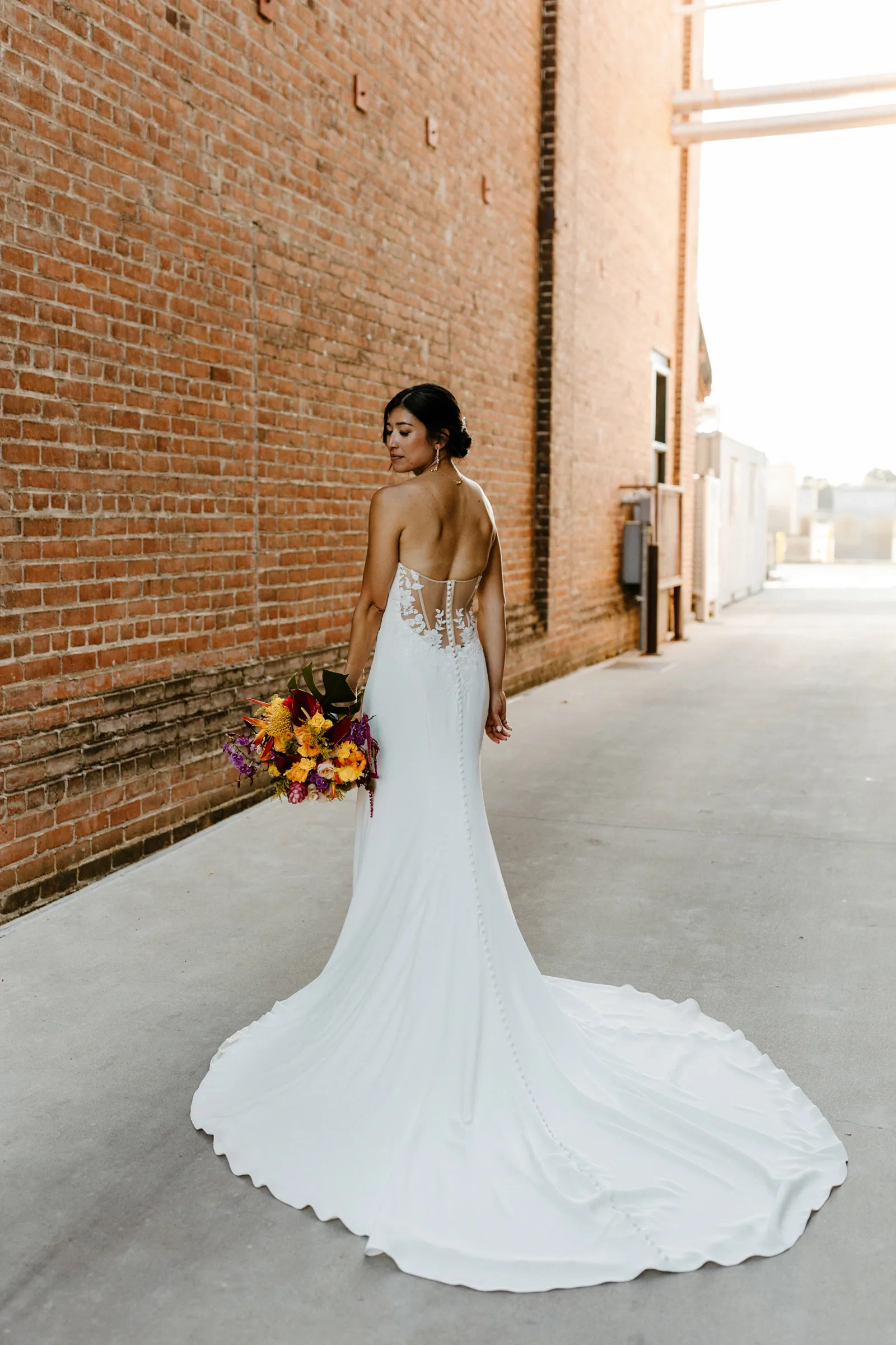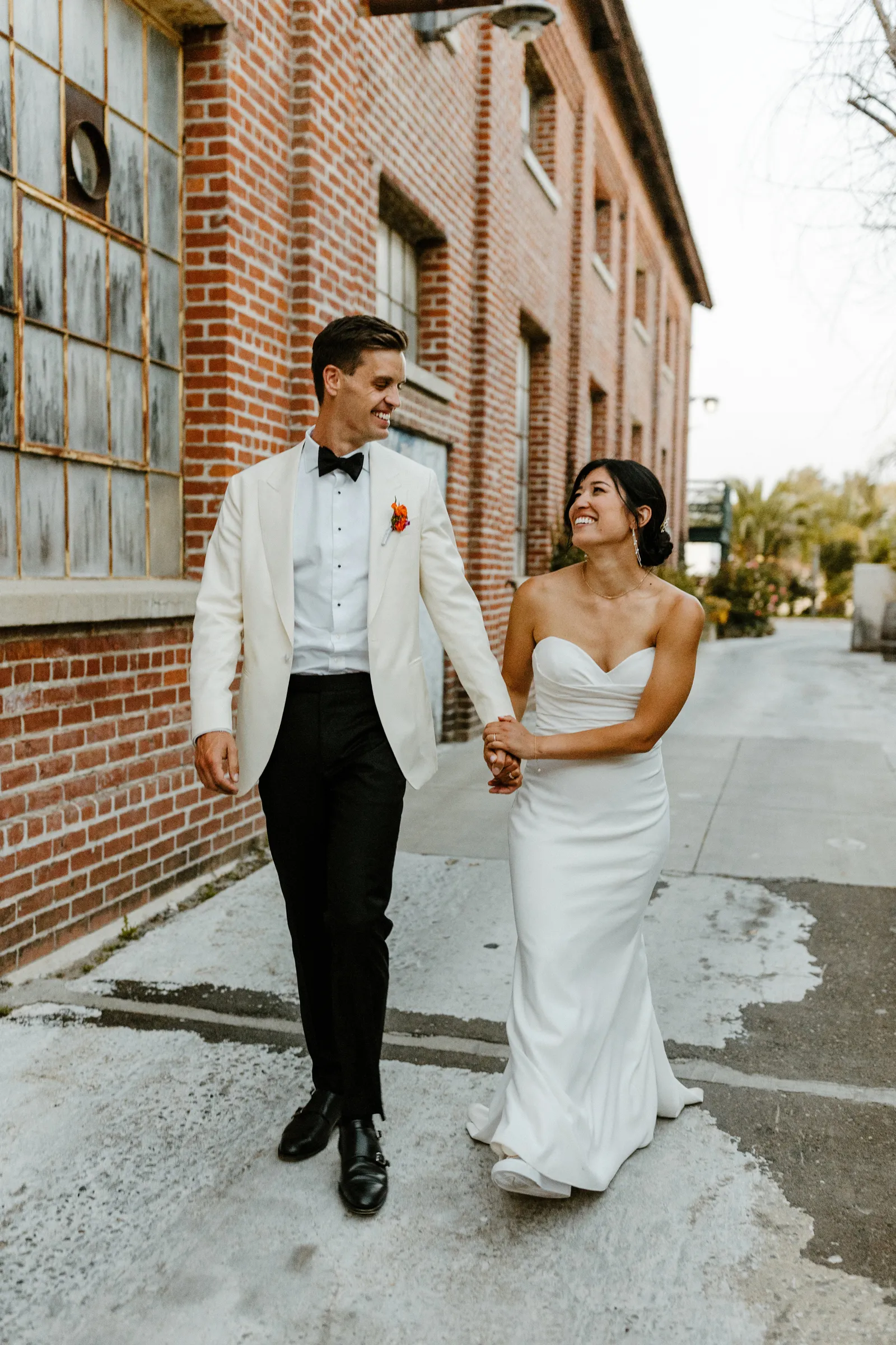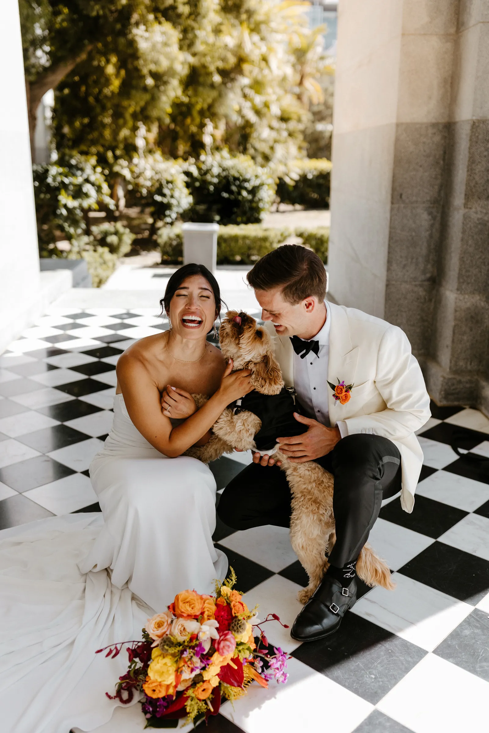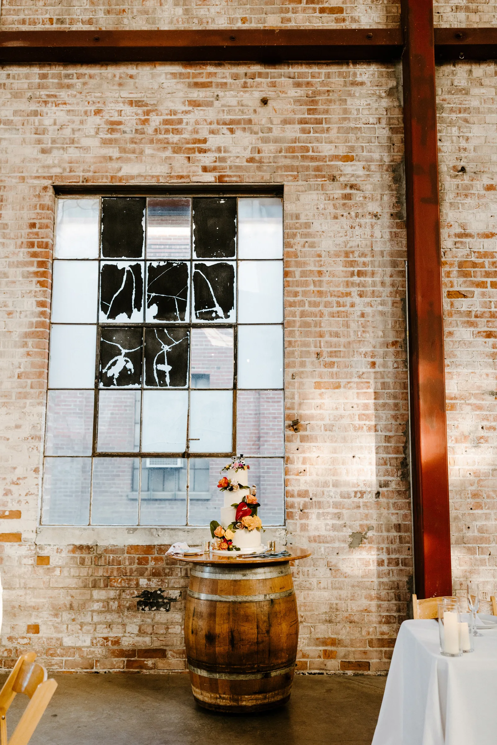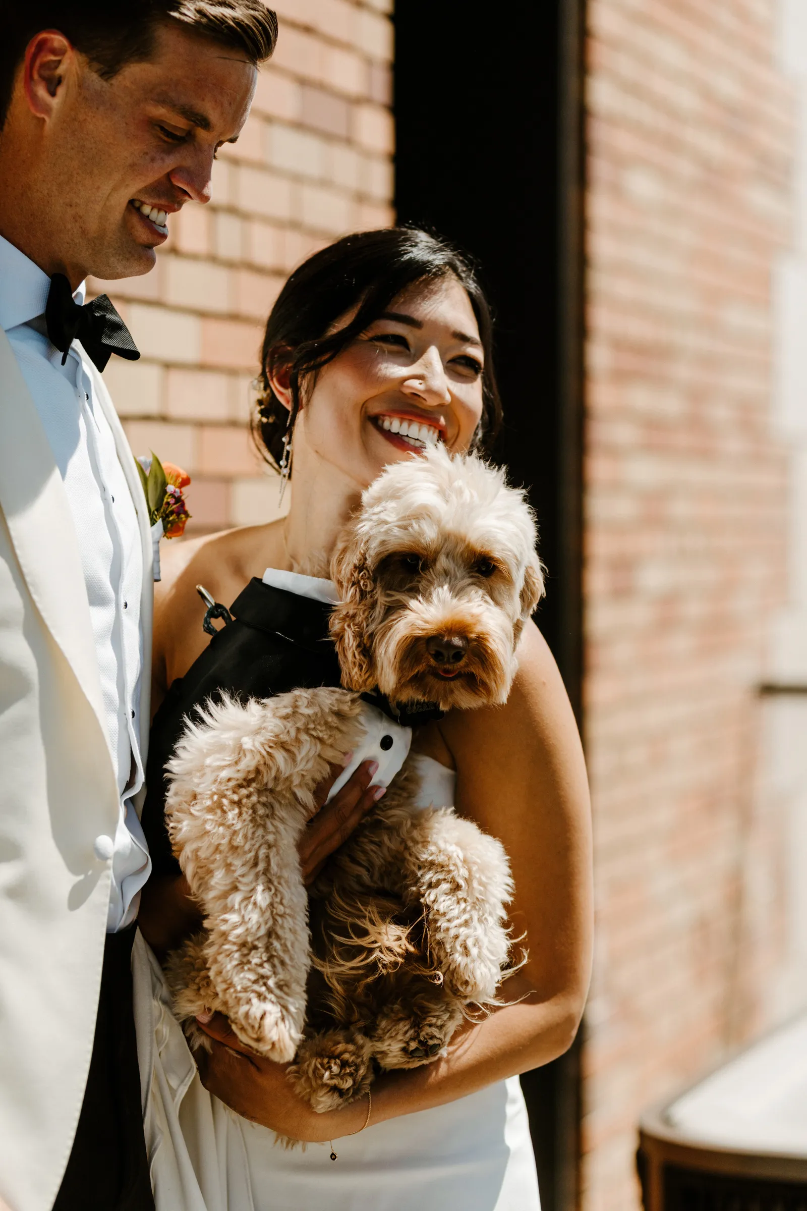 Their REAL wedding (hence, Real Weddings Wednesday), is what we’re here to celebrate today – set at Old Sugar Mill and complete with lots of (puppy) love! We’re talking chic and industrial photos with a furry guest appearance, amazing hair and makeup artistry from our dear partner, All Dolled Up, amazing planning from Magnolia Avenue Events, a koala-inspired cake from Baker & A Black Cat, and stunning florals (thanks Strelitzia Flower Co.!) that are sure to inspire. Keep scrolling to read about the lovely couple and to get in on more of photos from Kayla Esparza Photography!
