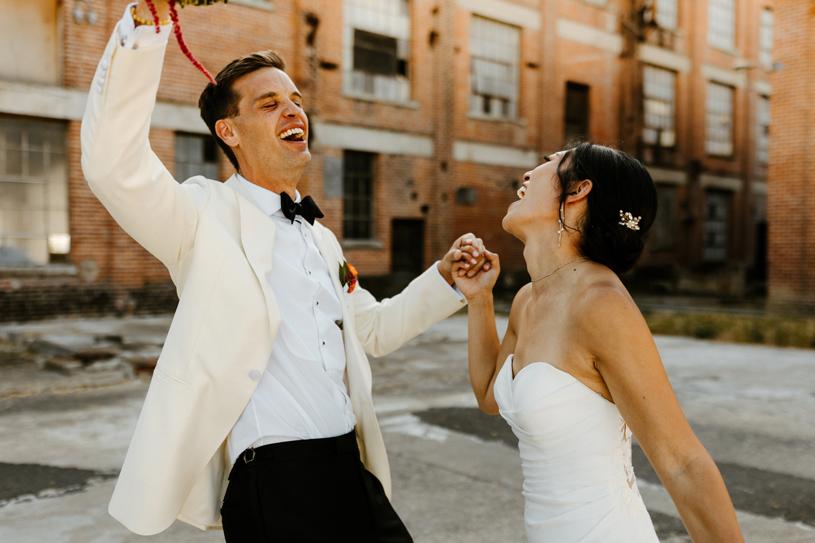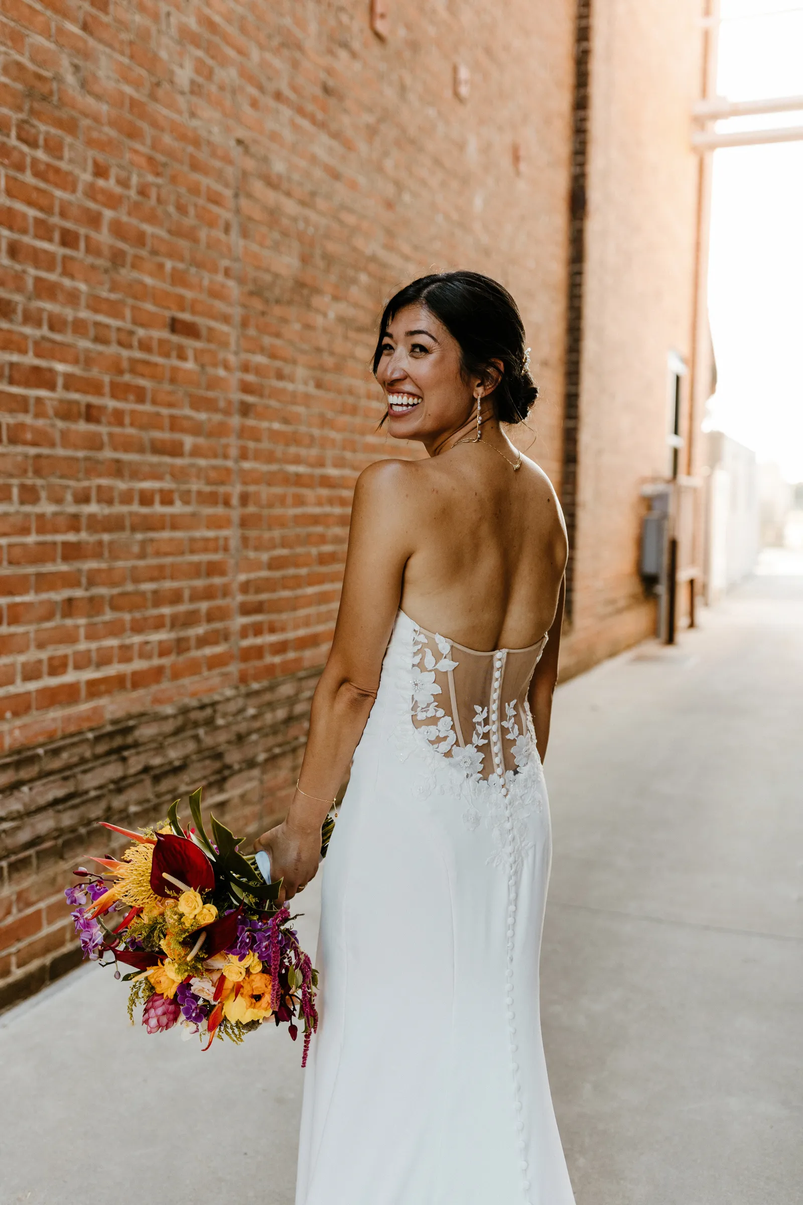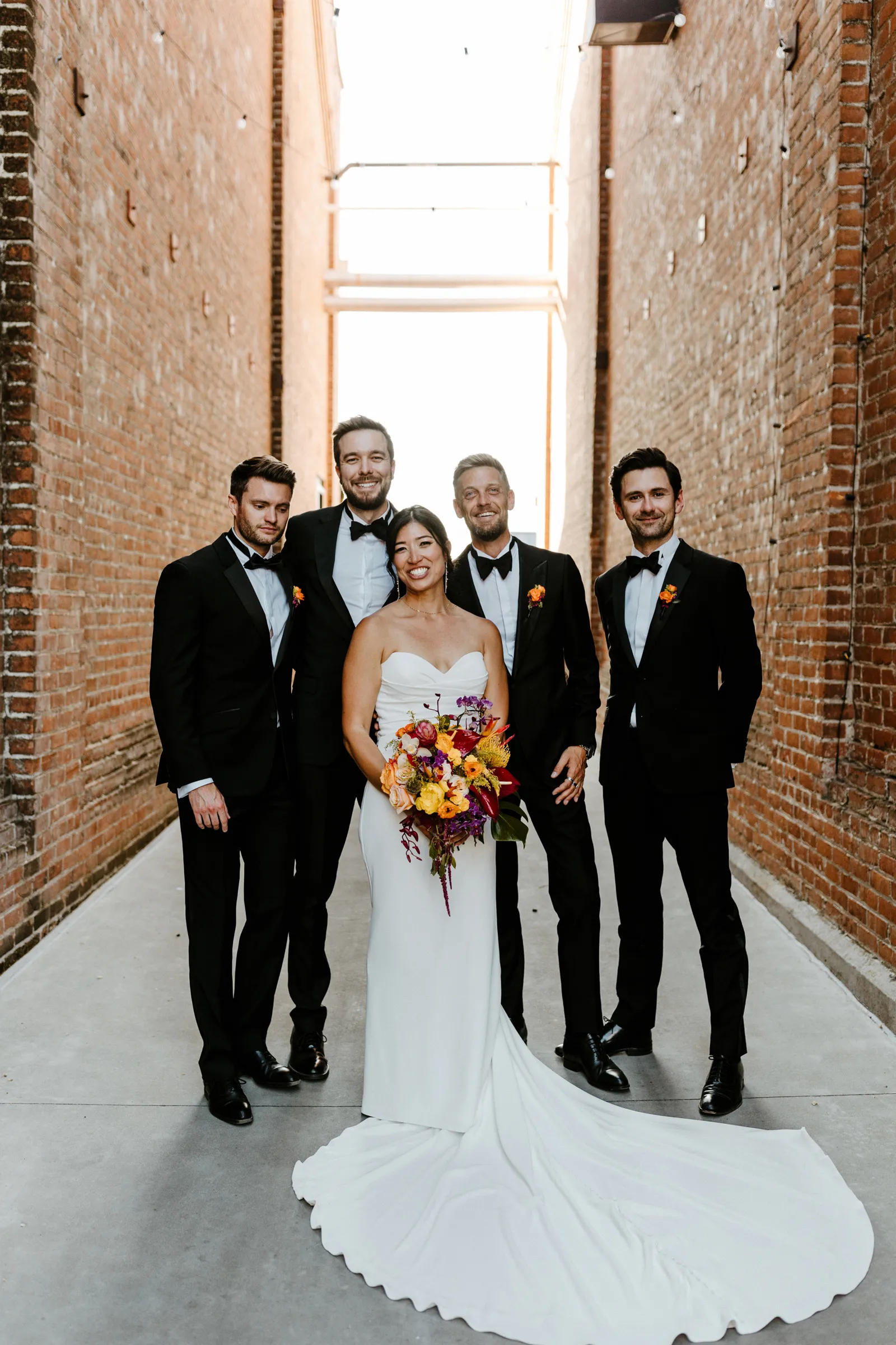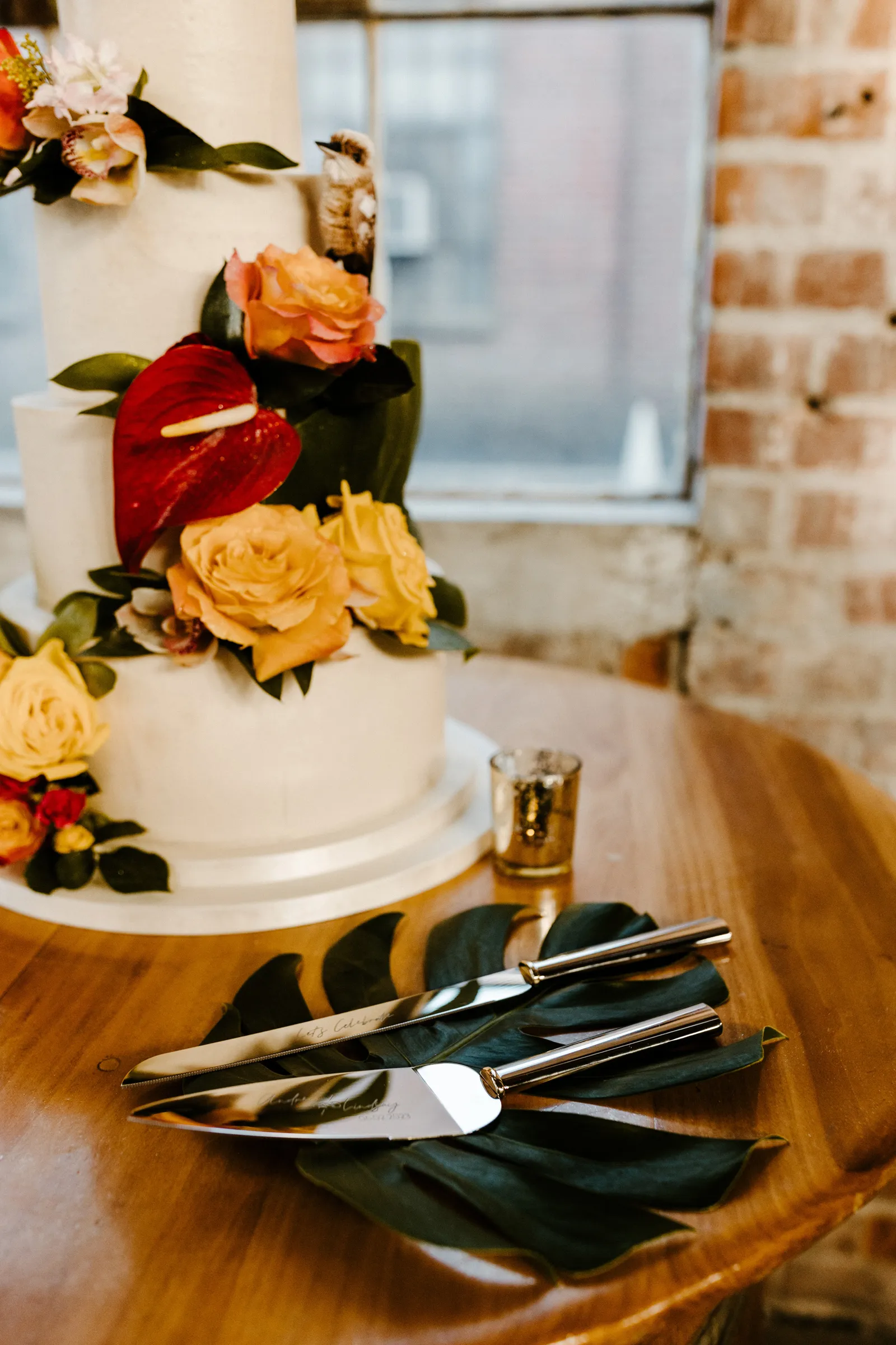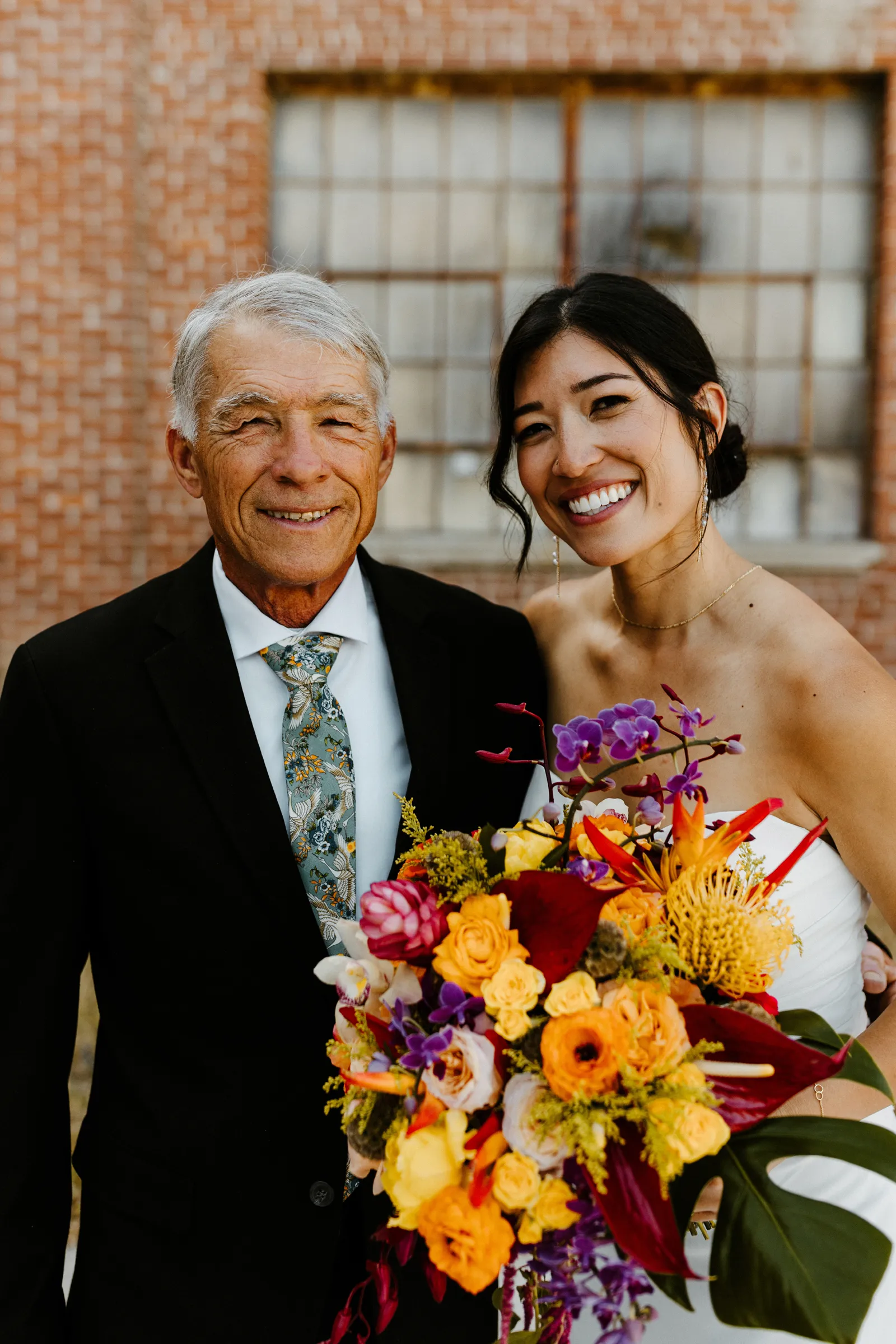 Their REAL wedding (hence, Real Weddings Wednesday), is what we’re here to celebrate today – set at Old Sugar Mill and complete with lots of (puppy) love! We’re talking chic and industrial photos with a furry guest appearance, amazing hair and makeup artistry from our dear partner, All Dolled Up, amazing planning from Magnolia Avenue Events, a koala-inspired cake from Baker & A Black Cat, and stunning florals (thanks Strelitzia Flower Co.!) that are sure to inspire. Keep scrolling to read about the lovely couple and to get in on more of photos from Kayla Esparza Photography!