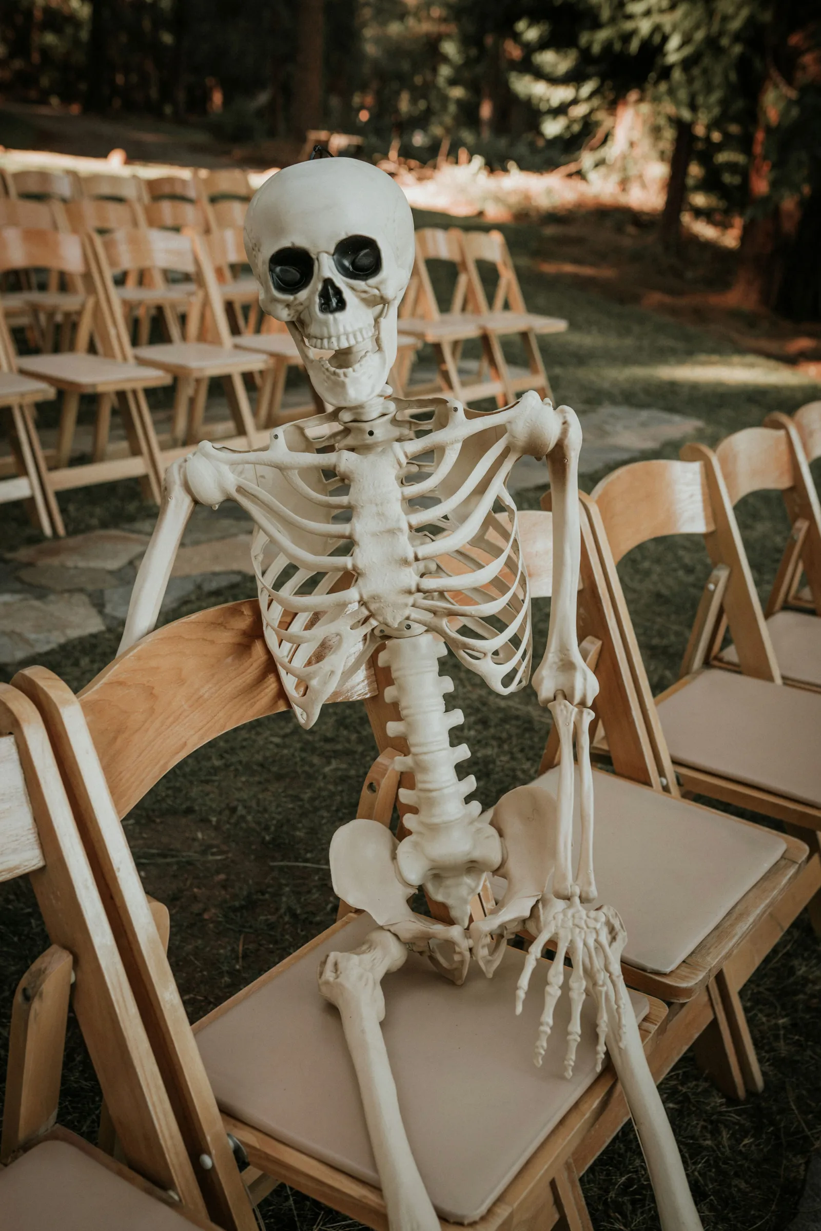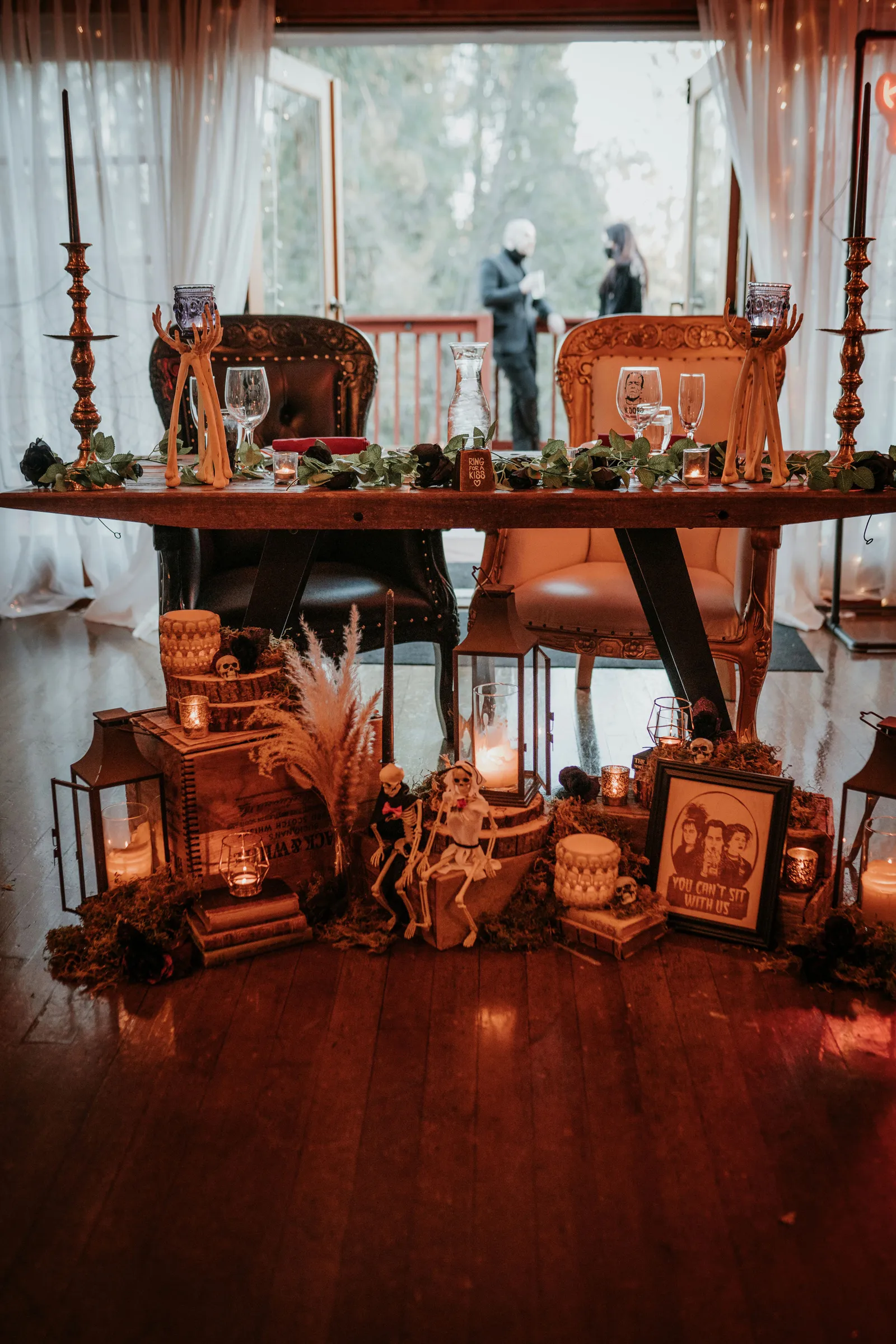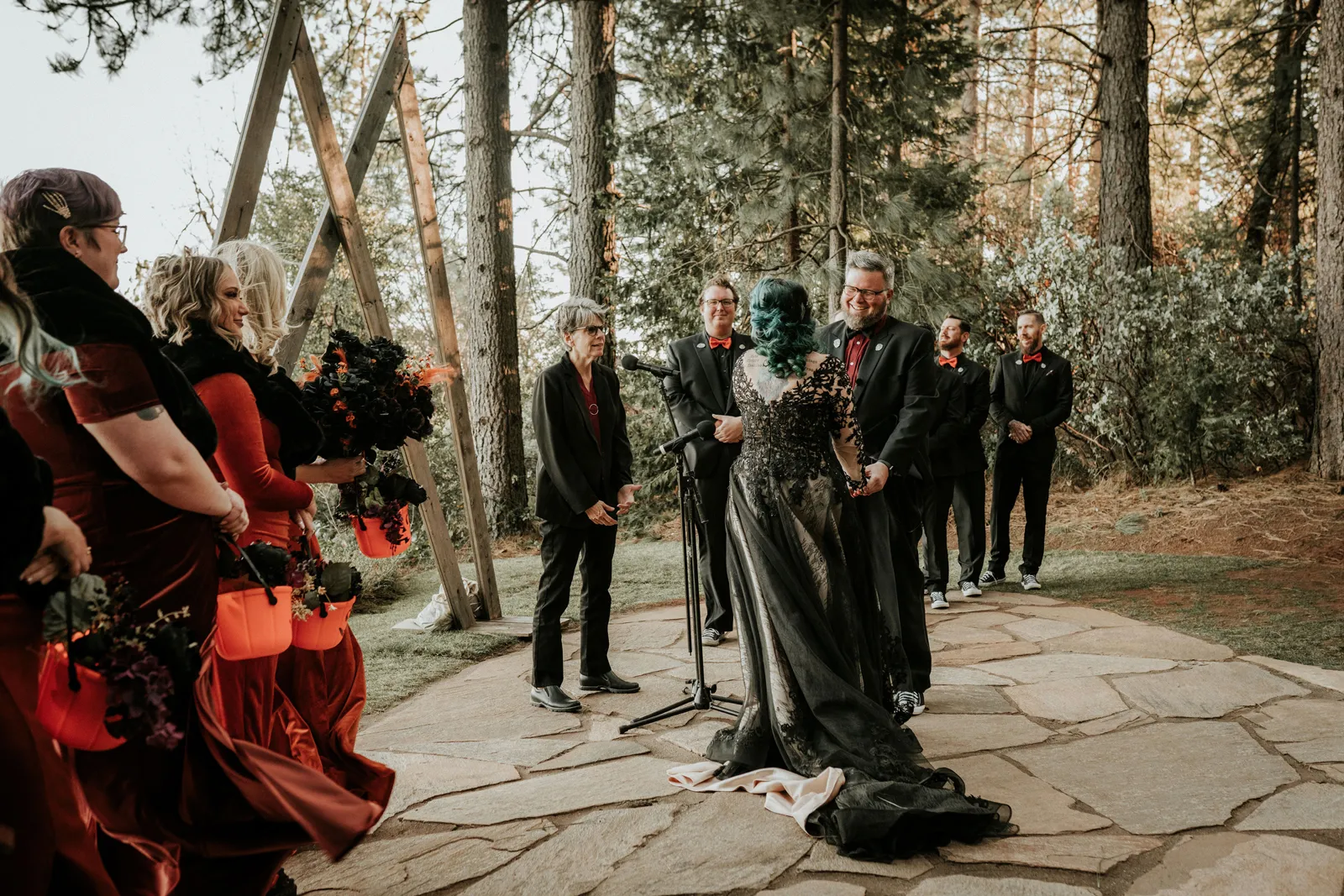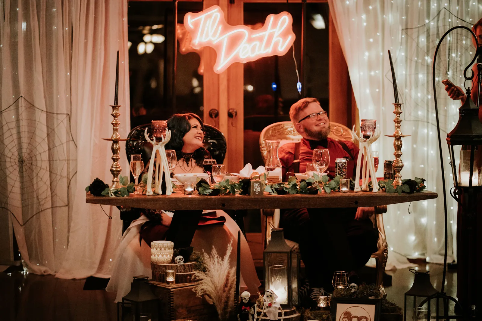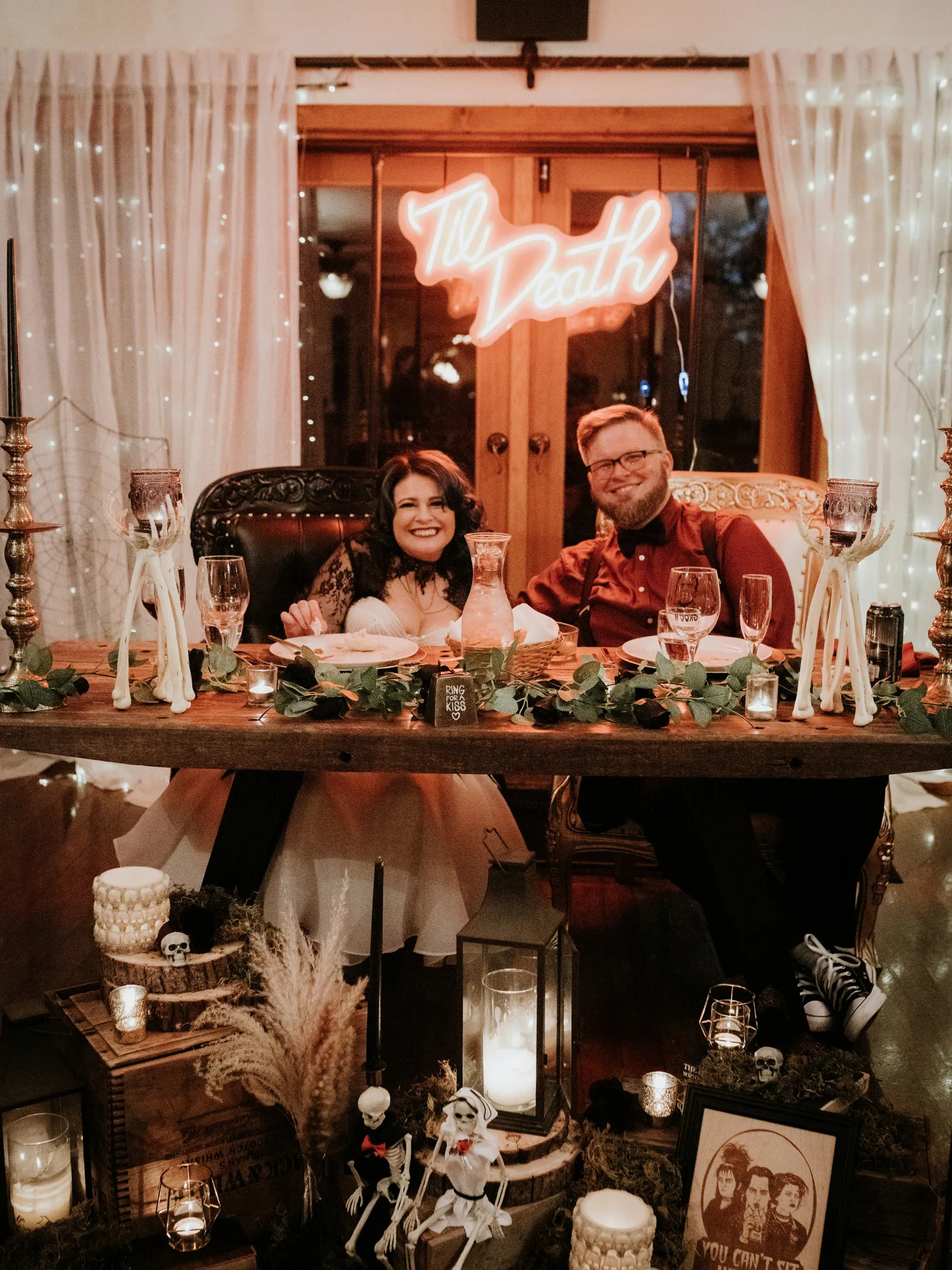 Eric and I met online dating during COVID! We had a lunch date the one week where restaurants in Sacramento opened up before re-closing with another spike. We fell for one another fast, moved in together fast, bought a farm together, booked a wedding venue before he proposed and had a blast the entire way. We fell in love with each other’s quirks, (BIG) laughs, and our shared love for Halloween and all things spooky! It wasn’t a tough choice to know that we wanted a Halloween themed wedding! It was so fun to plan and we went with the theme ‘Til Death Do Us Party’!