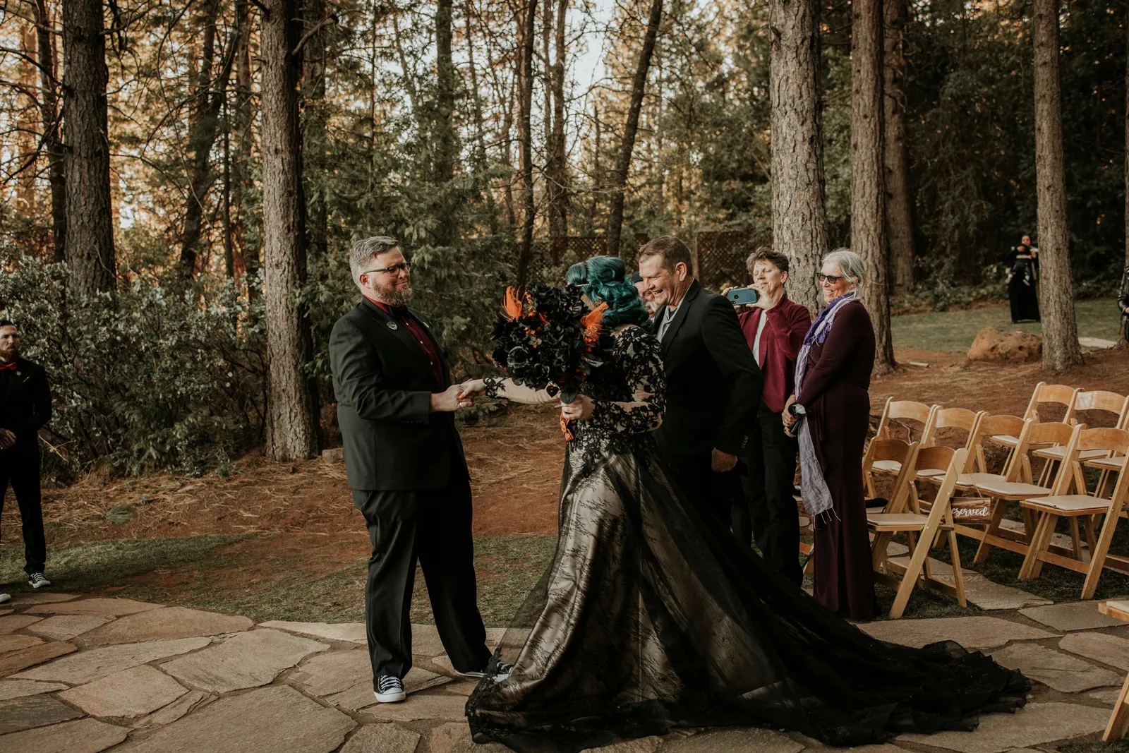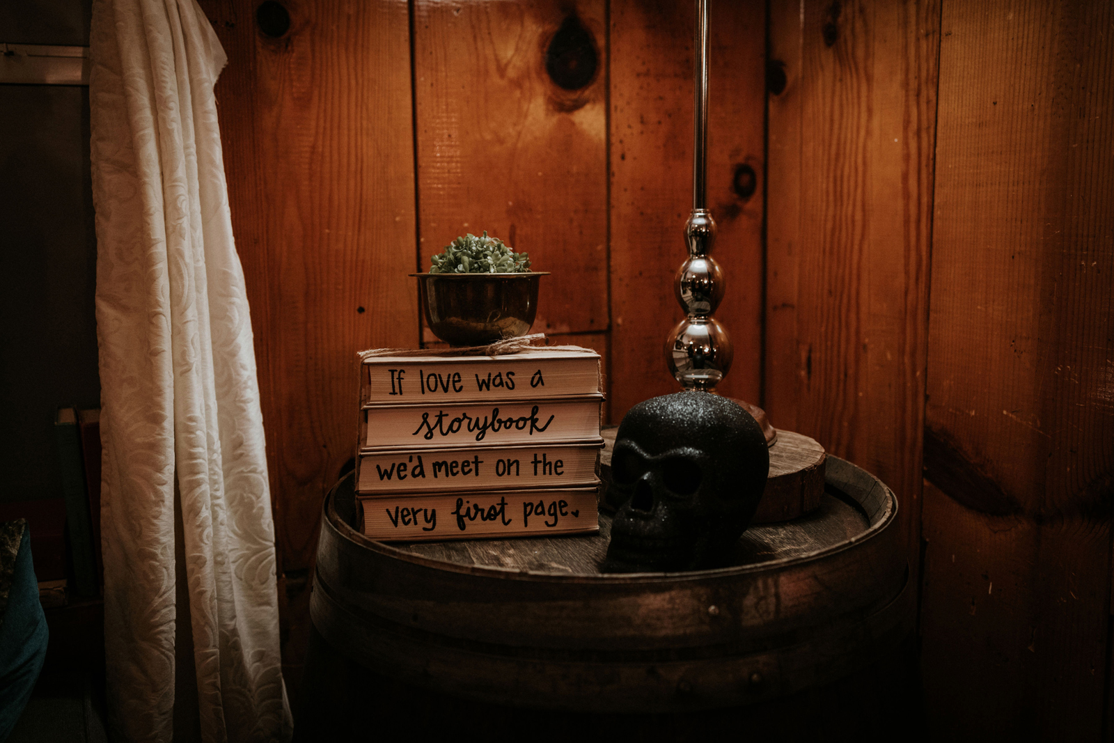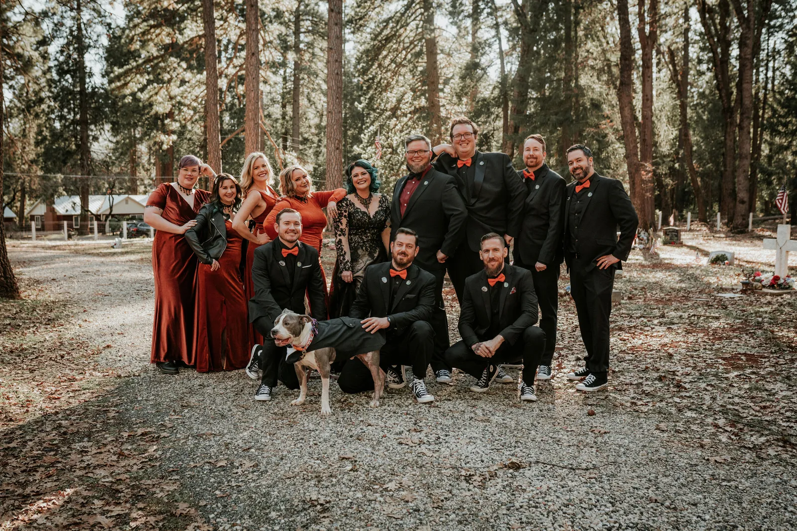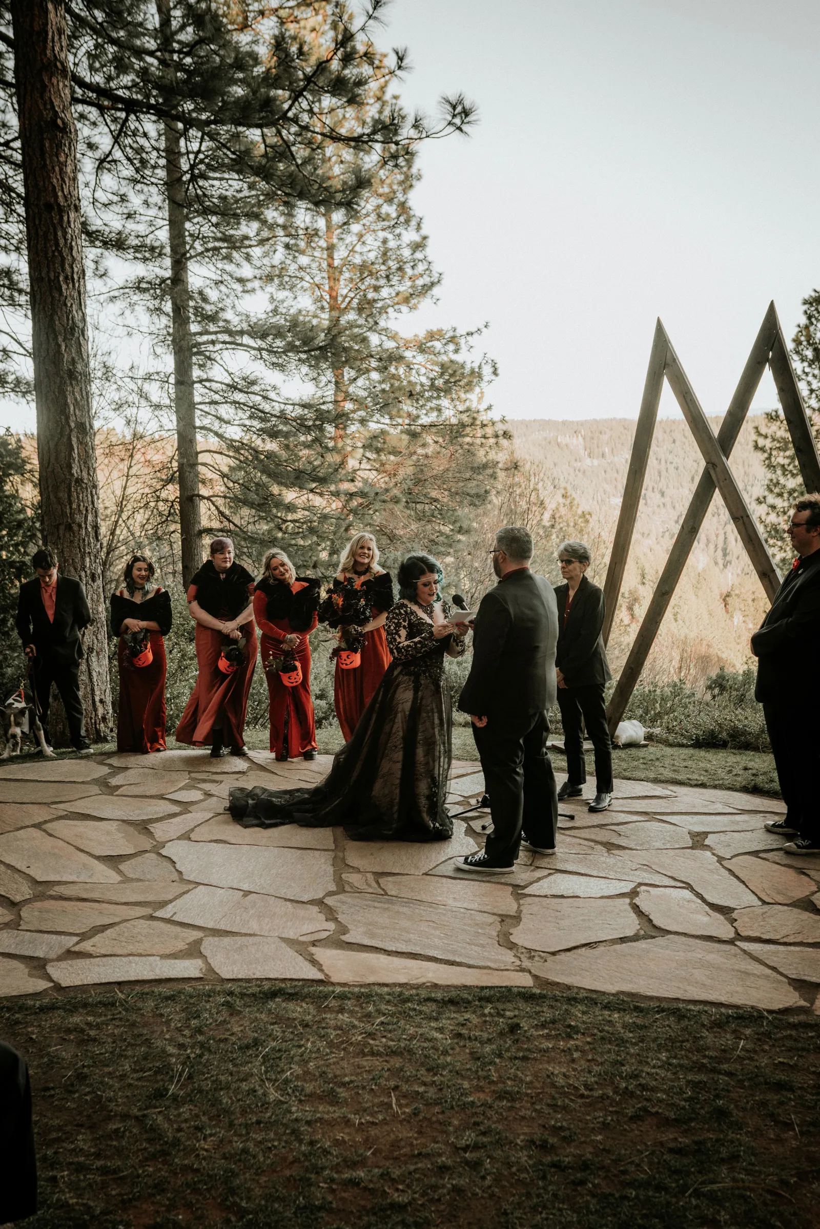 Eric and I met online dating during COVID! We had a lunch date the one week where restaurants in Sacramento opened up before re-closing with another spike. We fell for one another fast, moved in together fast, bought a farm together, booked a wedding venue before he proposed and had a blast the entire way. We fell in love with each other’s quirks, (BIG) laughs, and our shared love for Halloween and all things spooky! It wasn’t a tough choice to know that we wanted a Halloween themed wedding! It was so fun to plan and we went with the theme ‘Til Death Do Us Party’!
