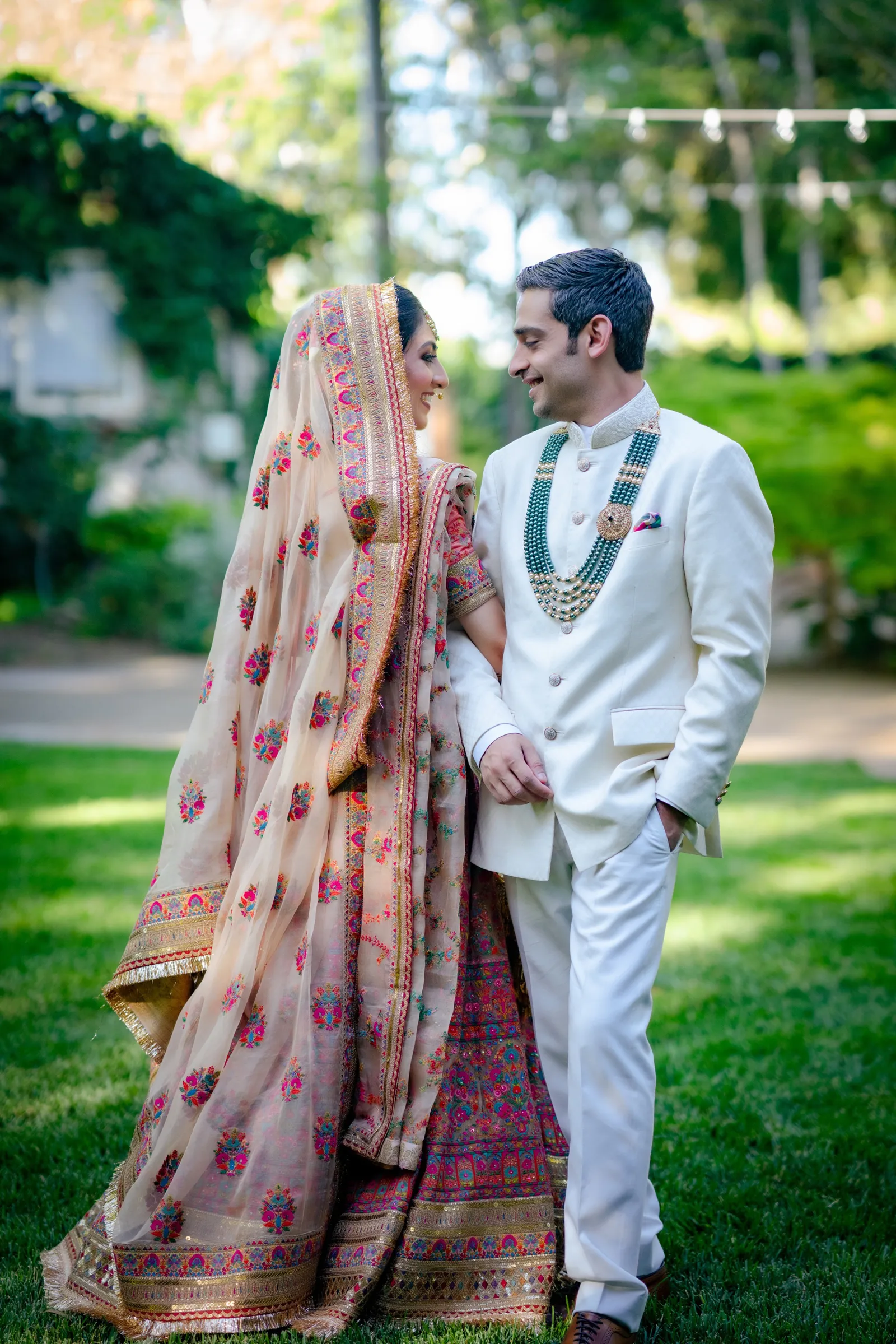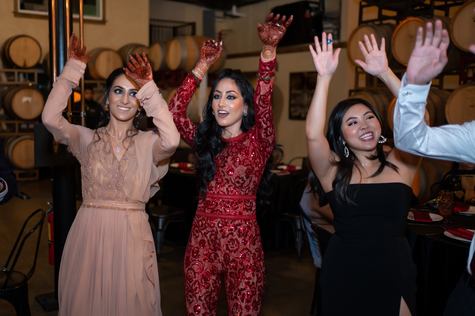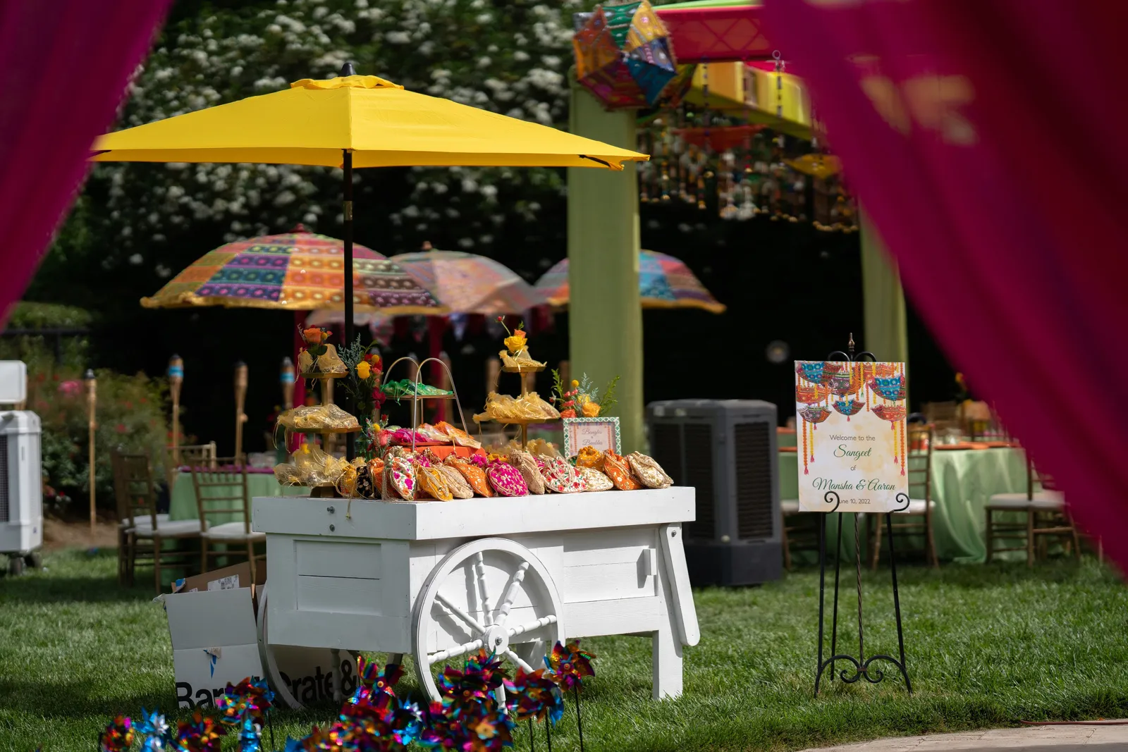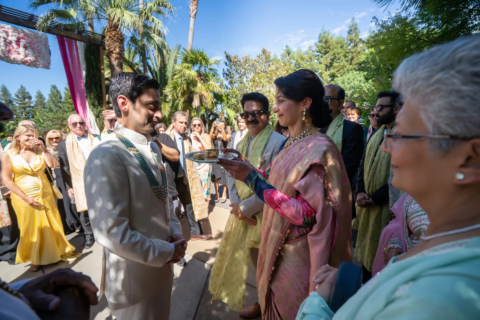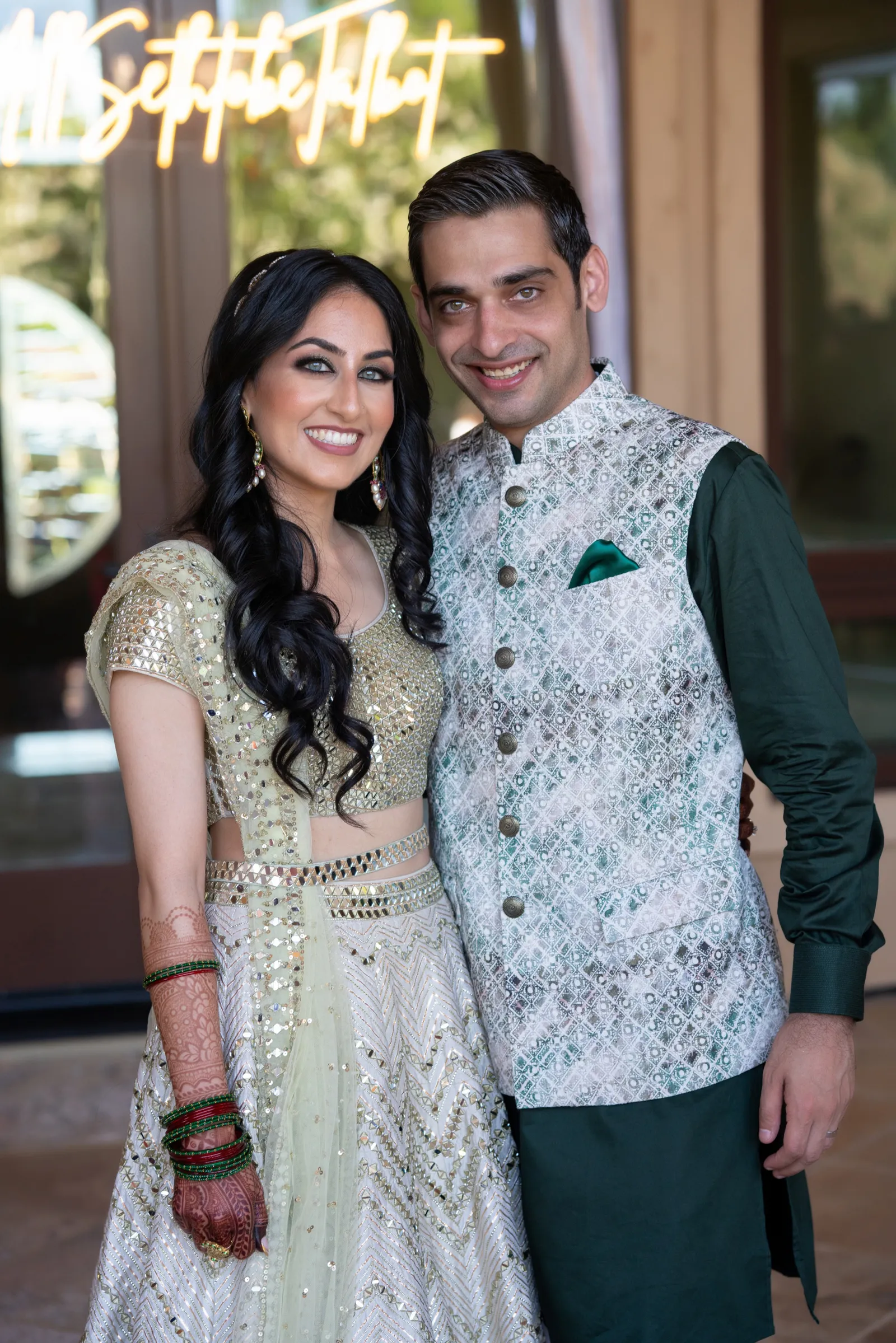 We met six years ago while working at the same consulting company. We talked briefly, but did not think much of it (little did we know…). A few months later, we found ourselves sitting next to each other at yet another work event. We hit it off and spent the majority of the evening talking to each other as opposed to paying attention to the event. Over the next few years, our friendship evolved into a relationship. Together, we navigated learning about each other’s cultures, switching jobs, and moving to new cities. One Saturday afternoon in February 2021, my parents and I were walking to the Ferry Building in San Francisco to meet a family friend when I felt a tap on the back of my shoulder. I turned around and was met with a huge bouquet of two dozen red roses. Aaron peaked his head out from behind the roses and handed me the bouquet. As that was happening, my parents stepped away and secretly turned on their cameras to start recording. In front of the magnificent Bay Bridge and beautiful San Francisco Bay, Aaron got down on one knee and asked me to marry him. I answered: Yes, of course! After the proposal, the two of us got dinner at an Italian restaurant in North Beach, San Francisco. We still enjoy going to that restaurant to relive those special moments. We got married in my hometown: Chico, CA. Since we had many out-of-town guests, this turned into somewhat of a destination wedding. The inspiration behind the wedding was modern traditionalism. We wanted each day to feel distinct and modern yet preserve the beautiful traditions they were based on. We also wanted the wedding to reflect the fusion of two cultures – Indian and American, Hindu and Jewish, etc. For that reason, we planned one completely Western event (the Cocktail), one completely Indian event (the Sangeet), and one fusion event (the Wedding). We also had a small pre-wedding mehndi (henna) event on the day most of our guests started arriving in town and a small haldi ceremony (pre-wedding blessing) event the morning of the wedding. The theme of the Cocktail was rustic glam. Set at a local winery, the decor was dark and moody with deep red florals (to match my outfit) interspersed with dried grass and wine barrels lit up by a custom neon sign with our wedding hashtag on it. We also had a welcome table with jumbo Jenga blocks for guests to write fun date night ideas on before they entered the venue. For the Sangeet event, our vendors transformed my family’s backyard into a colorful bazaar with a custom structure draped with vivid pink, orange, yellow, and green fabric accented by hanging Jaipuri umbrellas. We also had colorful lounge furniture for guests to rest on after getting mehndi (henna) applied or while snacking on Indian street food, tables decorated with bazaar-inspired centerpieces (Indian tea kettles, chai cups, etc.), a photo booth station with an Indian taxi prop, and a ‘Bangles & Baubles’ favor table with traditional jewelry, bangles, and purses for guests to enjoy. In the months leading up to the wedding, we sourced each of these party favors from India and individually wrapped them in colorful bags. They were a huge hit with our guests (so much so that we did not have any leftovers after the Sangeet event was over)! The inspiration behind the wedding decor was a modern English garden (like Indian Bridgerton). Contrasting the beautiful greenery at our venue, The Palms in Chico, CA, the decor in the outdoor space was an ombre pink color theme from our welcome gate draped in ombre fuschia to cream fabric to the strings of fuschia, pink, blush, and cream flowers hanging from the tree tops to the roof of the ceremony space (a beautiful gazebo) decorated in rows of flowers. We also had about 100 custom-made bamboo cane lanterns hanging from the trees throughout the outdoor space. At night, these lanterns provided stunning ambient lighting. Our favor table contained hundreds of custom candles created by a local candle company in gold tins with stickers containing our name and monogram on them. The decor in the reception hall indoors was meant to contrast the outdoor space with a cream, white, and gold color theme. The decor consisted of a custom grand chandelier with hanging florals, mirrors, and lights, oversized floral centerpieces with gold vases on all tables, and a grand white dance floor with our wedding monogram on it. This is the same monogram that we used on our digital save the dates and invites as well as on our hotel welcome bags. The neon sign with our wedding hashtag accented the wall behind the head table while the main bar had custom bar signs with our signature drinks on them: ‘Let the Fun Be-gin’ White Linen (hers) and ‘Whiskey Business’ Old Fashioned (his).