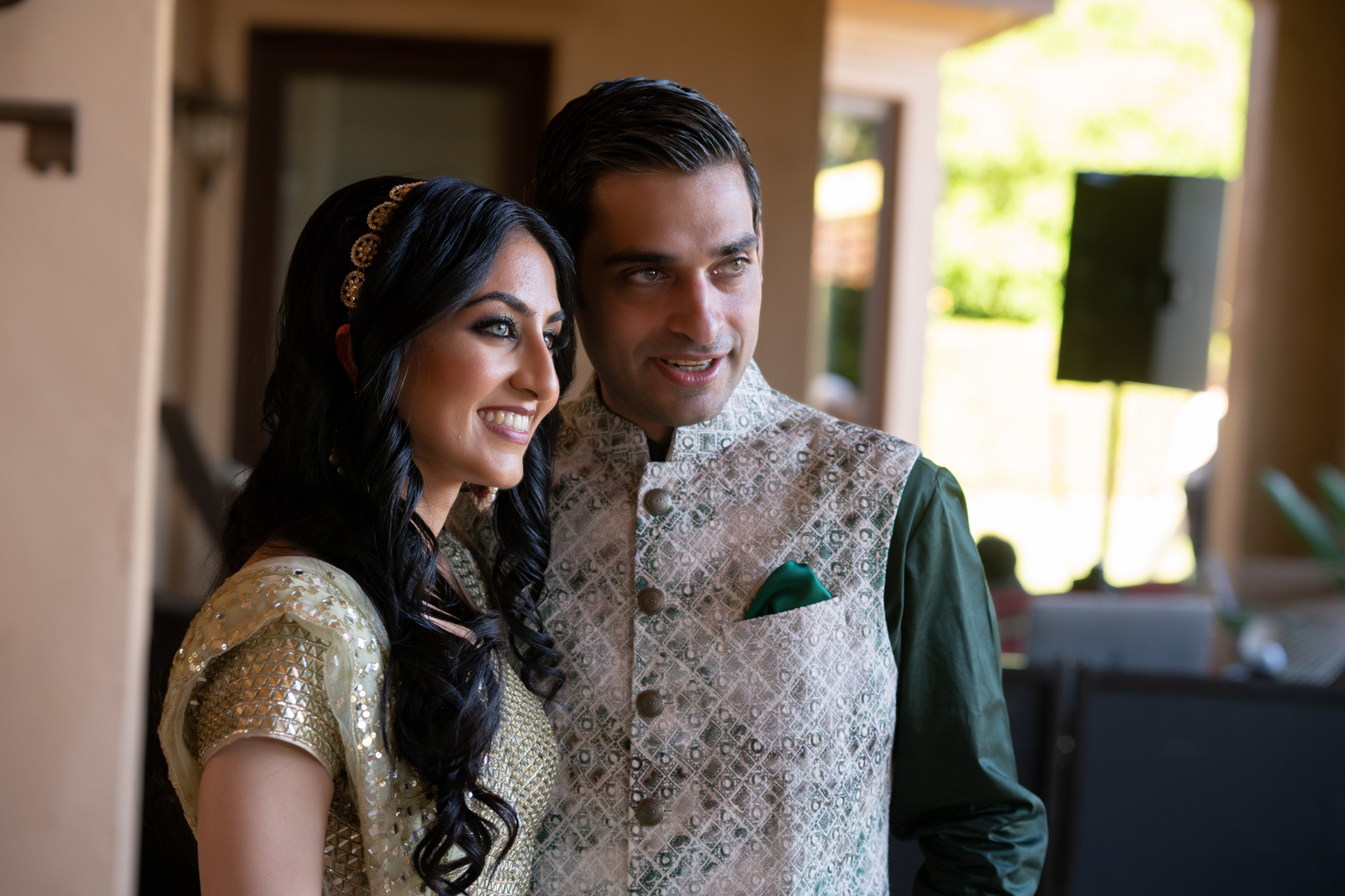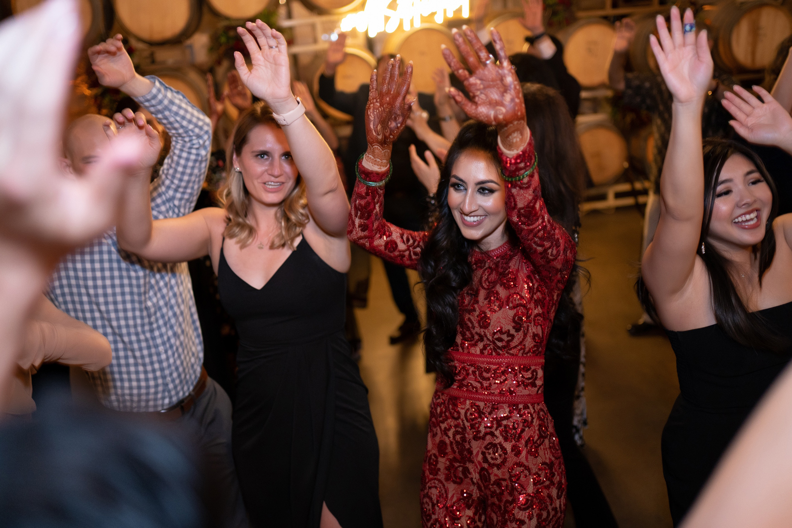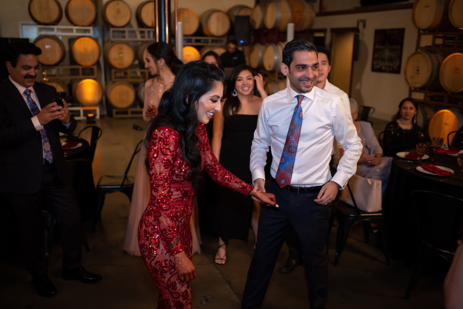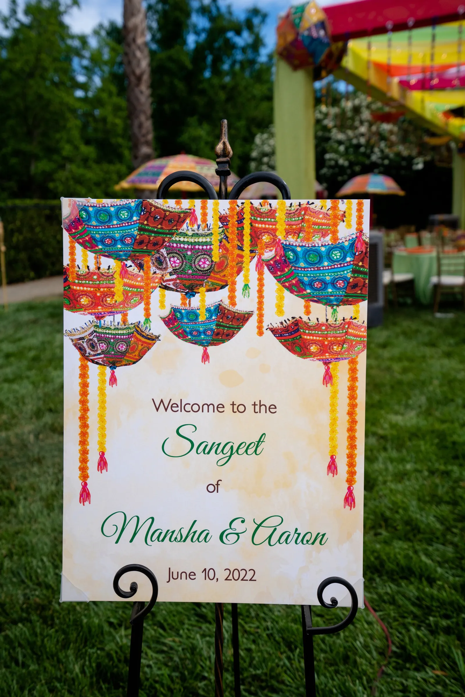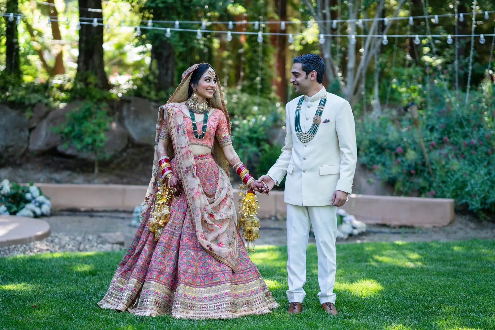 We met six years ago while working at the same consulting company. We talked briefly, but did not think much of it (little did we know…). A few months later, we found ourselves sitting next to each other at yet another work event. We hit it off and spent the majority of the evening talking to each other as opposed to paying attention to the event. Over the next few years, our friendship evolved into a relationship. Together, we navigated learning about each other’s cultures, switching jobs, and moving to new cities. One Saturday afternoon in February 2021, my parents and I were walking to the Ferry Building in San Francisco to meet a family friend when I felt a tap on the back of my shoulder. I turned around and was met with a huge bouquet of two dozen red roses. Aaron peaked his head out from behind the roses and handed me the bouquet. As that was happening, my parents stepped away and secretly turned on their cameras to start recording. In front of the magnificent Bay Bridge and beautiful San Francisco Bay, Aaron got down on one knee and asked me to marry him. I answered: Yes, of course! After the proposal, the two of us got dinner at an Italian restaurant in North Beach, San Francisco. We still enjoy going to that restaurant to relive those special moments. We got married in my hometown: Chico, CA. Since we had many out-of-town guests, this turned into somewhat of a destination wedding. The inspiration behind the wedding was modern traditionalism. We wanted each day to feel distinct and modern yet preserve the beautiful traditions they were based on. We also wanted the wedding to reflect the fusion of two cultures – Indian and American, Hindu and Jewish, etc. For that reason, we planned one completely Western event (the Cocktail), one completely Indian event (the Sangeet), and one fusion event (the Wedding). We also had a small pre-wedding mehndi (henna) event on the day most of our guests started arriving in town and a small haldi ceremony (pre-wedding blessing) event the morning of the wedding. The theme of the Cocktail was rustic glam. Set at a local winery, the decor was dark and moody with deep red florals (to match my outfit) interspersed with dried grass and wine barrels lit up by a custom neon sign with our wedding hashtag on it. We also had a welcome table with jumbo Jenga blocks for guests to write fun date night ideas on before they entered the venue. For the Sangeet event, our vendors transformed my family’s backyard into a colorful bazaar with a custom structure draped with vivid pink, orange, yellow, and green fabric accented by hanging Jaipuri umbrellas. We also had colorful lounge furniture for guests to rest on after getting mehndi (henna) applied or while snacking on Indian street food, tables decorated with bazaar-inspired centerpieces (Indian tea kettles, chai cups, etc.), a photo booth station with an Indian taxi prop, and a ‘Bangles & Baubles’ favor table with traditional jewelry, bangles, and purses for guests to enjoy. In the months leading up to the wedding, we sourced each of these party favors from India and individually wrapped them in colorful bags. They were a huge hit with our guests (so much so that we did not have any leftovers after the Sangeet event was over)! The inspiration behind the wedding decor was a modern English garden (like Indian Bridgerton). Contrasting the beautiful greenery at our venue, The Palms in Chico, CA, the decor in the outdoor space was an ombre pink color theme from our welcome gate draped in ombre fuschia to cream fabric to the strings of fuschia, pink, blush, and cream flowers hanging from the tree tops to the roof of the ceremony space (a beautiful gazebo) decorated in rows of flowers. We also had about 100 custom-made bamboo cane lanterns hanging from the trees throughout the outdoor space. At night, these lanterns provided stunning ambient lighting. Our favor table contained hundreds of custom candles created by a local candle company in gold tins with stickers containing our name and monogram on them. The decor in the reception hall indoors was meant to contrast the outdoor space with a cream, white, and gold color theme. The decor consisted of a custom grand chandelier with hanging florals, mirrors, and lights, oversized floral centerpieces with gold vases on all tables, and a grand white dance floor with our wedding monogram on it. This is the same monogram that we used on our digital save the dates and invites as well as on our hotel welcome bags. The neon sign with our wedding hashtag accented the wall behind the head table while the main bar had custom bar signs with our signature drinks on them: ‘Let the Fun Be-gin’ White Linen (hers) and ‘Whiskey Business’ Old Fashioned (his).