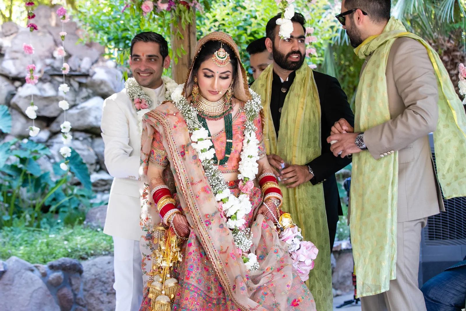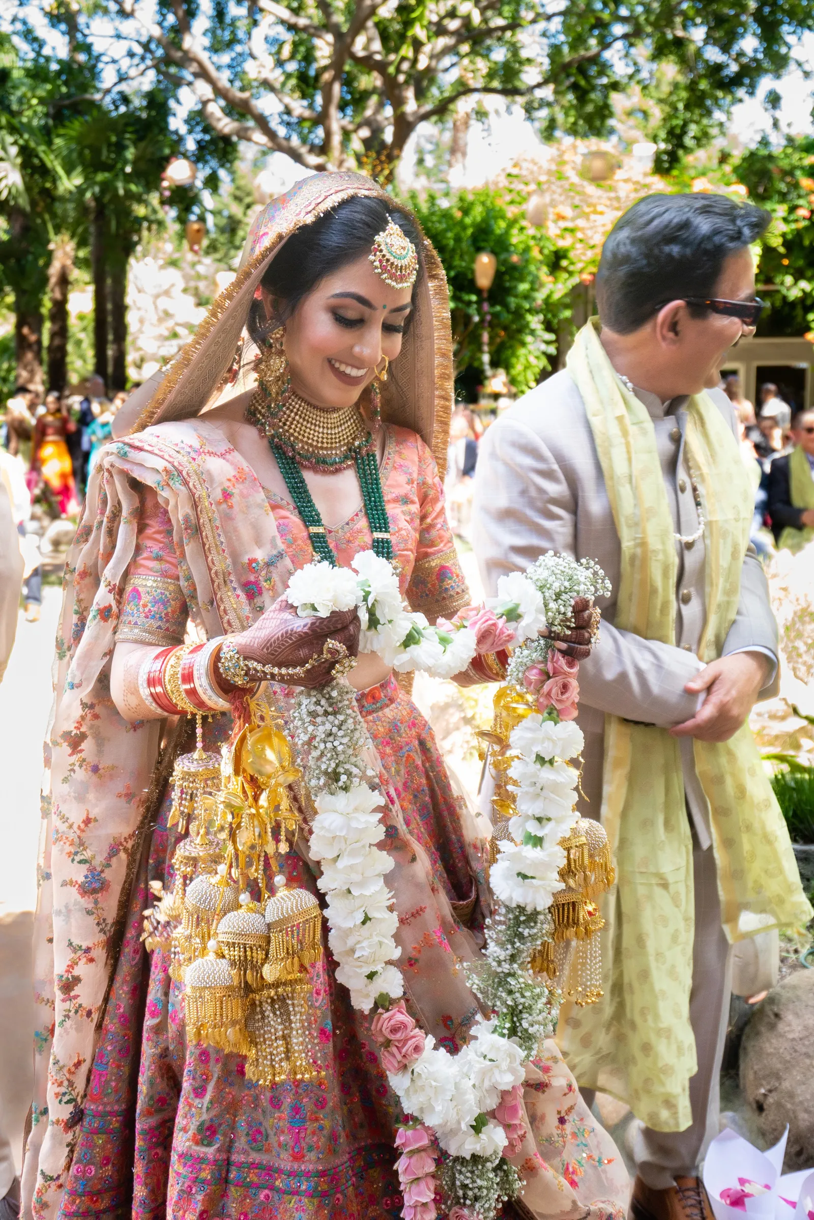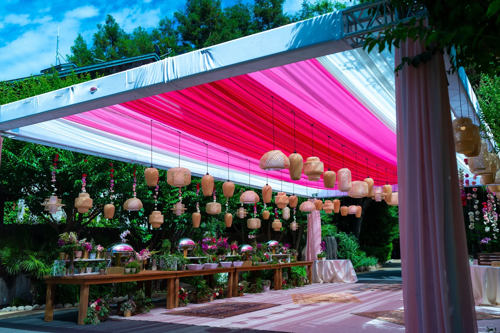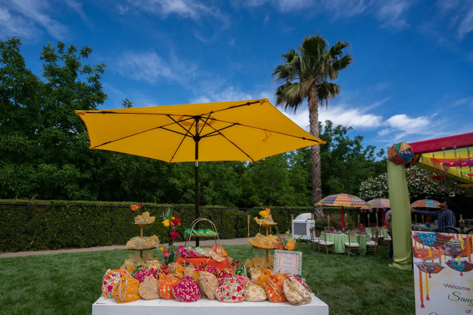 We met six years ago while working at the same consulting company. We talked briefly, but did not think much of it (little did we know…). A few months later, we found ourselves sitting next to each other at yet another work event. We hit it off and spent the majority of the evening talking to each other as opposed to paying attention to the event. Over the next few years, our friendship evolved into a relationship. Together, we navigated learning about each other’s cultures, switching jobs, and moving to new cities. One Saturday afternoon in February 2021, my parents and I were walking to the Ferry Building in San Francisco to meet a family friend when I felt a tap on the back of my shoulder. I turned around and was met with a huge bouquet of two dozen red roses. Aaron peaked his head out from behind the roses and handed me the bouquet. As that was happening, my parents stepped away and secretly turned on their cameras to start recording. In front of the magnificent Bay Bridge and beautiful San Francisco Bay, Aaron got down on one knee and asked me to marry him. I answered: Yes, of course! After the proposal, the two of us got dinner at an Italian restaurant in North Beach, San Francisco. We still enjoy going to that restaurant to relive those special moments. We got married in my hometown: Chico, CA. Since we had many out-of-town guests, this turned into somewhat of a destination wedding. The inspiration behind the wedding was modern traditionalism. We wanted each day to feel distinct and modern yet preserve the beautiful traditions they were based on. We also wanted the wedding to reflect the fusion of two cultures – Indian and American, Hindu and Jewish, etc. For that reason, we planned one completely Western event (the Cocktail), one completely Indian event (the Sangeet), and one fusion event (the Wedding). We also had a small pre-wedding mehndi (henna) event on the day most of our guests started arriving in town and a small haldi ceremony (pre-wedding blessing) event the morning of the wedding. The theme of the Cocktail was rustic glam. Set at a local winery, the decor was dark and moody with deep red florals (to match my outfit) interspersed with dried grass and wine barrels lit up by a custom neon sign with our wedding hashtag on it. We also had a welcome table with jumbo Jenga blocks for guests to write fun date night ideas on before they entered the venue. For the Sangeet event, our vendors transformed my family’s backyard into a colorful bazaar with a custom structure draped with vivid pink, orange, yellow, and green fabric accented by hanging Jaipuri umbrellas. We also had colorful lounge furniture for guests to rest on after getting mehndi (henna) applied or while snacking on Indian street food, tables decorated with bazaar-inspired centerpieces (Indian tea kettles, chai cups, etc.), a photo booth station with an Indian taxi prop, and a ‘Bangles & Baubles’ favor table with traditional jewelry, bangles, and purses for guests to enjoy. In the months leading up to the wedding, we sourced each of these party favors from India and individually wrapped them in colorful bags. They were a huge hit with our guests (so much so that we did not have any leftovers after the Sangeet event was over)! The inspiration behind the wedding decor was a modern English garden (like Indian Bridgerton). Contrasting the beautiful greenery at our venue, The Palms in Chico, CA, the decor in the outdoor space was an ombre pink color theme from our welcome gate draped in ombre fuschia to cream fabric to the strings of fuschia, pink, blush, and cream flowers hanging from the tree tops to the roof of the ceremony space (a beautiful gazebo) decorated in rows of flowers. We also had about 100 custom-made bamboo cane lanterns hanging from the trees throughout the outdoor space. At night, these lanterns provided stunning ambient lighting. Our favor table contained hundreds of custom candles created by a local candle company in gold tins with stickers containing our name and monogram on them. The decor in the reception hall indoors was meant to contrast the outdoor space with a cream, white, and gold color theme. The decor consisted of a custom grand chandelier with hanging florals, mirrors, and lights, oversized floral centerpieces with gold vases on all tables, and a grand white dance floor with our wedding monogram on it. This is the same monogram that we used on our digital save the dates and invites as well as on our hotel welcome bags. The neon sign with our wedding hashtag accented the wall behind the head table while the main bar had custom bar signs with our signature drinks on them: ‘Let the Fun Be-gin’ White Linen (hers) and ‘Whiskey Business’ Old Fashioned (his).