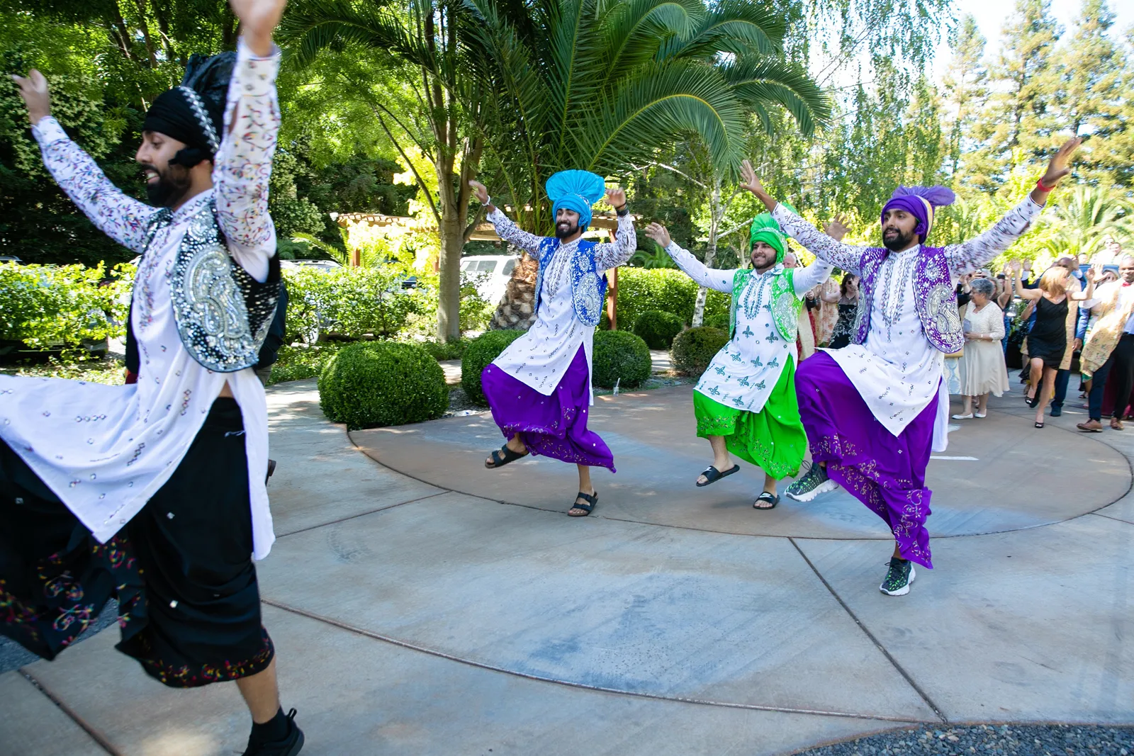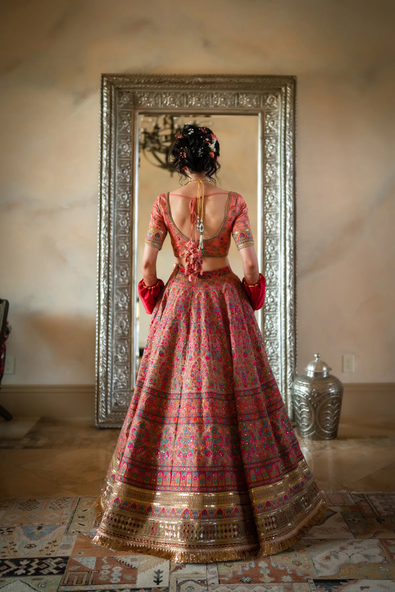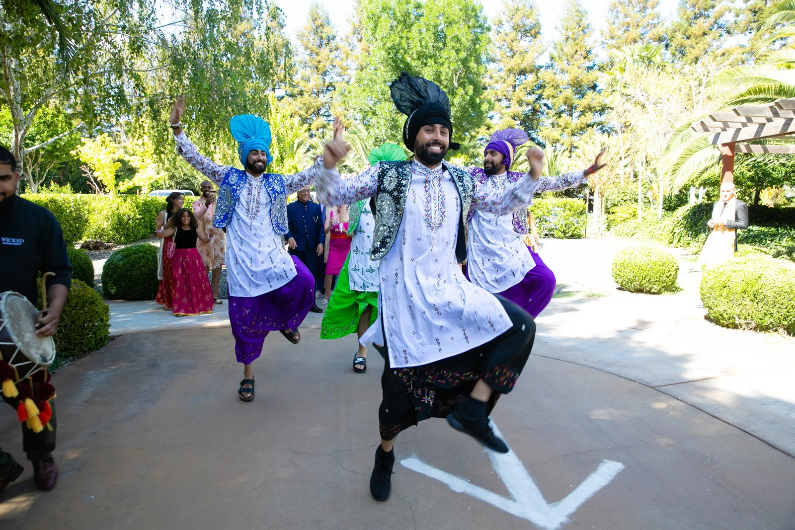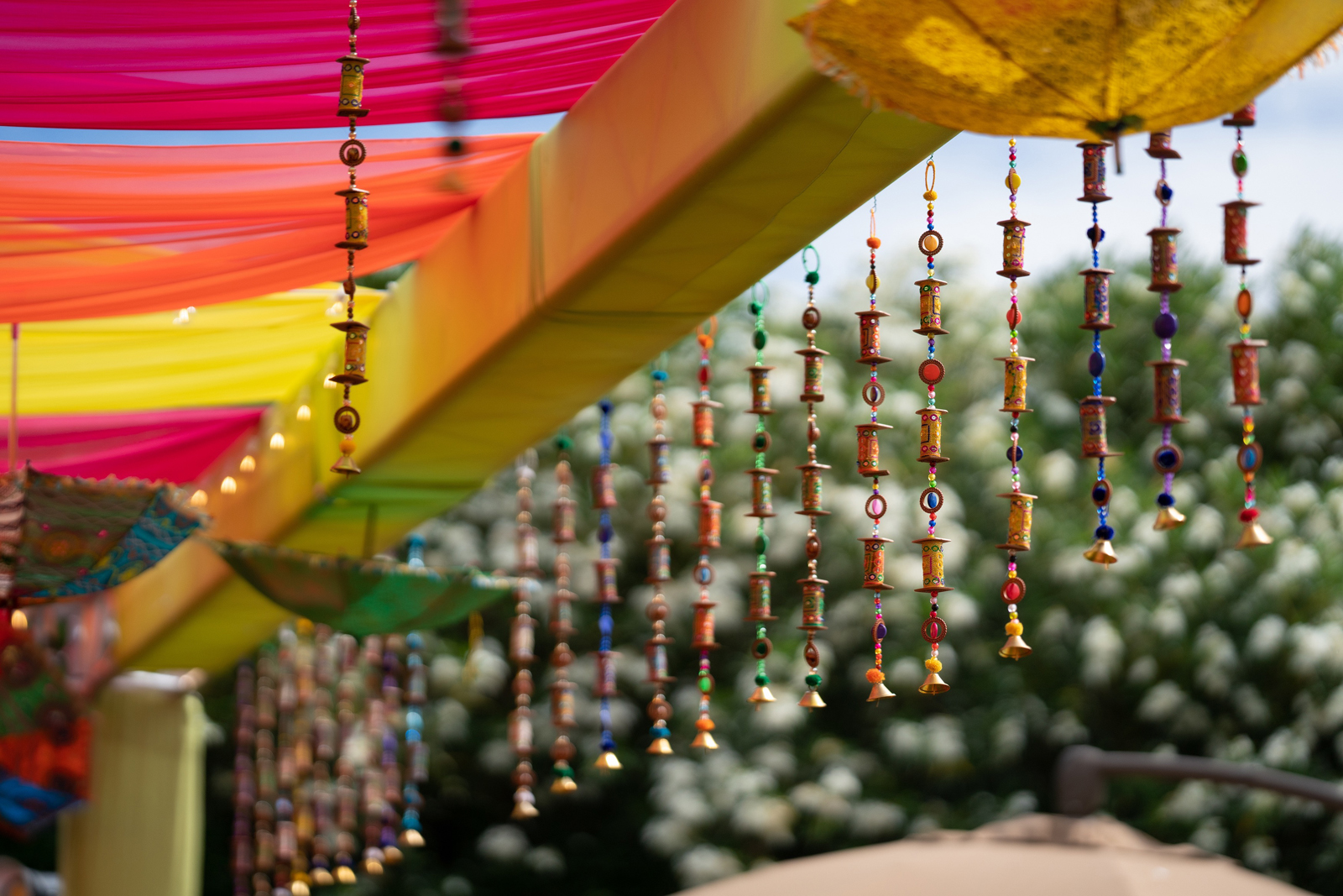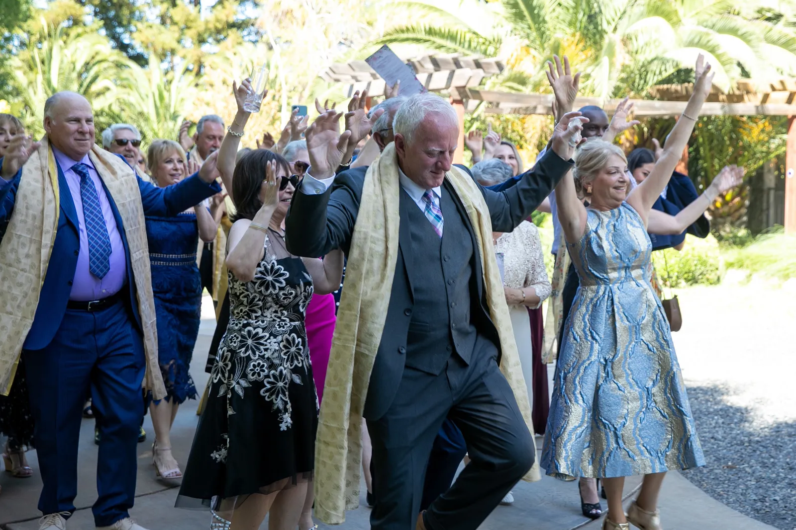 We met six years ago while working at the same consulting company. We talked briefly, but did not think much of it (little did we know…). A few months later, we found ourselves sitting next to each other at yet another work event. We hit it off and spent the majority of the evening talking to each other as opposed to paying attention to the event. Over the next few years, our friendship evolved into a relationship. Together, we navigated learning about each other’s cultures, switching jobs, and moving to new cities. One Saturday afternoon in February 2021, my parents and I were walking to the Ferry Building in San Francisco to meet a family friend when I felt a tap on the back of my shoulder. I turned around and was met with a huge bouquet of two dozen red roses. Aaron peaked his head out from behind the roses and handed me the bouquet. As that was happening, my parents stepped away and secretly turned on their cameras to start recording. In front of the magnificent Bay Bridge and beautiful San Francisco Bay, Aaron got down on one knee and asked me to marry him. I answered: Yes, of course! After the proposal, the two of us got dinner at an Italian restaurant in North Beach, San Francisco. We still enjoy going to that restaurant to relive those special moments. We got married in my hometown: Chico, CA. Since we had many out-of-town guests, this turned into somewhat of a destination wedding. The inspiration behind the wedding was modern traditionalism. We wanted each day to feel distinct and modern yet preserve the beautiful traditions they were based on. We also wanted the wedding to reflect the fusion of two cultures – Indian and American, Hindu and Jewish, etc. For that reason, we planned one completely Western event (the Cocktail), one completely Indian event (the Sangeet), and one fusion event (the Wedding). We also had a small pre-wedding mehndi (henna) event on the day most of our guests started arriving in town and a small haldi ceremony (pre-wedding blessing) event the morning of the wedding. The theme of the Cocktail was rustic glam. Set at a local winery, the decor was dark and moody with deep red florals (to match my outfit) interspersed with dried grass and wine barrels lit up by a custom neon sign with our wedding hashtag on it. We also had a welcome table with jumbo Jenga blocks for guests to write fun date night ideas on before they entered the venue. For the Sangeet event, our vendors transformed my family’s backyard into a colorful bazaar with a custom structure draped with vivid pink, orange, yellow, and green fabric accented by hanging Jaipuri umbrellas. We also had colorful lounge furniture for guests to rest on after getting mehndi (henna) applied or while snacking on Indian street food, tables decorated with bazaar-inspired centerpieces (Indian tea kettles, chai cups, etc.), a photo booth station with an Indian taxi prop, and a ‘Bangles & Baubles’ favor table with traditional jewelry, bangles, and purses for guests to enjoy. In the months leading up to the wedding, we sourced each of these party favors from India and individually wrapped them in colorful bags. They were a huge hit with our guests (so much so that we did not have any leftovers after the Sangeet event was over)! The inspiration behind the wedding decor was a modern English garden (like Indian Bridgerton). Contrasting the beautiful greenery at our venue, The Palms in Chico, CA, the decor in the outdoor space was an ombre pink color theme from our welcome gate draped in ombre fuschia to cream fabric to the strings of fuschia, pink, blush, and cream flowers hanging from the tree tops to the roof of the ceremony space (a beautiful gazebo) decorated in rows of flowers. We also had about 100 custom-made bamboo cane lanterns hanging from the trees throughout the outdoor space. At night, these lanterns provided stunning ambient lighting. Our favor table contained hundreds of custom candles created by a local candle company in gold tins with stickers containing our name and monogram on them. The decor in the reception hall indoors was meant to contrast the outdoor space with a cream, white, and gold color theme. The decor consisted of a custom grand chandelier with hanging florals, mirrors, and lights, oversized floral centerpieces with gold vases on all tables, and a grand white dance floor with our wedding monogram on it. This is the same monogram that we used on our digital save the dates and invites as well as on our hotel welcome bags. The neon sign with our wedding hashtag accented the wall behind the head table while the main bar had custom bar signs with our signature drinks on them: ‘Let the Fun Be-gin’ White Linen (hers) and ‘Whiskey Business’ Old Fashioned (his).