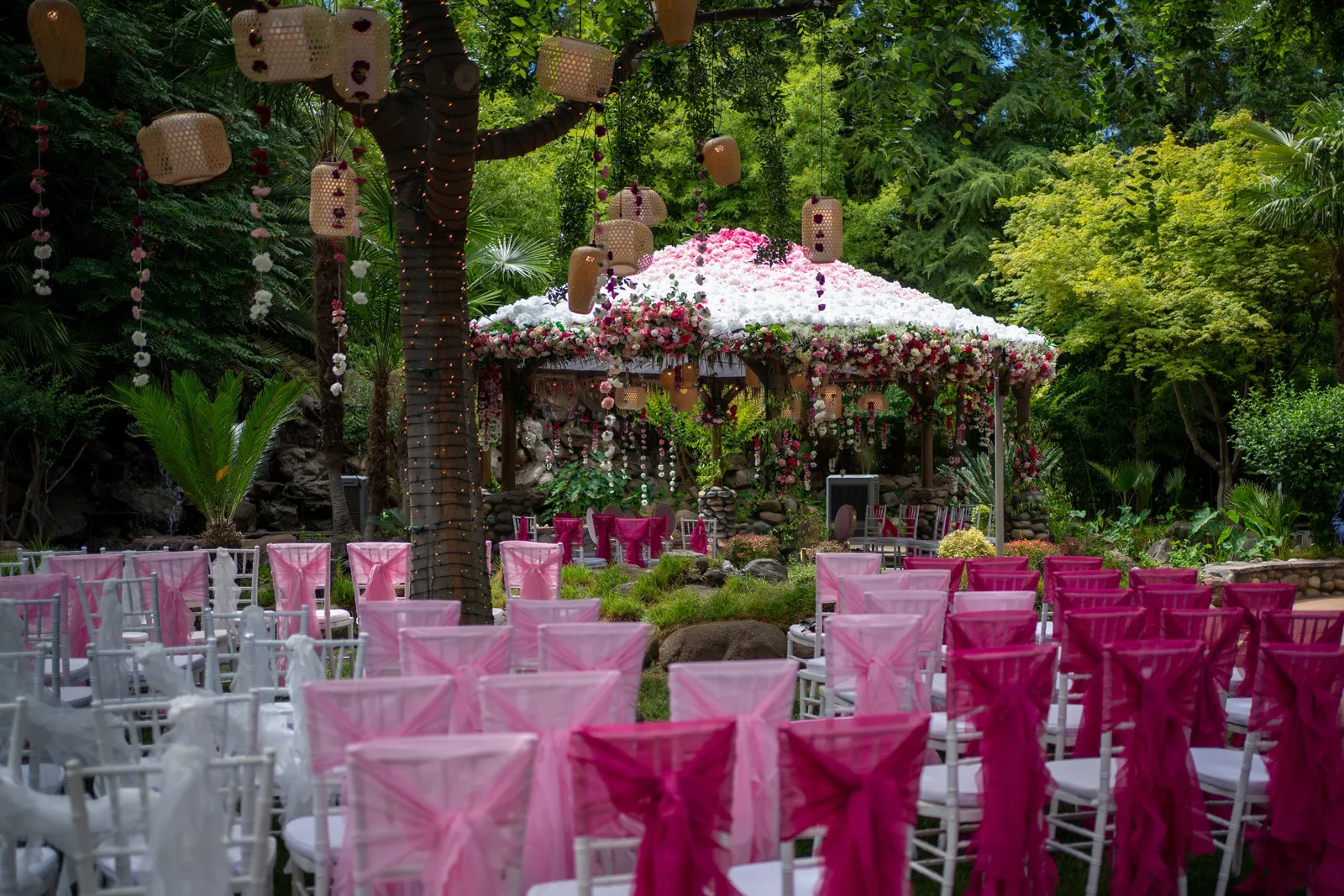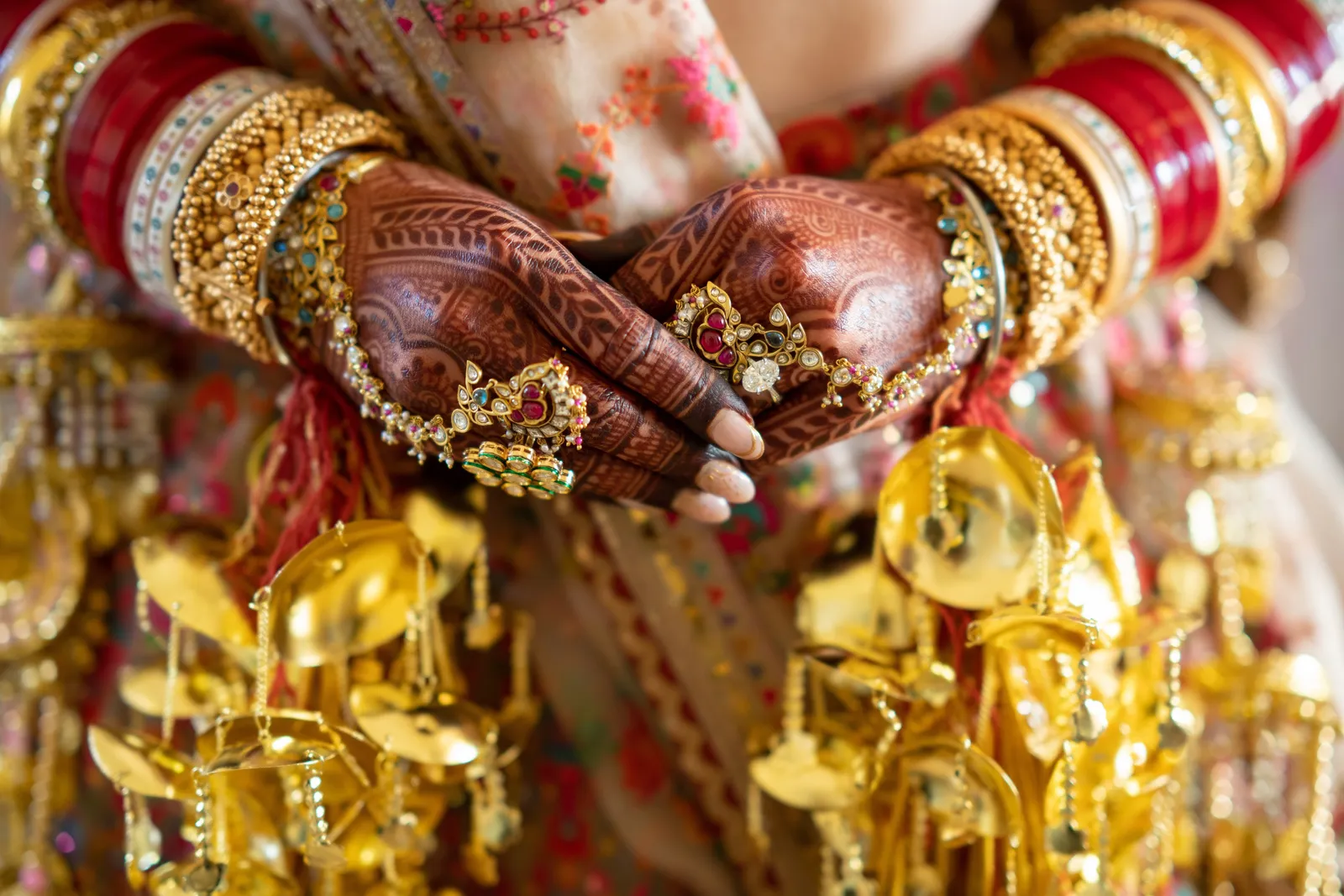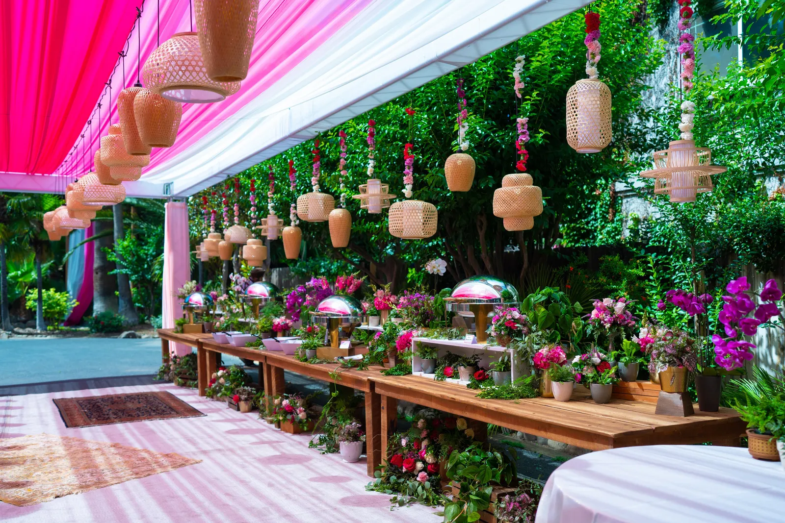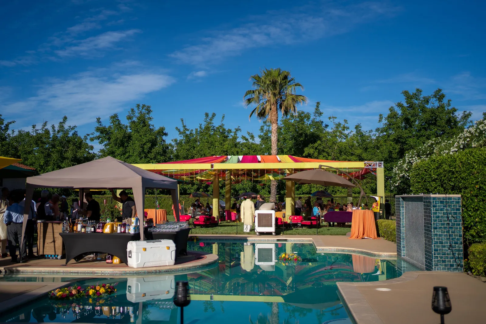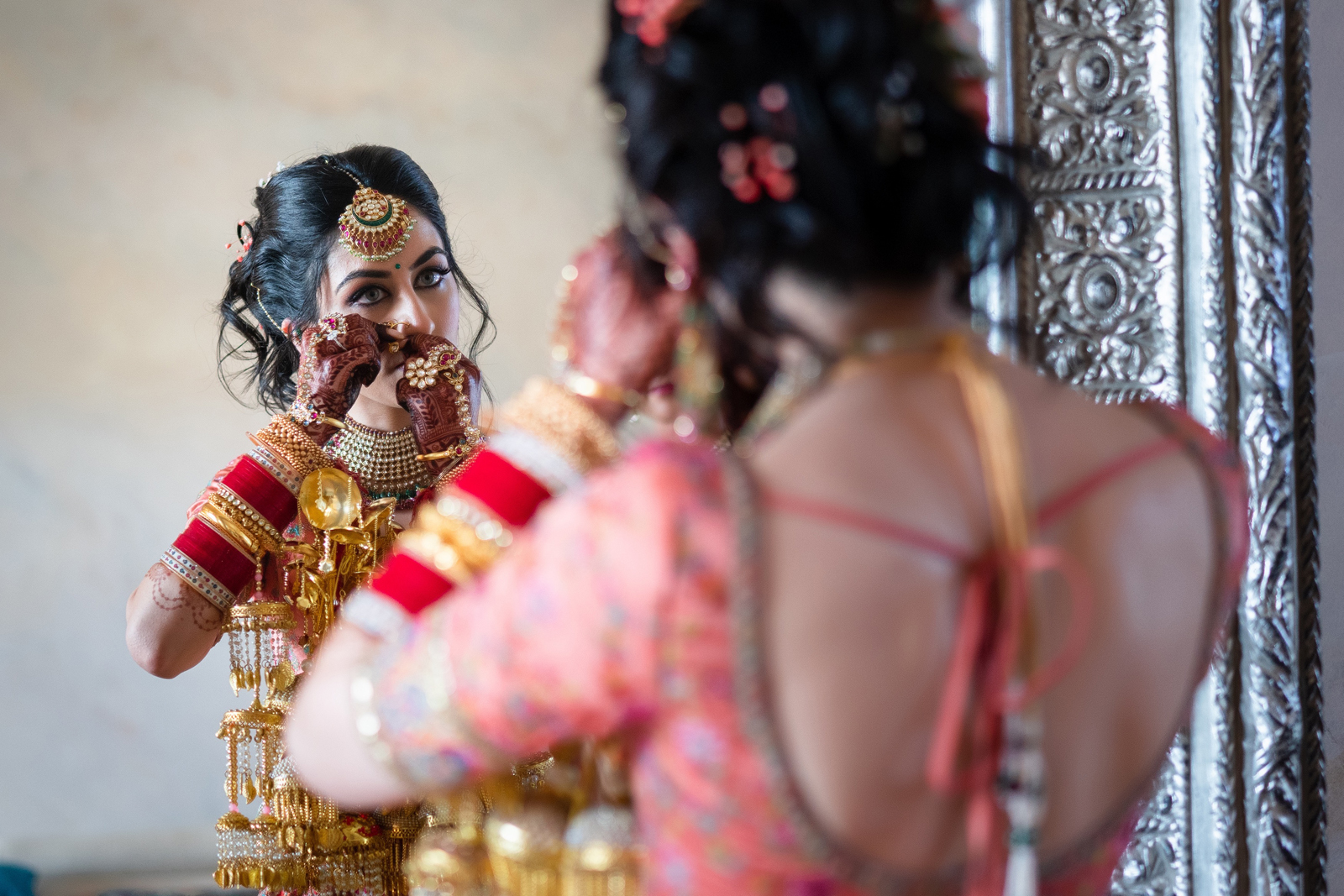 We met six years ago while working at the same consulting company. We talked briefly, but did not think much of it (little did we know…). A few months later, we found ourselves sitting next to each other at yet another work event. We hit it off and spent the majority of the evening talking to each other as opposed to paying attention to the event. Over the next few years, our friendship evolved into a relationship. Together, we navigated learning about each other’s cultures, switching jobs, and moving to new cities. One Saturday afternoon in February 2021, my parents and I were walking to the Ferry Building in San Francisco to meet a family friend when I felt a tap on the back of my shoulder. I turned around and was met with a huge bouquet of two dozen red roses. Aaron peaked his head out from behind the roses and handed me the bouquet. As that was happening, my parents stepped away and secretly turned on their cameras to start recording. In front of the magnificent Bay Bridge and beautiful San Francisco Bay, Aaron got down on one knee and asked me to marry him. I answered: Yes, of course! After the proposal, the two of us got dinner at an Italian restaurant in North Beach, San Francisco. We still enjoy going to that restaurant to relive those special moments. We got married in my hometown: Chico, CA. Since we had many out-of-town guests, this turned into somewhat of a destination wedding. The inspiration behind the wedding was modern traditionalism. We wanted each day to feel distinct and modern yet preserve the beautiful traditions they were based on. We also wanted the wedding to reflect the fusion of two cultures – Indian and American, Hindu and Jewish, etc. For that reason, we planned one completely Western event (the Cocktail), one completely Indian event (the Sangeet), and one fusion event (the Wedding). We also had a small pre-wedding mehndi (henna) event on the day most of our guests started arriving in town and a small haldi ceremony (pre-wedding blessing) event the morning of the wedding. The theme of the Cocktail was rustic glam. Set at a local winery, the decor was dark and moody with deep red florals (to match my outfit) interspersed with dried grass and wine barrels lit up by a custom neon sign with our wedding hashtag on it. We also had a welcome table with jumbo Jenga blocks for guests to write fun date night ideas on before they entered the venue. For the Sangeet event, our vendors transformed my family’s backyard into a colorful bazaar with a custom structure draped with vivid pink, orange, yellow, and green fabric accented by hanging Jaipuri umbrellas. We also had colorful lounge furniture for guests to rest on after getting mehndi (henna) applied or while snacking on Indian street food, tables decorated with bazaar-inspired centerpieces (Indian tea kettles, chai cups, etc.), a photo booth station with an Indian taxi prop, and a ‘Bangles & Baubles’ favor table with traditional jewelry, bangles, and purses for guests to enjoy. In the months leading up to the wedding, we sourced each of these party favors from India and individually wrapped them in colorful bags. They were a huge hit with our guests (so much so that we did not have any leftovers after the Sangeet event was over)! The inspiration behind the wedding decor was a modern English garden (like Indian Bridgerton). Contrasting the beautiful greenery at our venue, The Palms in Chico, CA, the decor in the outdoor space was an ombre pink color theme from our welcome gate draped in ombre fuschia to cream fabric to the strings of fuschia, pink, blush, and cream flowers hanging from the tree tops to the roof of the ceremony space (a beautiful gazebo) decorated in rows of flowers. We also had about 100 custom-made bamboo cane lanterns hanging from the trees throughout the outdoor space. At night, these lanterns provided stunning ambient lighting. Our favor table contained hundreds of custom candles created by a local candle company in gold tins with stickers containing our name and monogram on them. The decor in the reception hall indoors was meant to contrast the outdoor space with a cream, white, and gold color theme. The decor consisted of a custom grand chandelier with hanging florals, mirrors, and lights, oversized floral centerpieces with gold vases on all tables, and a grand white dance floor with our wedding monogram on it. This is the same monogram that we used on our digital save the dates and invites as well as on our hotel welcome bags. The neon sign with our wedding hashtag accented the wall behind the head table while the main bar had custom bar signs with our signature drinks on them: ‘Let the Fun Be-gin’ White Linen (hers) and ‘Whiskey Business’ Old Fashioned (his).